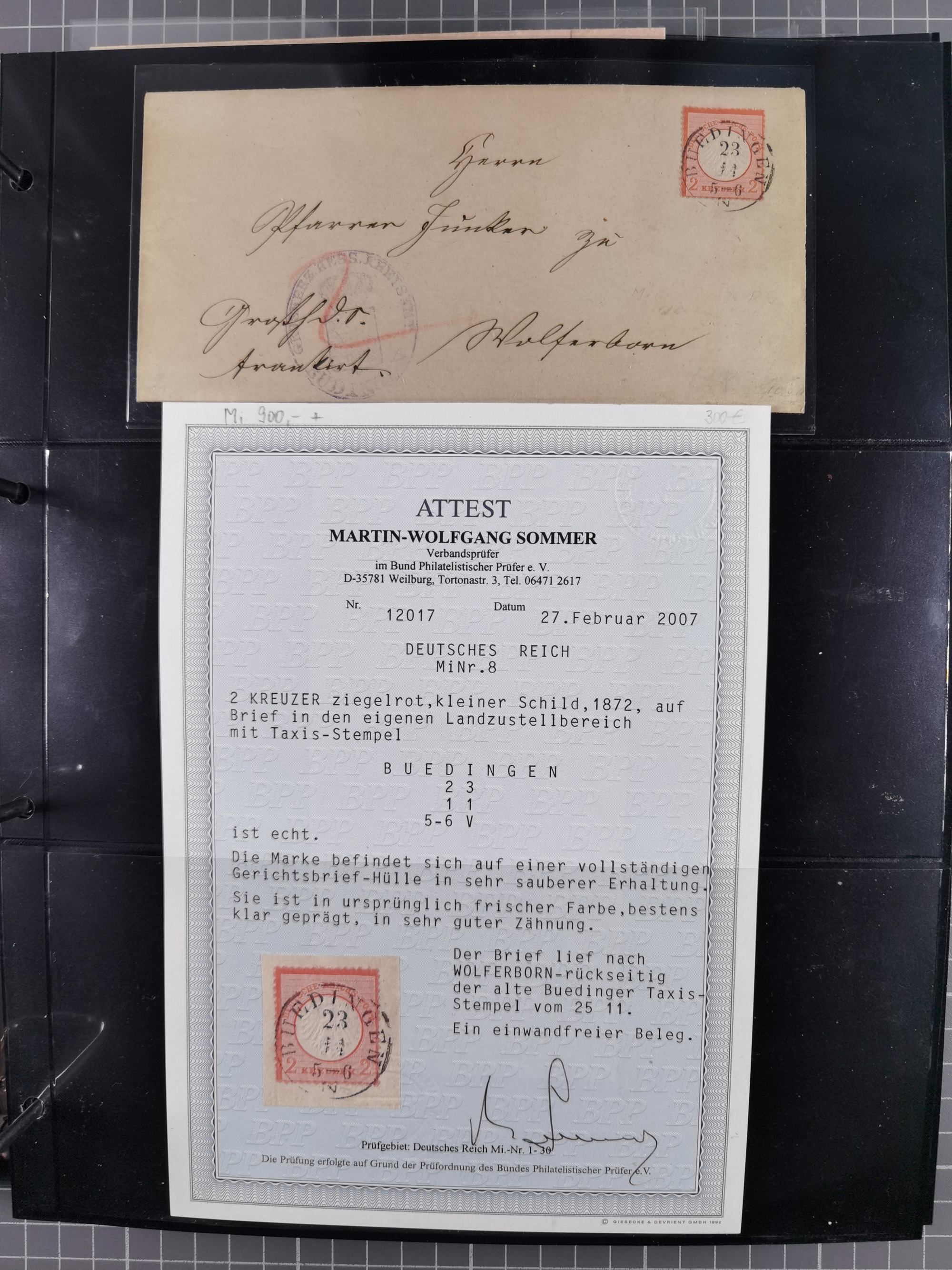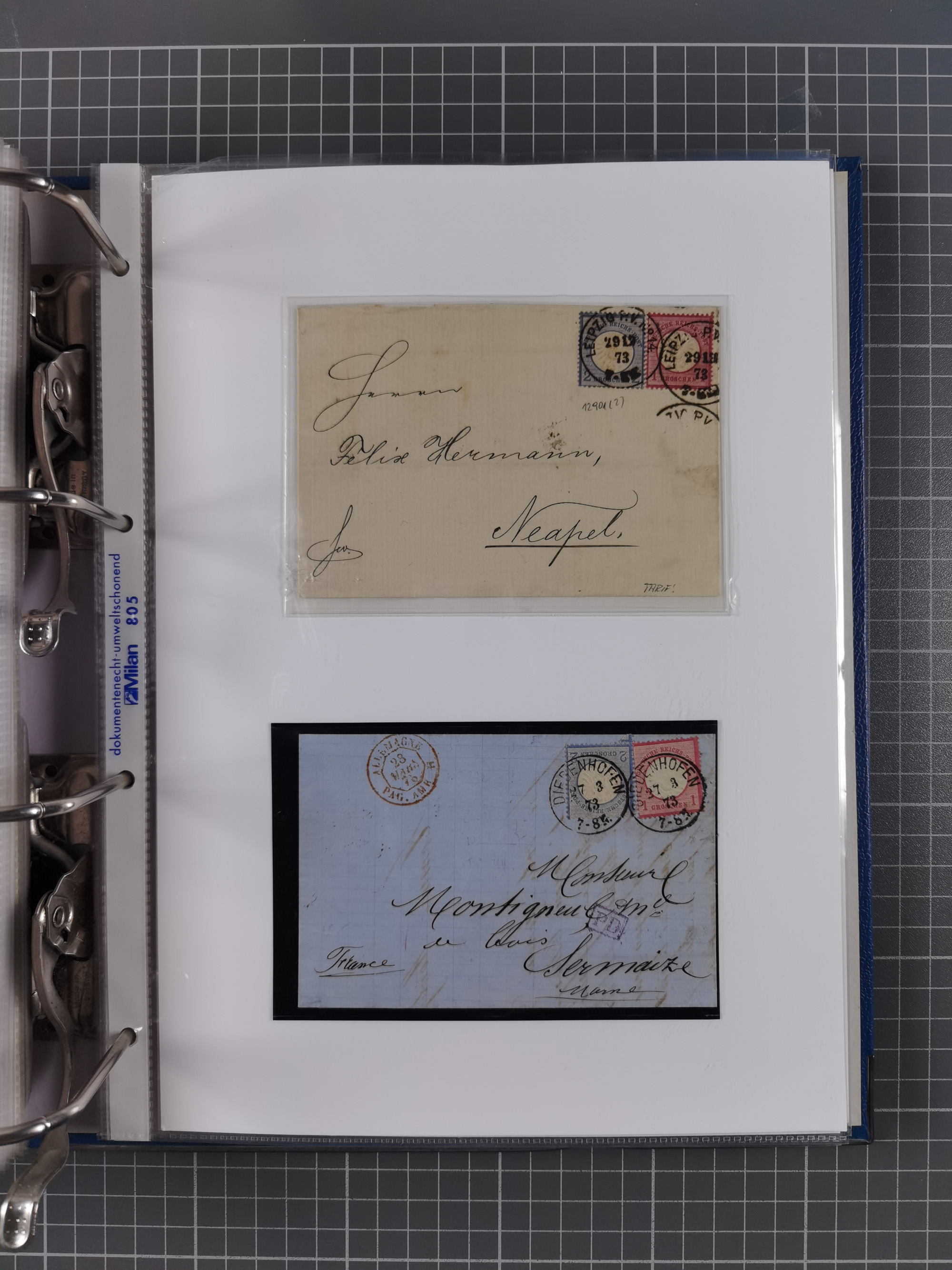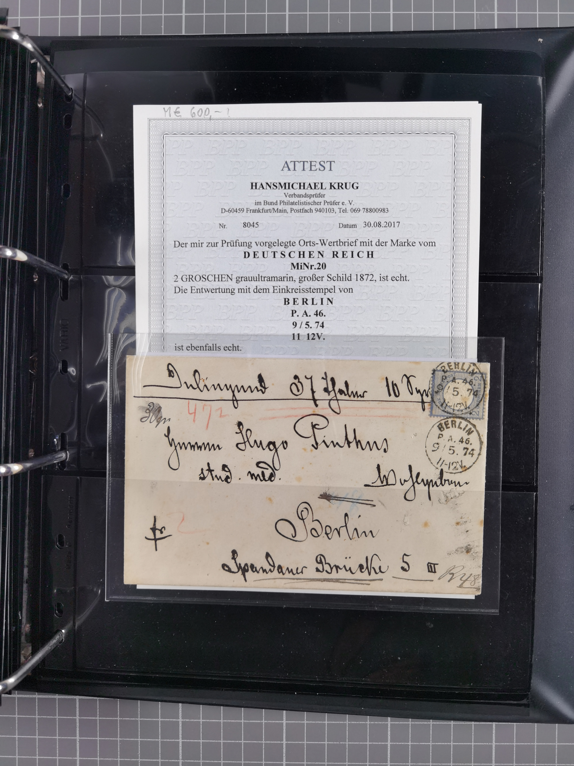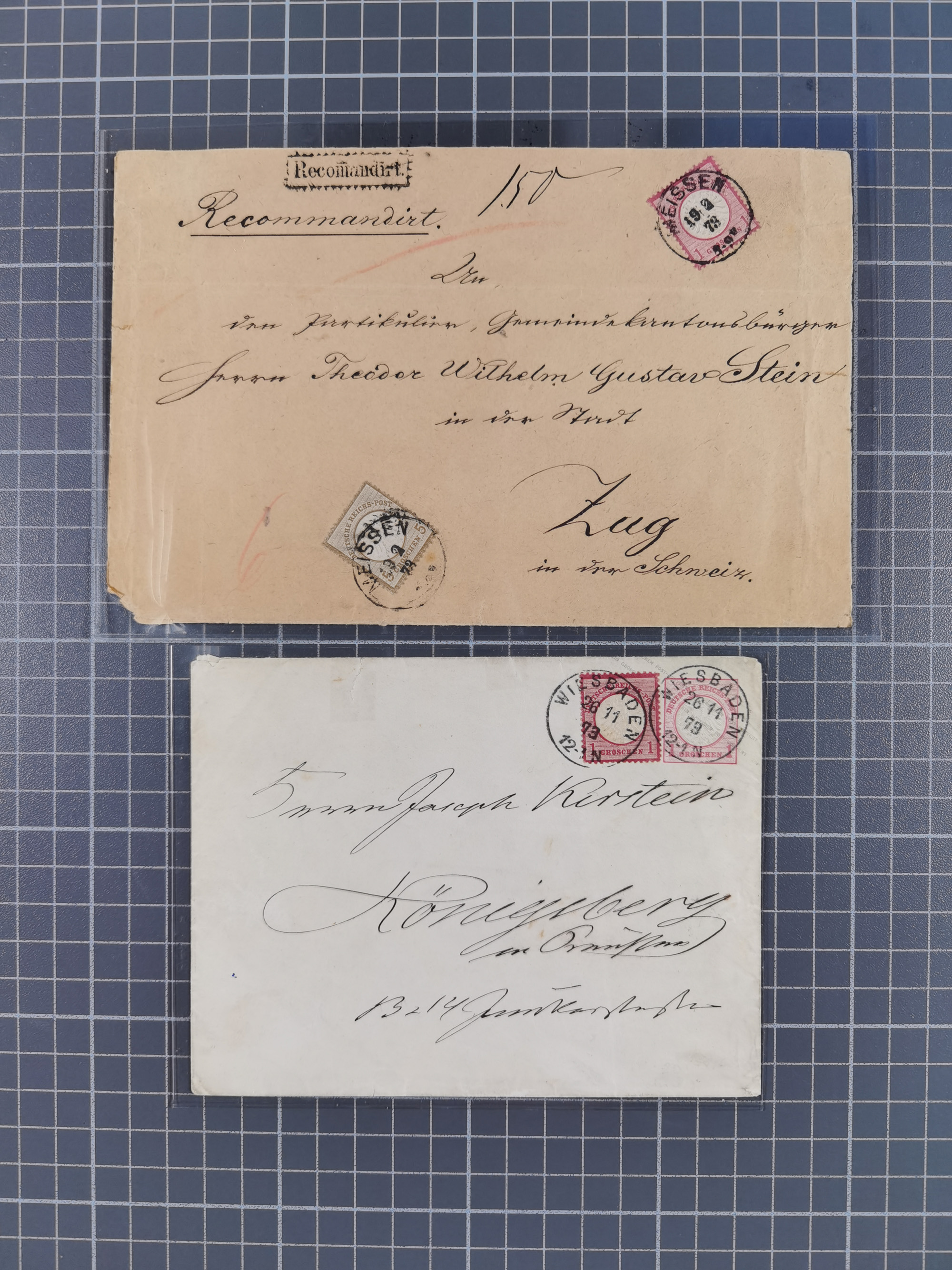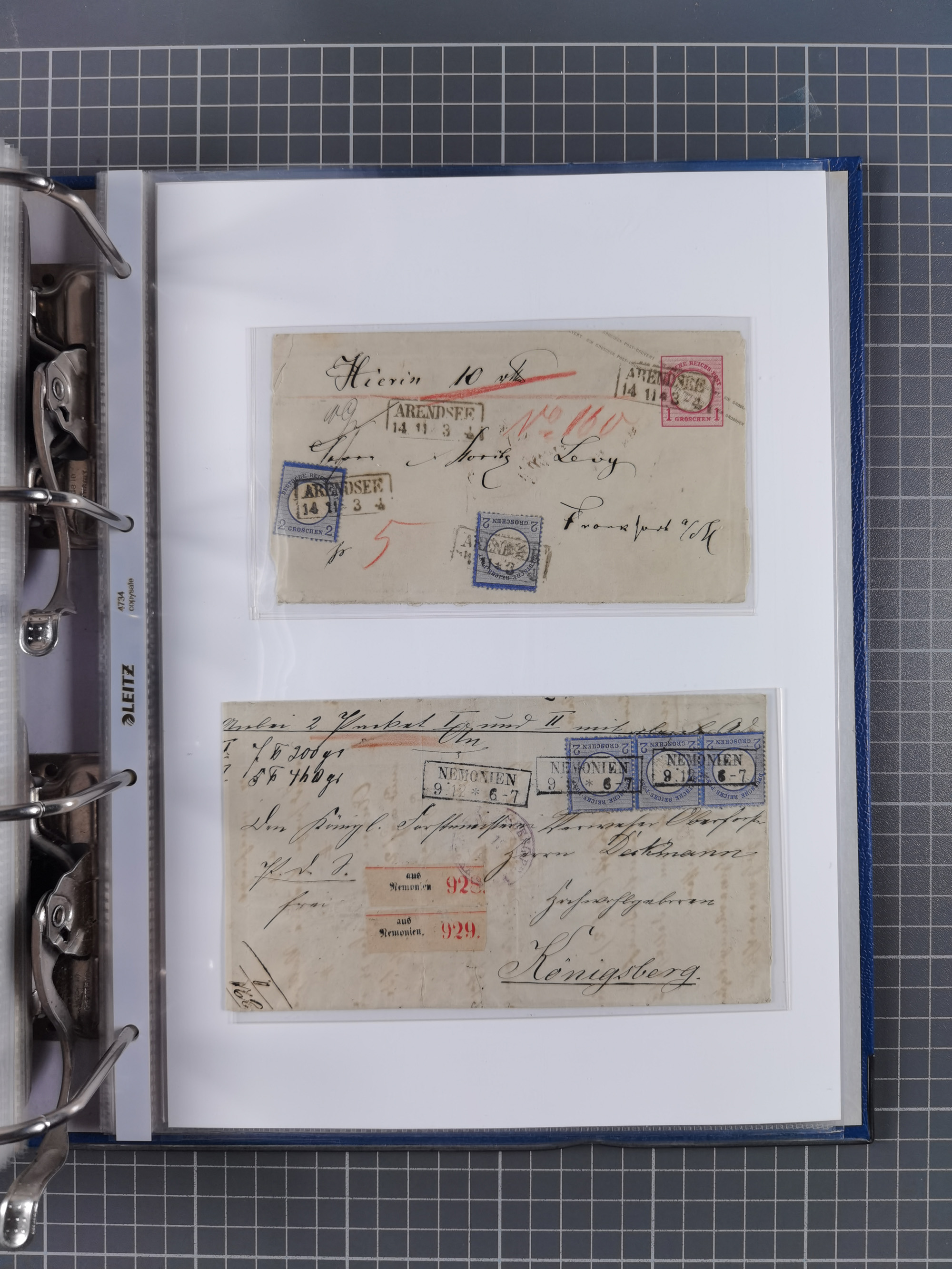 1872/74, umfangreiche Sammlung mit über 100 Briefen und Karten mit besseren Einzel- und Mehrfachfrankaturen, R- und Wertbriefen, Express-Briefe, interessante Stempel und weiteren Besonderheiten. Dabei u.a. Mi.-Nr. 1 (2) + Paar 21a auf R-Express-Brief (FA Sommer BPP), Mi.-Nr. 3 (7) auf Express-Brief (1 Wert fehlerhaft), Mi.-Nr. 5 im Paar auf Express-Brief mit Landzustellung (FA Brugger BPP), zwei Einzelfrankaturen Mi.-Nr. 11 auf Wertbriefen (repariert, einmal mit FB Krug BPP), Mi.-Nr. 17a(2) auf Drucksache der 2. Gewichtsstufe (FA Krug BPP), Mi.-Nr. 19 auf P1 als R-Ortskarte von Berlin (FA Sommer BPP) und Mi.-Nr. 23a+30 auf Wertbrief. Die Erhaltung ist zum Teil fehlerhaft, vieles signiert bzw. mit FB und Fotoattesten, ex Untermann