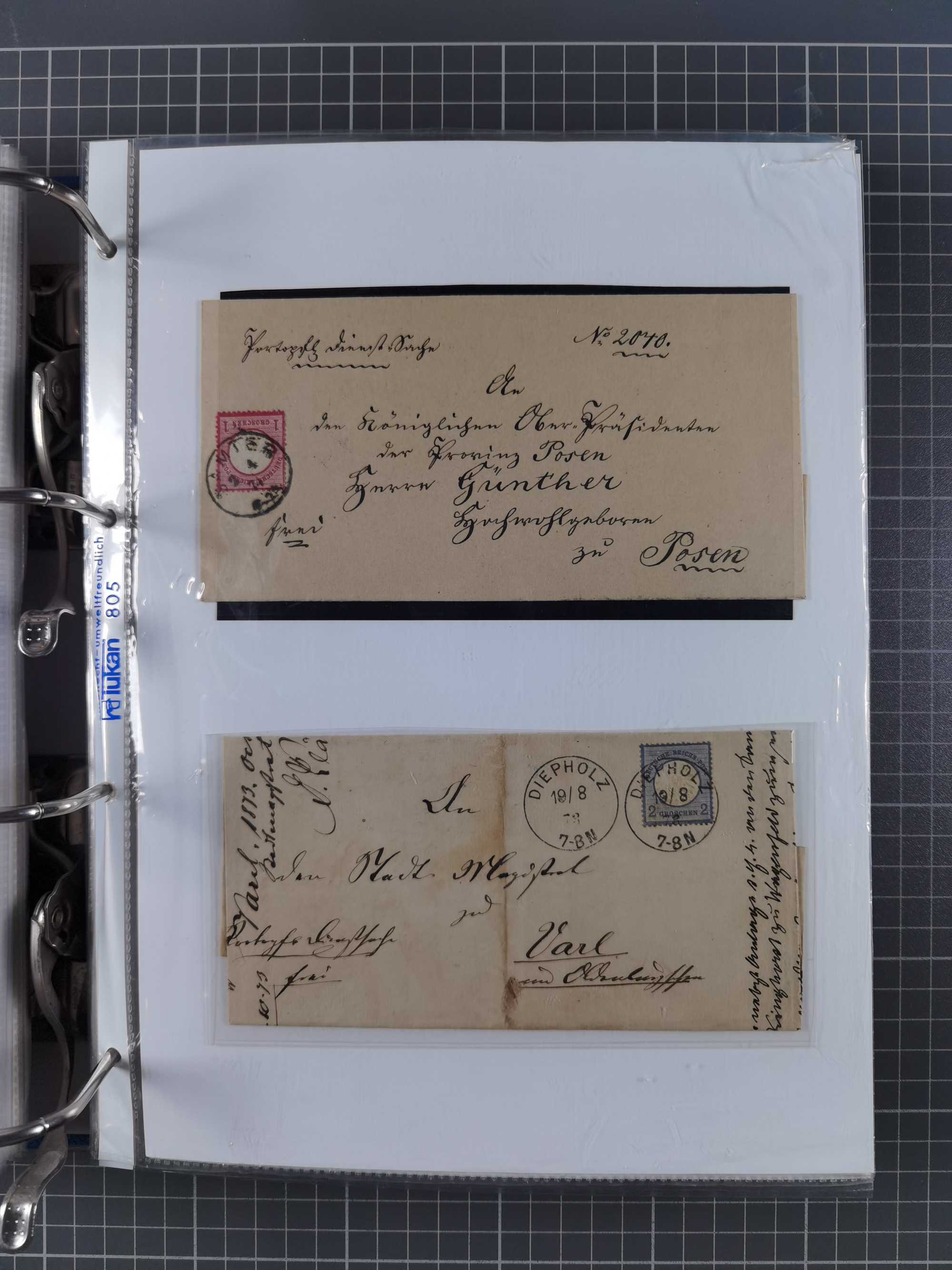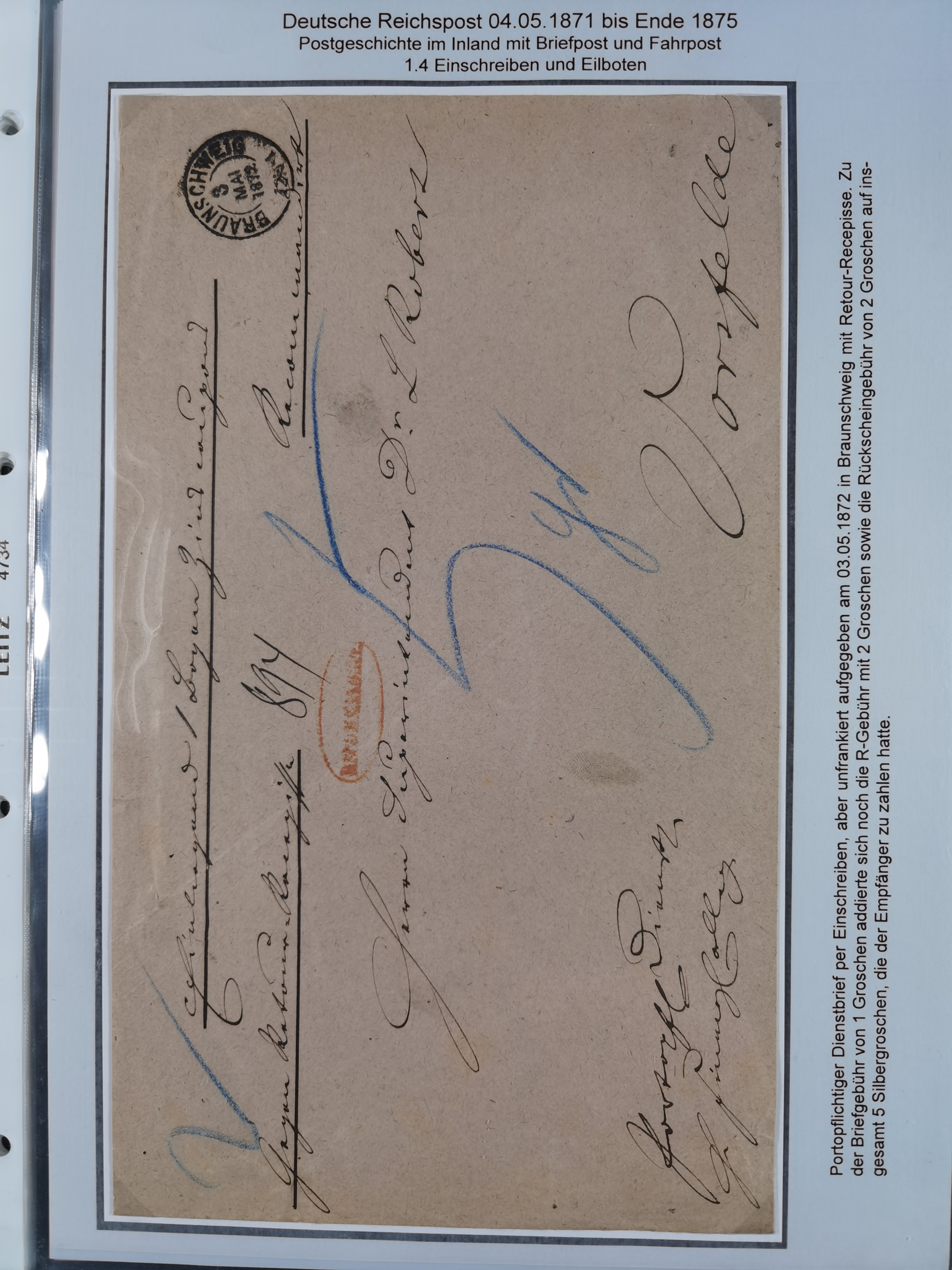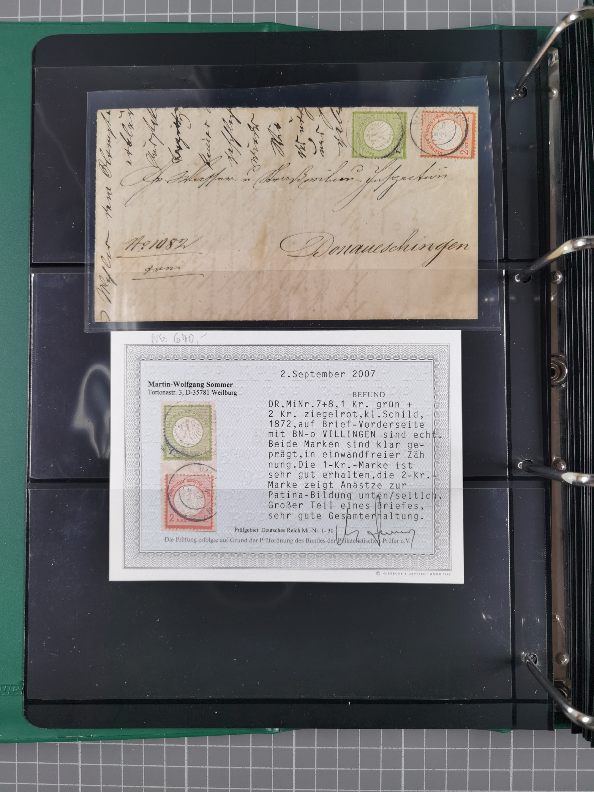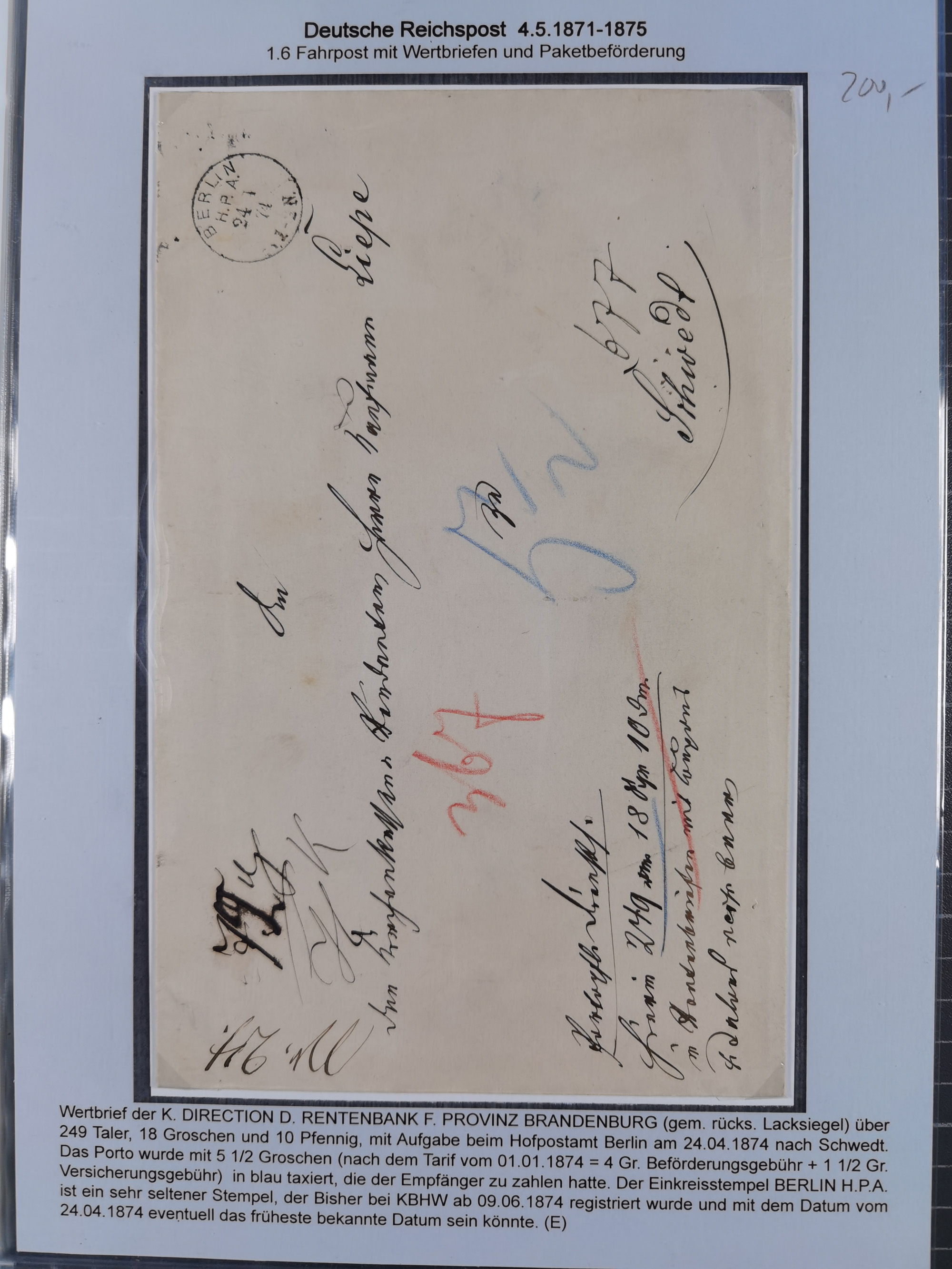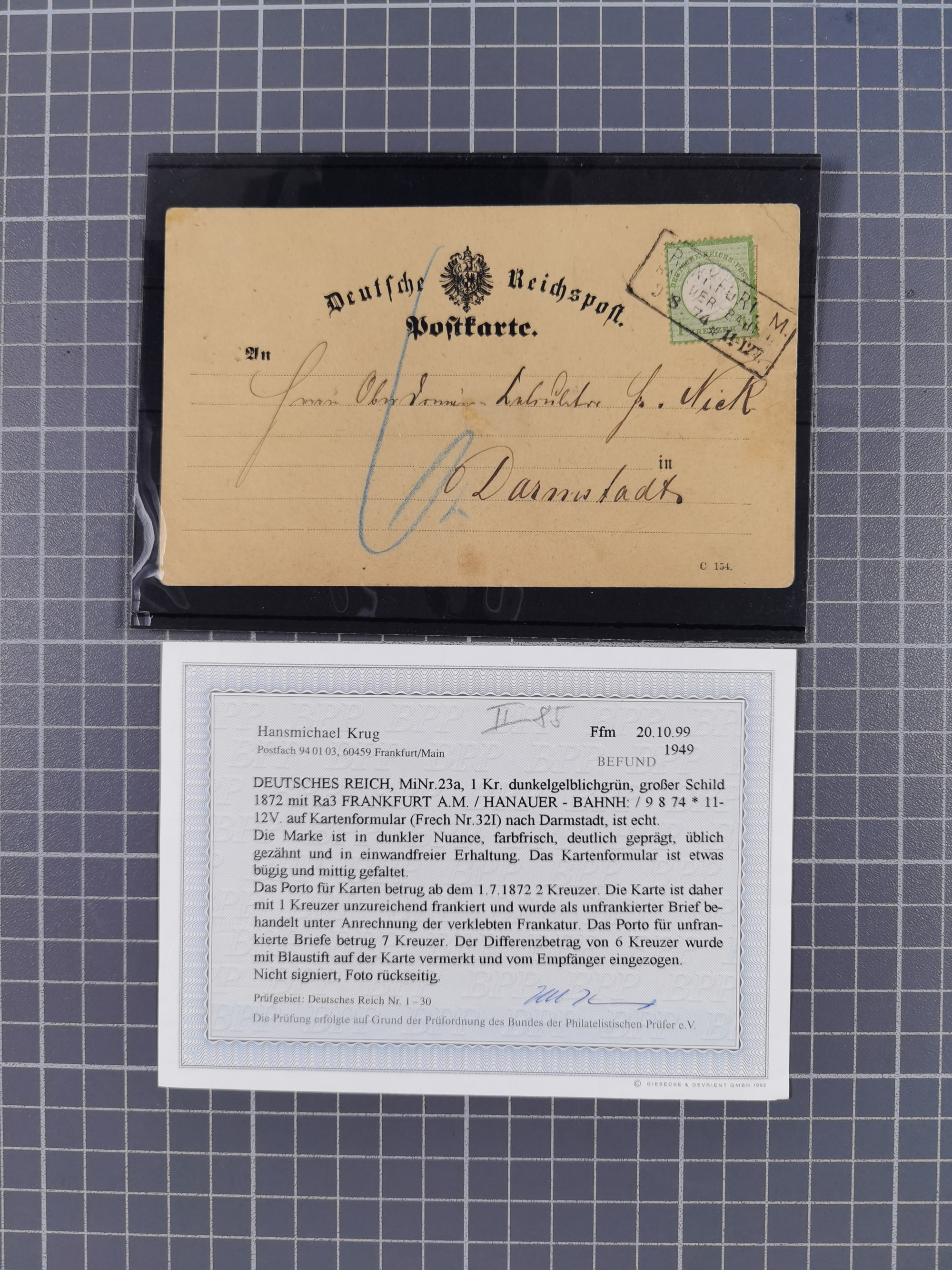 1872/74, umfangreiche Sammlung mit über 100 Briefen und Karten mit besseren Einzel- und Mehrfachfrankaturen, R- und Wertbriefen, Express-Briefe, interessante Stempel und weiteren Besonderheiten. Dabei u.a. Mi.-Nr. 1 (2) + Paar 21a auf R-Express-Brief (FA Sommer BPP), Mi.-Nr. 3 (7) auf Express-Brief (1 Wert fehlerhaft), Mi.-Nr. 5 im Paar auf Express-Brief mit Landzustellung (FA Brugger BPP), zwei Einzelfrankaturen Mi.-Nr. 11 auf Wertbriefen (repariert, einmal mit FB Krug BPP), Mi.-Nr. 17a(2) auf Drucksache der 2. Gewichtsstufe (FA Krug BPP), Mi.-Nr. 19 auf P1 als R-Ortskarte von Berlin (FA Sommer BPP) und Mi.-Nr. 23a+30 auf Wertbrief. Die Erhaltung ist zum Teil fehlerhaft, vieles signiert bzw. mit FB und Fotoattesten, ex Untermann