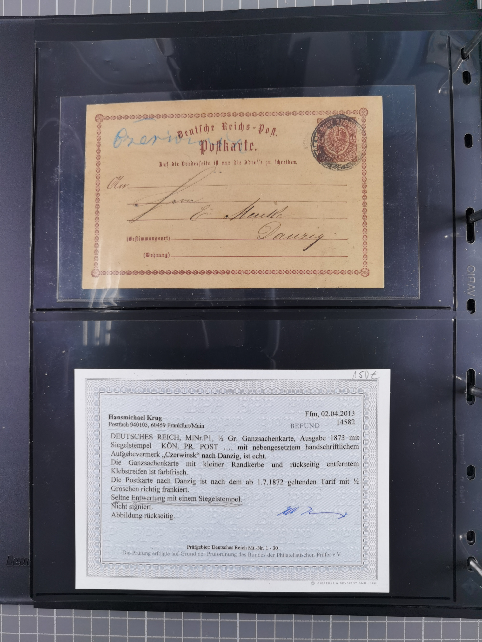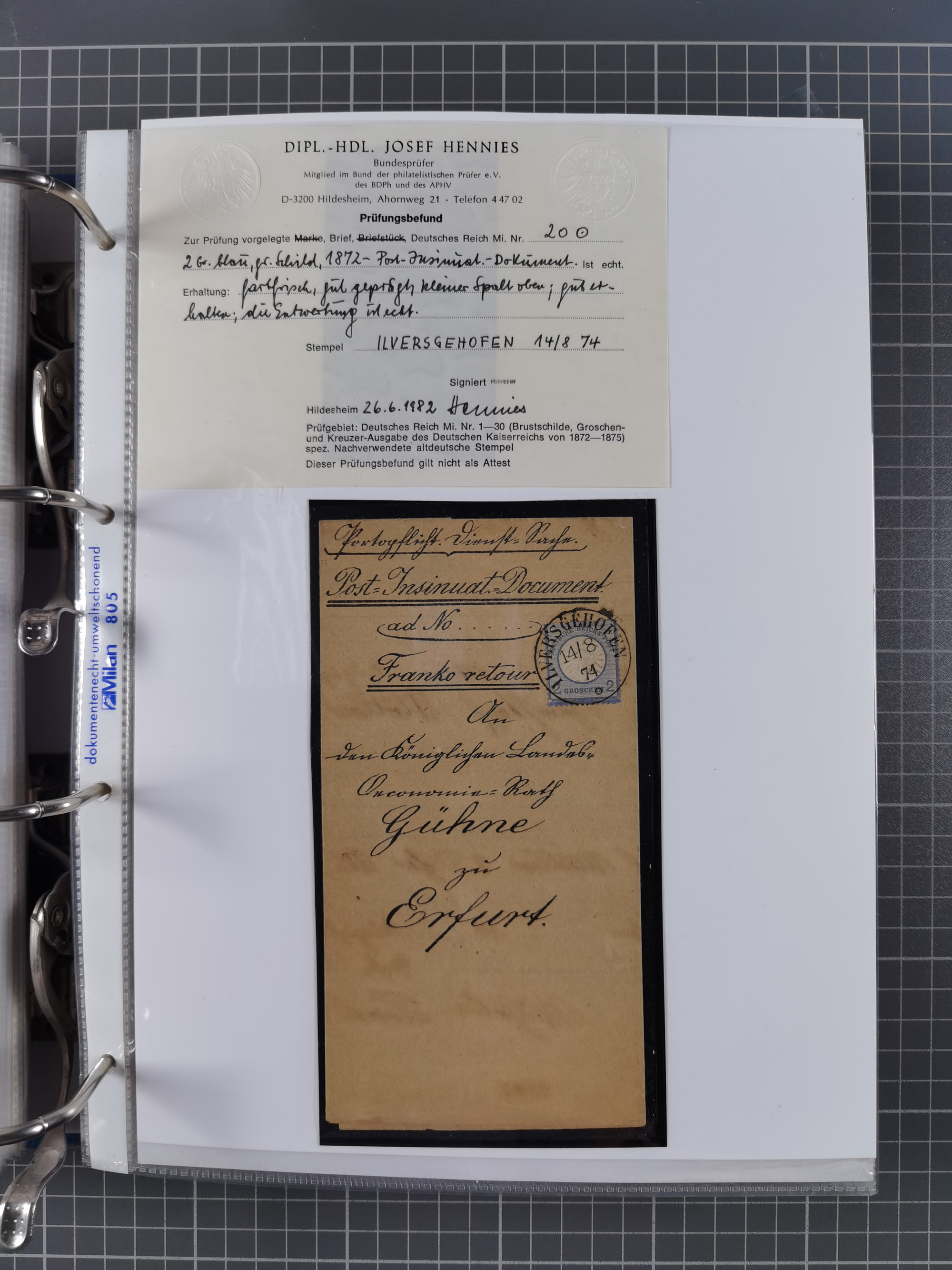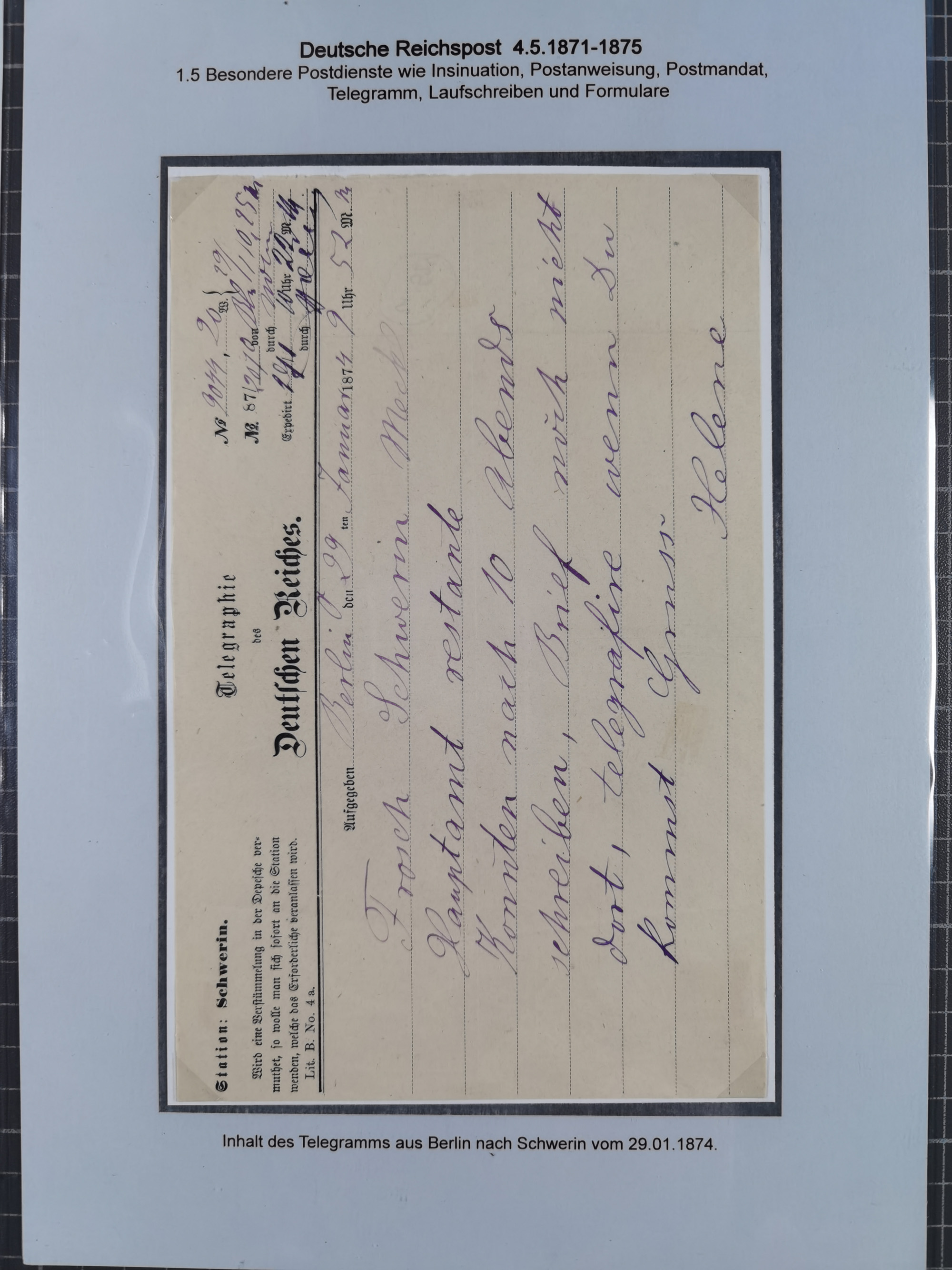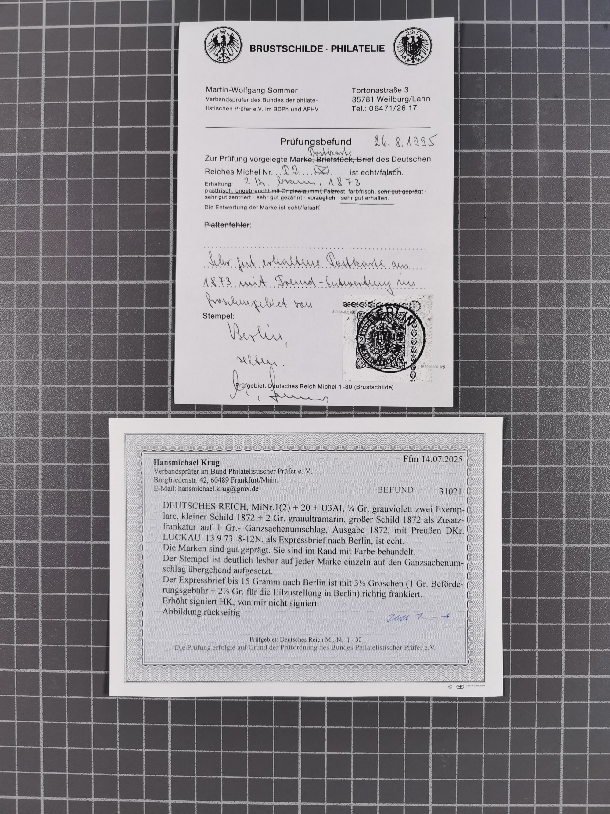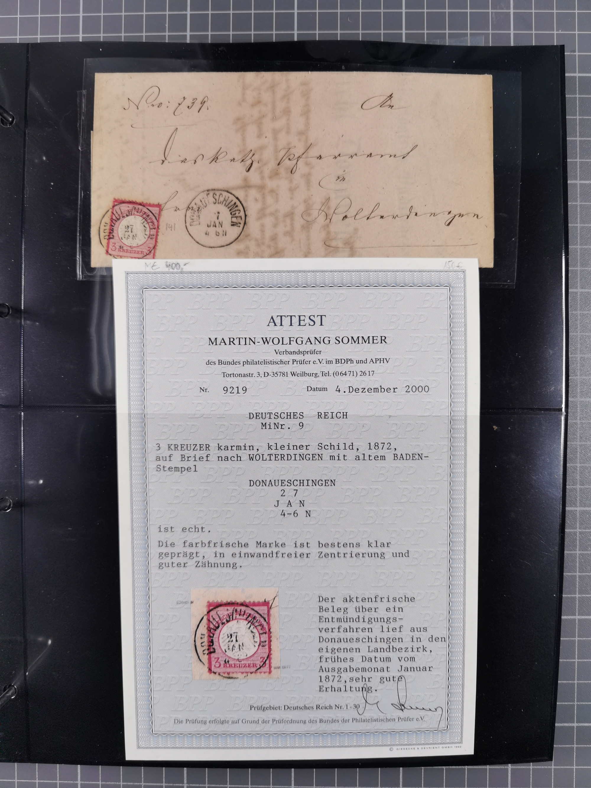 1872/74, umfangreiche Sammlung mit über 100 Briefen und Karten mit besseren Einzel- und Mehrfachfrankaturen, R- und Wertbriefen, Express-Briefe, interessante Stempel und weiteren Besonderheiten. Dabei u.a. Mi.-Nr. 1 (2) + Paar 21a auf R-Express-Brief (FA Sommer BPP), Mi.-Nr. 3 (7) auf Express-Brief (1 Wert fehlerhaft), Mi.-Nr. 5 im Paar auf Express-Brief mit Landzustellung (FA Brugger BPP), zwei Einzelfrankaturen Mi.-Nr. 11 auf Wertbriefen (repariert, einmal mit FB Krug BPP), Mi.-Nr. 17a(2) auf Drucksache der 2. Gewichtsstufe (FA Krug BPP), Mi.-Nr. 19 auf P1 als R-Ortskarte von Berlin (FA Sommer BPP) und Mi.-Nr. 23a+30 auf Wertbrief. Die Erhaltung ist zum Teil fehlerhaft, vieles signiert bzw. mit FB und Fotoattesten, ex Untermann
