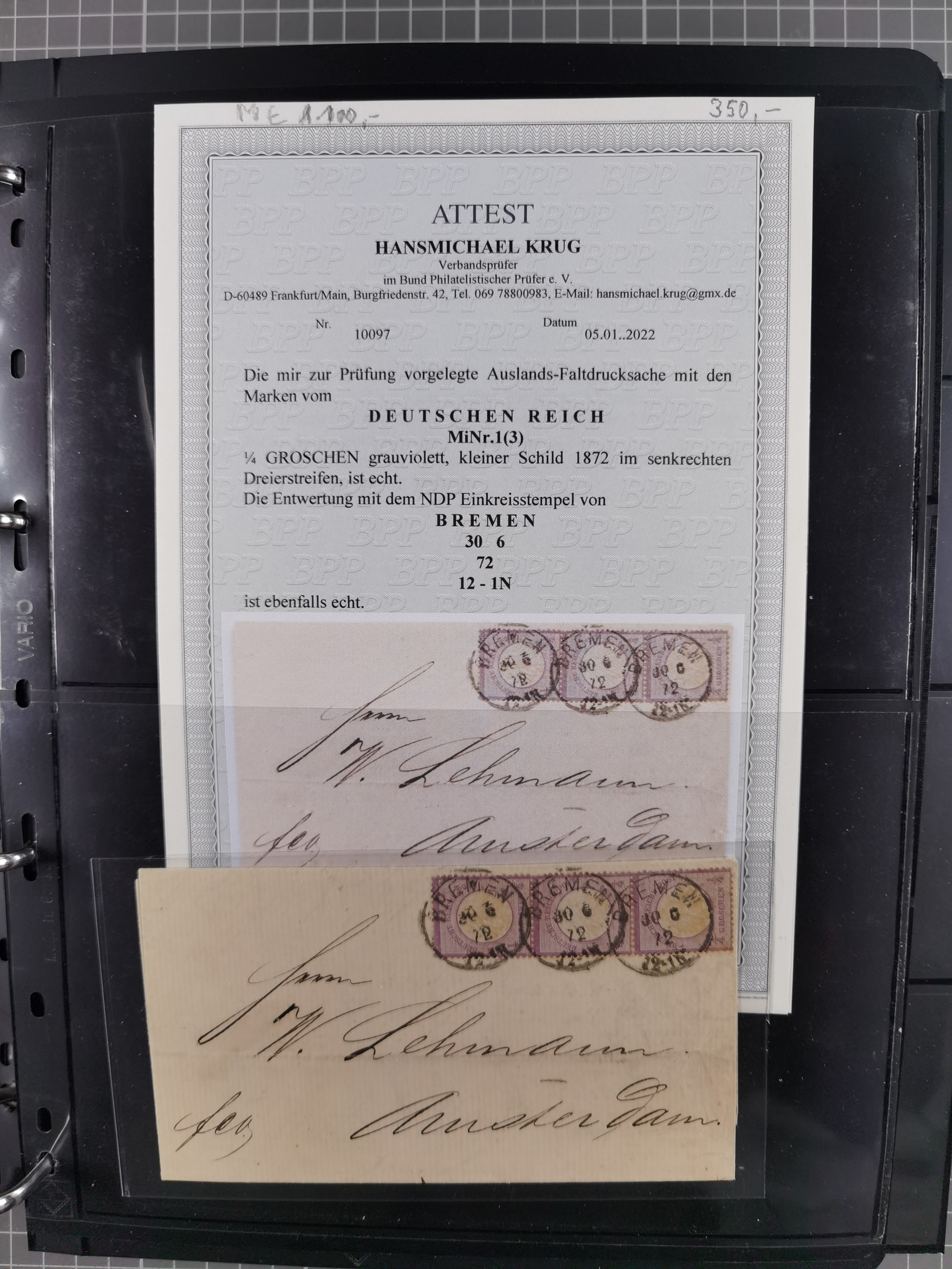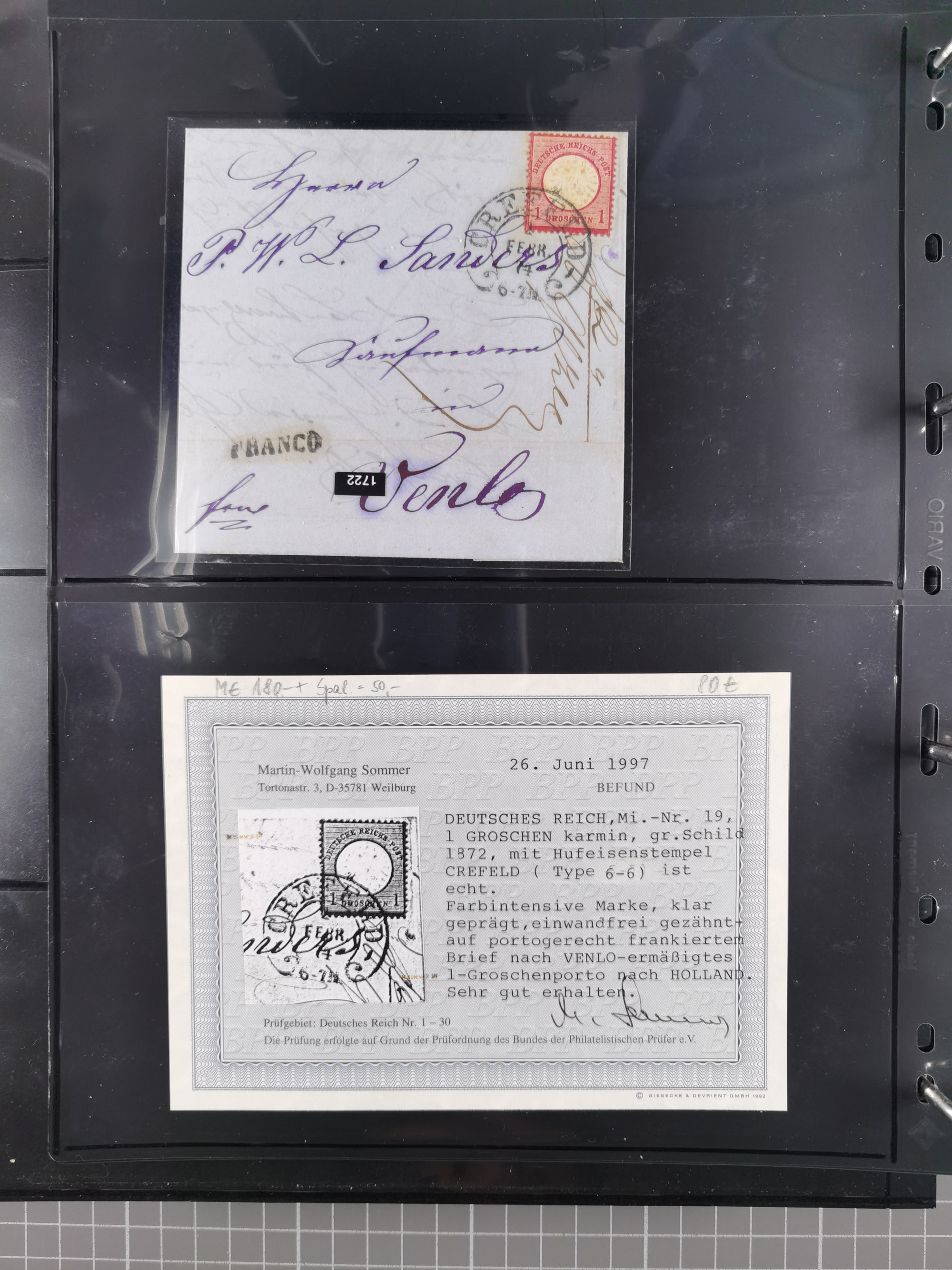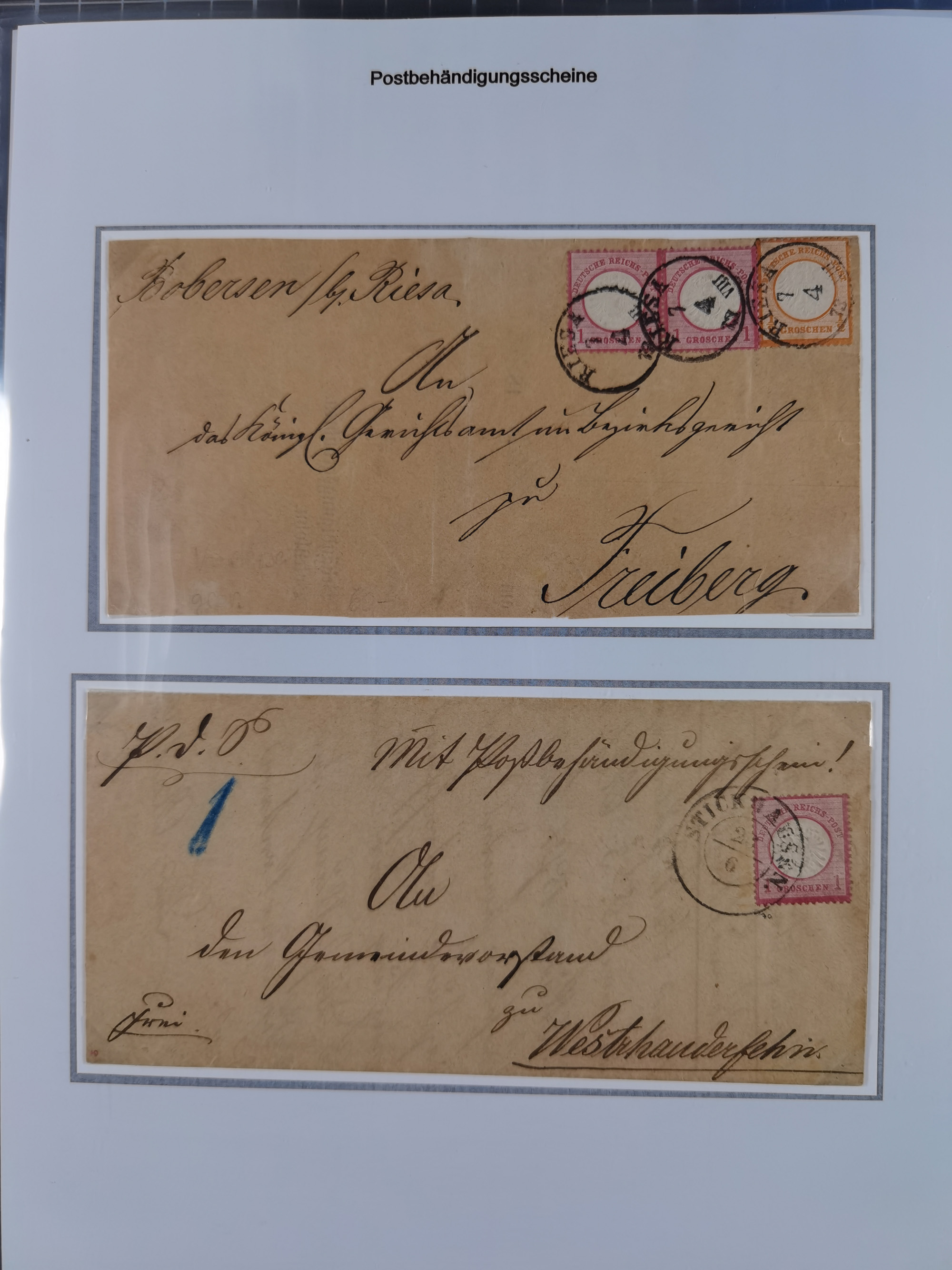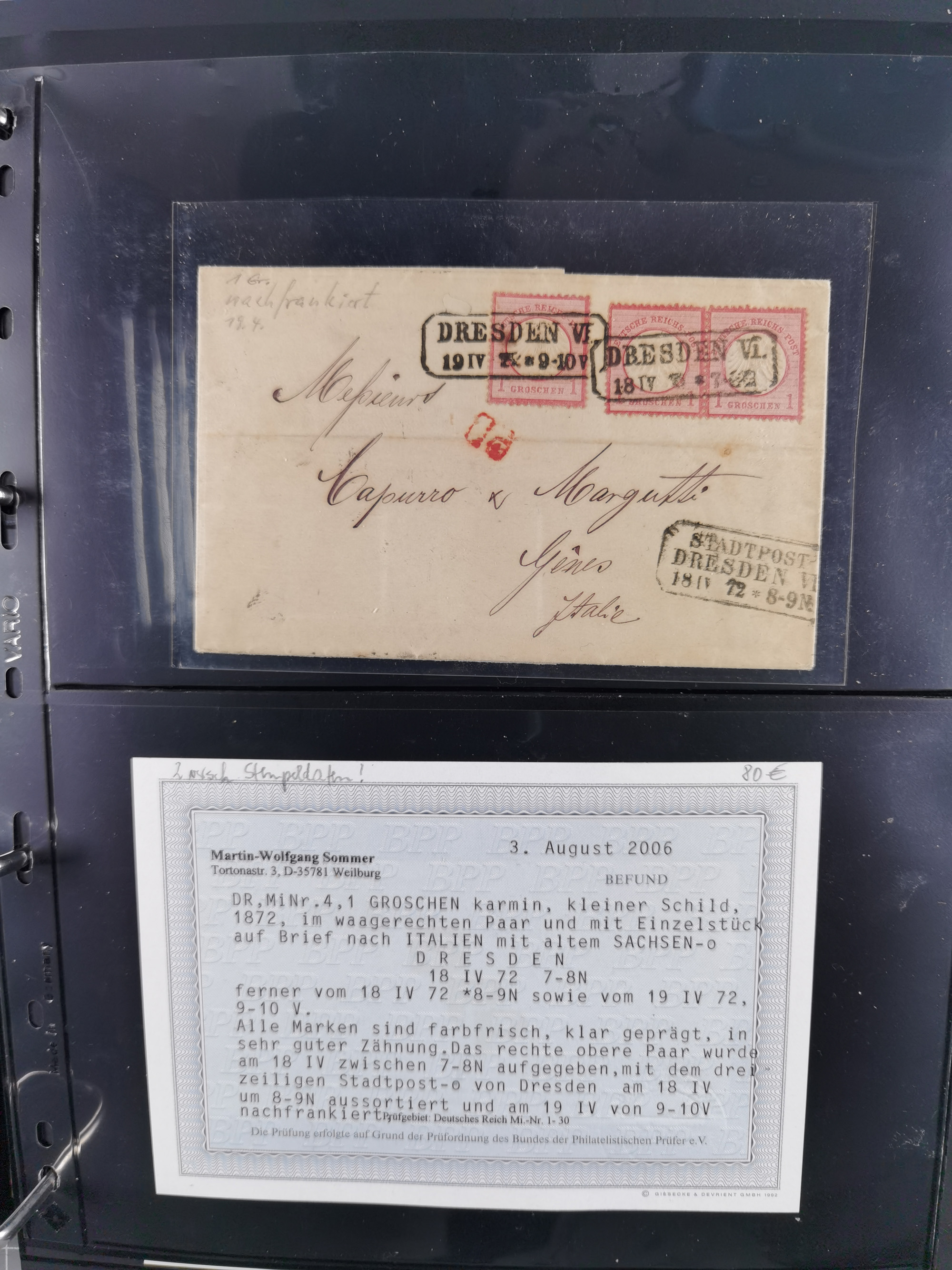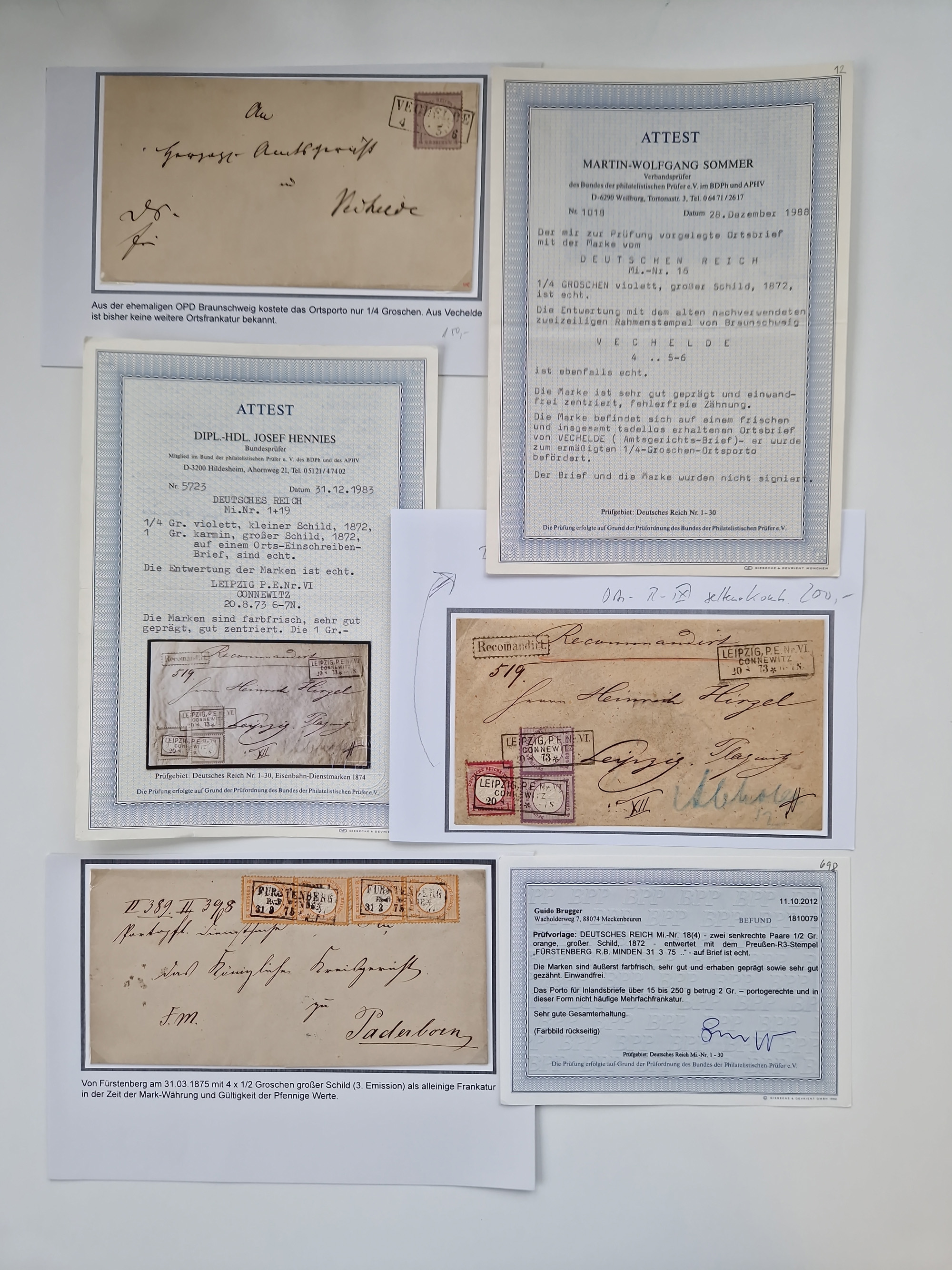 1872/75, Groschenbezirk, rund 60 Briefe und Ganzsachen, dabei viele interessante Belege, u.a. 1 (3) auf Drucksache nach Amsterdam, Express-Soldaten Brief, Orts-R-Brief von Berlin, Mi. 6 EF auf R-Brief nach Frankreich, 16 EF (2), 16 +18 auf Auslandsdrucksache, 16 (3) auf Auslandsdrucksache, 17 b auf Letzttag-Brief, 18 +19 auf eingeschriebenem Ortsbrief von Dresden, 19 mit bayerischem Stempel, 19 + 20 auf R-Brief in den Grenzrayon, etc. etc. Ein sehr interessantes Objekt, Alles signiert BPP bzw. 27 Atteste und 30 Befunde.