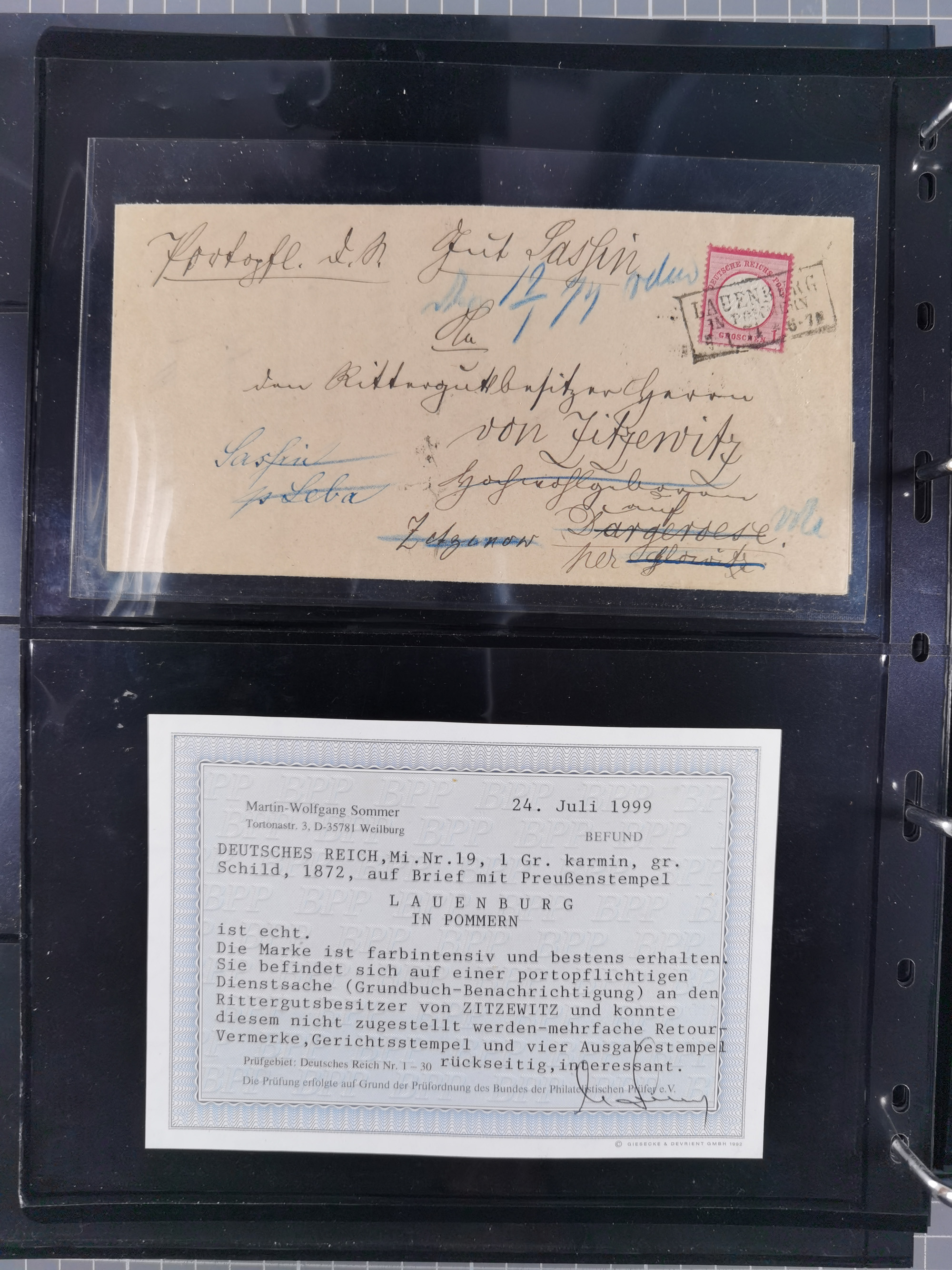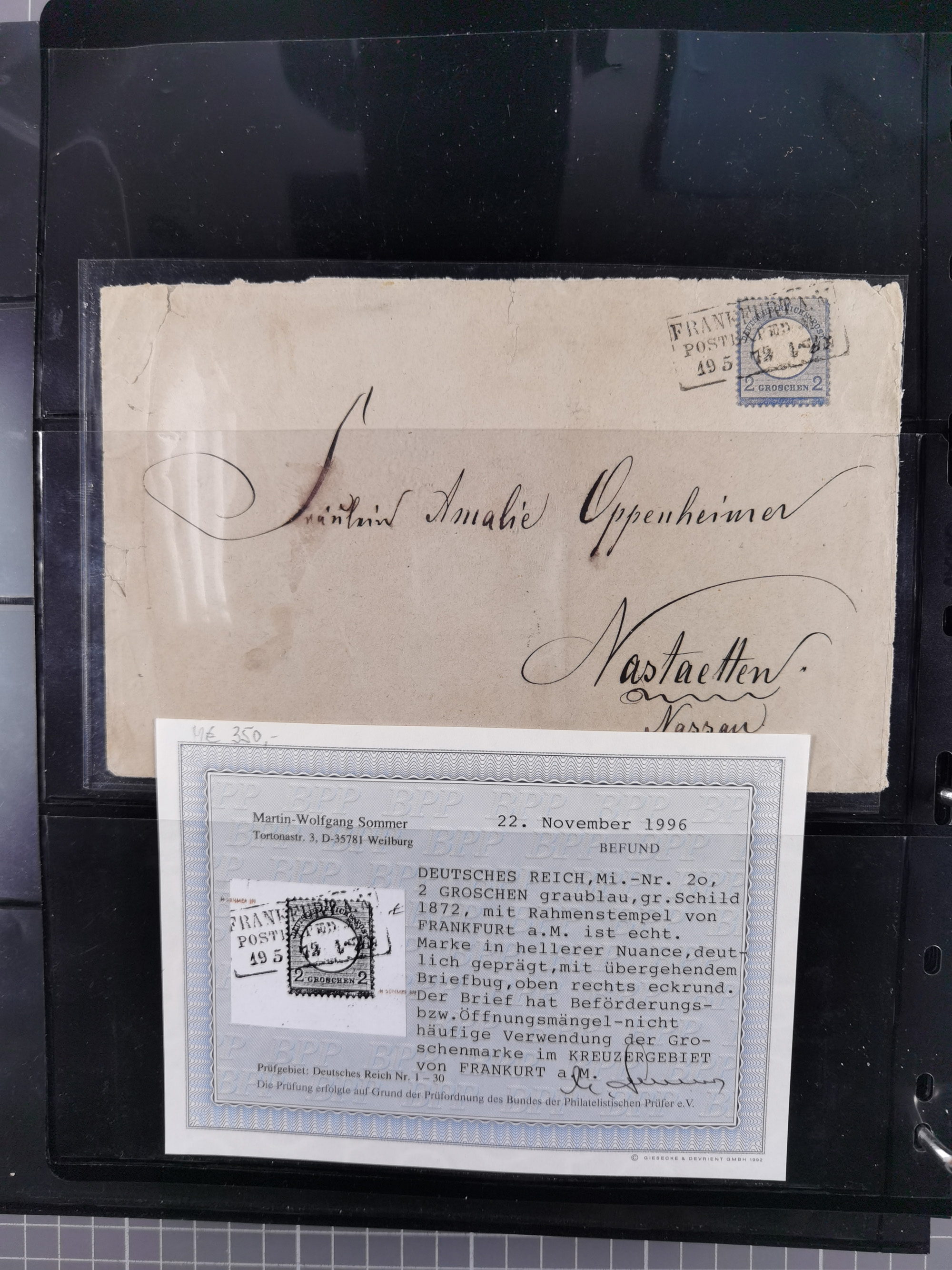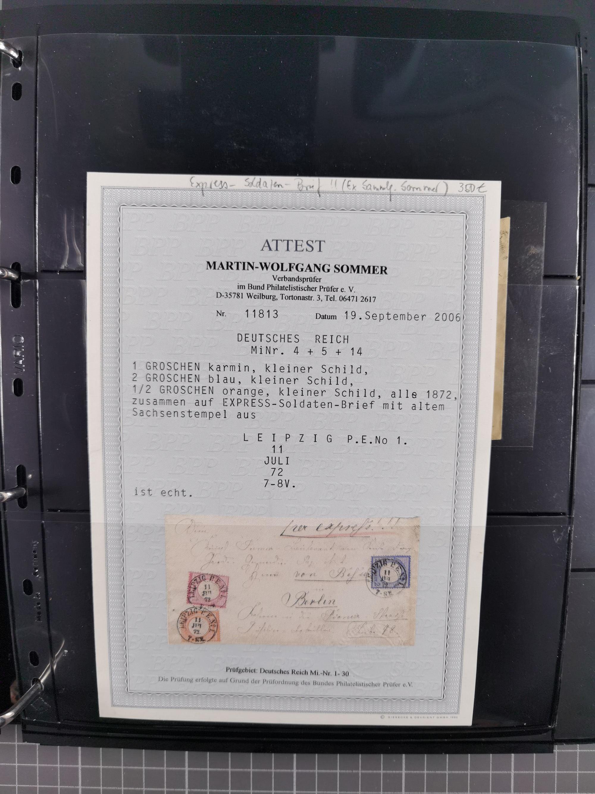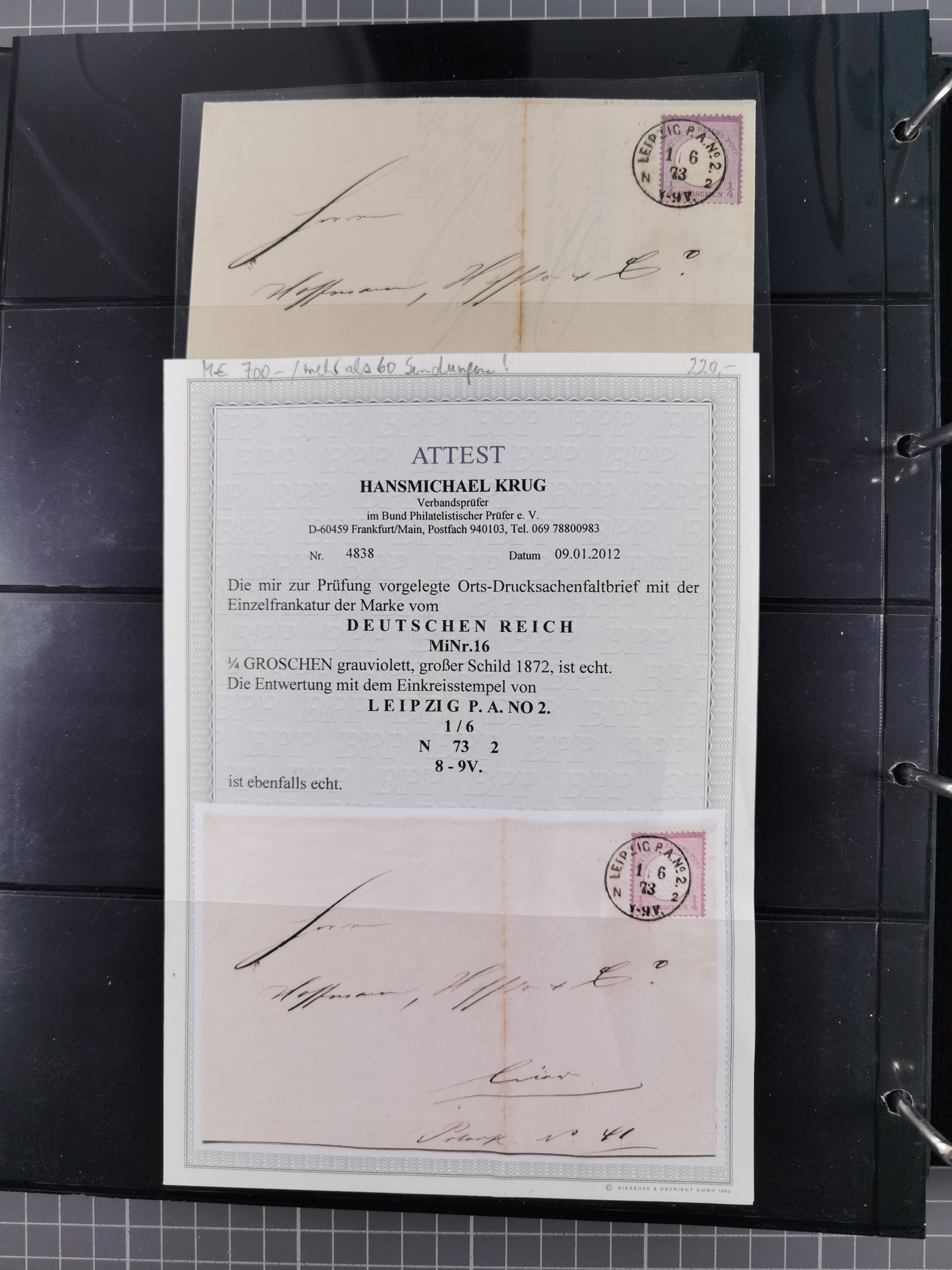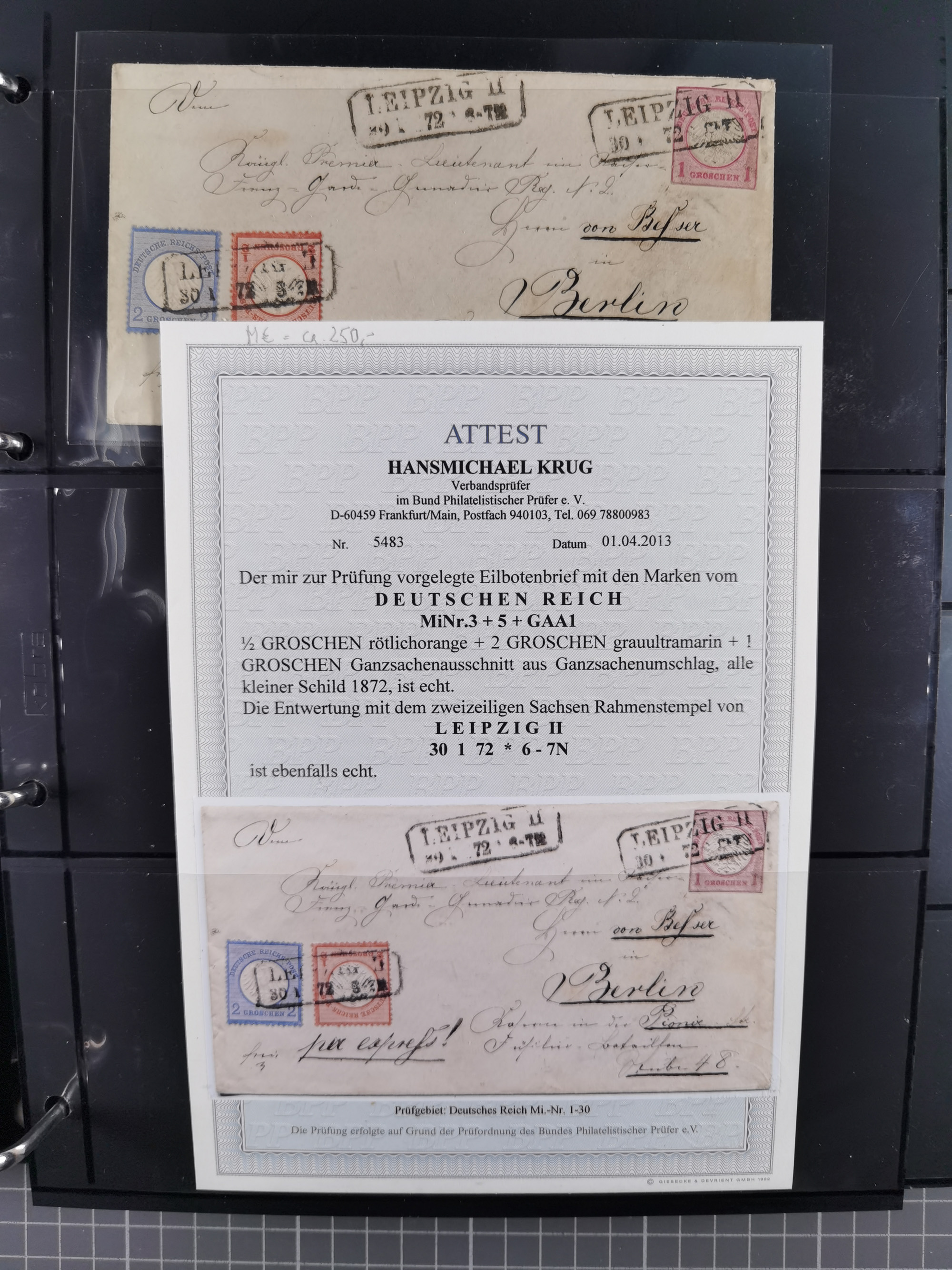 1872/75, Groschenbezirk, rund 60 Briefe und Ganzsachen, dabei viele interessante Belege, u.a. 1 (3) auf Drucksache nach Amsterdam, Express-Soldaten Brief, Orts-R-Brief von Berlin, Mi. 6 EF auf R-Brief nach Frankreich, 16 EF (2), 16 +18 auf Auslandsdrucksache, 16 (3) auf Auslandsdrucksache, 17 b auf Letzttag-Brief, 18 +19 auf eingeschriebenem Ortsbrief von Dresden, 19 mit bayerischem Stempel, 19 + 20 auf R-Brief in den Grenzrayon, etc. etc. Ein sehr interessantes Objekt, Alles signiert BPP bzw. 27 Atteste und 30 Befunde.