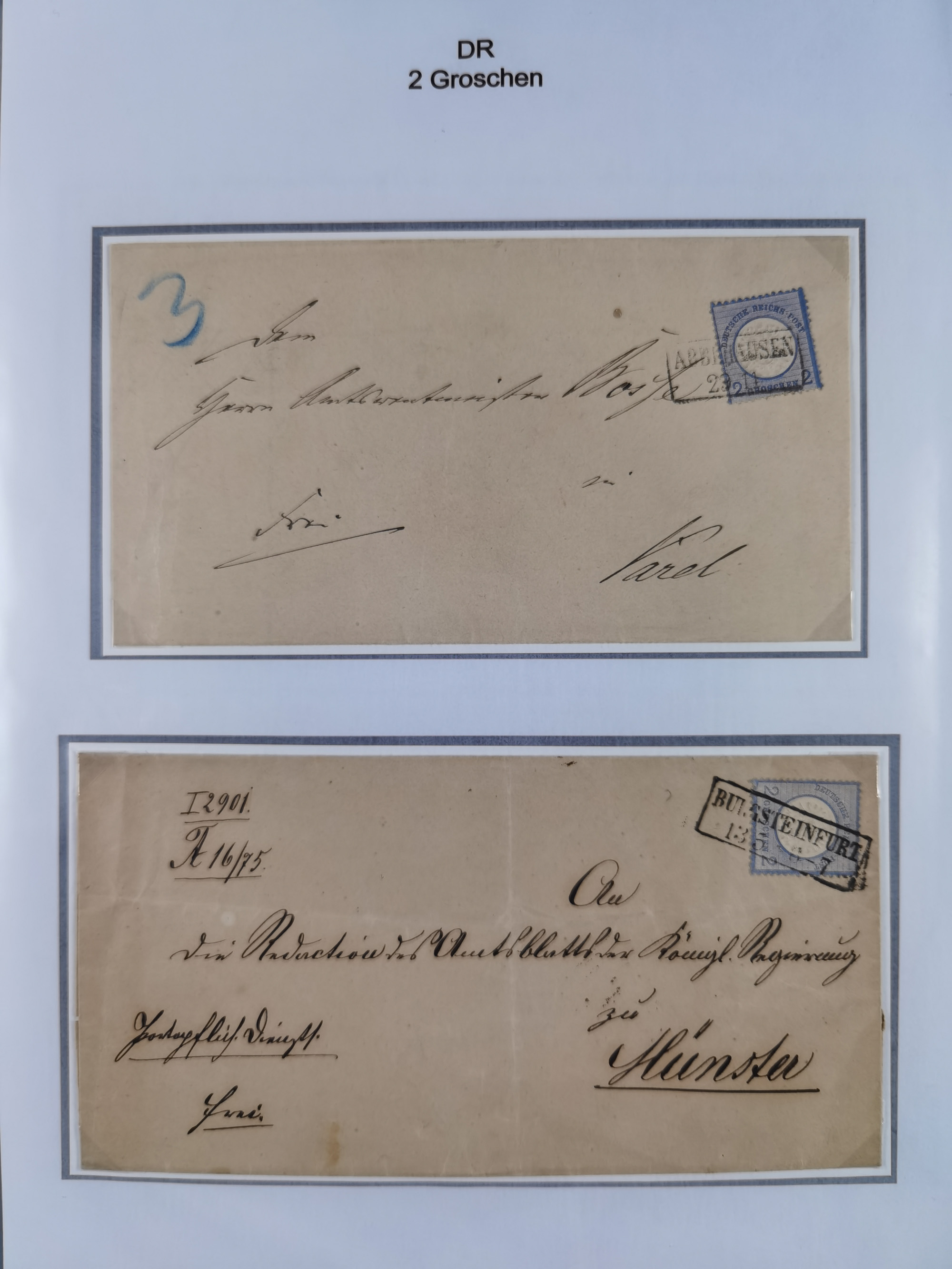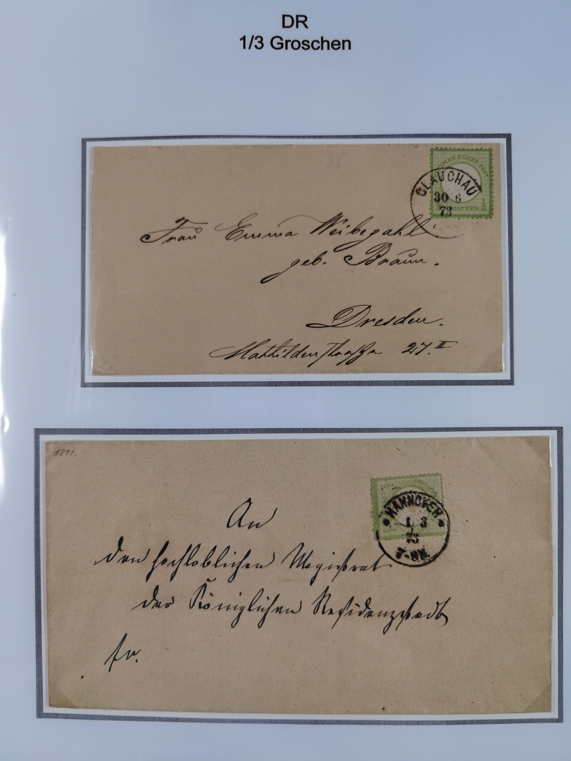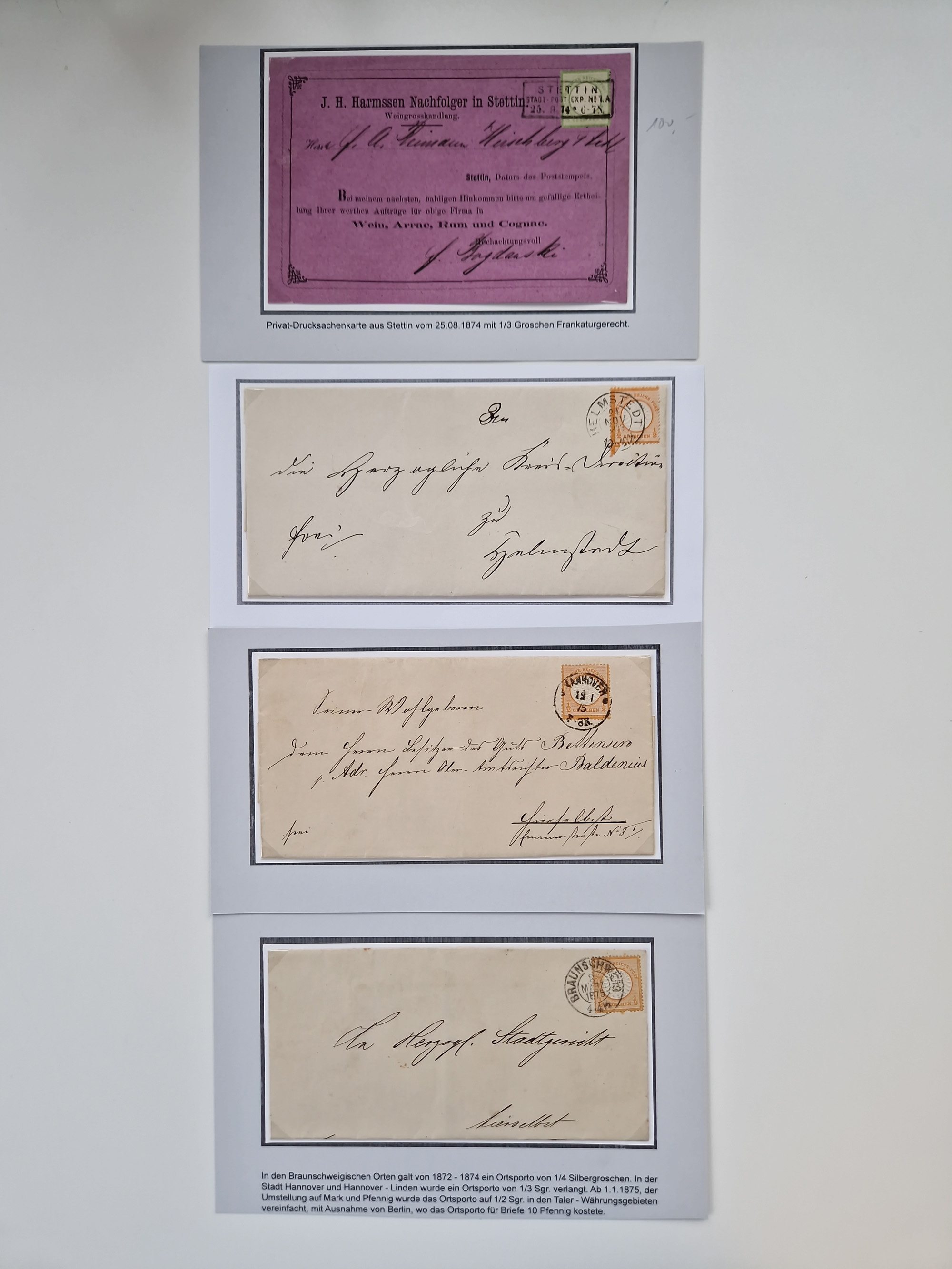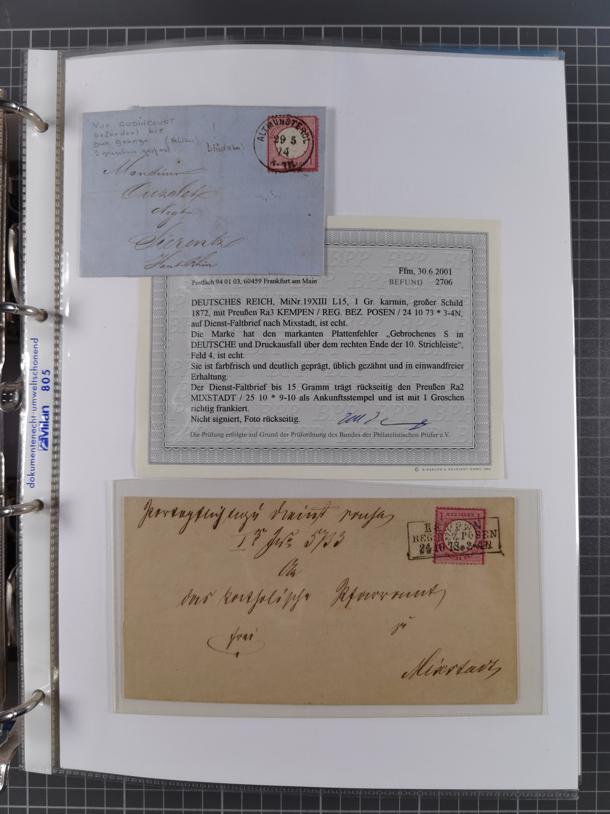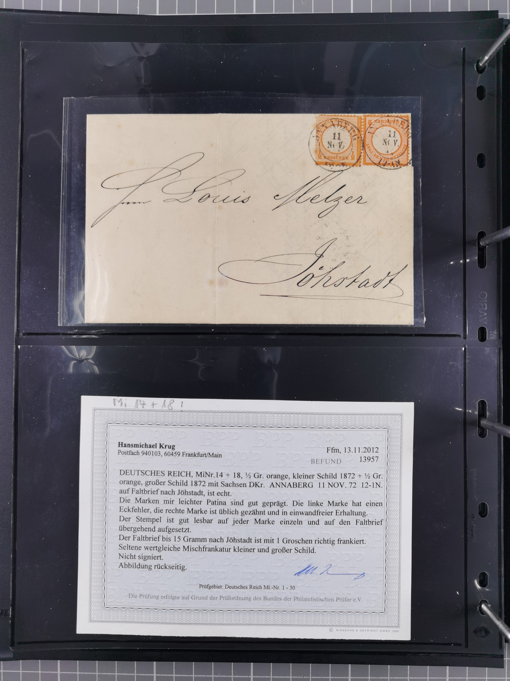 1872/75, Groschenbezirk, rund 60 Briefe und Ganzsachen, dabei viele interessante Belege, u.a. 1 (3) auf Drucksache nach Amsterdam, Express-Soldaten Brief, Orts-R-Brief von Berlin, Mi. 6 EF auf R-Brief nach Frankreich, 16 EF (2), 16 +18 auf Auslandsdrucksache, 16 (3) auf Auslandsdrucksache, 17 b auf Letzttag-Brief, 18 +19 auf eingeschriebenem Ortsbrief von Dresden, 19 mit bayerischem Stempel, 19 + 20 auf R-Brief in den Grenzrayon, etc. etc. Ein sehr interessantes Objekt, Alles signiert BPP bzw. 27 Atteste und 30 Befunde.