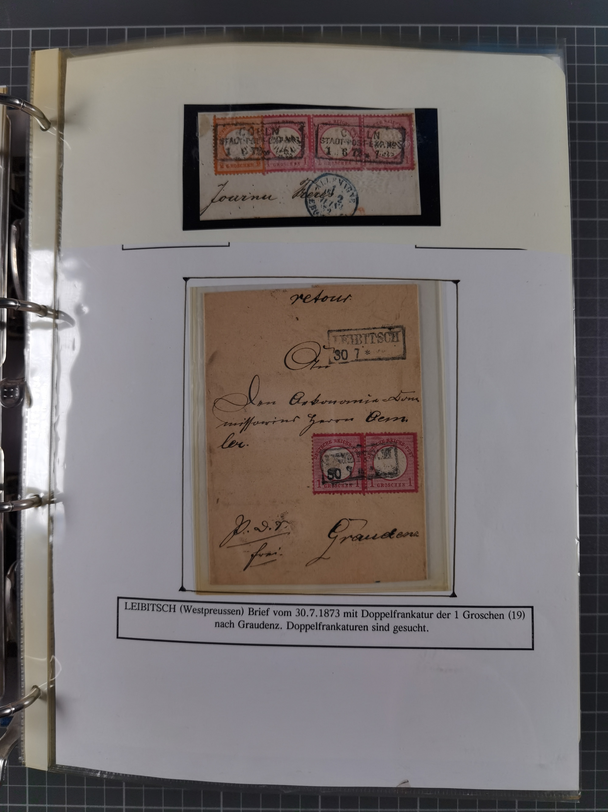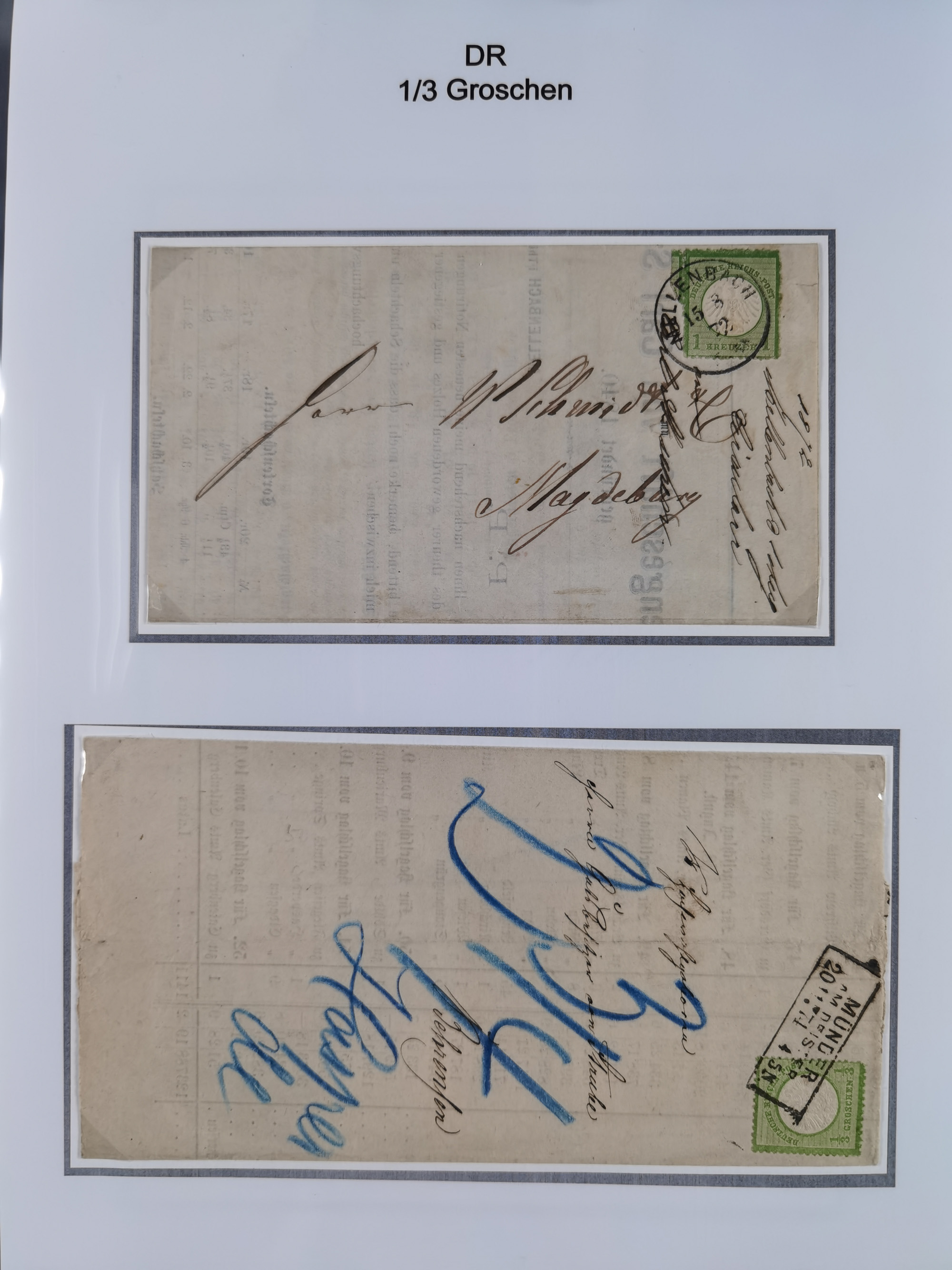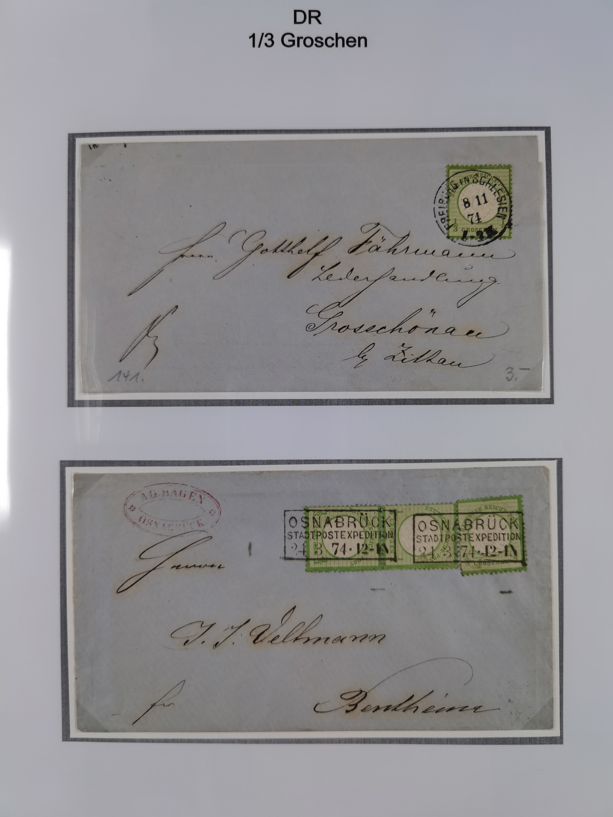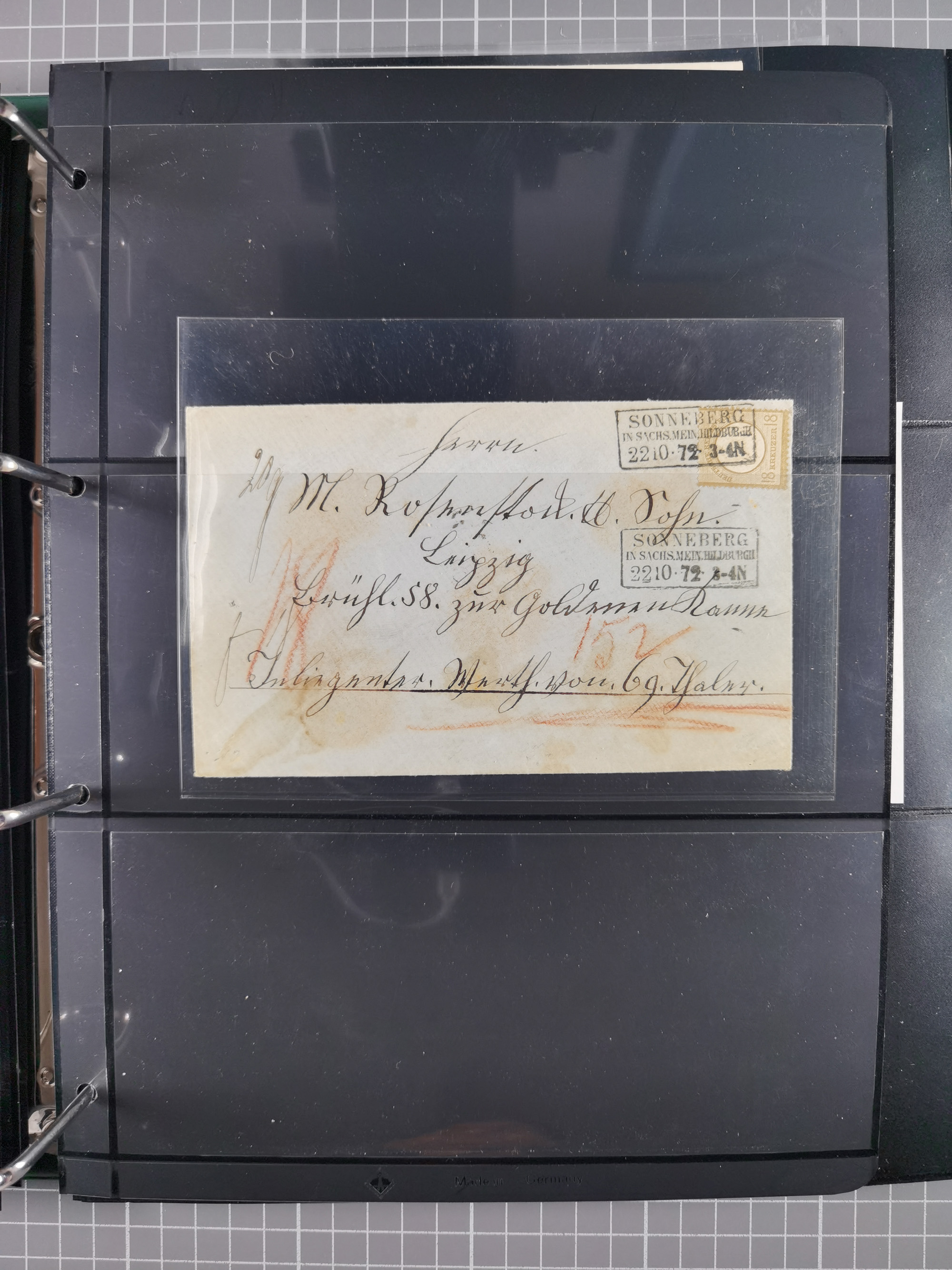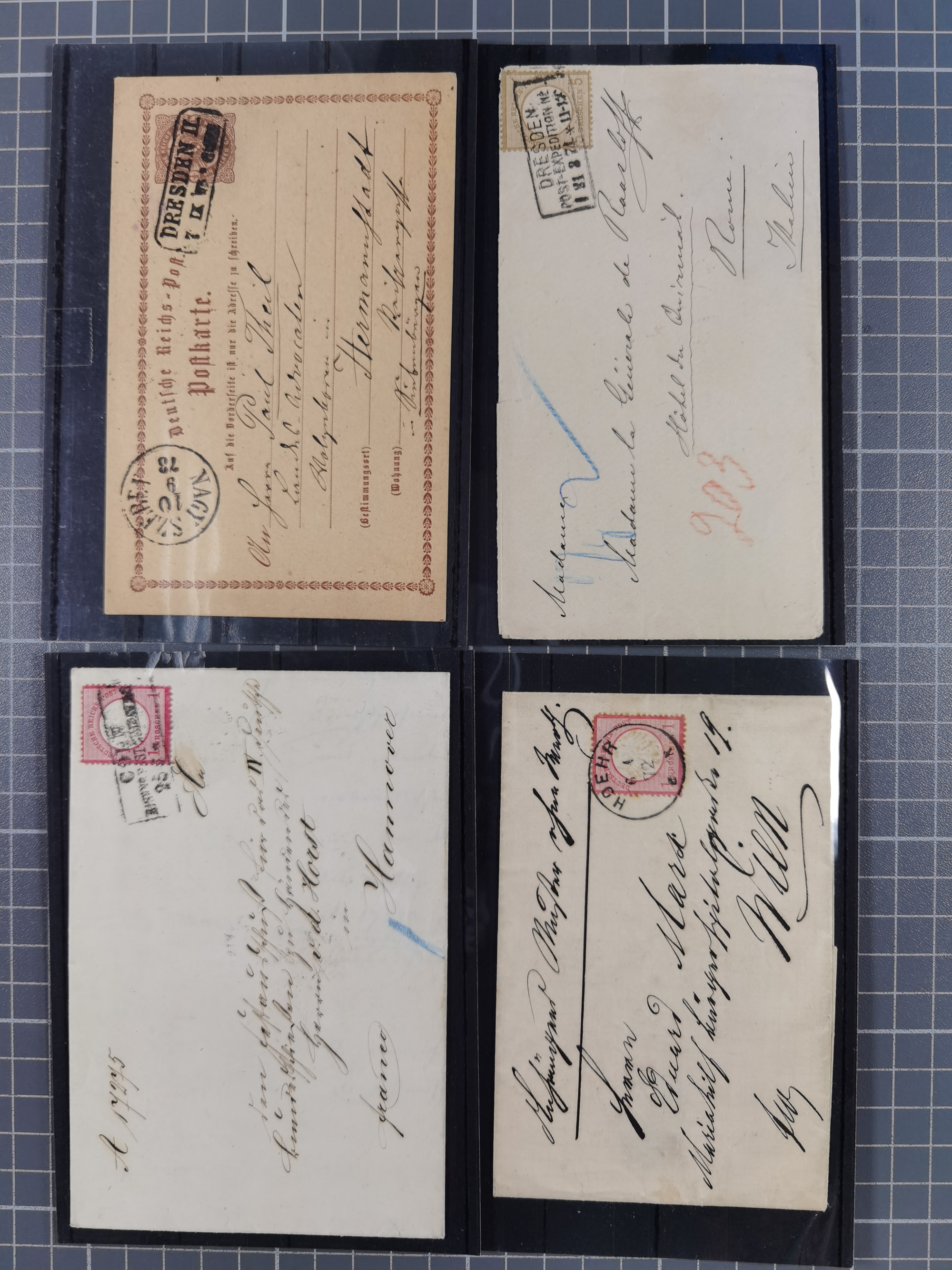 1872/75, Groschenbezirk, rund 60 Briefe und Ganzsachen, dabei viele interessante Belege, u.a. 1 (3) auf Drucksache nach Amsterdam, Express-Soldaten Brief, Orts-R-Brief von Berlin, Mi. 6 EF auf R-Brief nach Frankreich, 16 EF (2), 16 +18 auf Auslandsdrucksache, 16 (3) auf Auslandsdrucksache, 17 b auf Letzttag-Brief, 18 +19 auf eingeschriebenem Ortsbrief von Dresden, 19 mit bayerischem Stempel, 19 + 20 auf R-Brief in den Grenzrayon, etc. etc. Ein sehr interessantes Objekt, Alles signiert BPP bzw. 27 Atteste und 30 Befunde.