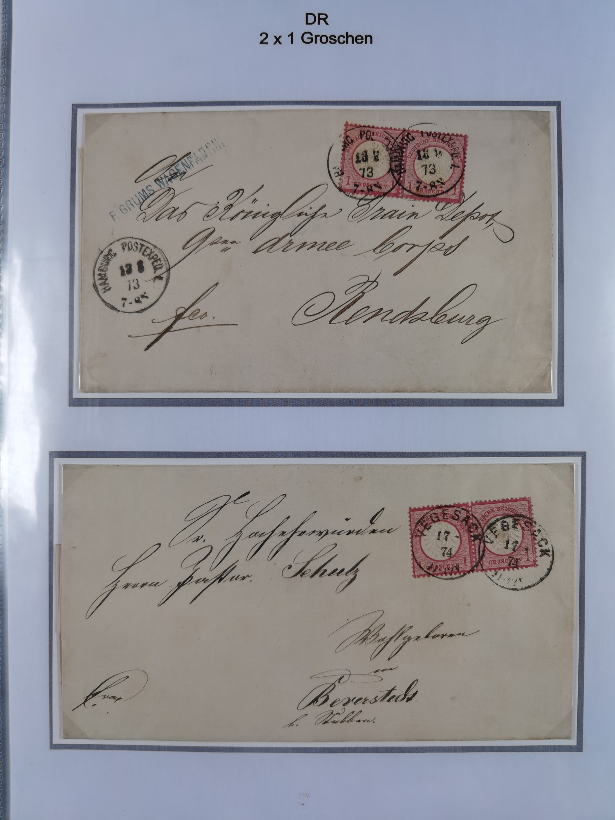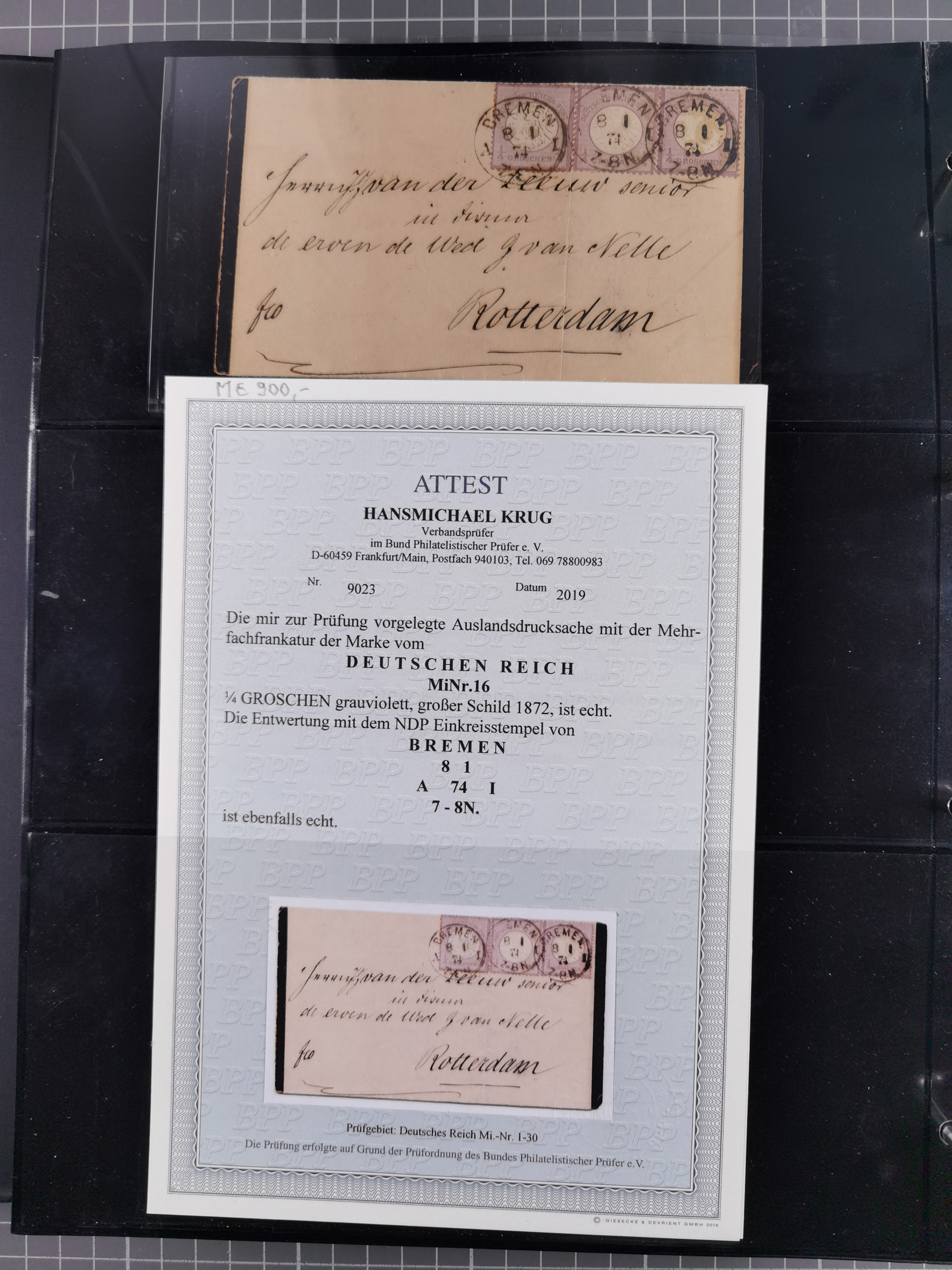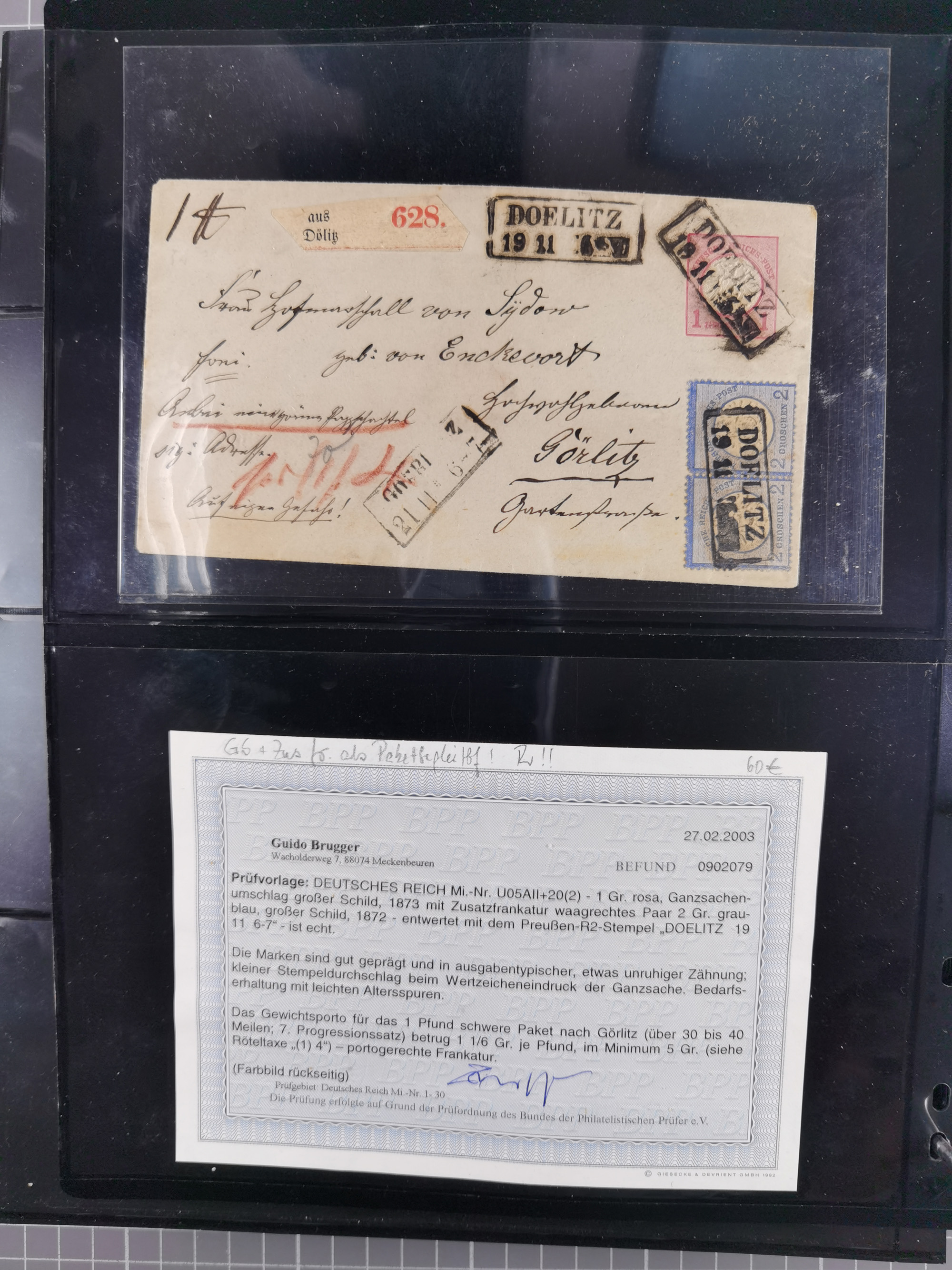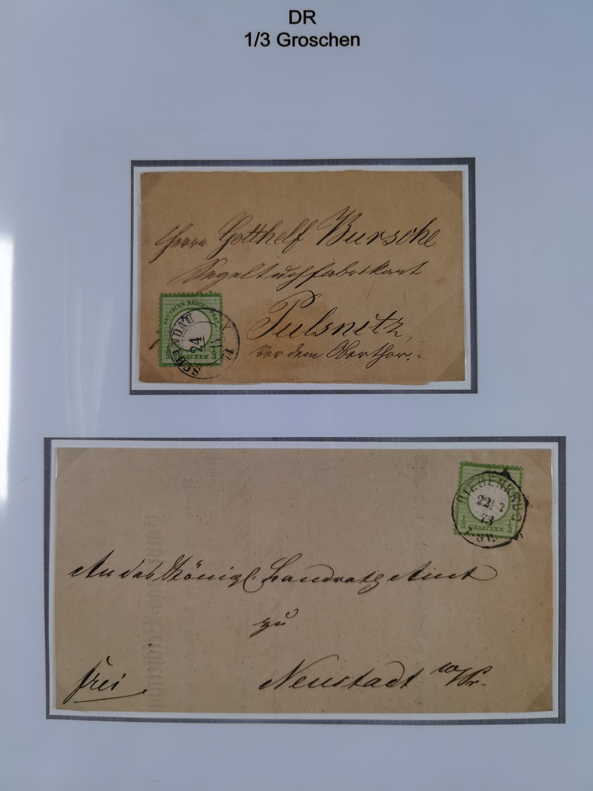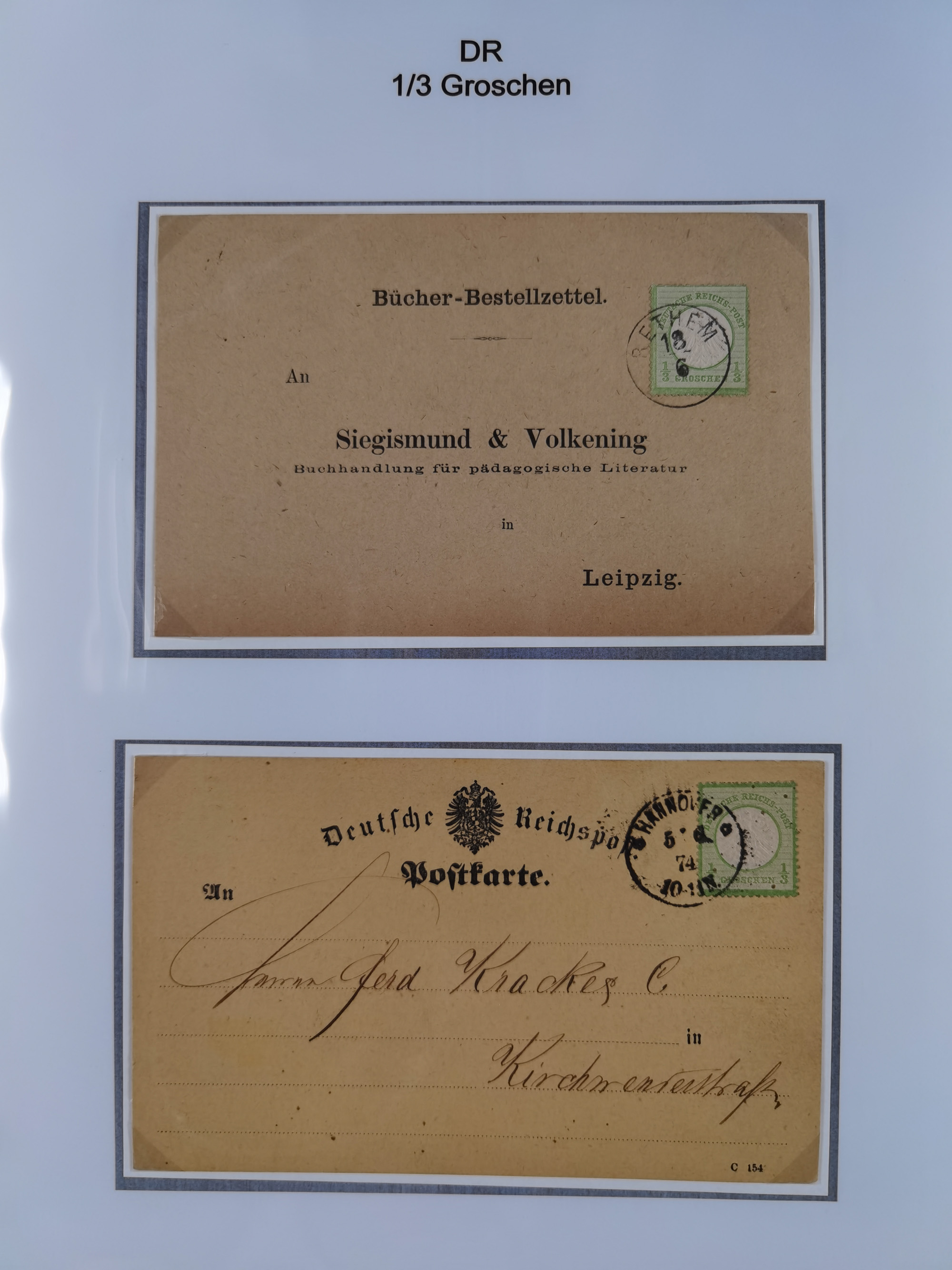 1872/75, Groschenbezirk, rund 60 Briefe und Ganzsachen, dabei viele interessante Belege, u.a. 1 (3) auf Drucksache nach Amsterdam, Express-Soldaten Brief, Orts-R-Brief von Berlin, Mi. 6 EF auf R-Brief nach Frankreich, 16 EF (2), 16 +18 auf Auslandsdrucksache, 16 (3) auf Auslandsdrucksache, 17 b auf Letzttag-Brief, 18 +19 auf eingeschriebenem Ortsbrief von Dresden, 19 mit bayerischem Stempel, 19 + 20 auf R-Brief in den Grenzrayon, etc. etc. Ein sehr interessantes Objekt, Alles signiert BPP bzw. 27 Atteste und 30 Befunde.