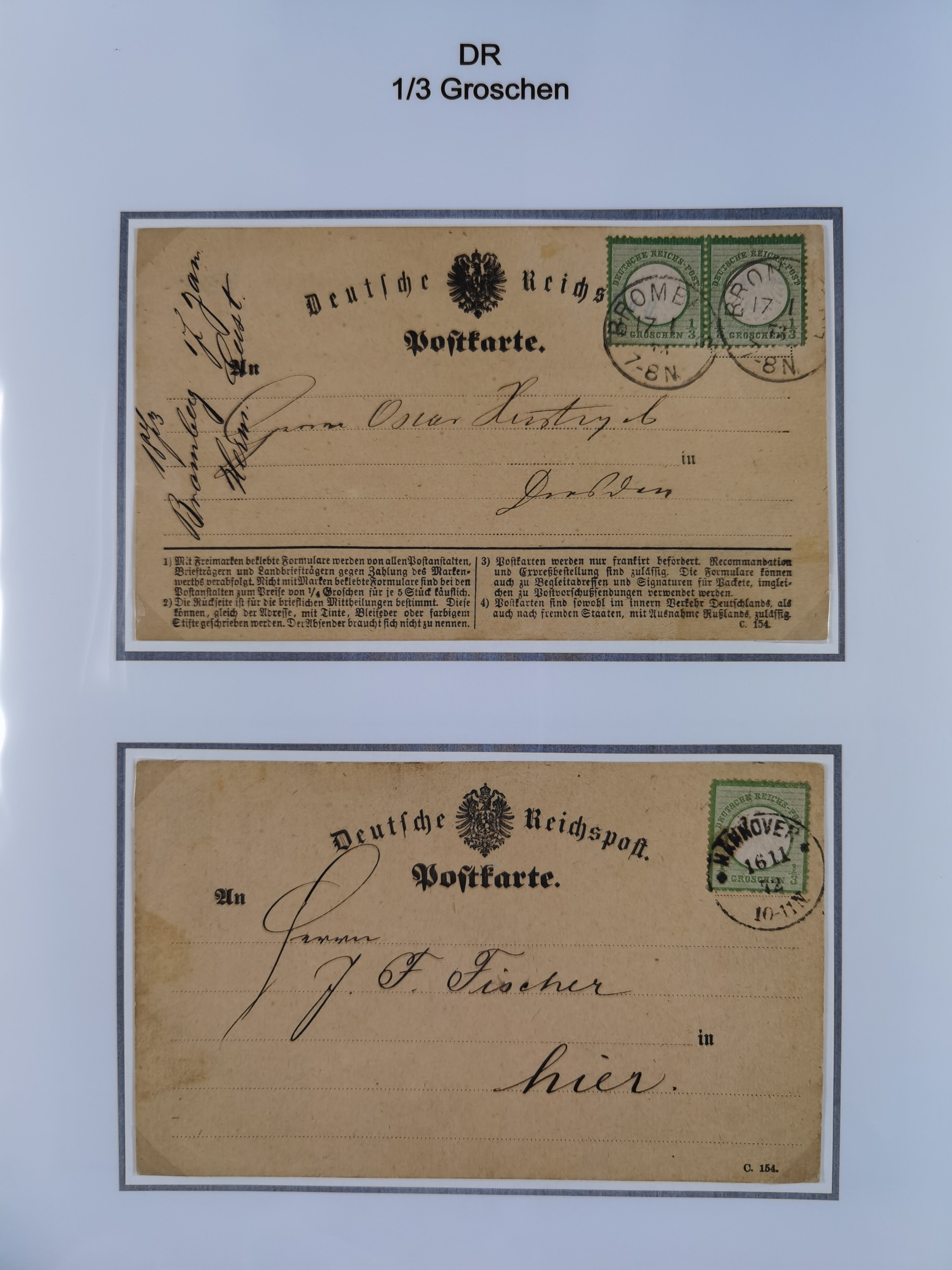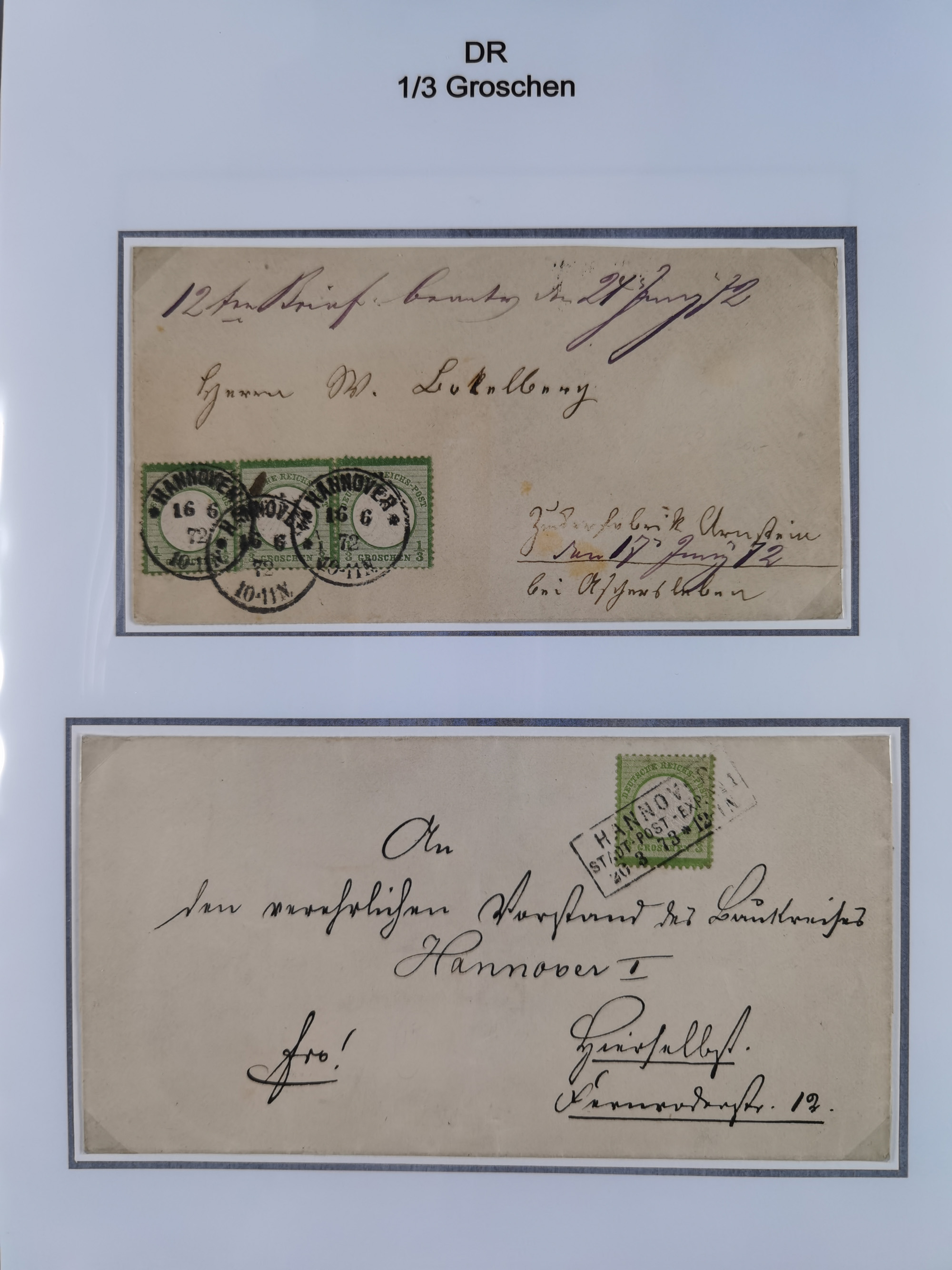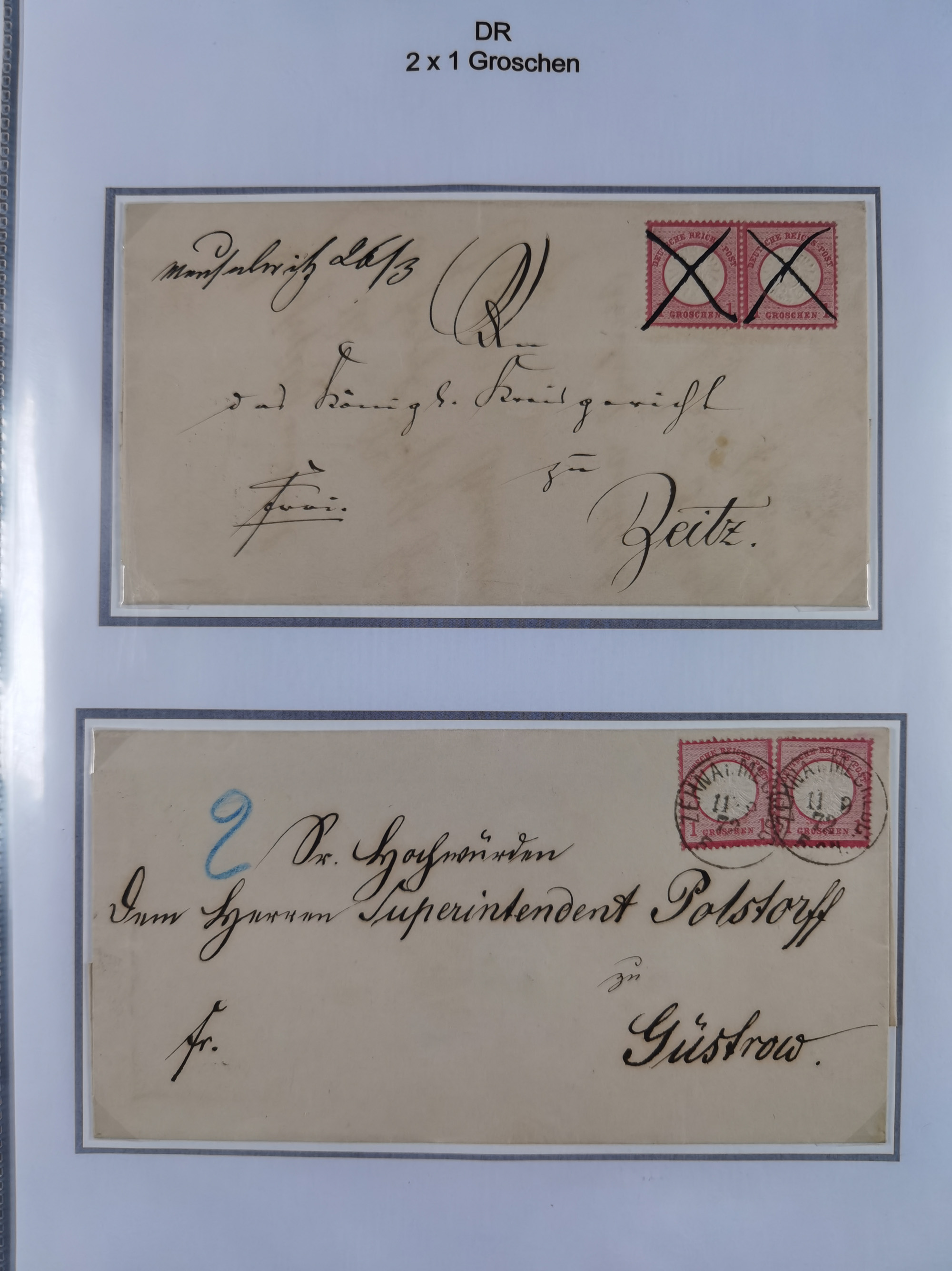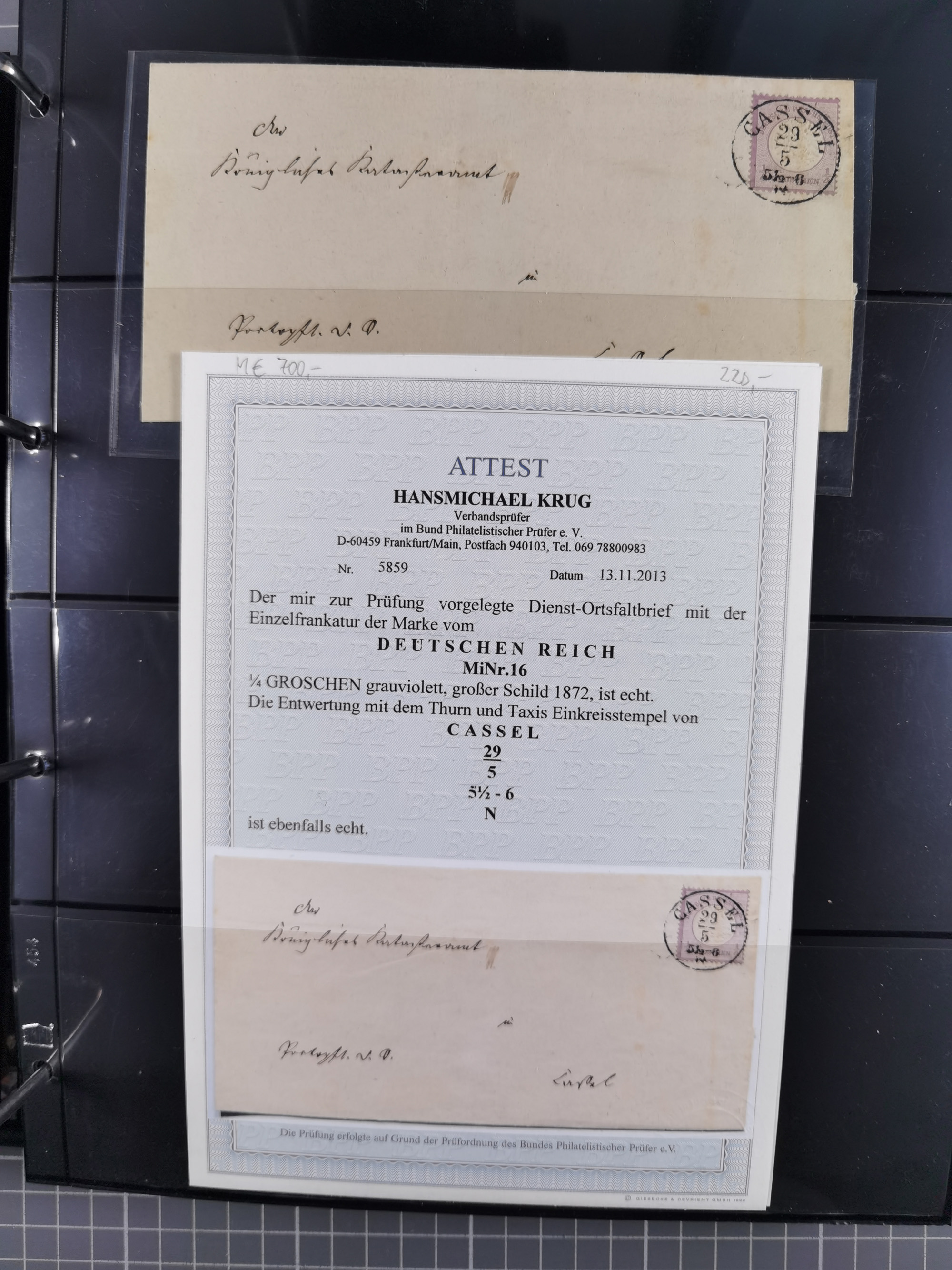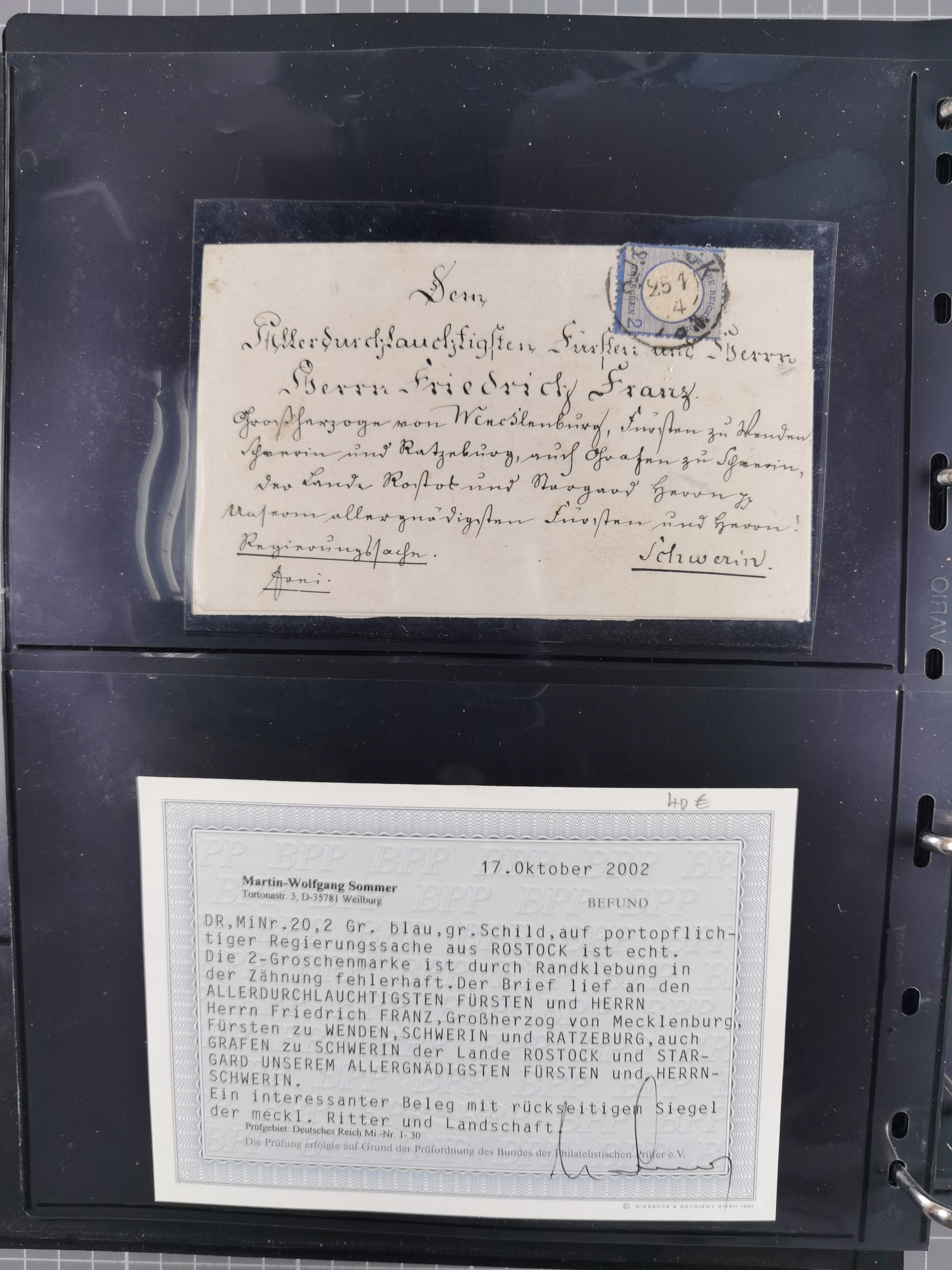 1872/75, Groschenbezirk, rund 60 Briefe und Ganzsachen, dabei viele interessante Belege, u.a. 1 (3) auf Drucksache nach Amsterdam, Express-Soldaten Brief, Orts-R-Brief von Berlin, Mi. 6 EF auf R-Brief nach Frankreich, 16 EF (2), 16 +18 auf Auslandsdrucksache, 16 (3) auf Auslandsdrucksache, 17 b auf Letzttag-Brief, 18 +19 auf eingeschriebenem Ortsbrief von Dresden, 19 mit bayerischem Stempel, 19 + 20 auf R-Brief in den Grenzrayon, etc. etc. Ein sehr interessantes Objekt, Alles signiert BPP bzw. 27 Atteste und 30 Befunde.