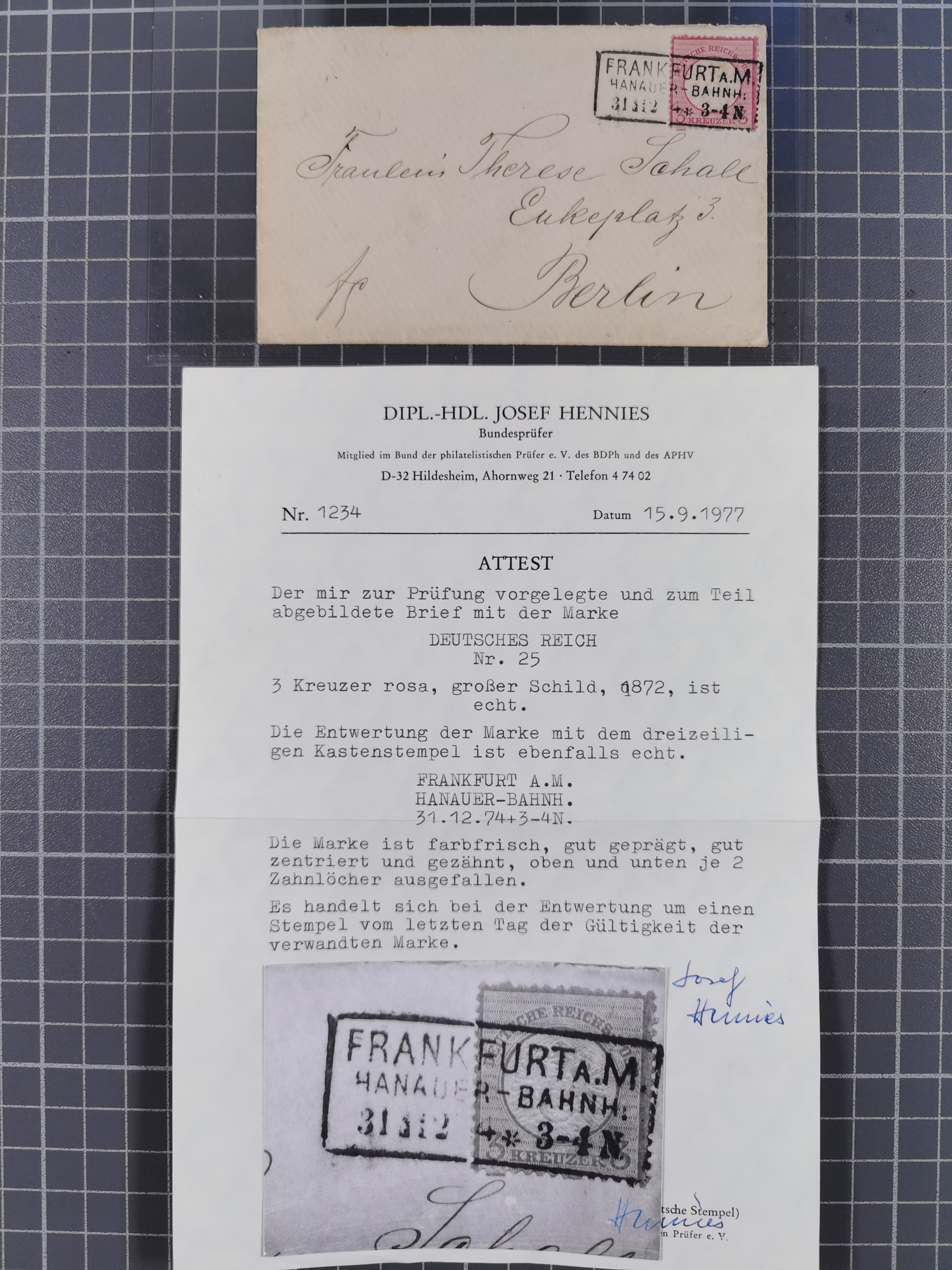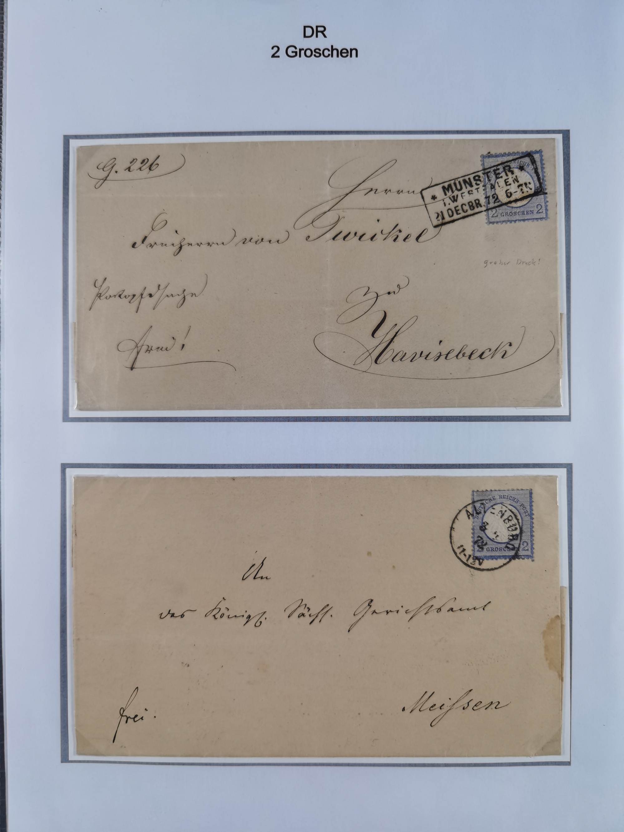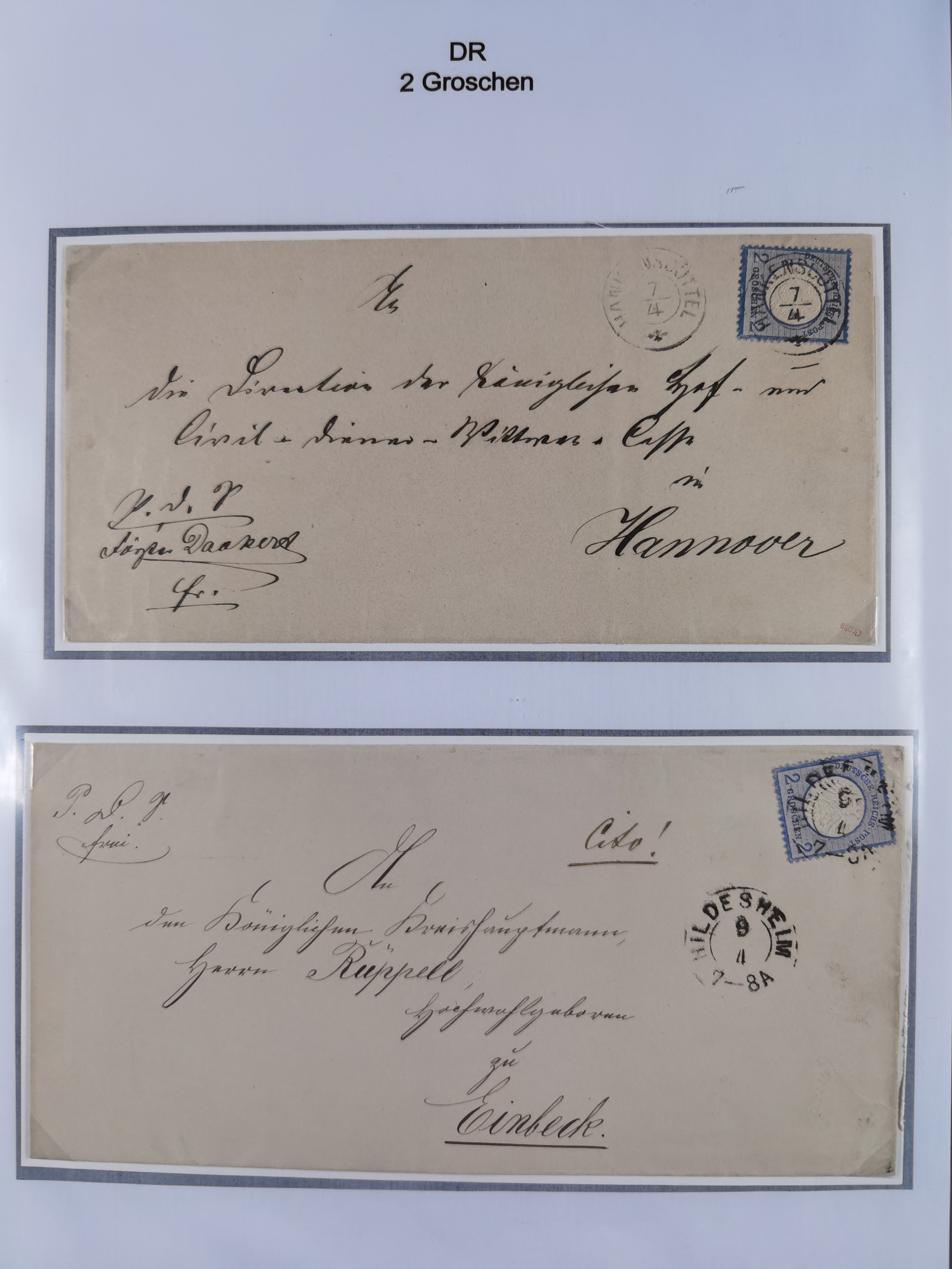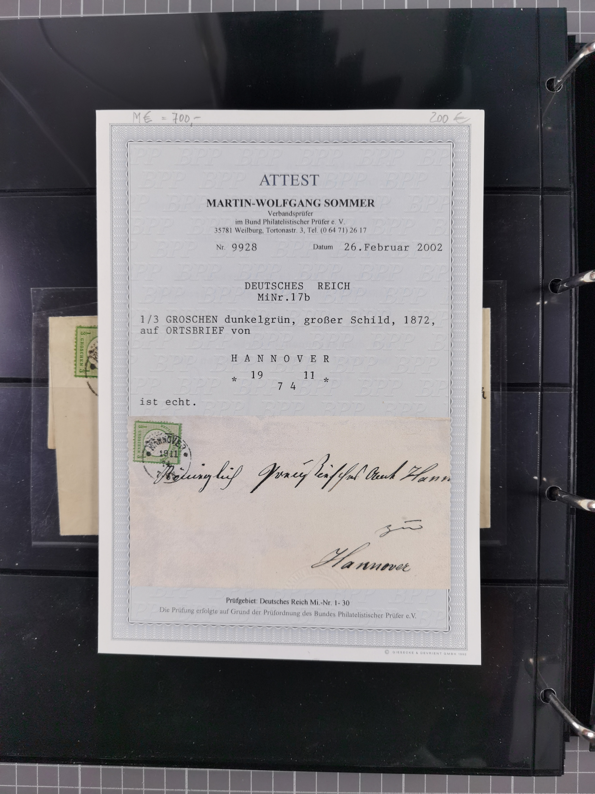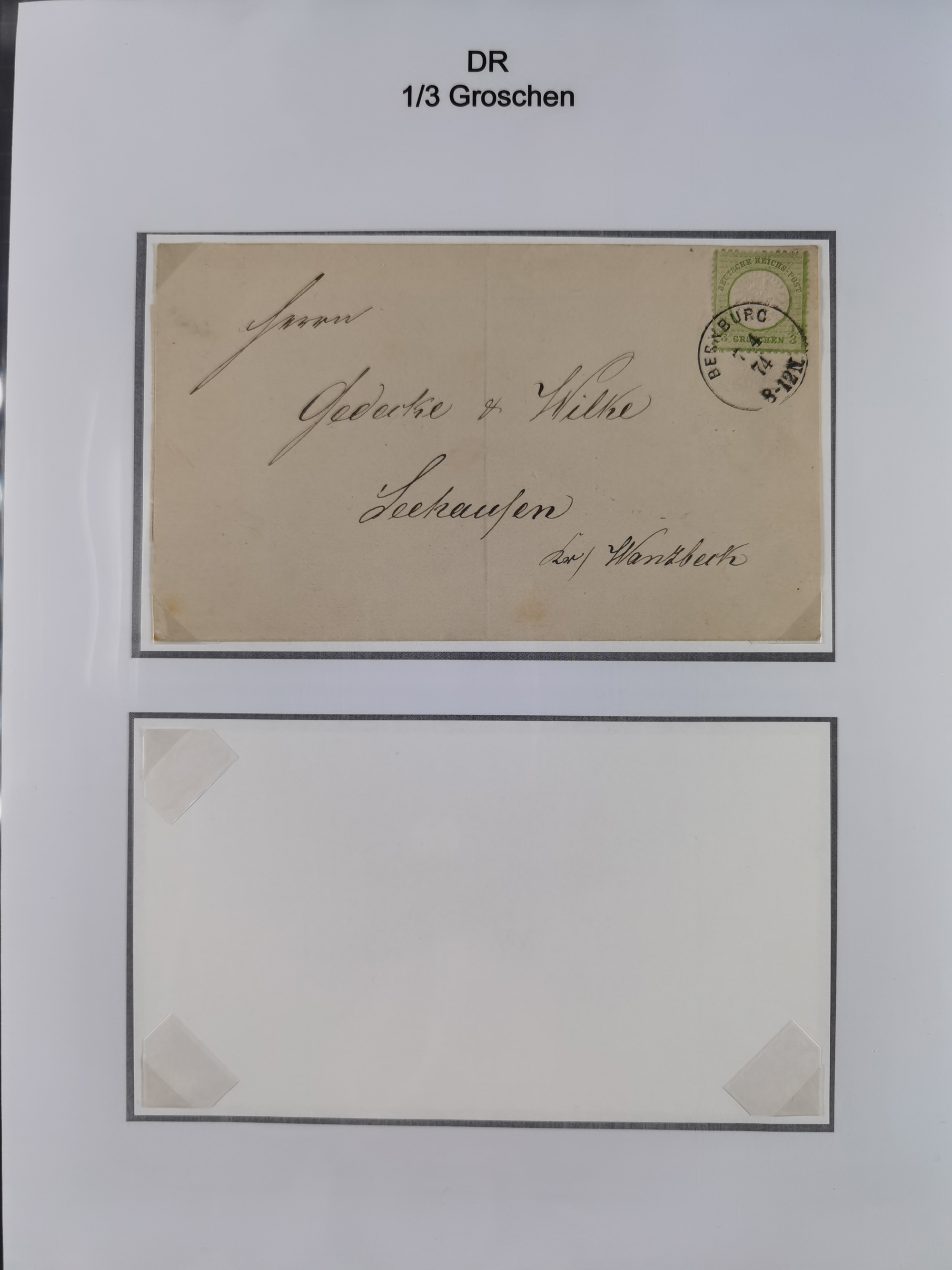 1872/75, Groschenbezirk, rund 60 Briefe und Ganzsachen, dabei viele interessante Belege, u.a. 1 (3) auf Drucksache nach Amsterdam, Express-Soldaten Brief, Orts-R-Brief von Berlin, Mi. 6 EF auf R-Brief nach Frankreich, 16 EF (2), 16 +18 auf Auslandsdrucksache, 16 (3) auf Auslandsdrucksache, 17 b auf Letzttag-Brief, 18 +19 auf eingeschriebenem Ortsbrief von Dresden, 19 mit bayerischem Stempel, 19 + 20 auf R-Brief in den Grenzrayon, etc. etc. Ein sehr interessantes Objekt, Alles signiert BPP bzw. 27 Atteste und 30 Befunde.