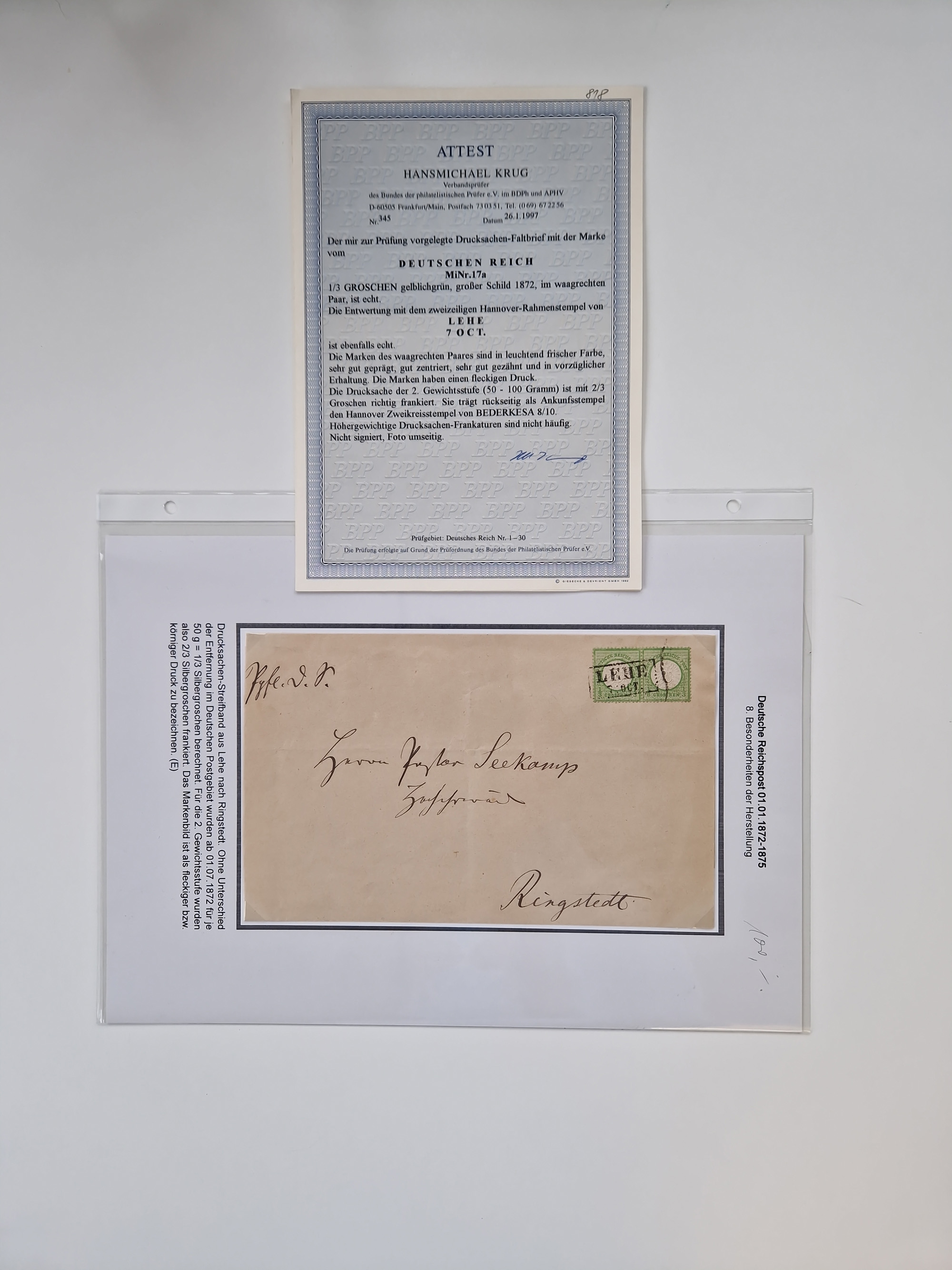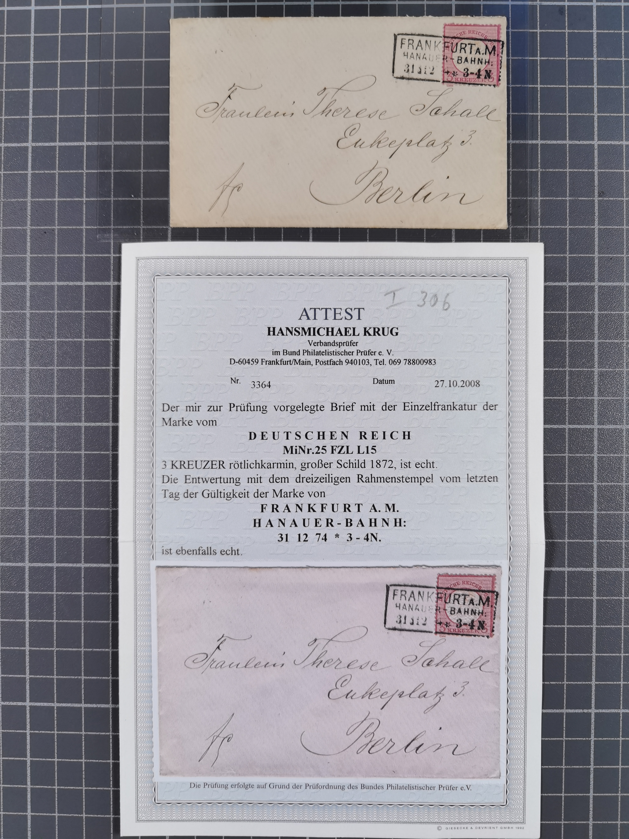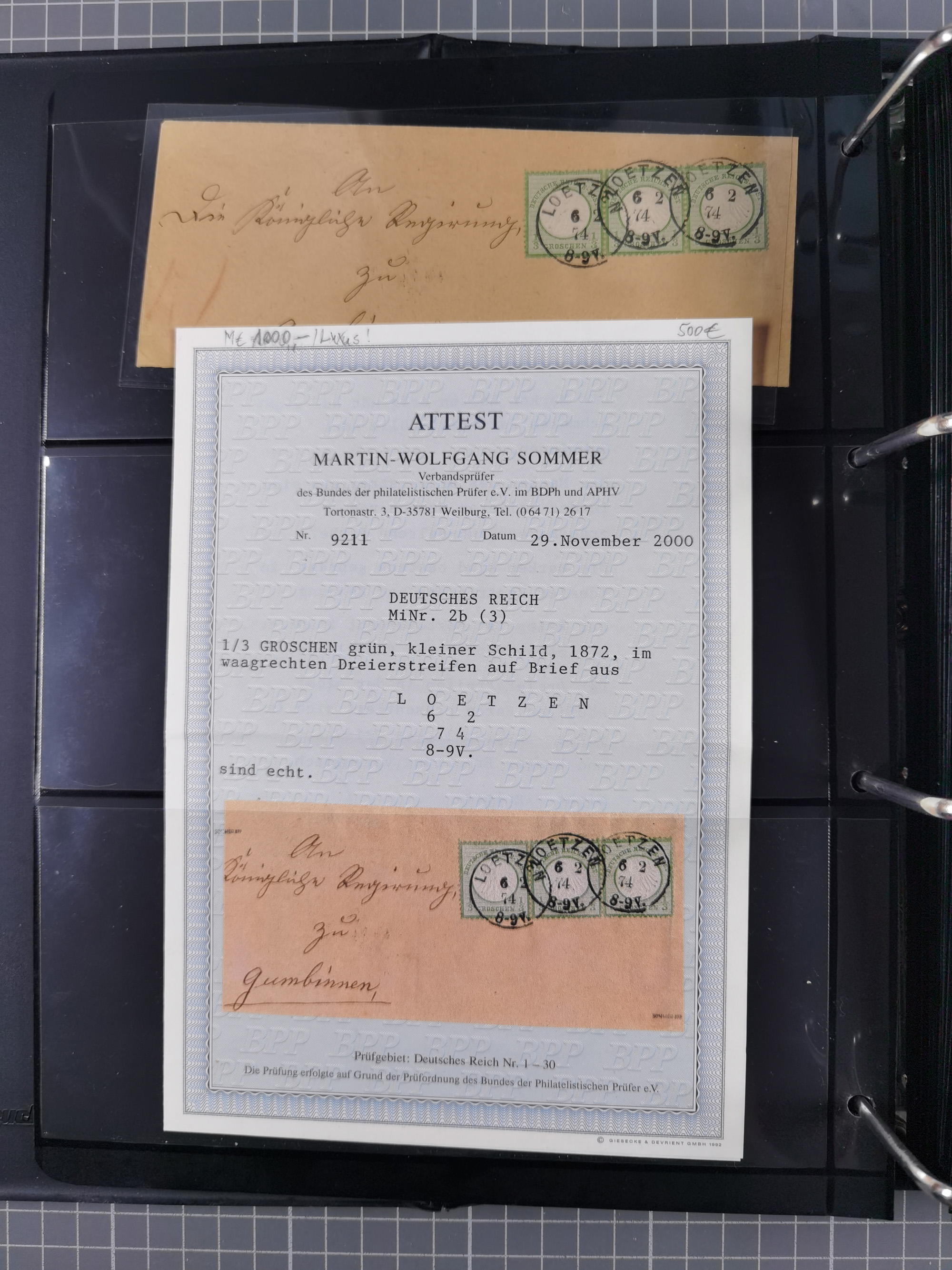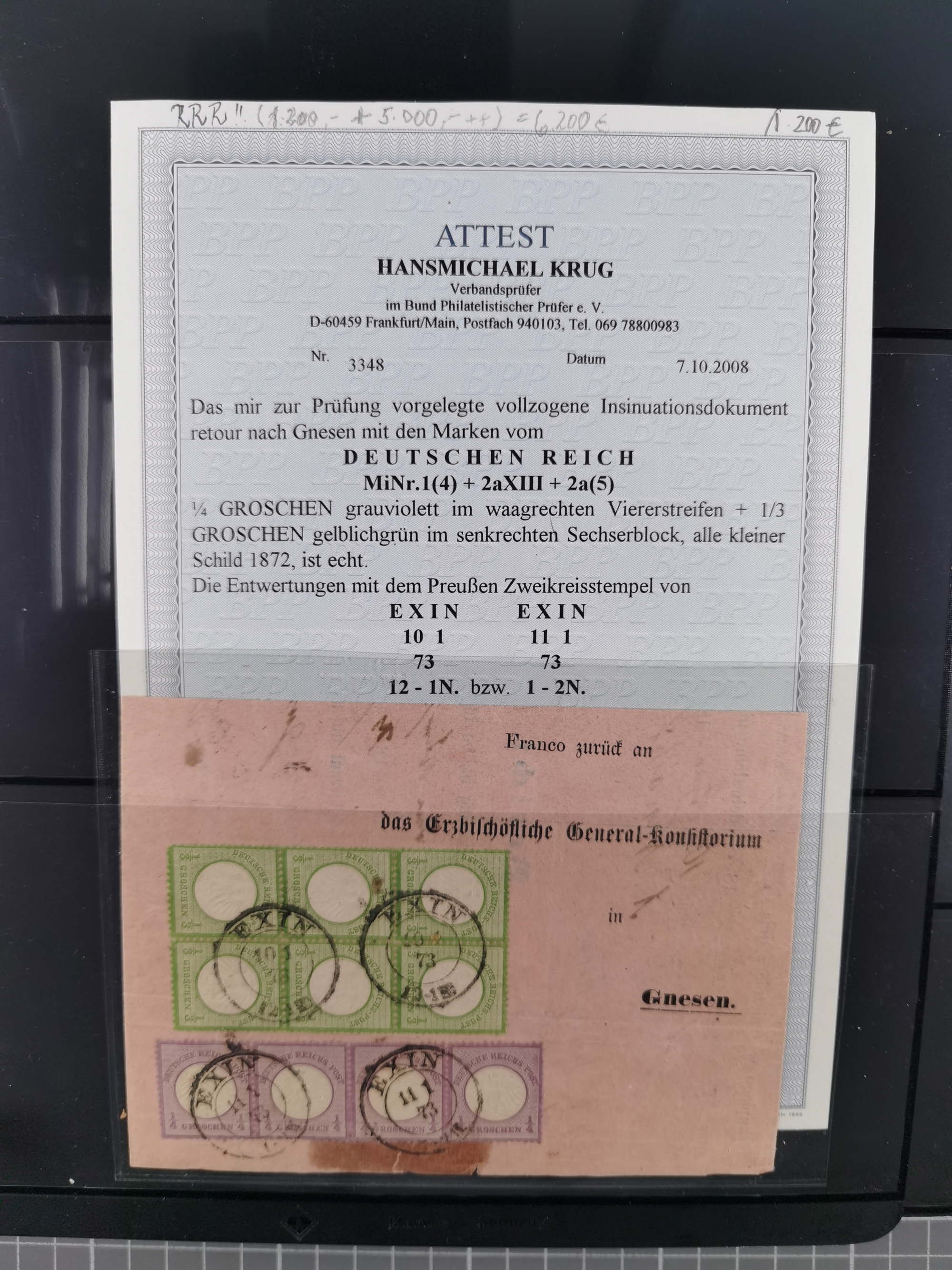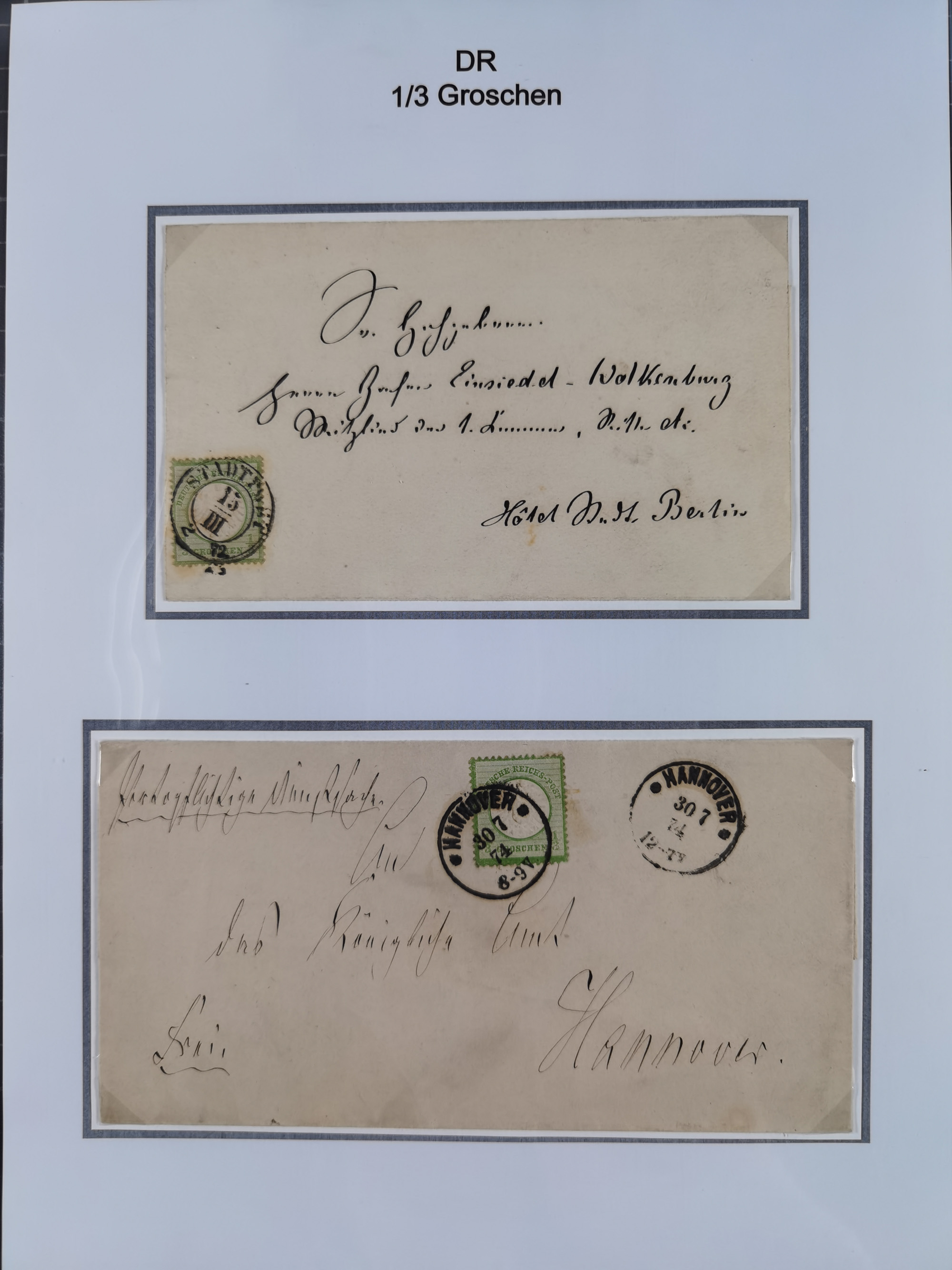 1872/75, Groschenbezirk, rund 60 Briefe und Ganzsachen, dabei viele interessante Belege, u.a. 1 (3) auf Drucksache nach Amsterdam, Express-Soldaten Brief, Orts-R-Brief von Berlin, Mi. 6 EF auf R-Brief nach Frankreich, 16 EF (2), 16 +18 auf Auslandsdrucksache, 16 (3) auf Auslandsdrucksache, 17 b auf Letzttag-Brief, 18 +19 auf eingeschriebenem Ortsbrief von Dresden, 19 mit bayerischem Stempel, 19 + 20 auf R-Brief in den Grenzrayon, etc. etc. Ein sehr interessantes Objekt, Alles signiert BPP bzw. 27 Atteste und 30 Befunde.