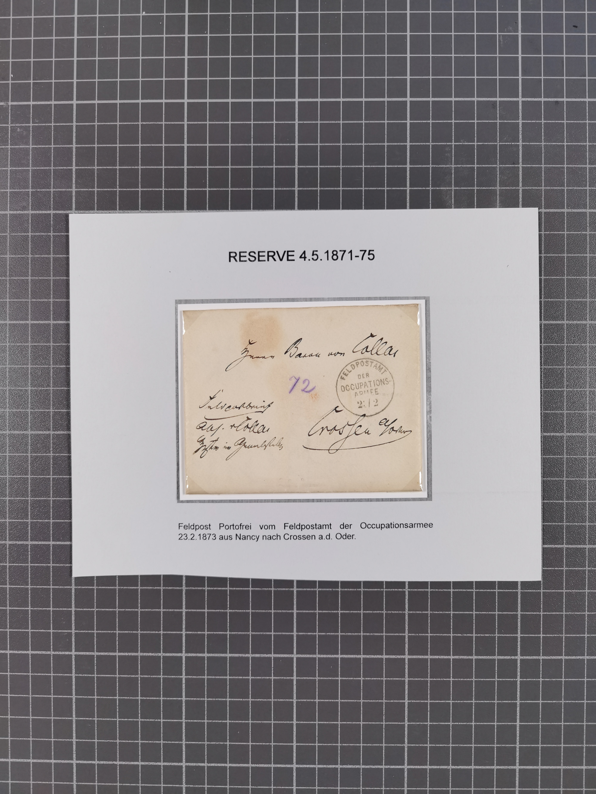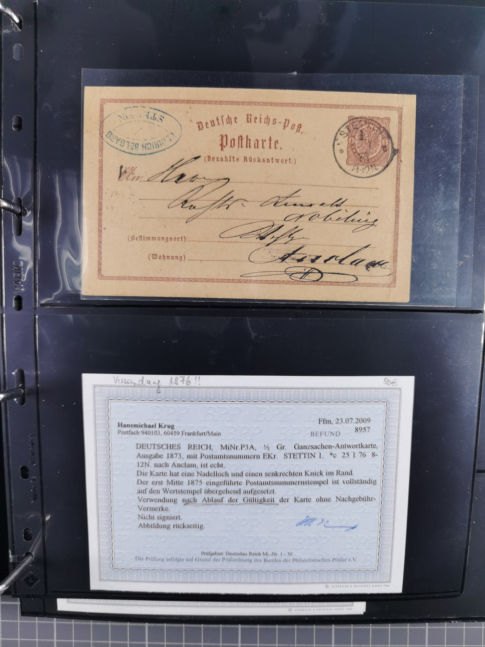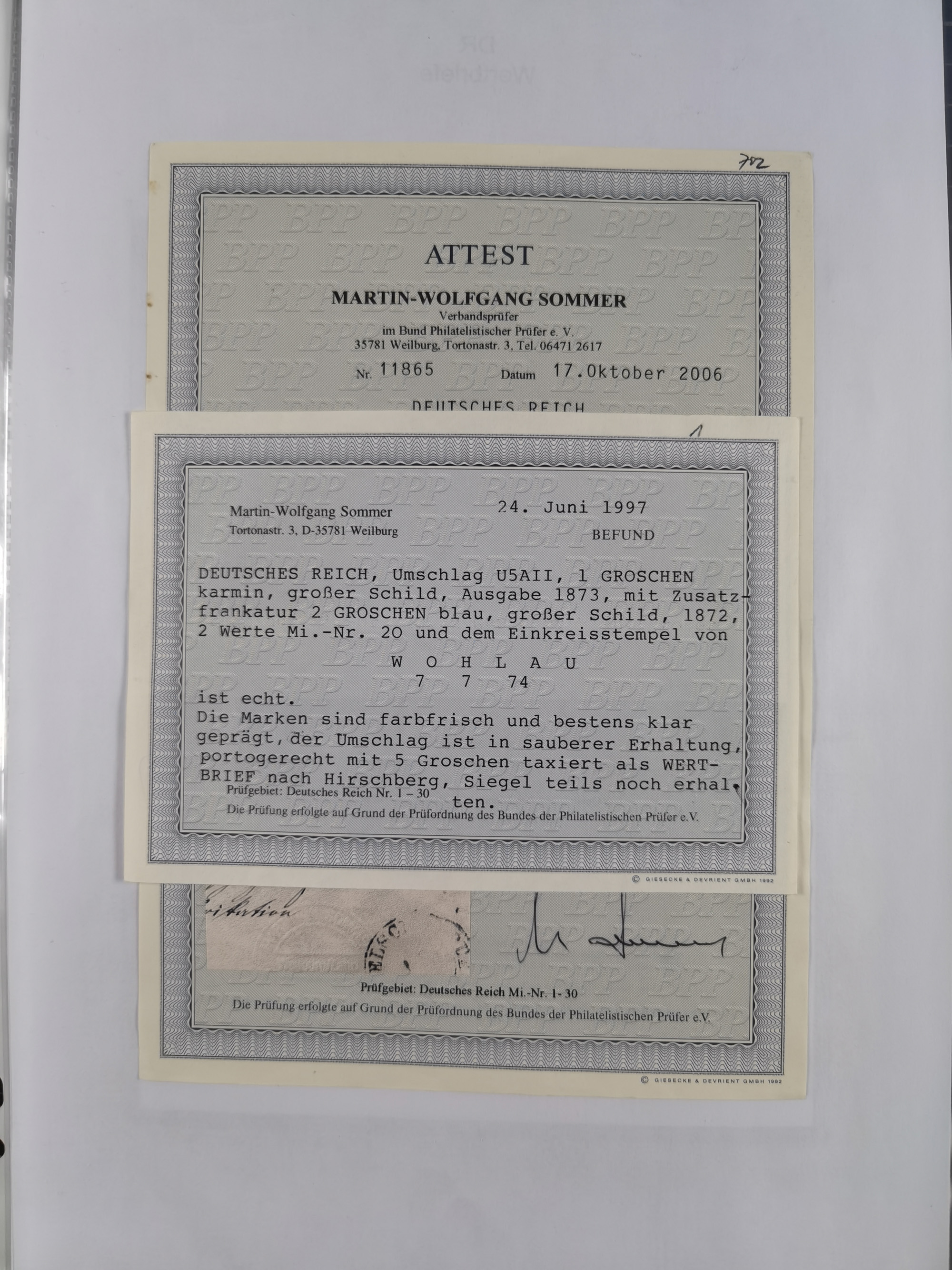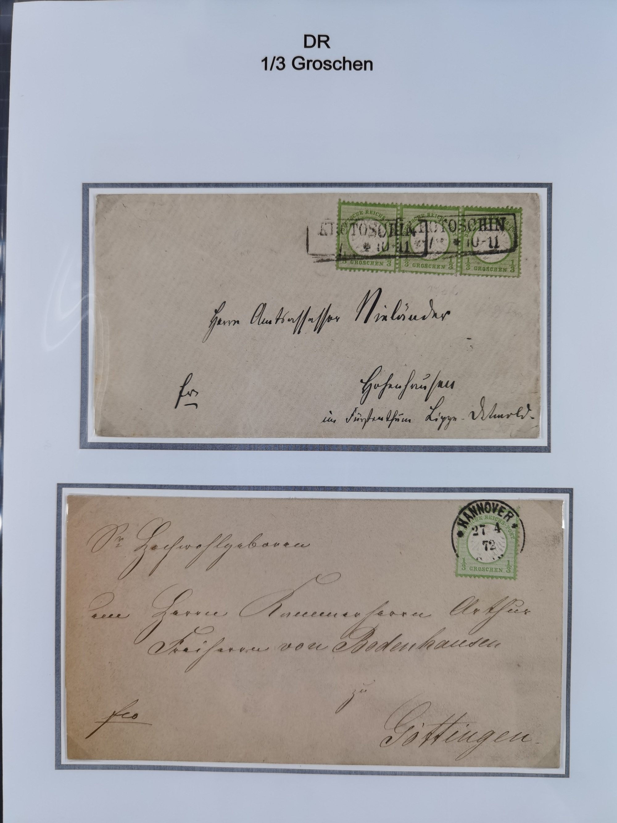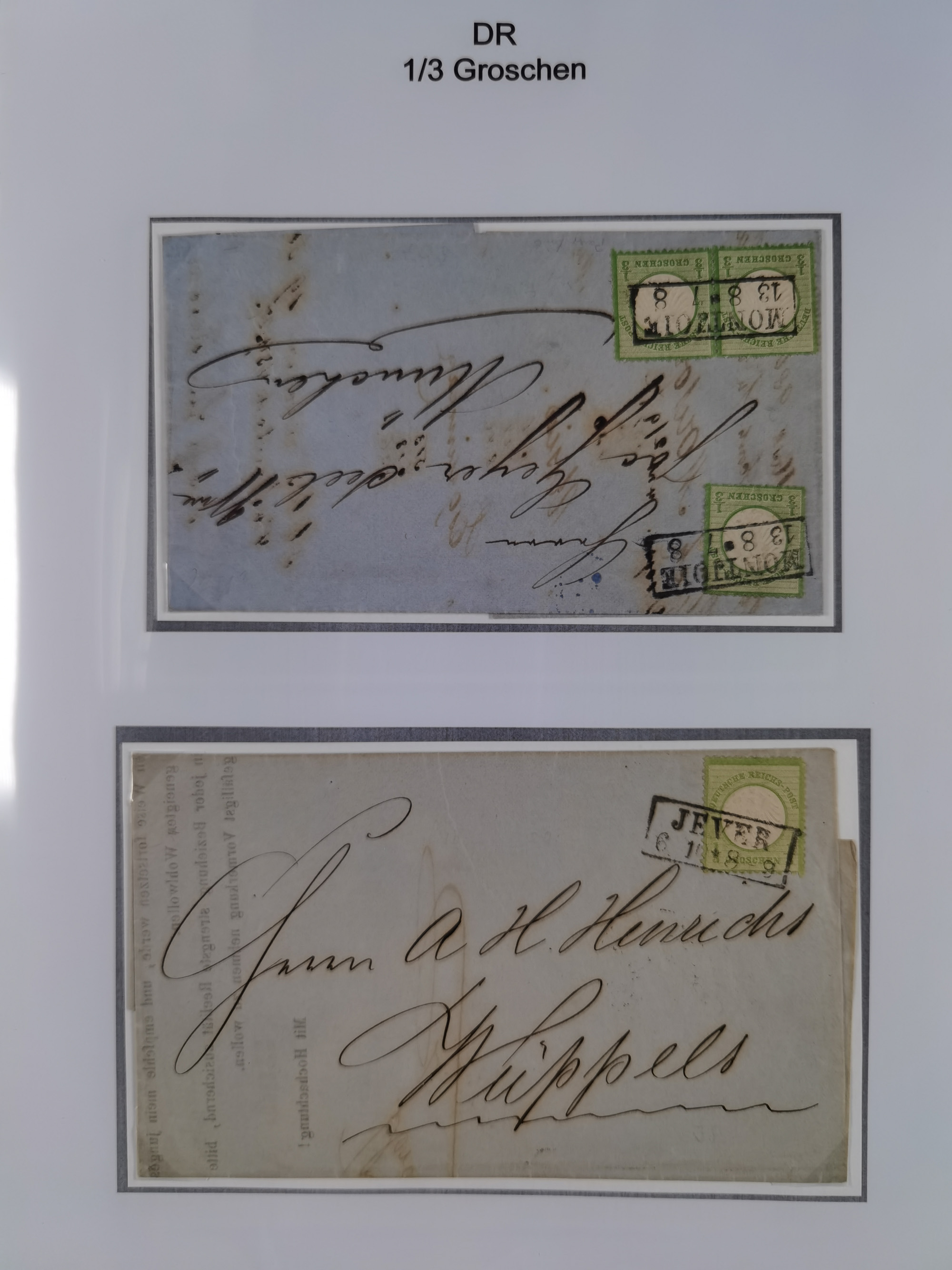 1872/75, Groschenbezirk, rund 60 Briefe und Ganzsachen, dabei viele interessante Belege, u.a. 1 (3) auf Drucksache nach Amsterdam, Express-Soldaten Brief, Orts-R-Brief von Berlin, Mi. 6 EF auf R-Brief nach Frankreich, 16 EF (2), 16 +18 auf Auslandsdrucksache, 16 (3) auf Auslandsdrucksache, 17 b auf Letzttag-Brief, 18 +19 auf eingeschriebenem Ortsbrief von Dresden, 19 mit bayerischem Stempel, 19 + 20 auf R-Brief in den Grenzrayon, etc. etc. Ein sehr interessantes Objekt, Alles signiert BPP bzw. 27 Atteste und 30 Befunde.