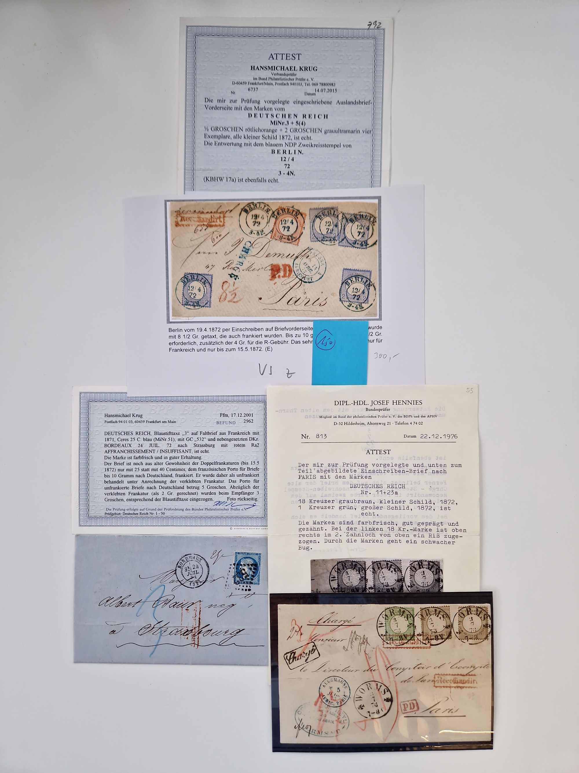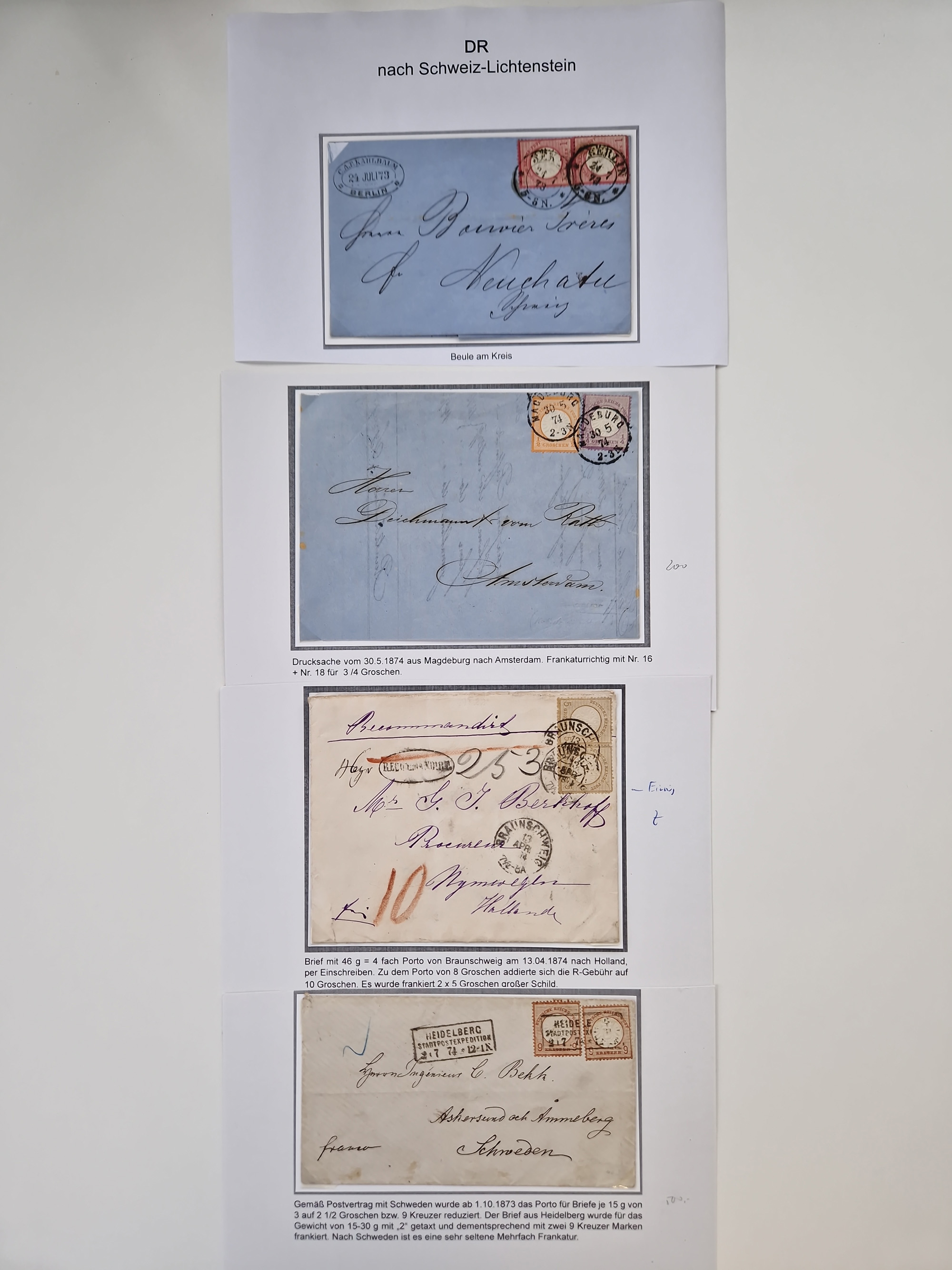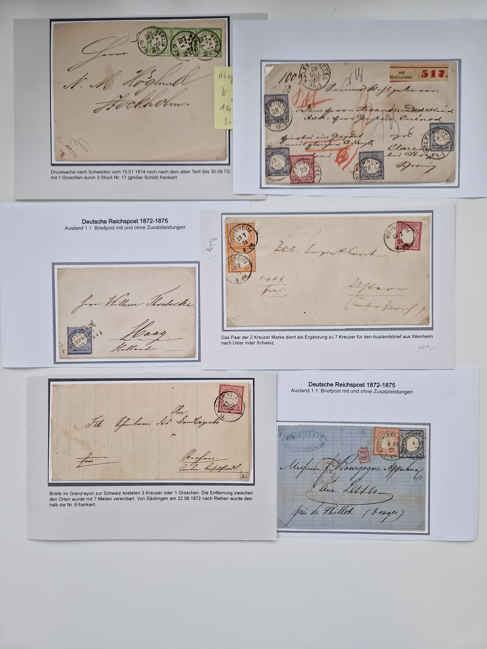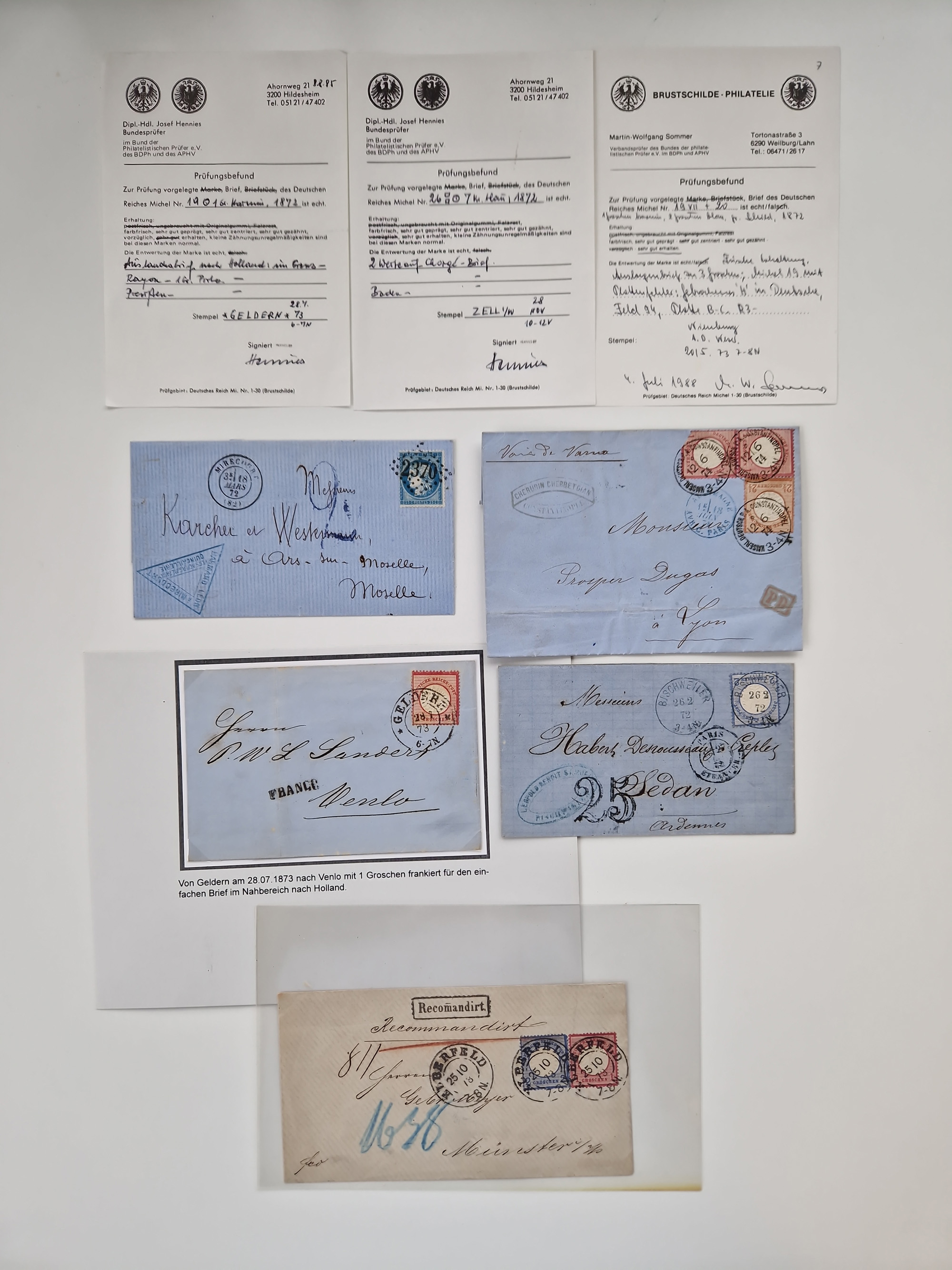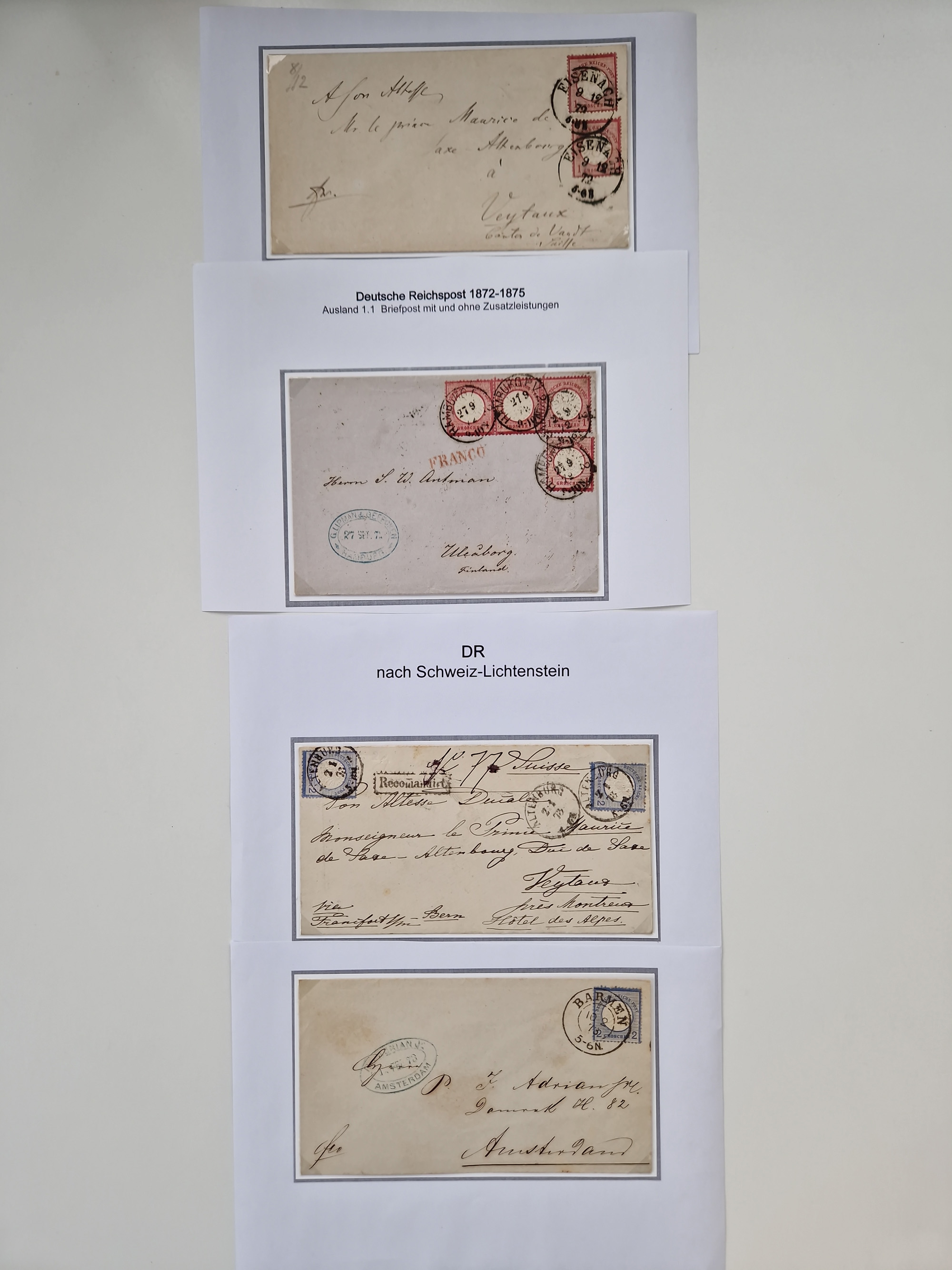 1872/74, umfangreiche Sammlung “Auslandsbriefe” mit ca. 70 Briefen und Karten mit besseren Frankaturen, R-Briefen, Grenzrayon-Briefe in die Niederlande und Schweiz, interessante Stempel, ungewöhnliche Frankatur-Kombination und weiteren Besonderheiten. Dabei u.a. Mi.-Nr. 4+9 auf Brief nach Belgien (FA Krug BPP), Mi.-Nr. 15 im Paar und Einzelmarke + 23a auf Brief in die Schweiz (Paar mit Reparatur, FA Krug BPP), Mi.-Nr. 16+18 auf Drucksache nach Amsterdam, 6x Mi.-Nr. 17a auf Brief in die Schweiz (ein Wert mit Bug), 2x Mi.-Nr. 27a auf Brief nach Schweden, 2x Mi.-Nr. 11+23a auf falsch frankiertem R-Brief nach Paris (fehlerhaft, FA Hennies BPP), Paketkarte mit Mi.-Nr. 12 + 20 (2) nach Amsterdam und Mi.-Nr. 1, 18, 19 und 22 auf Brief nach Australien (repariert, FA Krug BPP). Dazu drei Briefe aus DP Türkei mit Vorläufer-Frankaturen, u.a. Mi.-Nr. V5 (2) auf Faltbrief in die Schweiz. Die Erhaltung ist zum Teil fehlerhaft, vieles signiert bzw. mit FB und Fotoattesten, ex Untermann