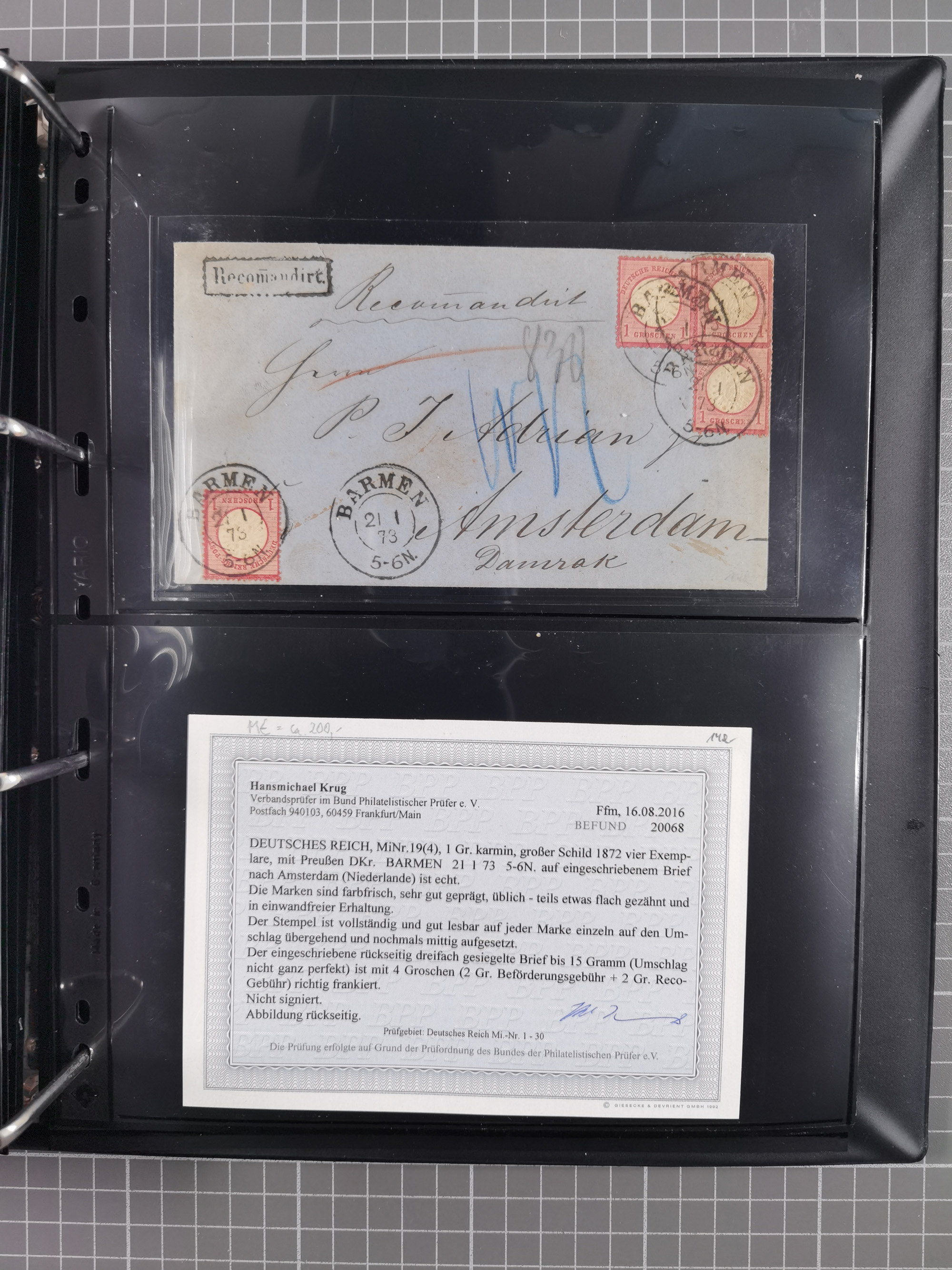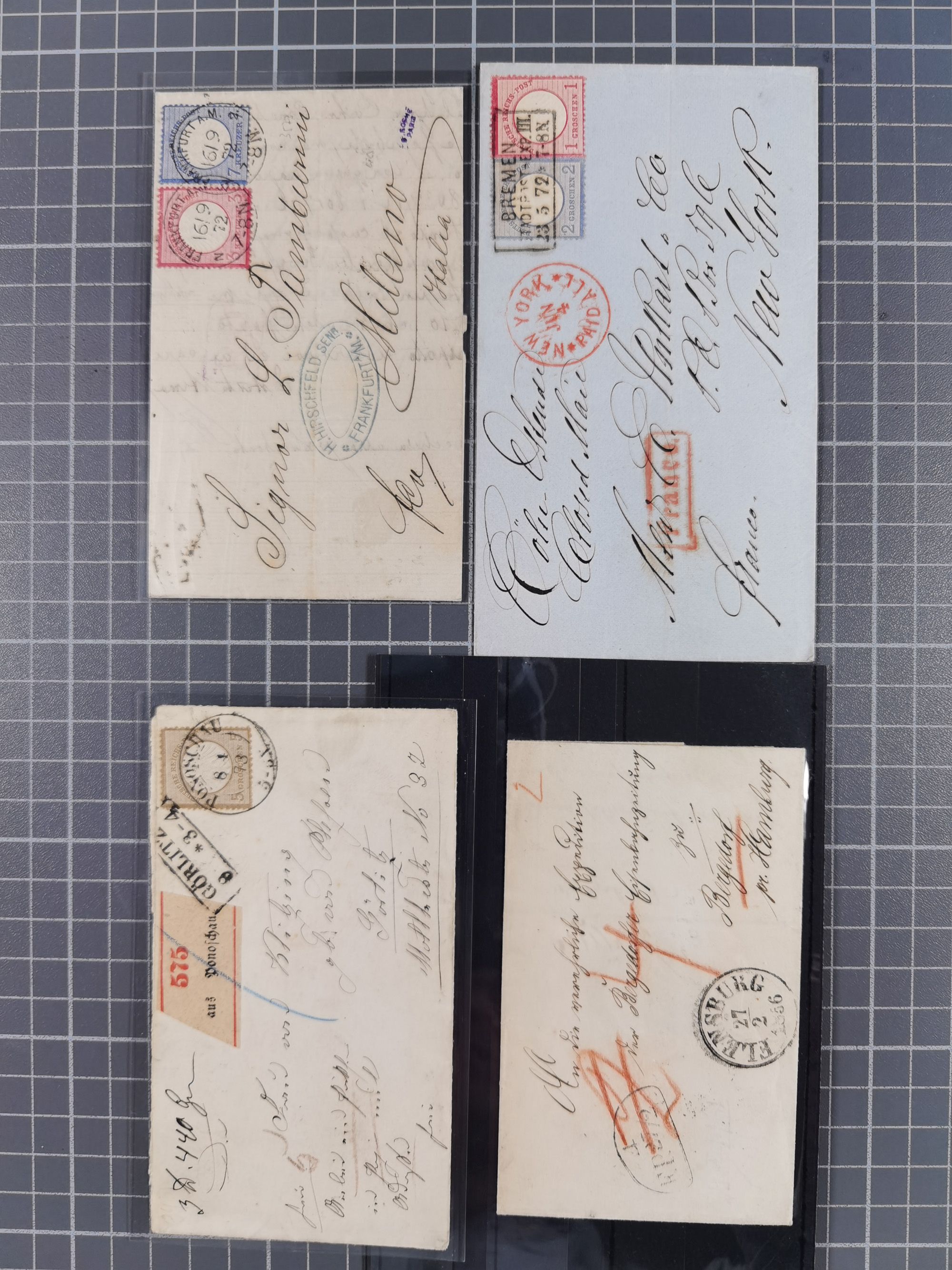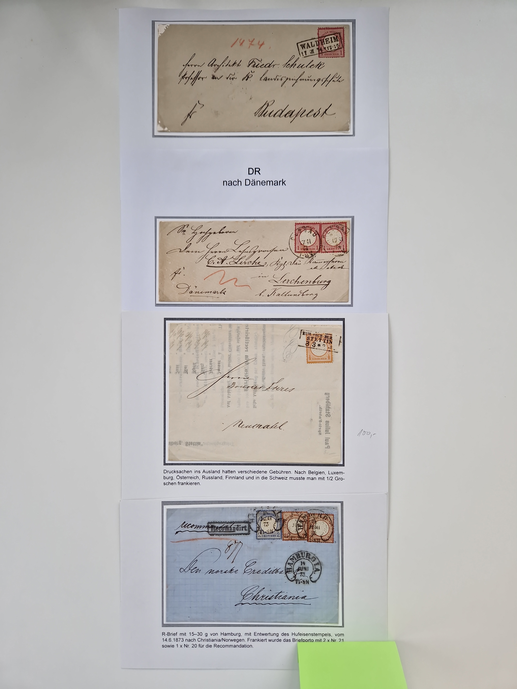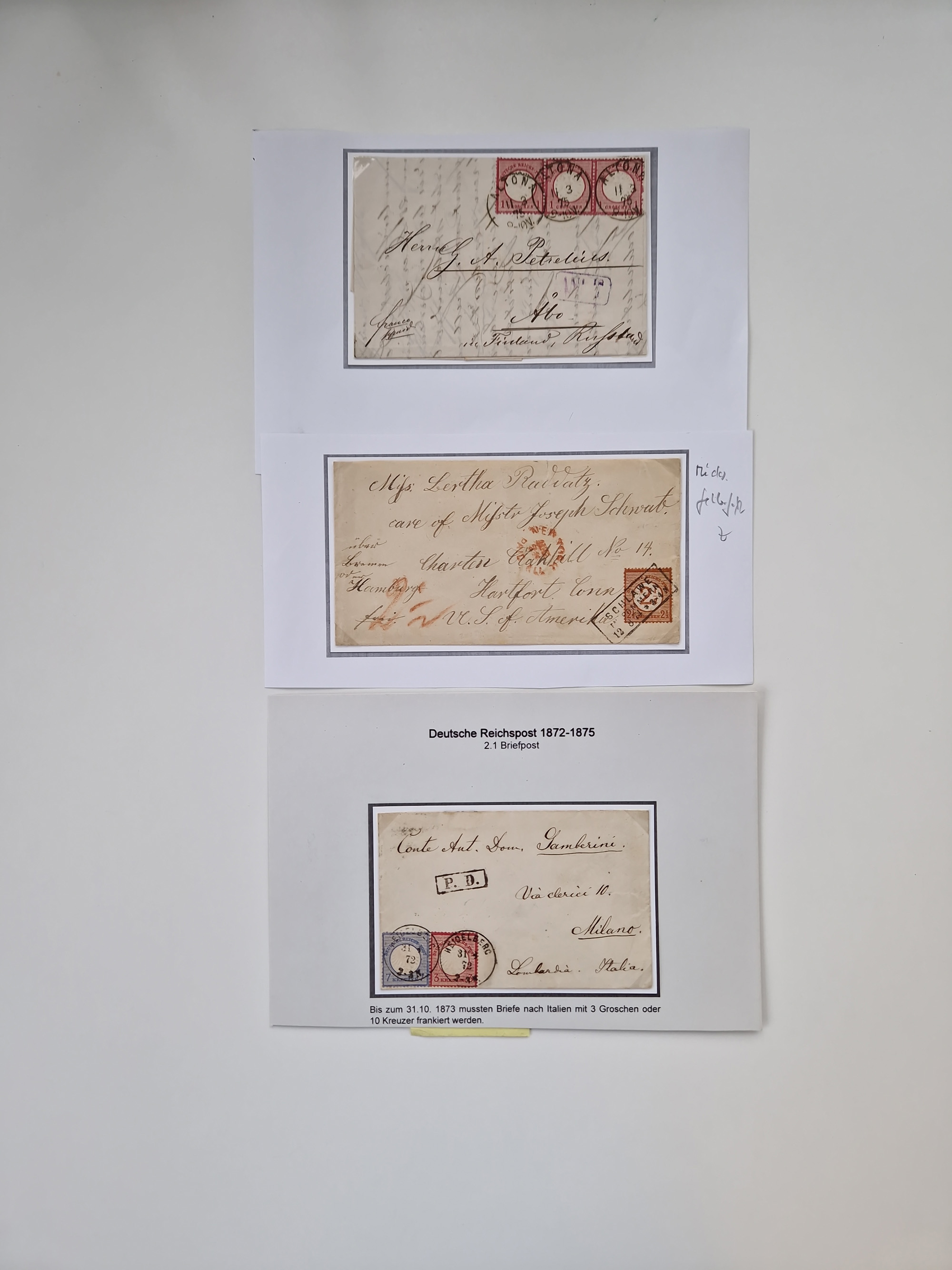 1872/74, umfangreiche Sammlung “Auslandsbriefe” mit ca. 70 Briefen und Karten mit besseren Frankaturen, R-Briefen, Grenzrayon-Briefe in die Niederlande und Schweiz, interessante Stempel, ungewöhnliche Frankatur-Kombination und weiteren Besonderheiten. Dabei u.a. Mi.-Nr. 4+9 auf Brief nach Belgien (FA Krug BPP), Mi.-Nr. 15 im Paar und Einzelmarke + 23a auf Brief in die Schweiz (Paar mit Reparatur, FA Krug BPP), Mi.-Nr. 16+18 auf Drucksache nach Amsterdam, 6x Mi.-Nr. 17a auf Brief in die Schweiz (ein Wert mit Bug), 2x Mi.-Nr. 27a auf Brief nach Schweden, 2x Mi.-Nr. 11+23a auf falsch frankiertem R-Brief nach Paris (fehlerhaft, FA Hennies BPP), Paketkarte mit Mi.-Nr. 12 + 20 (2) nach Amsterdam und Mi.-Nr. 1, 18, 19 und 22 auf Brief nach Australien (repariert, FA Krug BPP). Dazu drei Briefe aus DP Türkei mit Vorläufer-Frankaturen, u.a. Mi.-Nr. V5 (2) auf Faltbrief in die Schweiz. Die Erhaltung ist zum Teil fehlerhaft, vieles signiert bzw. mit FB und Fotoattesten, ex Untermann
