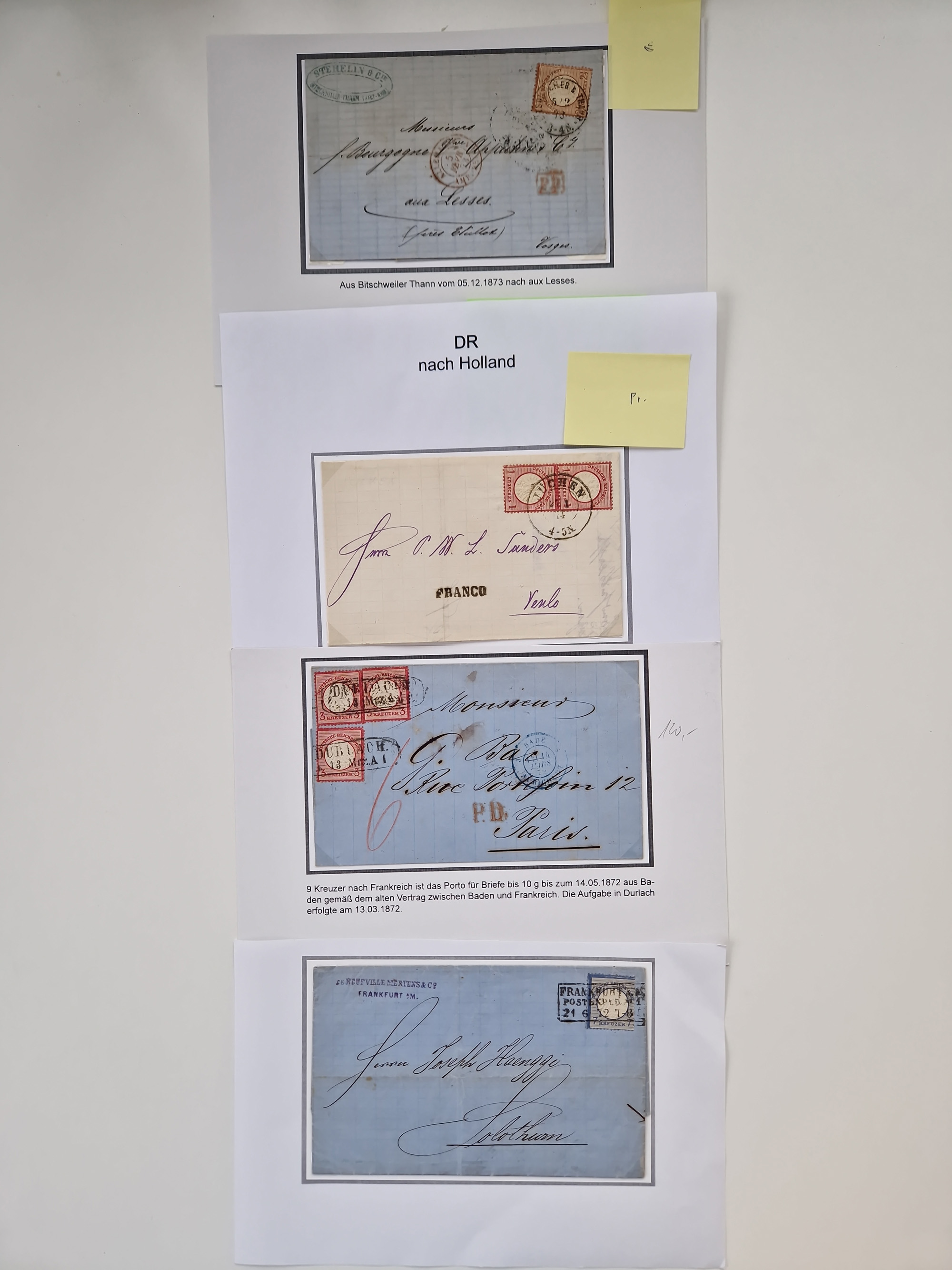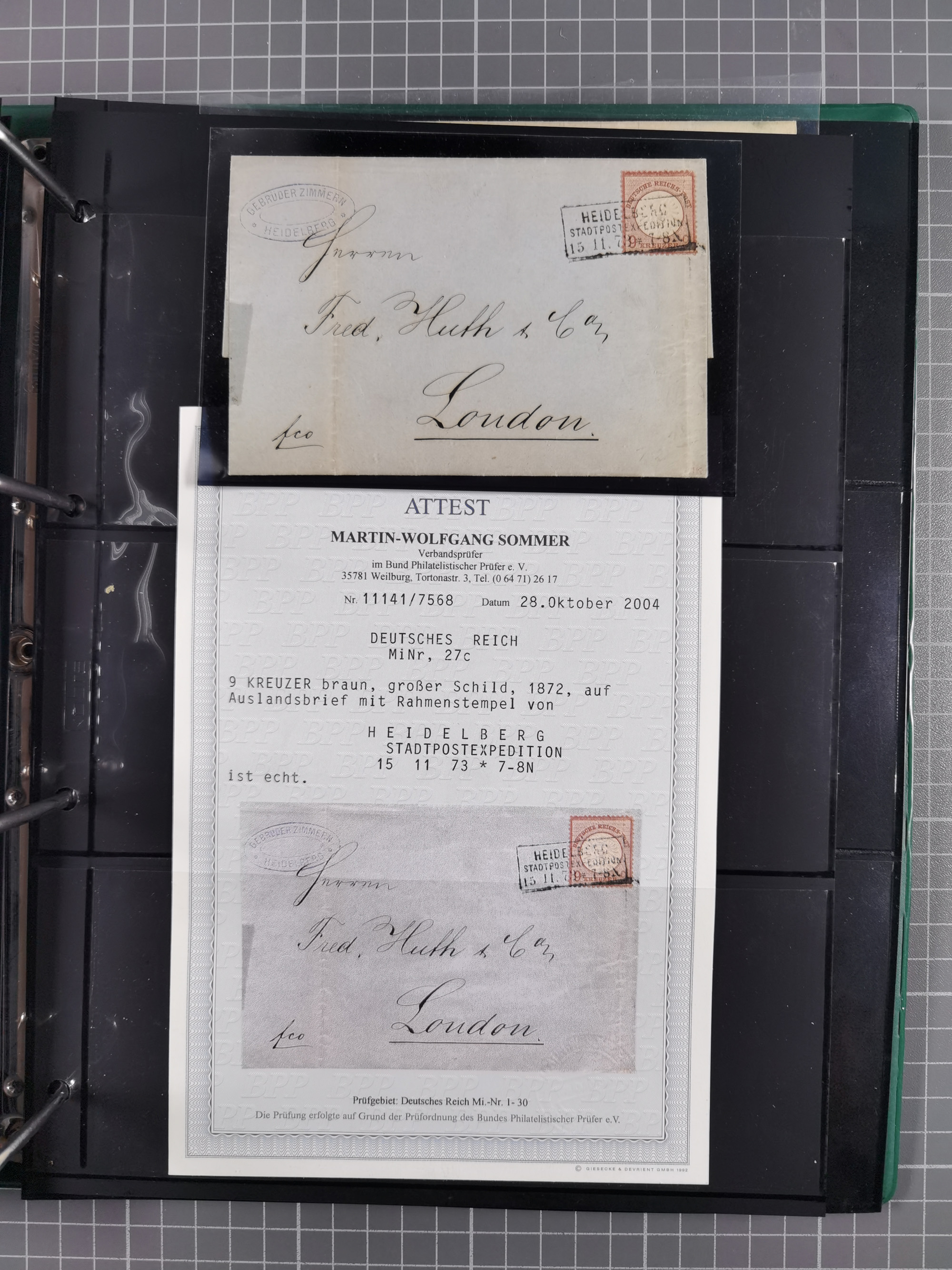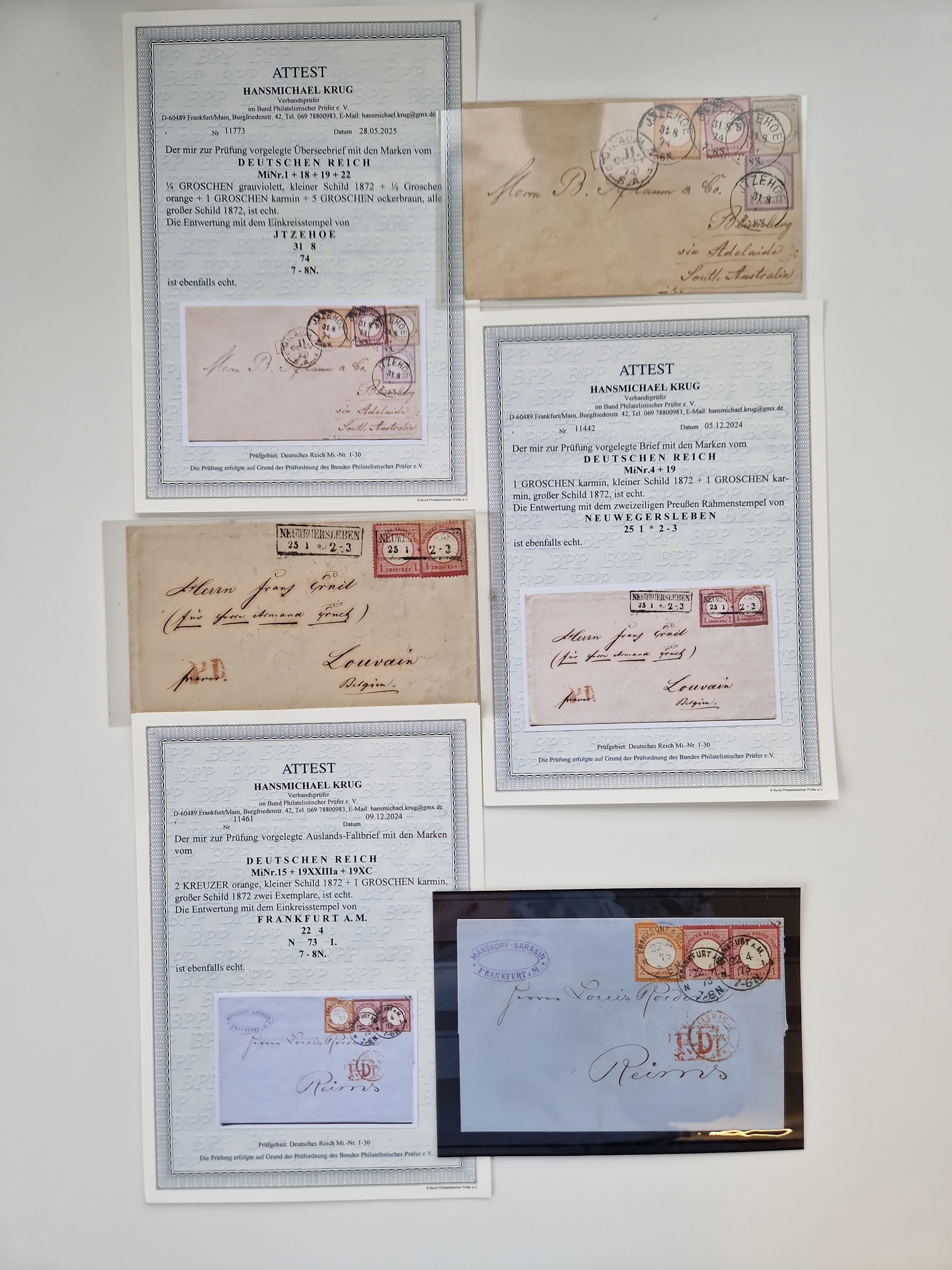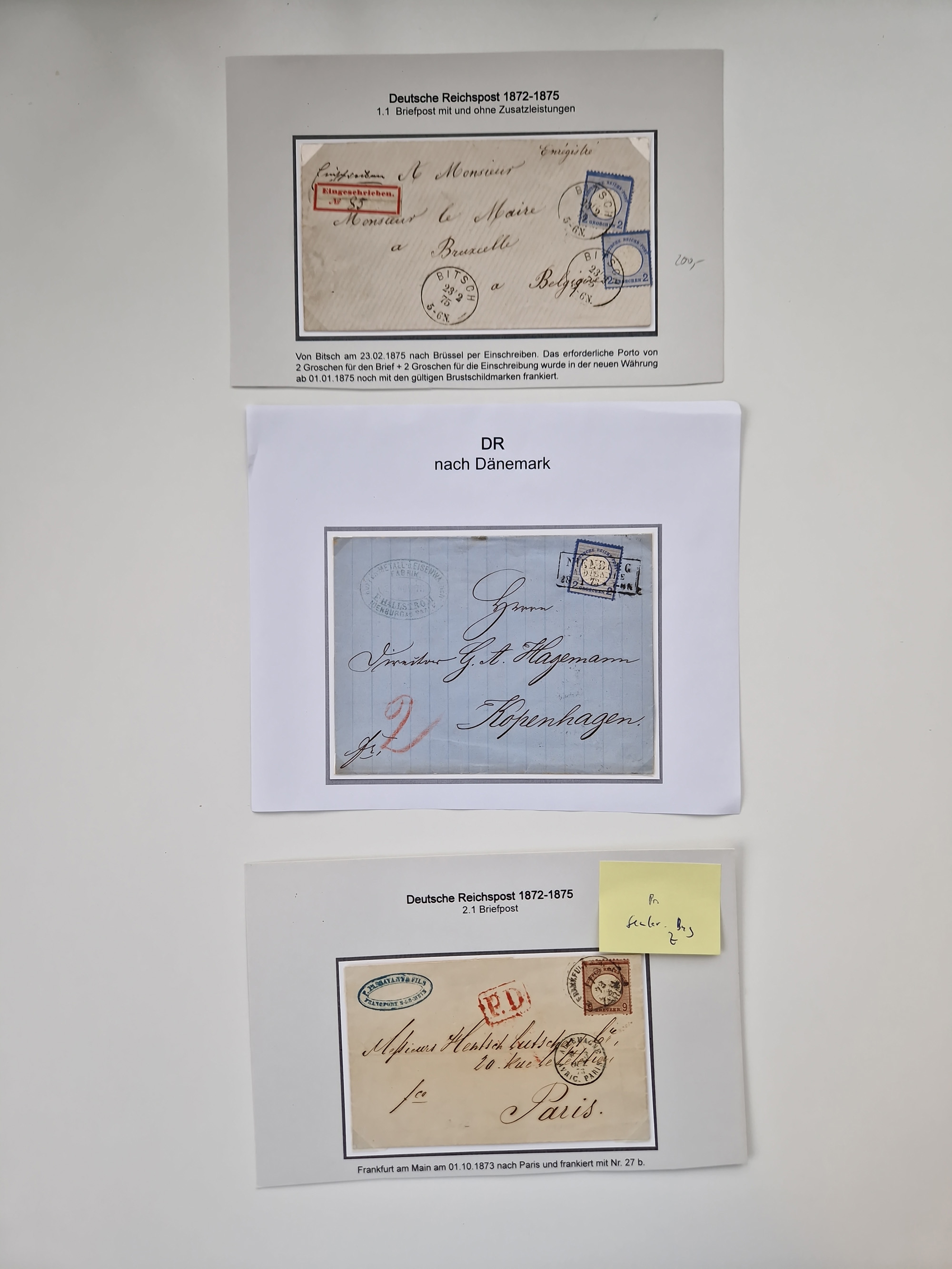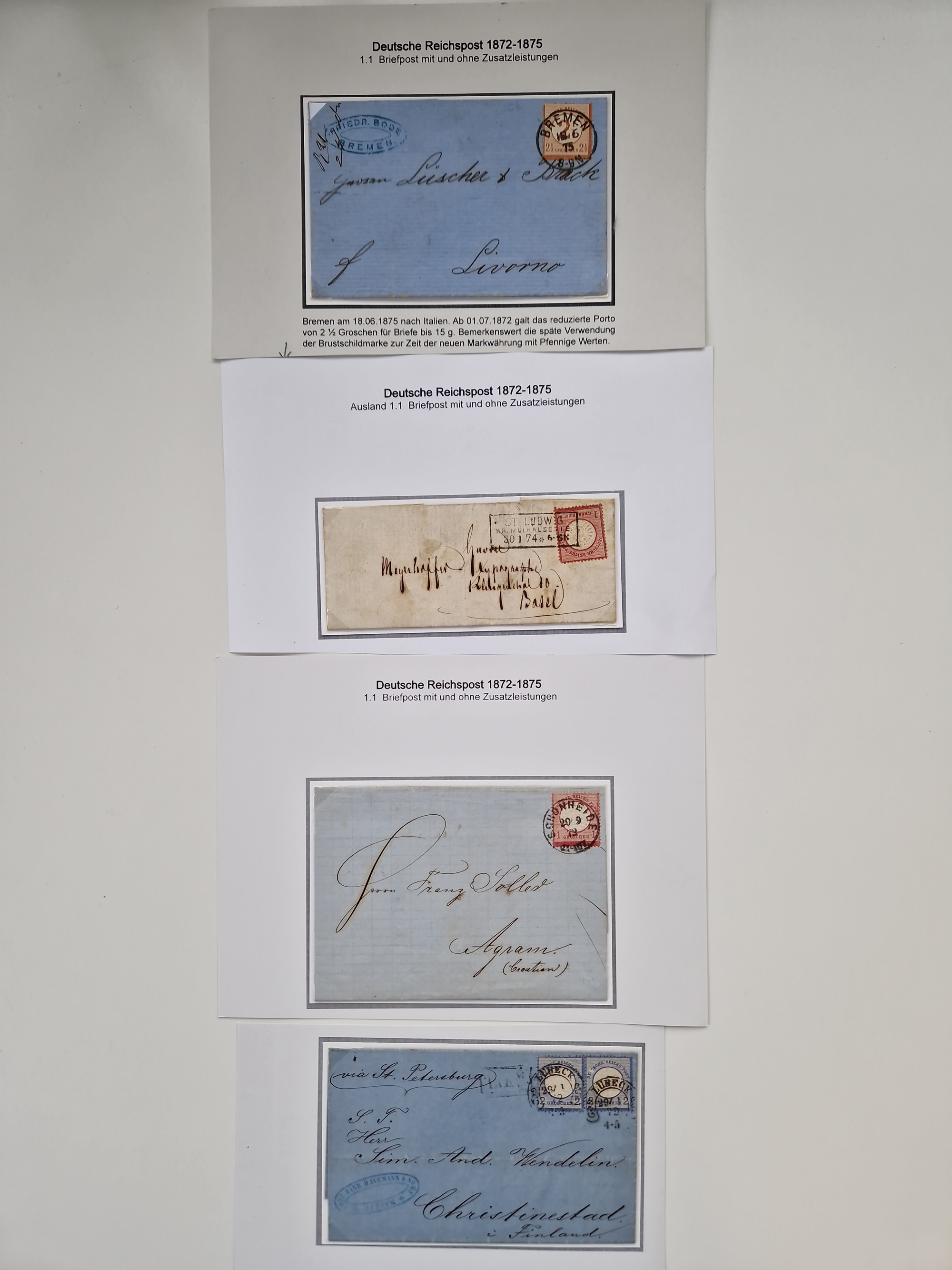 1872/74, umfangreiche Sammlung “Auslandsbriefe” mit ca. 70 Briefen und Karten mit besseren Frankaturen, R-Briefen, Grenzrayon-Briefe in die Niederlande und Schweiz, interessante Stempel, ungewöhnliche Frankatur-Kombination und weiteren Besonderheiten. Dabei u.a. Mi.-Nr. 4+9 auf Brief nach Belgien (FA Krug BPP), Mi.-Nr. 15 im Paar und Einzelmarke + 23a auf Brief in die Schweiz (Paar mit Reparatur, FA Krug BPP), Mi.-Nr. 16+18 auf Drucksache nach Amsterdam, 6x Mi.-Nr. 17a auf Brief in die Schweiz (ein Wert mit Bug), 2x Mi.-Nr. 27a auf Brief nach Schweden, 2x Mi.-Nr. 11+23a auf falsch frankiertem R-Brief nach Paris (fehlerhaft, FA Hennies BPP), Paketkarte mit Mi.-Nr. 12 + 20 (2) nach Amsterdam und Mi.-Nr. 1, 18, 19 und 22 auf Brief nach Australien (repariert, FA Krug BPP). Dazu drei Briefe aus DP Türkei mit Vorläufer-Frankaturen, u.a. Mi.-Nr. V5 (2) auf Faltbrief in die Schweiz. Die Erhaltung ist zum Teil fehlerhaft, vieles signiert bzw. mit FB und Fotoattesten, ex Untermann