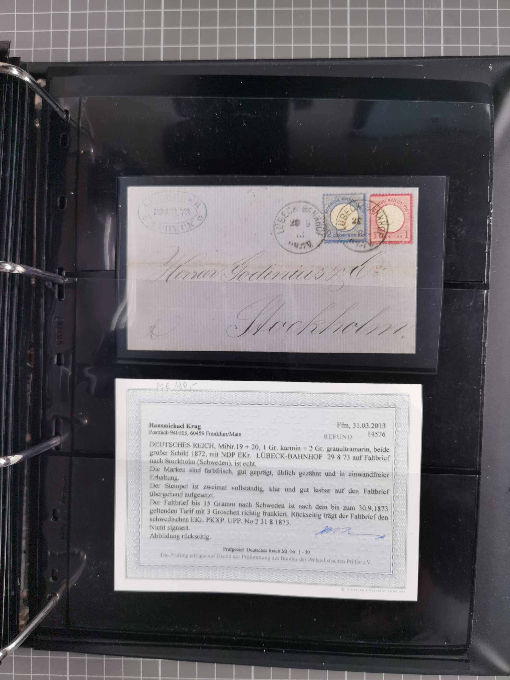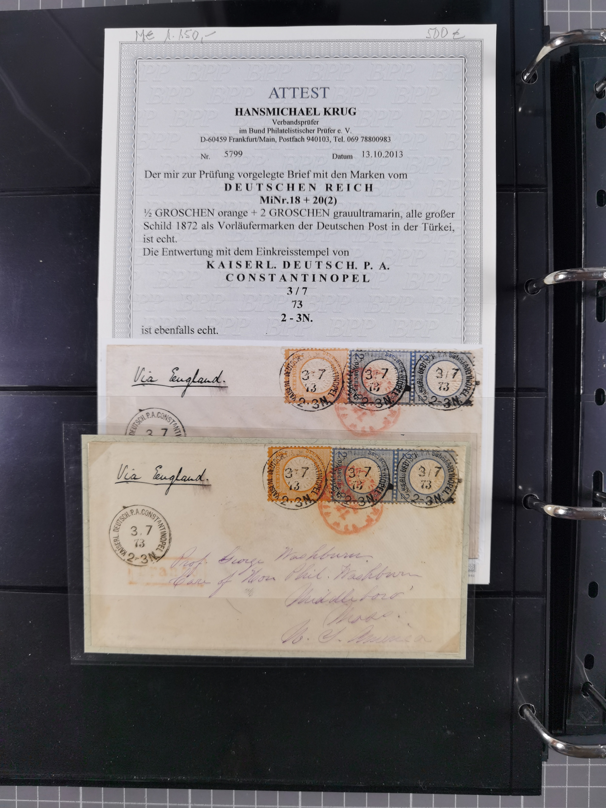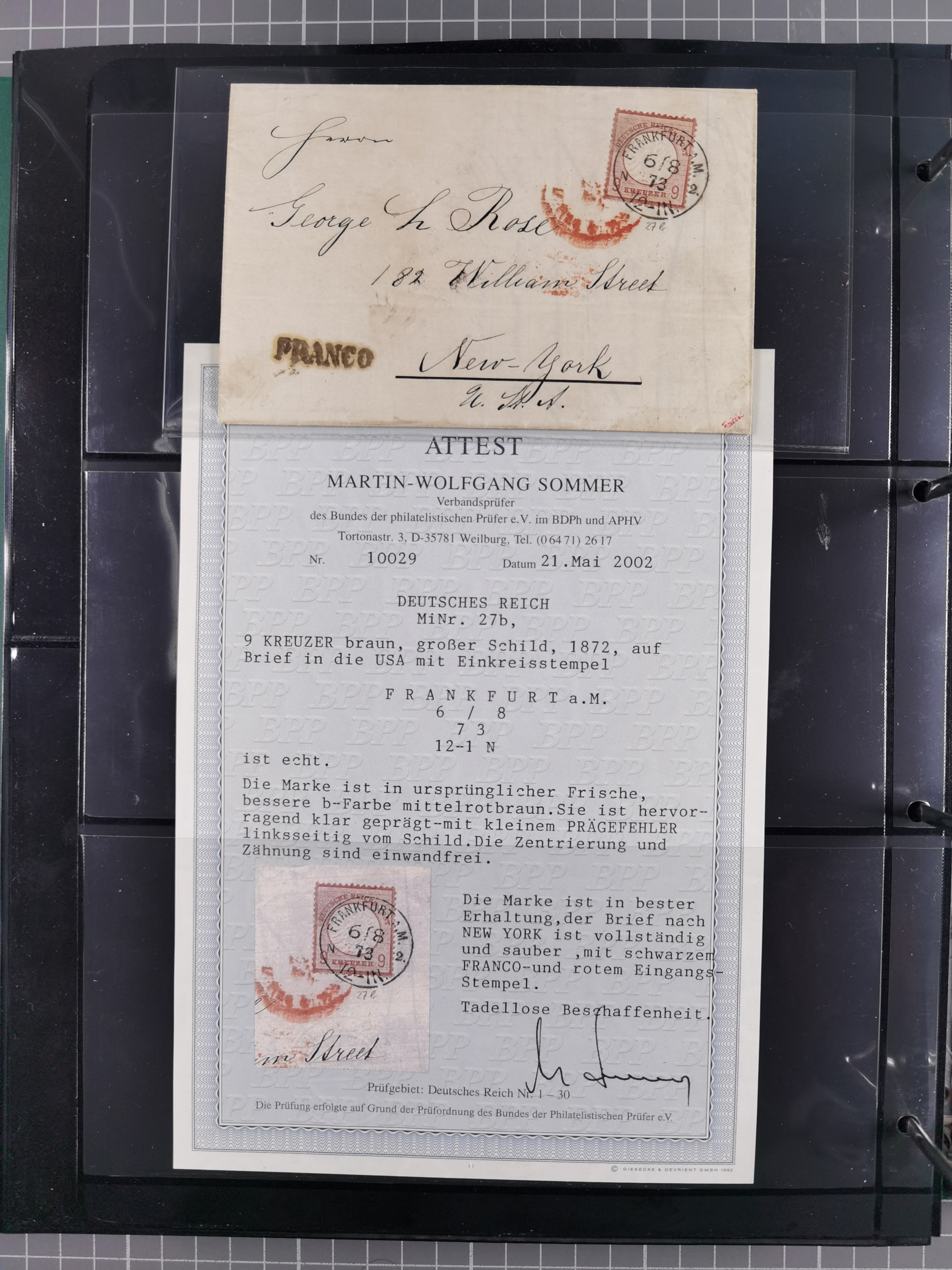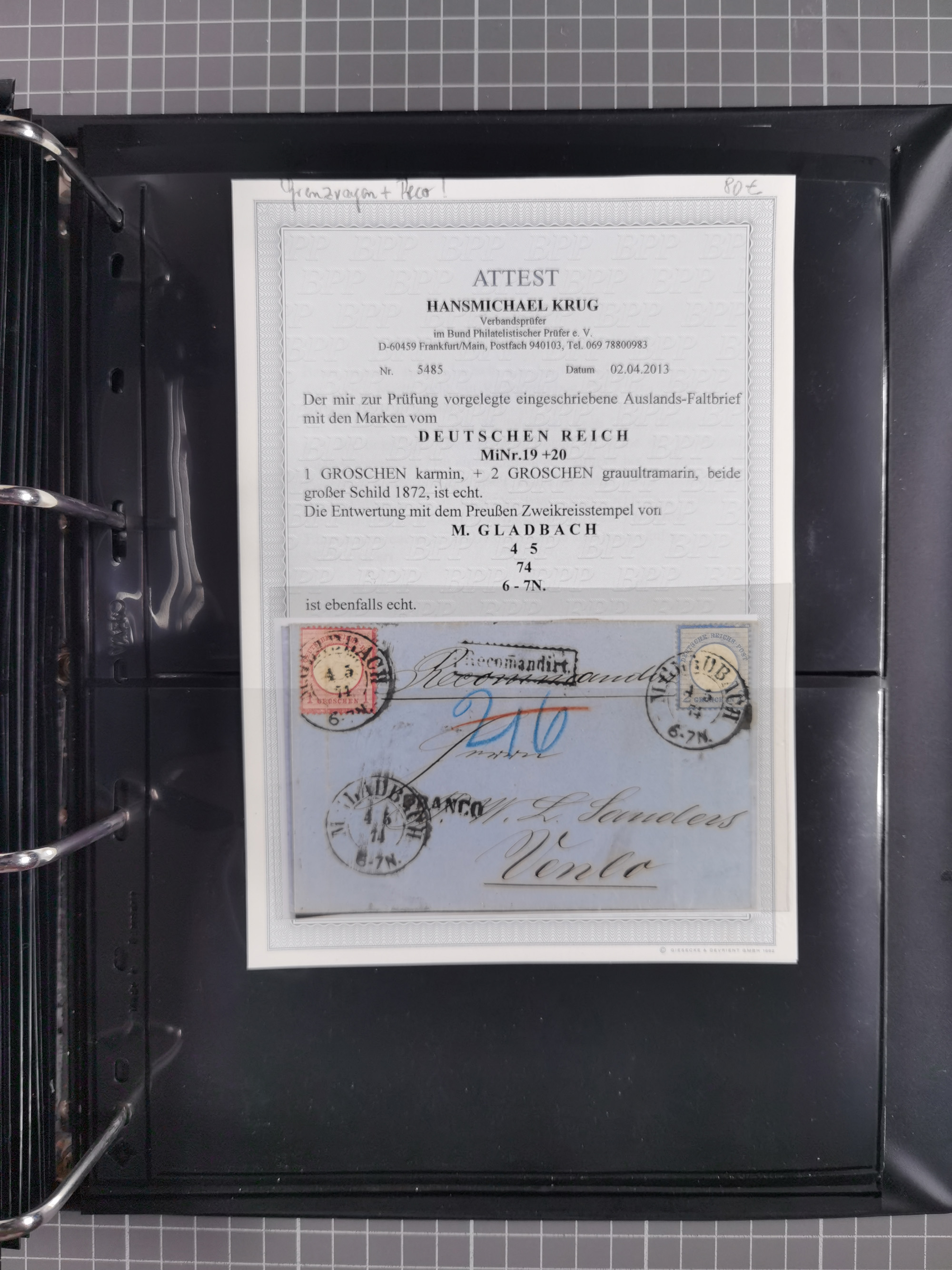 1872/74, umfangreiche Sammlung “Auslandsbriefe” mit ca. 70 Briefen und Karten mit besseren Frankaturen, R-Briefen, Grenzrayon-Briefe in die Niederlande und Schweiz, interessante Stempel, ungewöhnliche Frankatur-Kombination und weiteren Besonderheiten. Dabei u.a. Mi.-Nr. 4+9 auf Brief nach Belgien (FA Krug BPP), Mi.-Nr. 15 im Paar und Einzelmarke + 23a auf Brief in die Schweiz (Paar mit Reparatur, FA Krug BPP), Mi.-Nr. 16+18 auf Drucksache nach Amsterdam, 6x Mi.-Nr. 17a auf Brief in die Schweiz (ein Wert mit Bug), 2x Mi.-Nr. 27a auf Brief nach Schweden, 2x Mi.-Nr. 11+23a auf falsch frankiertem R-Brief nach Paris (fehlerhaft, FA Hennies BPP), Paketkarte mit Mi.-Nr. 12 + 20 (2) nach Amsterdam und Mi.-Nr. 1, 18, 19 und 22 auf Brief nach Australien (repariert, FA Krug BPP). Dazu drei Briefe aus DP Türkei mit Vorläufer-Frankaturen, u.a. Mi.-Nr. V5 (2) auf Faltbrief in die Schweiz. Die Erhaltung ist zum Teil fehlerhaft, vieles signiert bzw. mit FB und Fotoattesten, ex Untermann