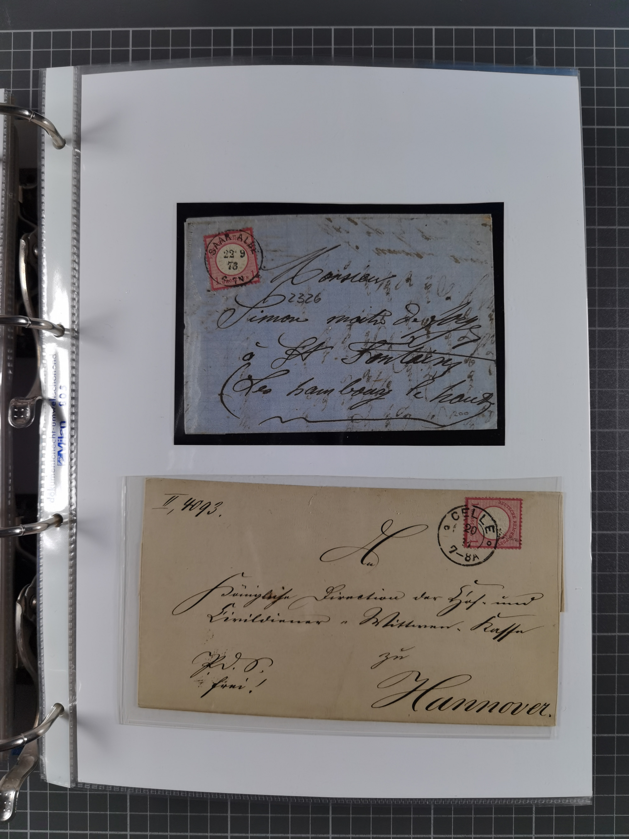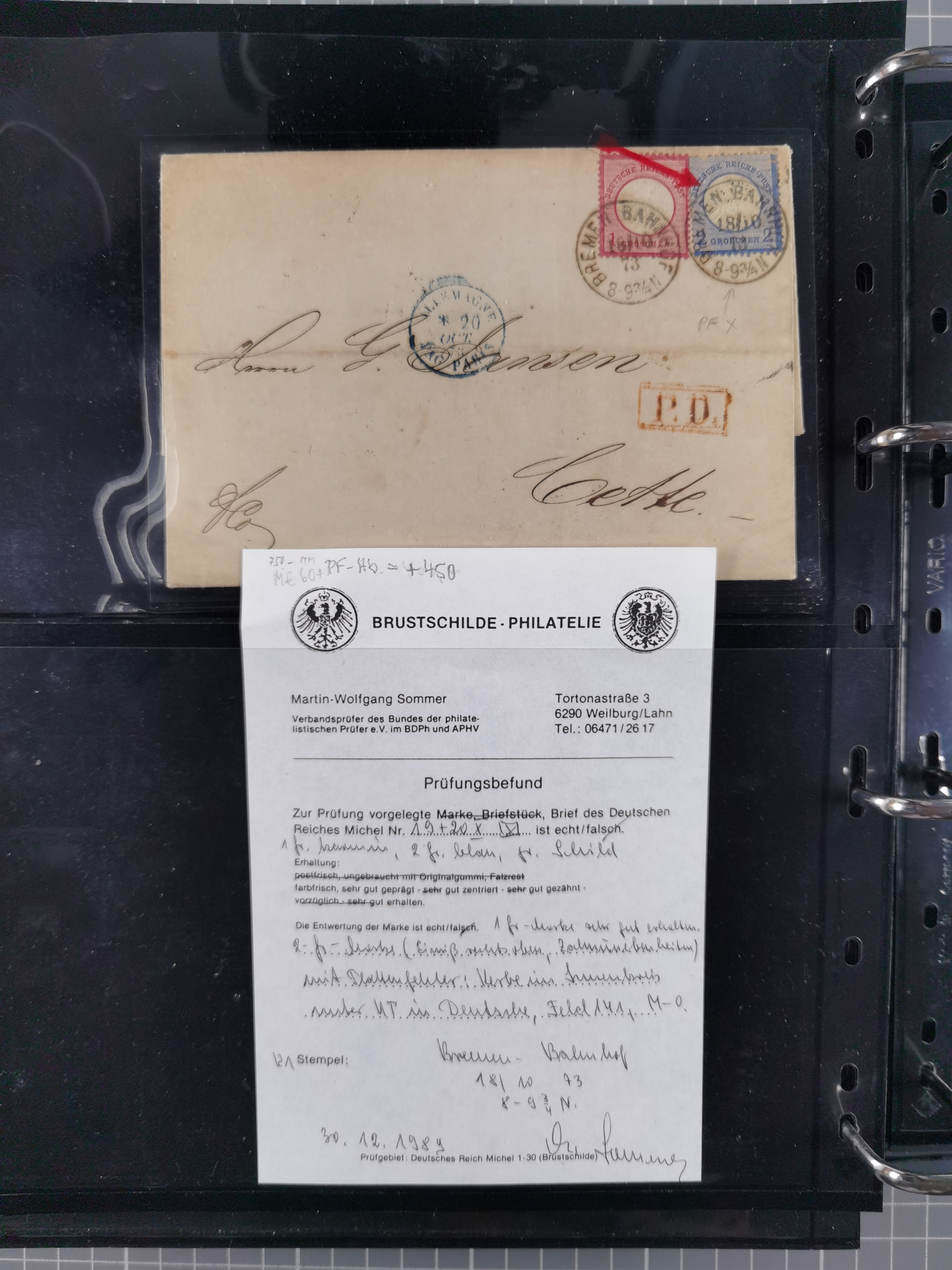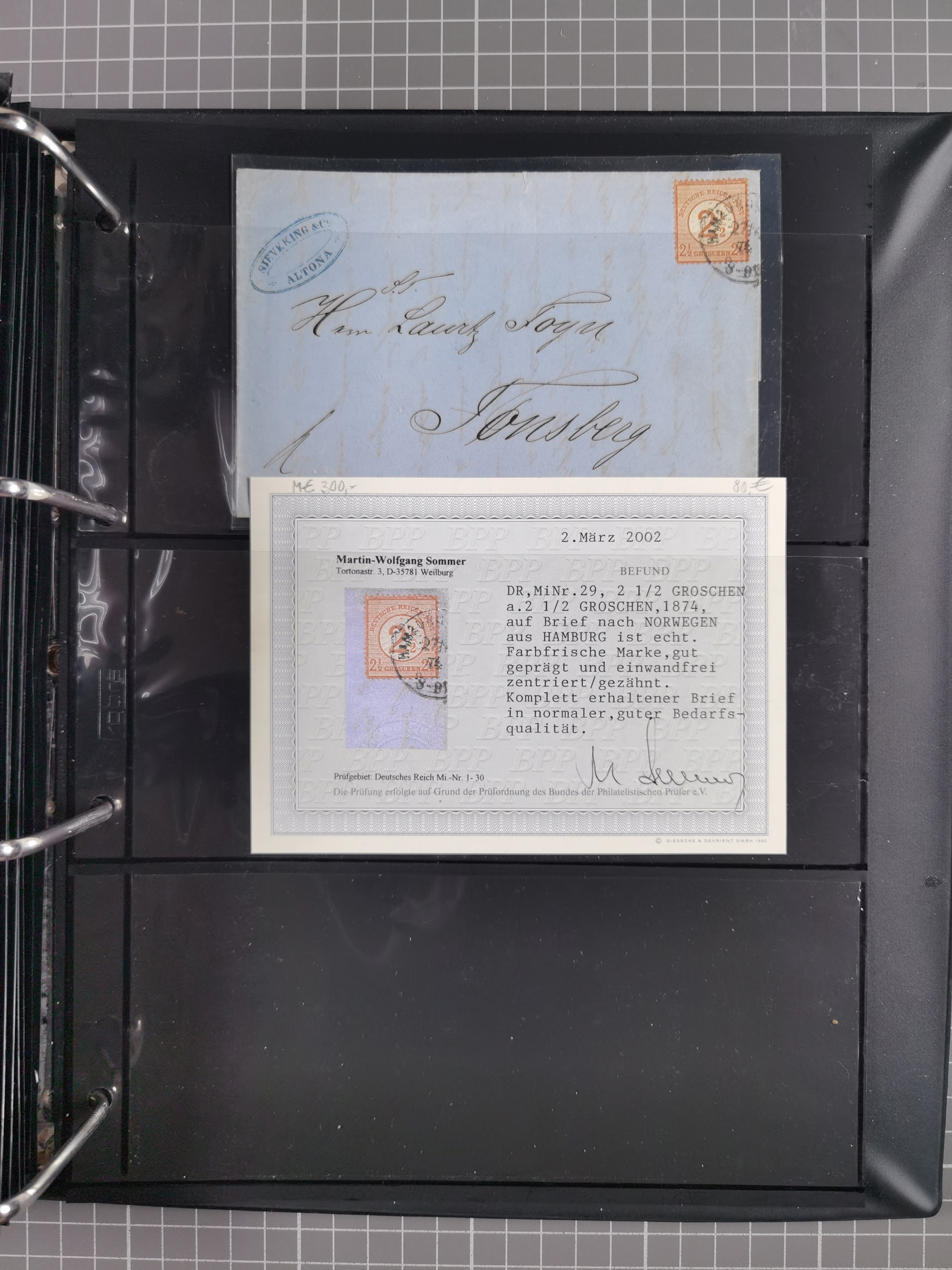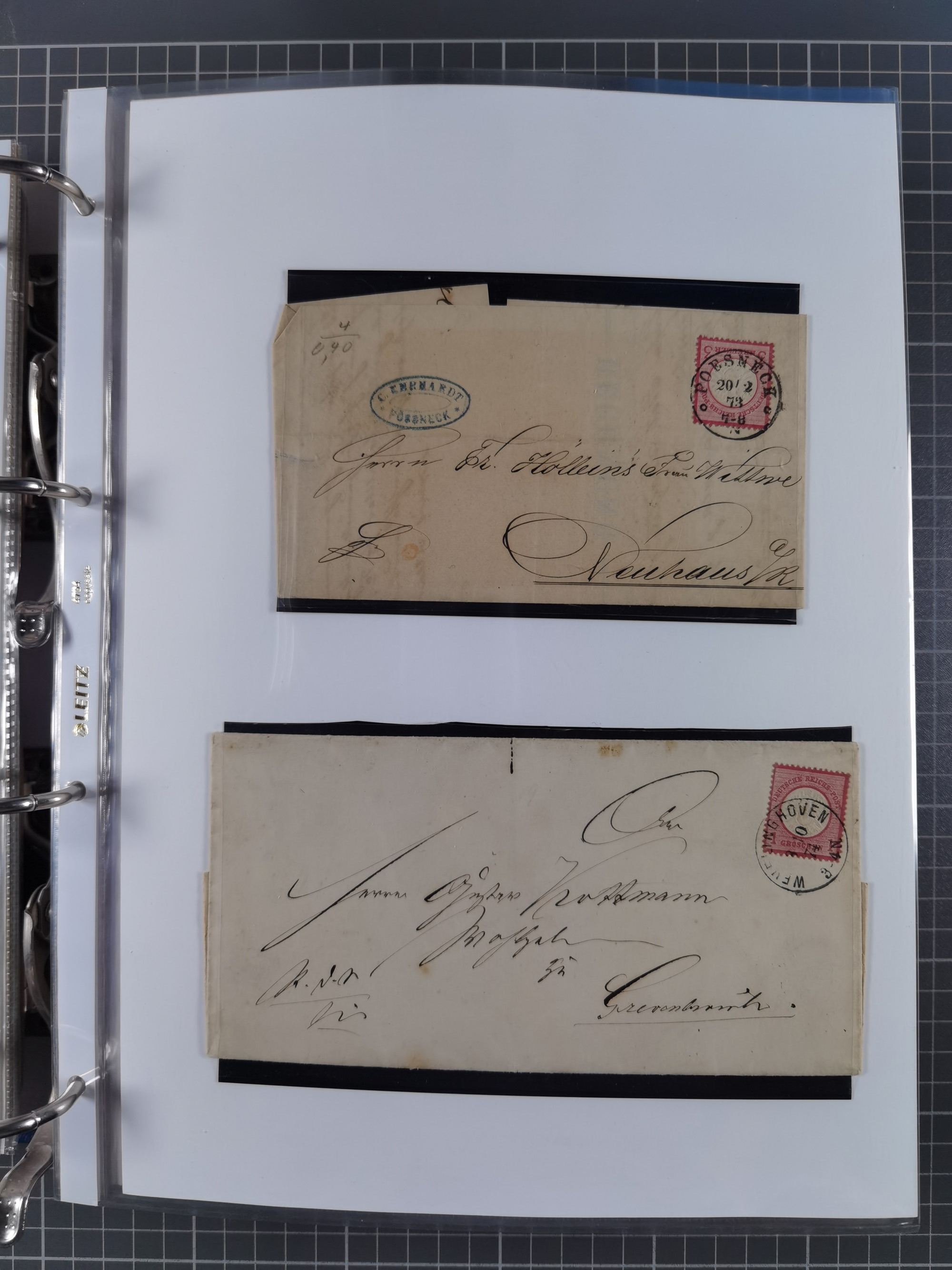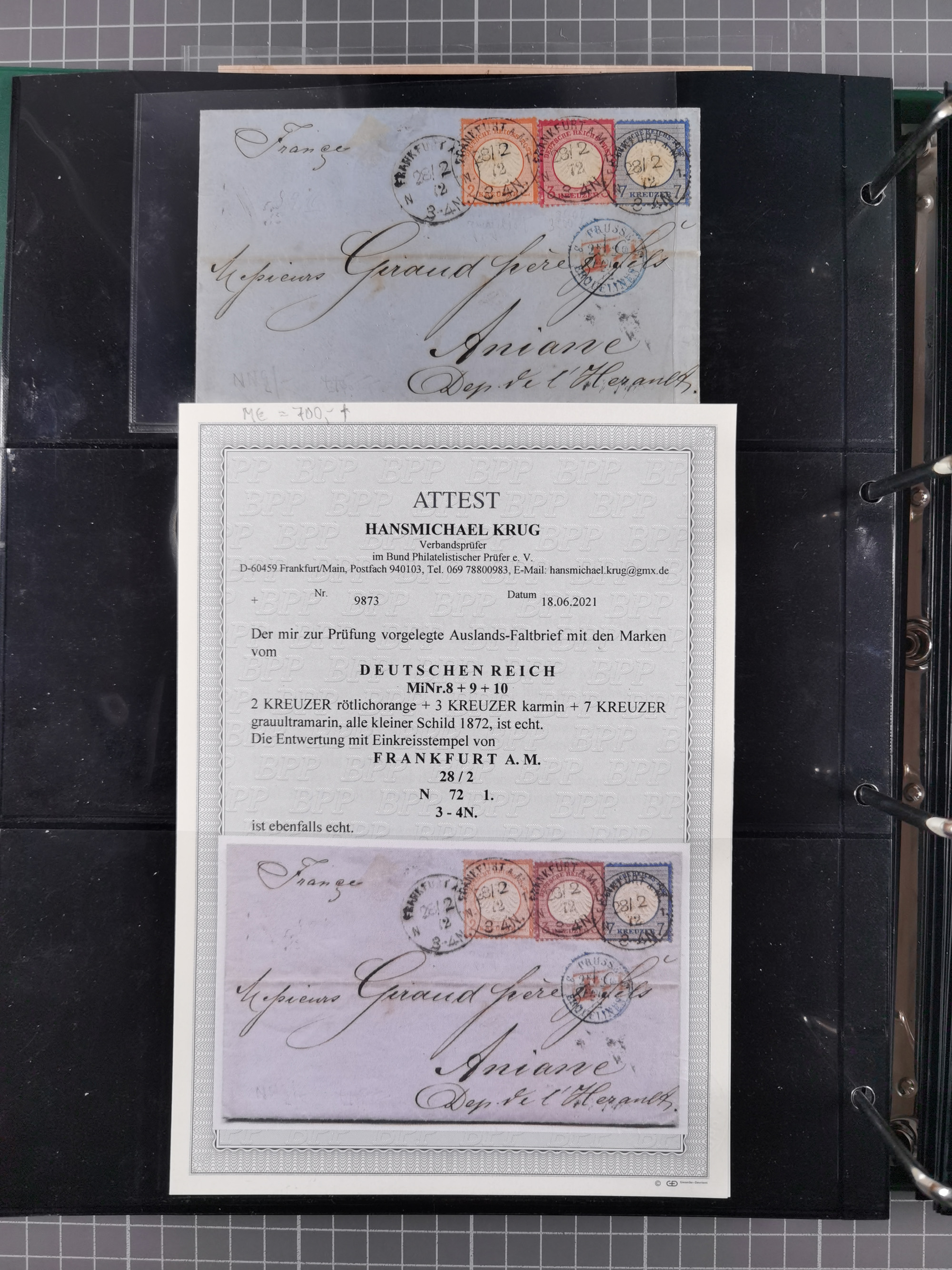 1872/74, umfangreiche Sammlung “Auslandsbriefe” mit ca. 70 Briefen und Karten mit besseren Frankaturen, R-Briefen, Grenzrayon-Briefe in die Niederlande und Schweiz, interessante Stempel, ungewöhnliche Frankatur-Kombination und weiteren Besonderheiten. Dabei u.a. Mi.-Nr. 4+9 auf Brief nach Belgien (FA Krug BPP), Mi.-Nr. 15 im Paar und Einzelmarke + 23a auf Brief in die Schweiz (Paar mit Reparatur, FA Krug BPP), Mi.-Nr. 16+18 auf Drucksache nach Amsterdam, 6x Mi.-Nr. 17a auf Brief in die Schweiz (ein Wert mit Bug), 2x Mi.-Nr. 27a auf Brief nach Schweden, 2x Mi.-Nr. 11+23a auf falsch frankiertem R-Brief nach Paris (fehlerhaft, FA Hennies BPP), Paketkarte mit Mi.-Nr. 12 + 20 (2) nach Amsterdam und Mi.-Nr. 1, 18, 19 und 22 auf Brief nach Australien (repariert, FA Krug BPP). Dazu drei Briefe aus DP Türkei mit Vorläufer-Frankaturen, u.a. Mi.-Nr. V5 (2) auf Faltbrief in die Schweiz. Die Erhaltung ist zum Teil fehlerhaft, vieles signiert bzw. mit FB und Fotoattesten, ex Untermann