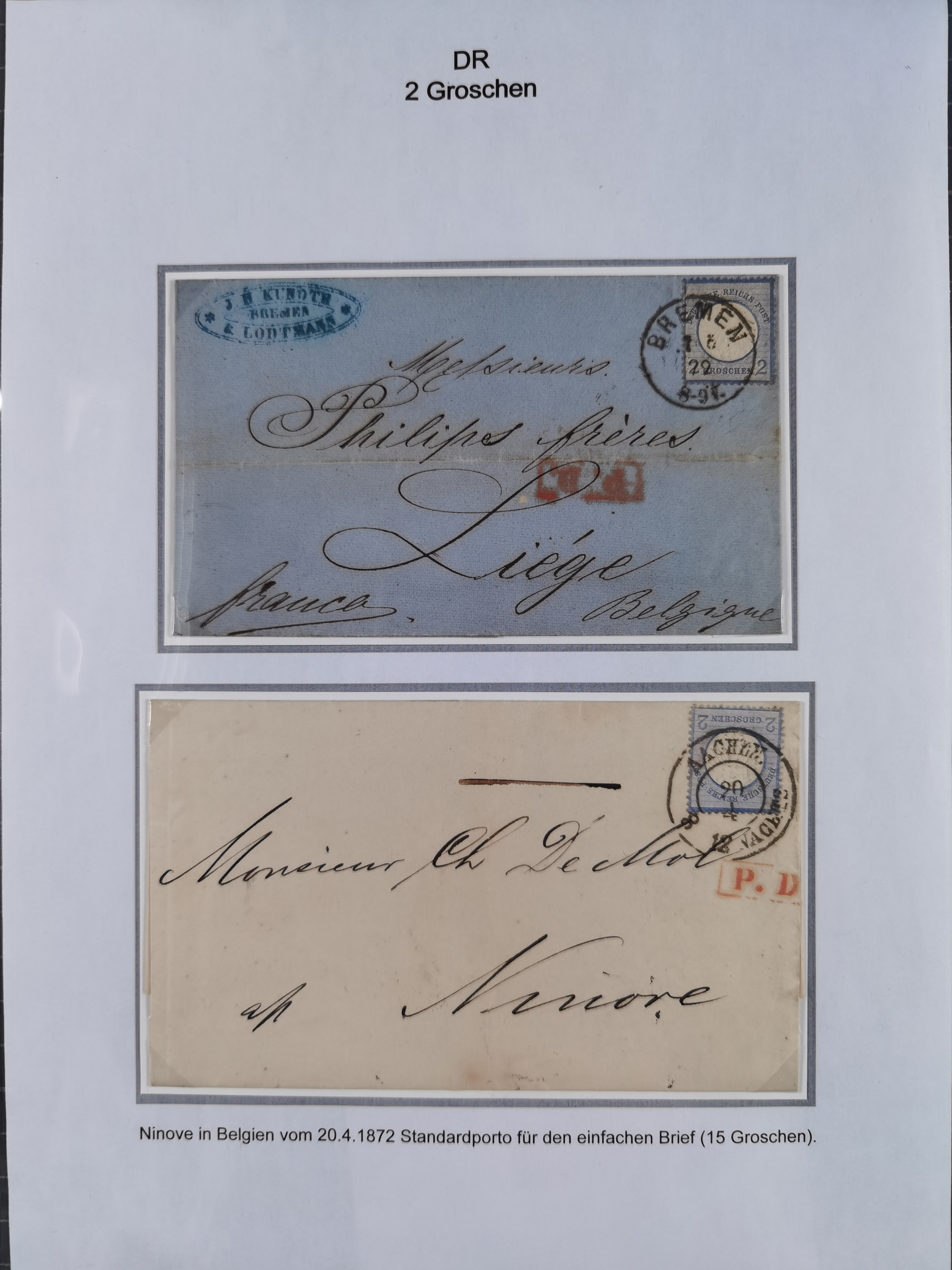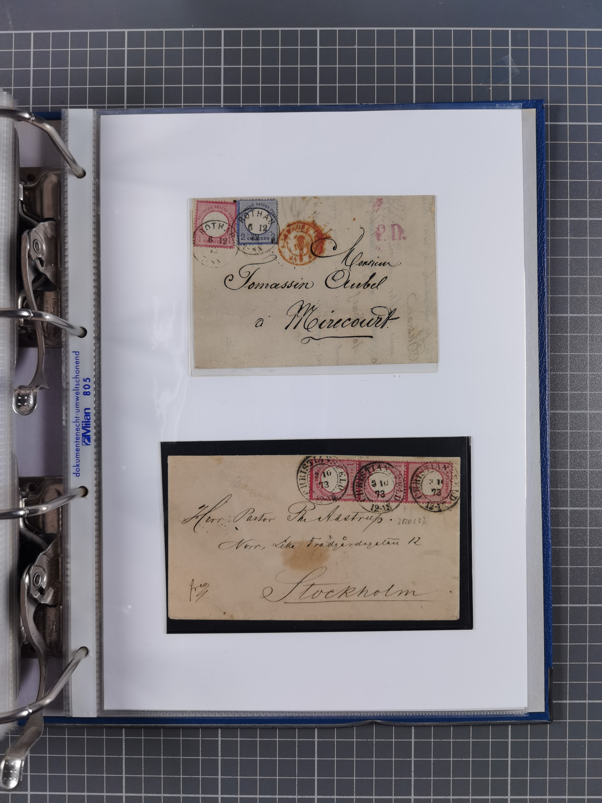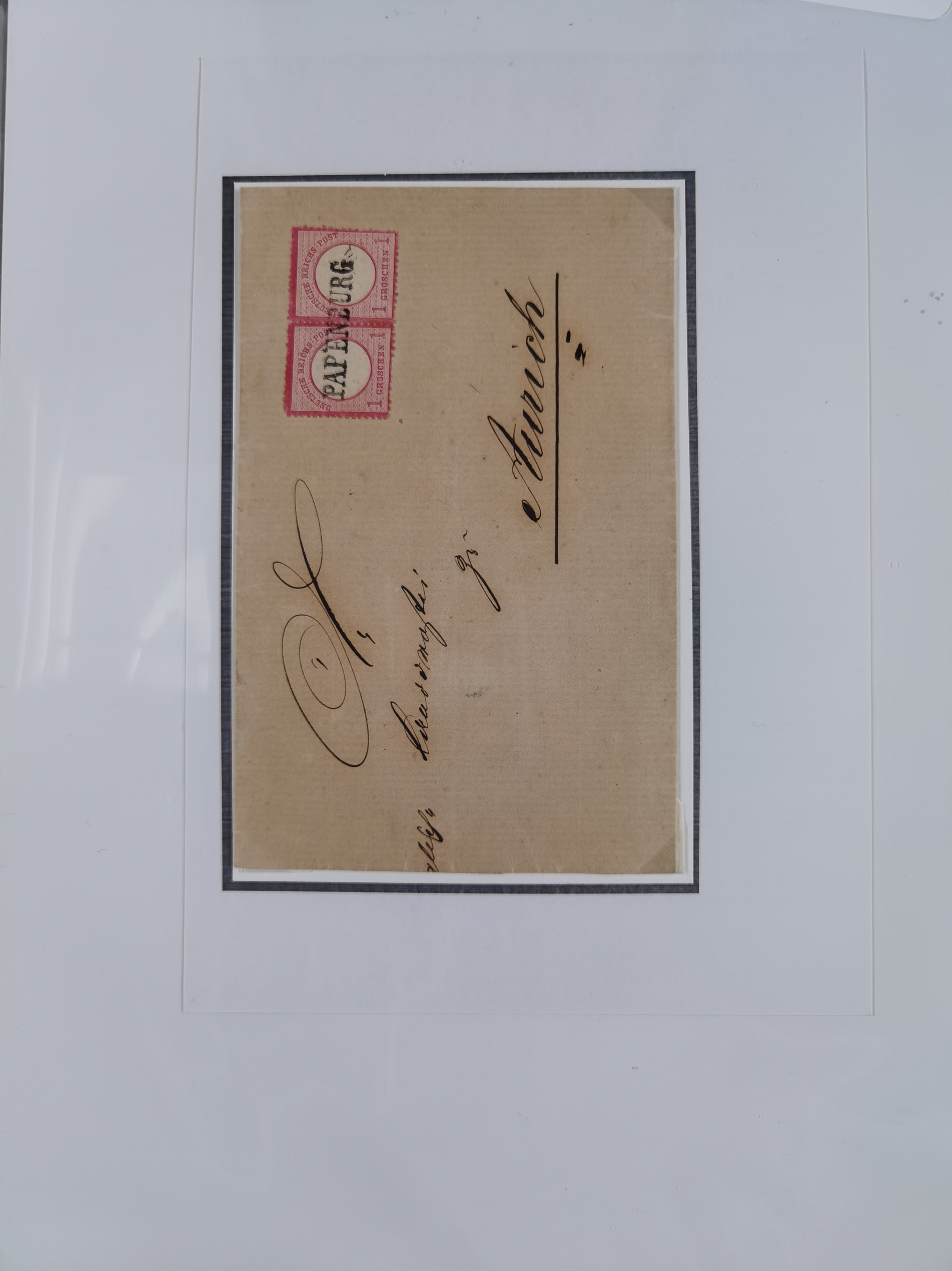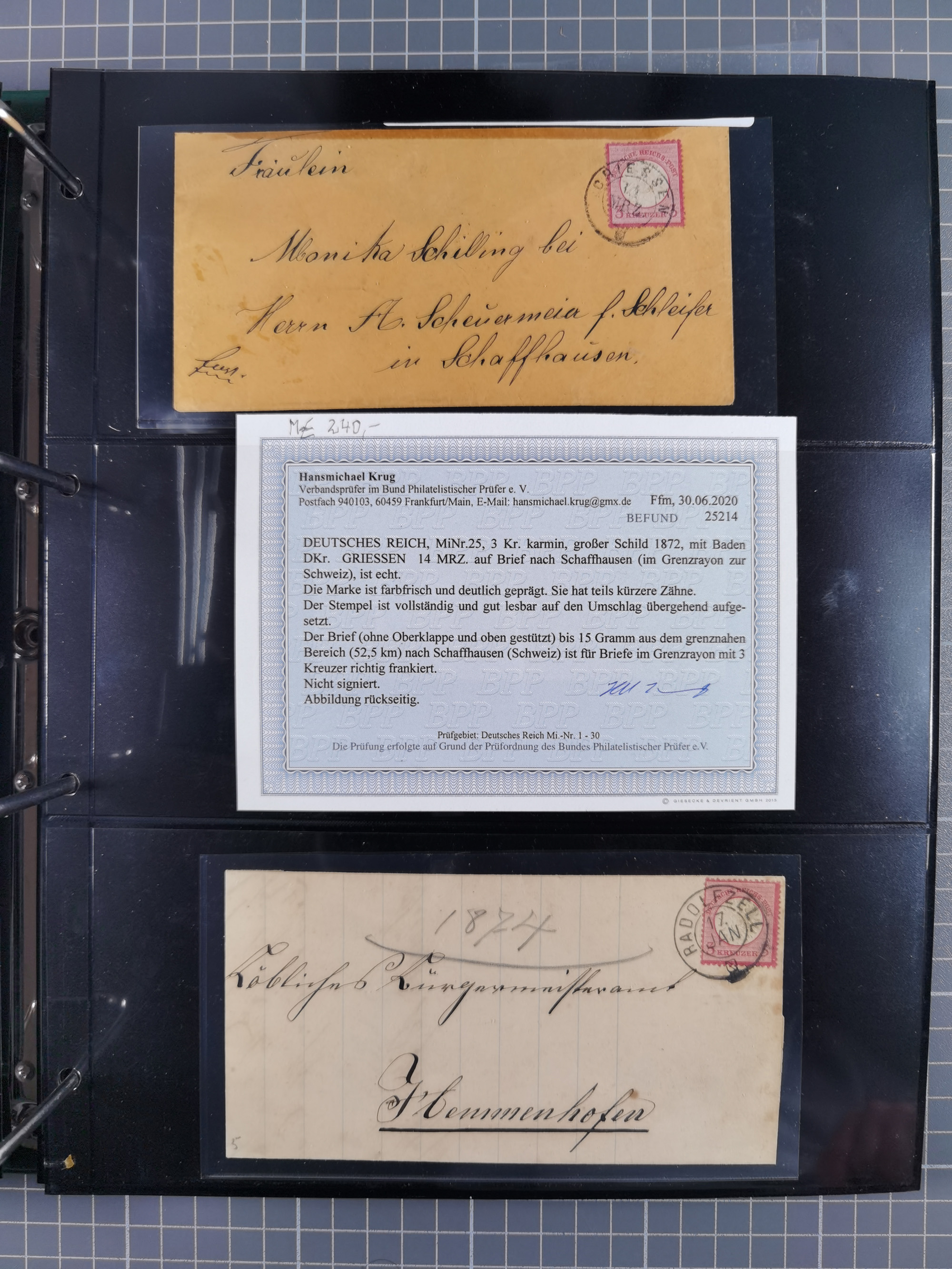 1872/74, umfangreiche Sammlung “Auslandsbriefe” mit ca. 70 Briefen und Karten mit besseren Frankaturen, R-Briefen, Grenzrayon-Briefe in die Niederlande und Schweiz, interessante Stempel, ungewöhnliche Frankatur-Kombination und weiteren Besonderheiten. Dabei u.a. Mi.-Nr. 4+9 auf Brief nach Belgien (FA Krug BPP), Mi.-Nr. 15 im Paar und Einzelmarke + 23a auf Brief in die Schweiz (Paar mit Reparatur, FA Krug BPP), Mi.-Nr. 16+18 auf Drucksache nach Amsterdam, 6x Mi.-Nr. 17a auf Brief in die Schweiz (ein Wert mit Bug), 2x Mi.-Nr. 27a auf Brief nach Schweden, 2x Mi.-Nr. 11+23a auf falsch frankiertem R-Brief nach Paris (fehlerhaft, FA Hennies BPP), Paketkarte mit Mi.-Nr. 12 + 20 (2) nach Amsterdam und Mi.-Nr. 1, 18, 19 und 22 auf Brief nach Australien (repariert, FA Krug BPP). Dazu drei Briefe aus DP Türkei mit Vorläufer-Frankaturen, u.a. Mi.-Nr. V5 (2) auf Faltbrief in die Schweiz. Die Erhaltung ist zum Teil fehlerhaft, vieles signiert bzw. mit FB und Fotoattesten, ex Untermann