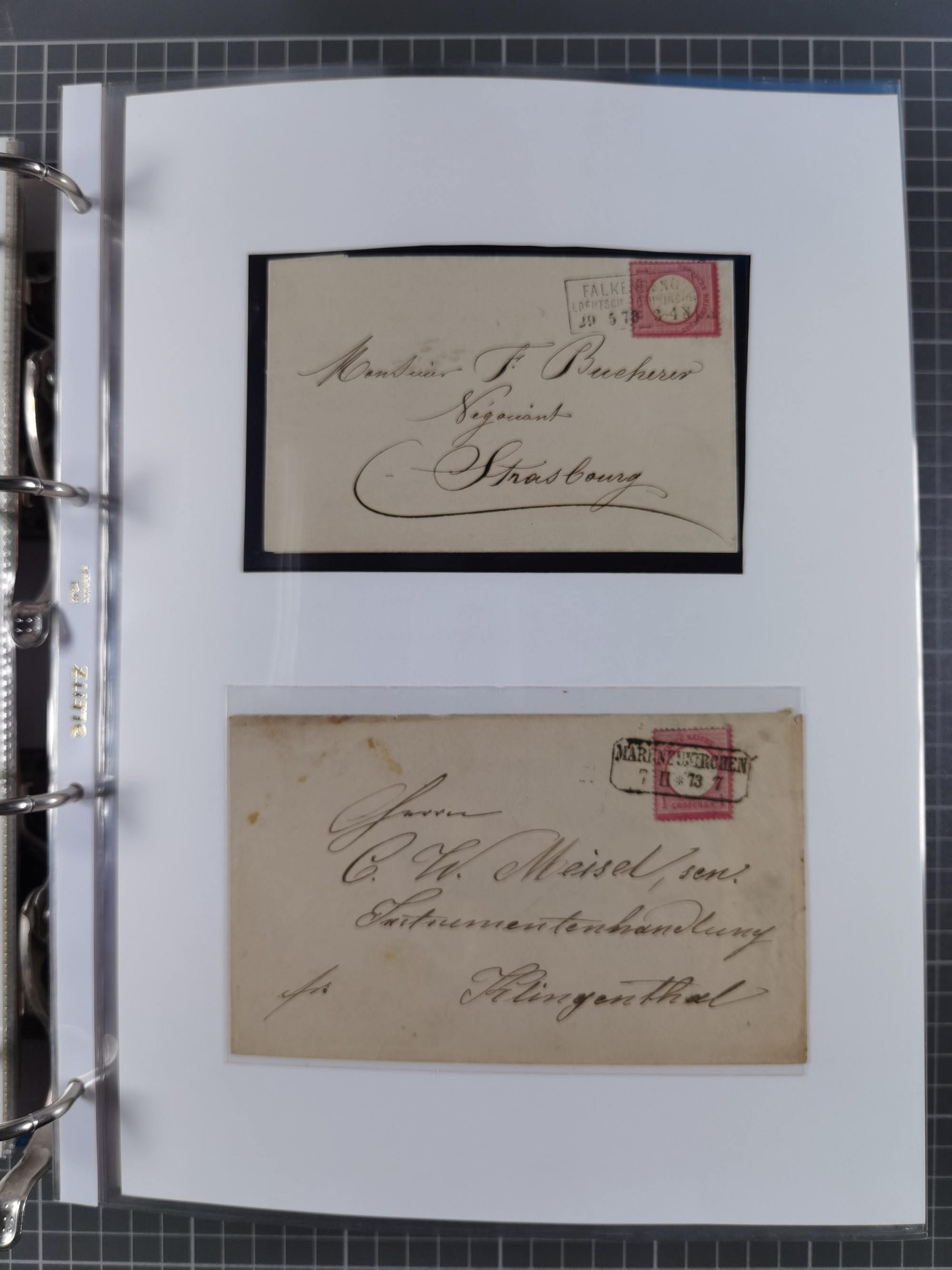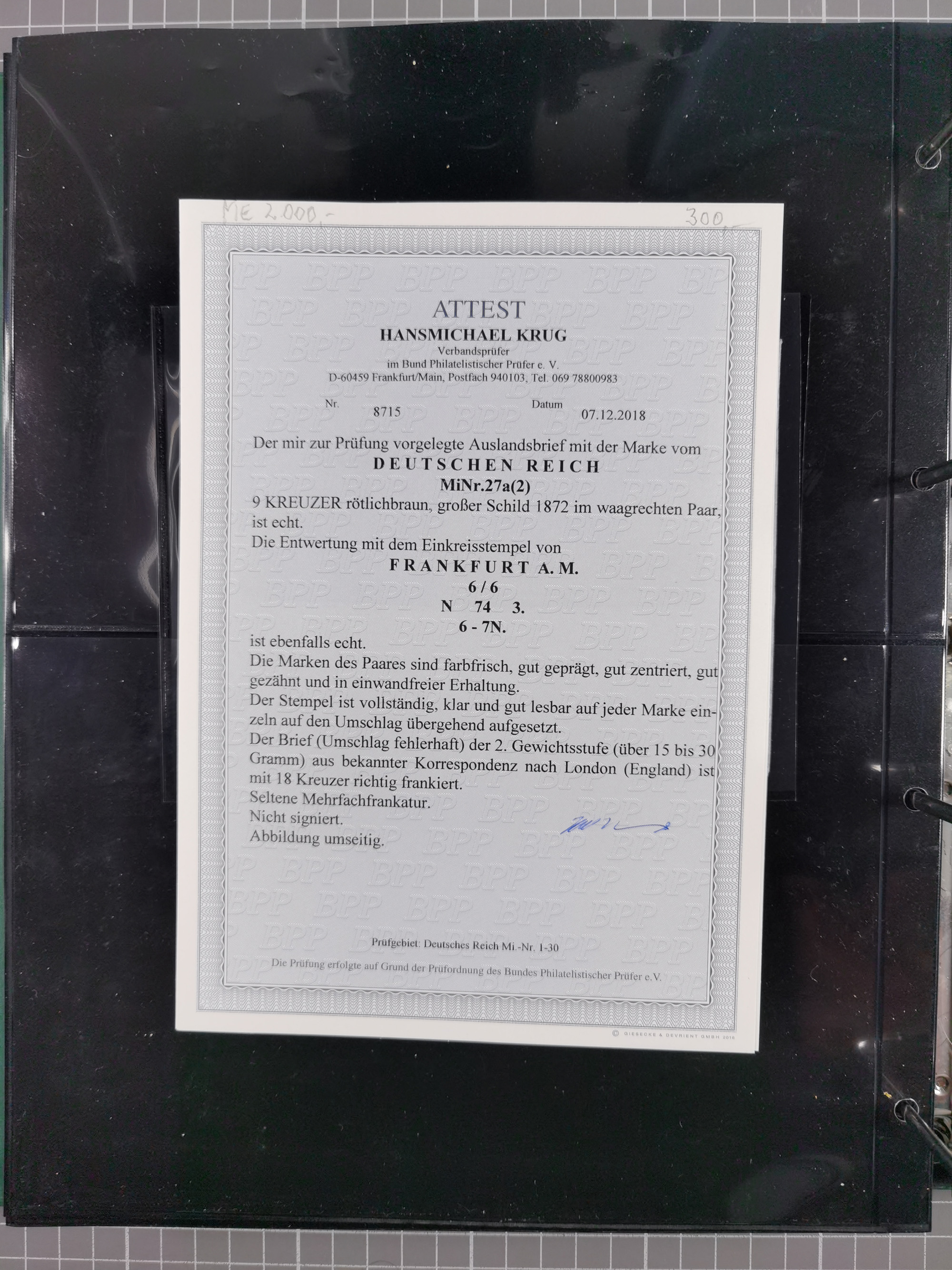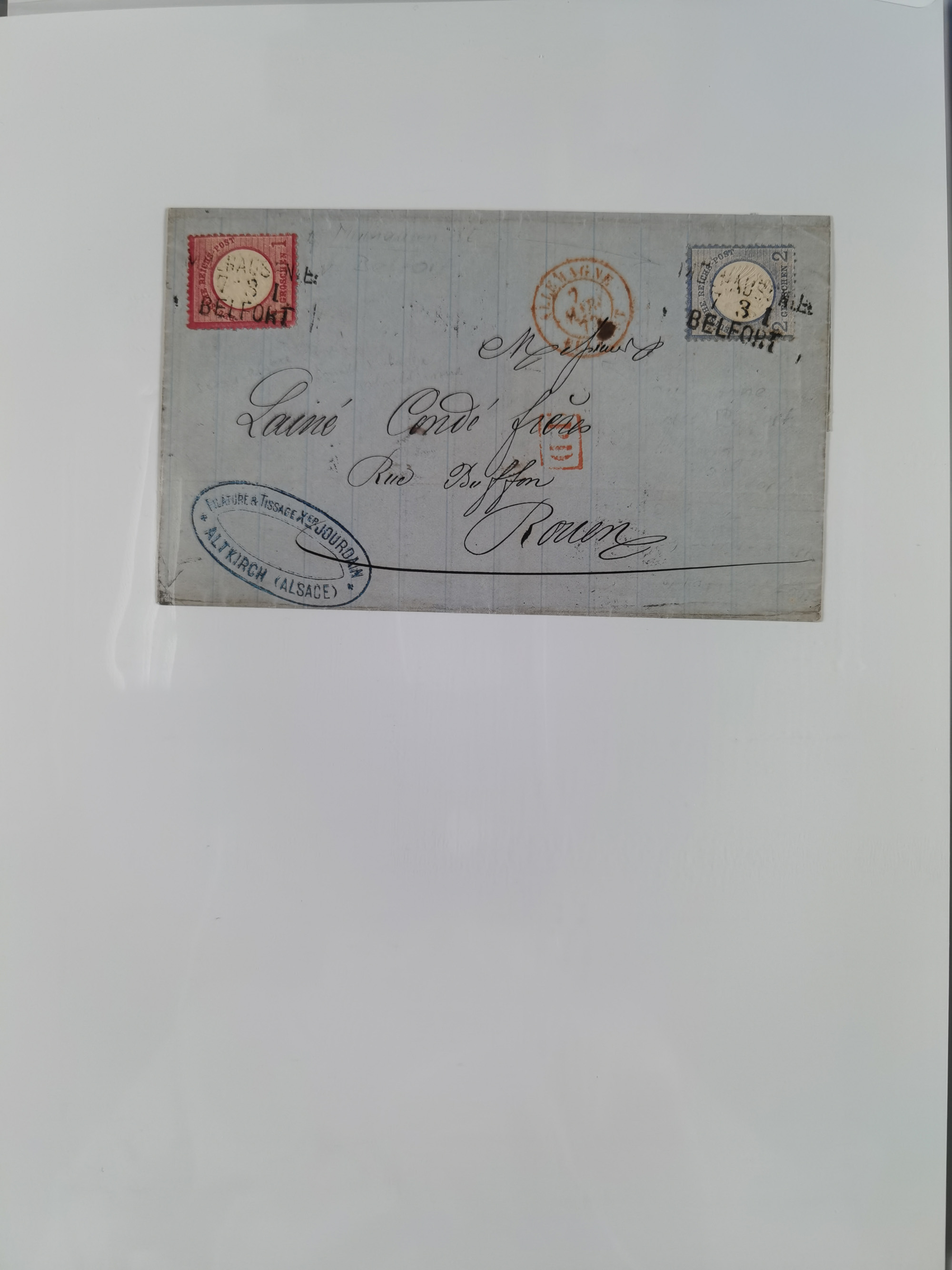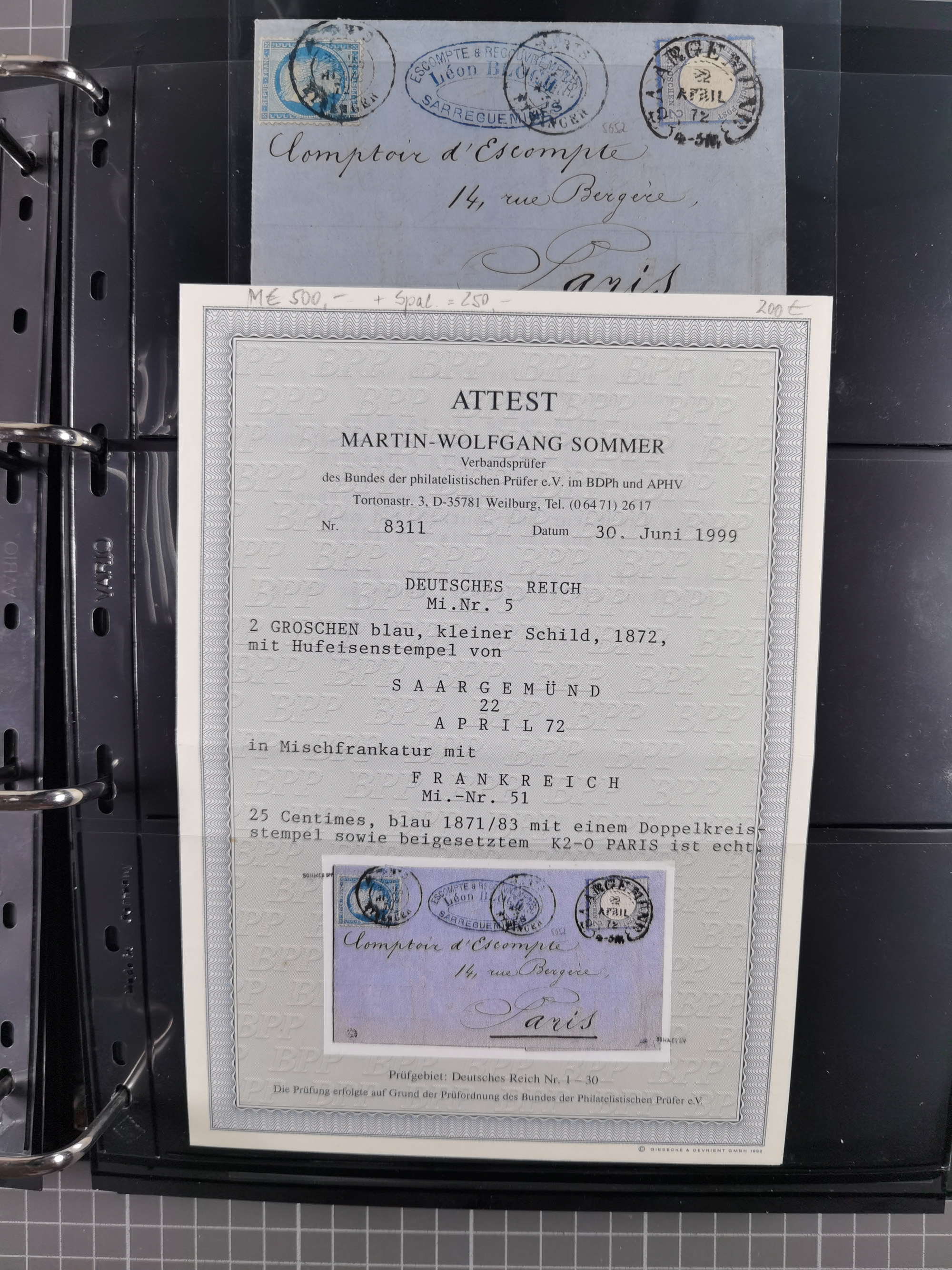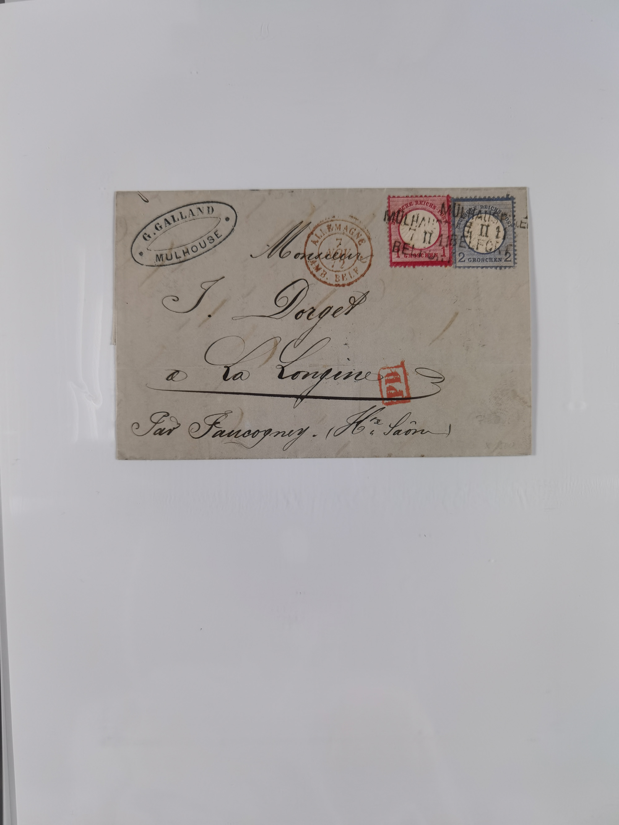 1872/74, umfangreiche Sammlung “Auslandsbriefe” mit ca. 70 Briefen und Karten mit besseren Frankaturen, R-Briefen, Grenzrayon-Briefe in die Niederlande und Schweiz, interessante Stempel, ungewöhnliche Frankatur-Kombination und weiteren Besonderheiten. Dabei u.a. Mi.-Nr. 4+9 auf Brief nach Belgien (FA Krug BPP), Mi.-Nr. 15 im Paar und Einzelmarke + 23a auf Brief in die Schweiz (Paar mit Reparatur, FA Krug BPP), Mi.-Nr. 16+18 auf Drucksache nach Amsterdam, 6x Mi.-Nr. 17a auf Brief in die Schweiz (ein Wert mit Bug), 2x Mi.-Nr. 27a auf Brief nach Schweden, 2x Mi.-Nr. 11+23a auf falsch frankiertem R-Brief nach Paris (fehlerhaft, FA Hennies BPP), Paketkarte mit Mi.-Nr. 12 + 20 (2) nach Amsterdam und Mi.-Nr. 1, 18, 19 und 22 auf Brief nach Australien (repariert, FA Krug BPP). Dazu drei Briefe aus DP Türkei mit Vorläufer-Frankaturen, u.a. Mi.-Nr. V5 (2) auf Faltbrief in die Schweiz. Die Erhaltung ist zum Teil fehlerhaft, vieles signiert bzw. mit FB und Fotoattesten, ex Untermann