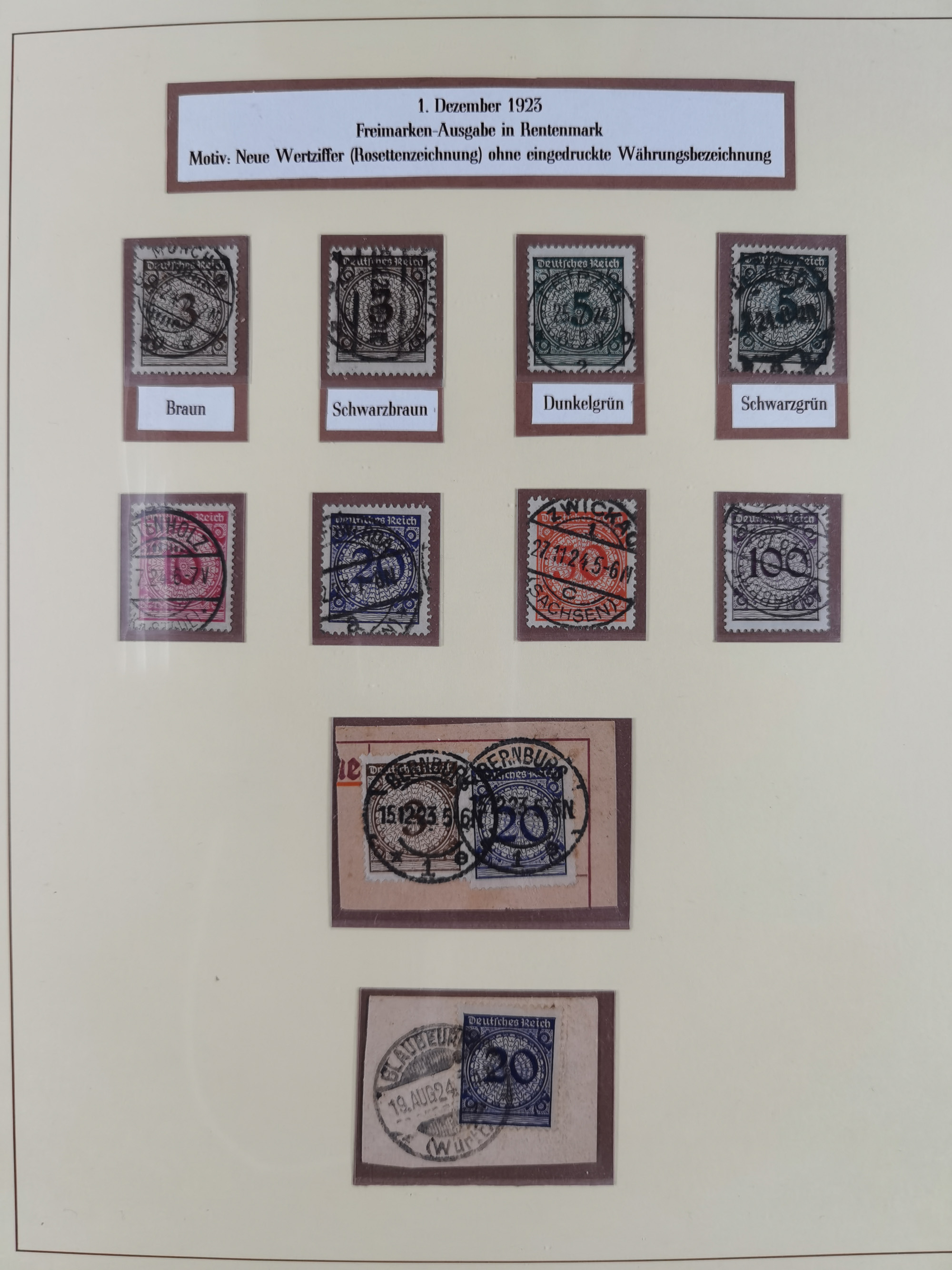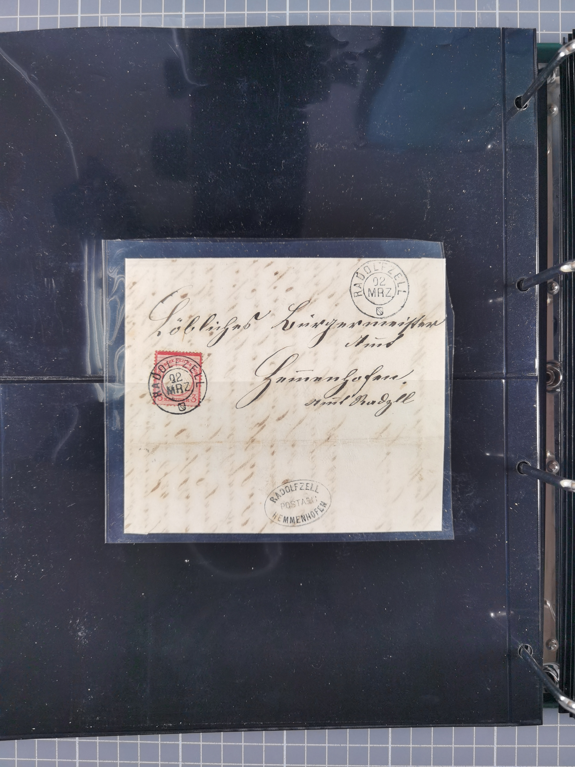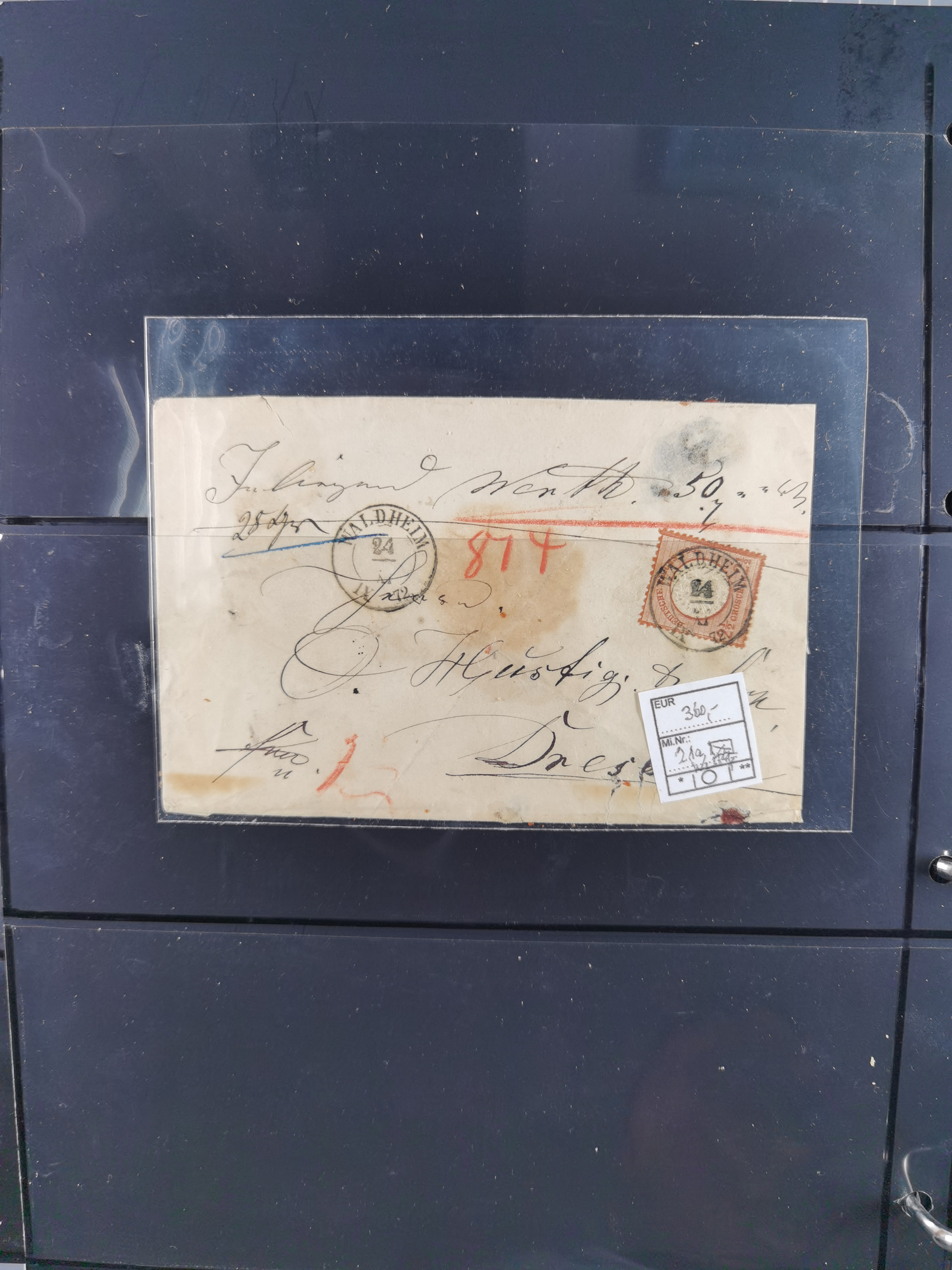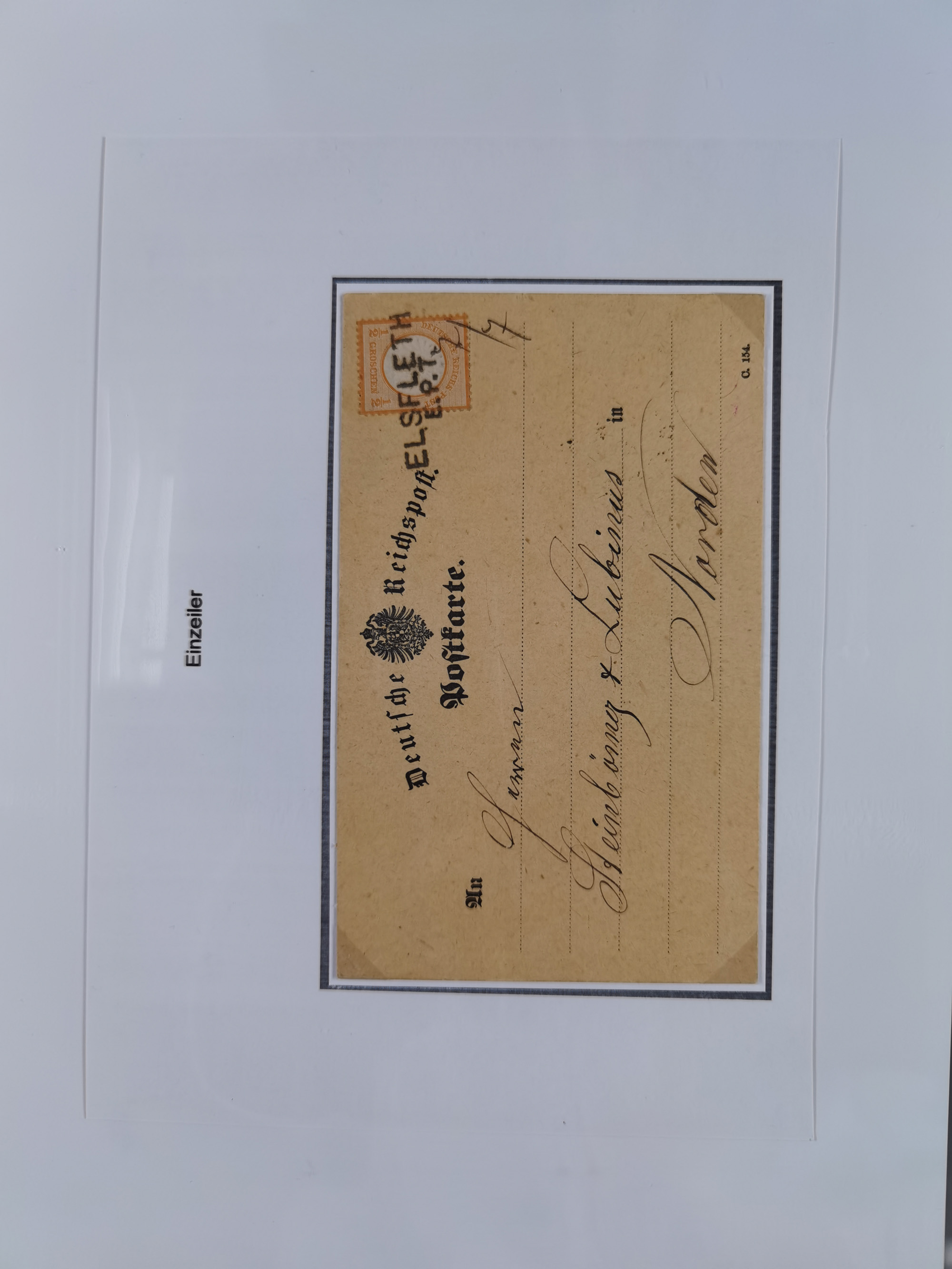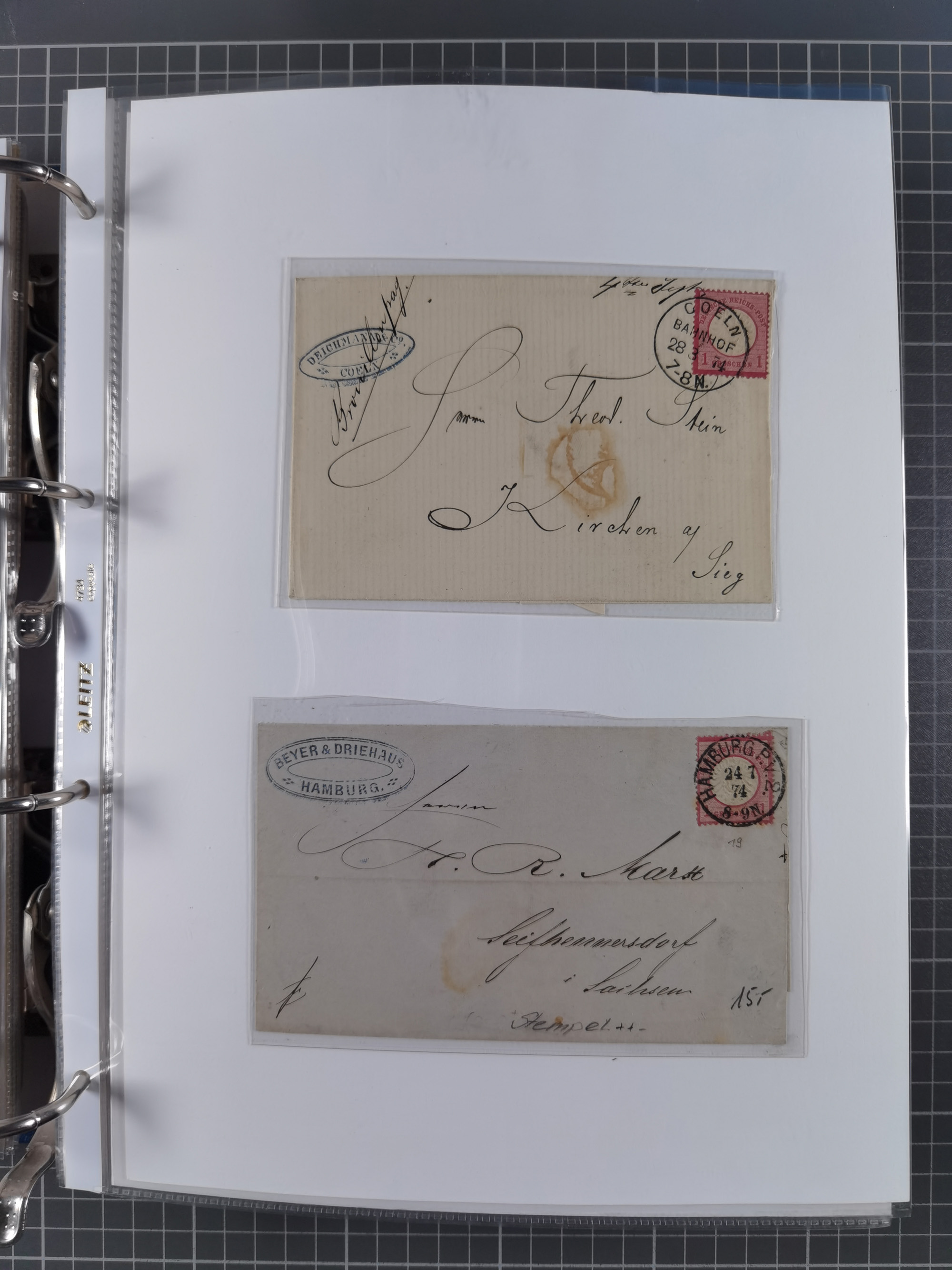 1872/1923, umfangreiche Sammlung mit ca. 800 Briefen,Karten und Ganzsachen. Am Anfang mit kleinem Teil “Hufeisentstempel”, ansonsten liegt der Schwerpunkt bei Infla mit Einzel- und Mehrfachfrankaturen, R-Briefen, Auslandspost, viel Hochinflation mit Dezember-Briefen und Portostufen. Alles auf selbst gestalteten Albenblättern in10 Alben