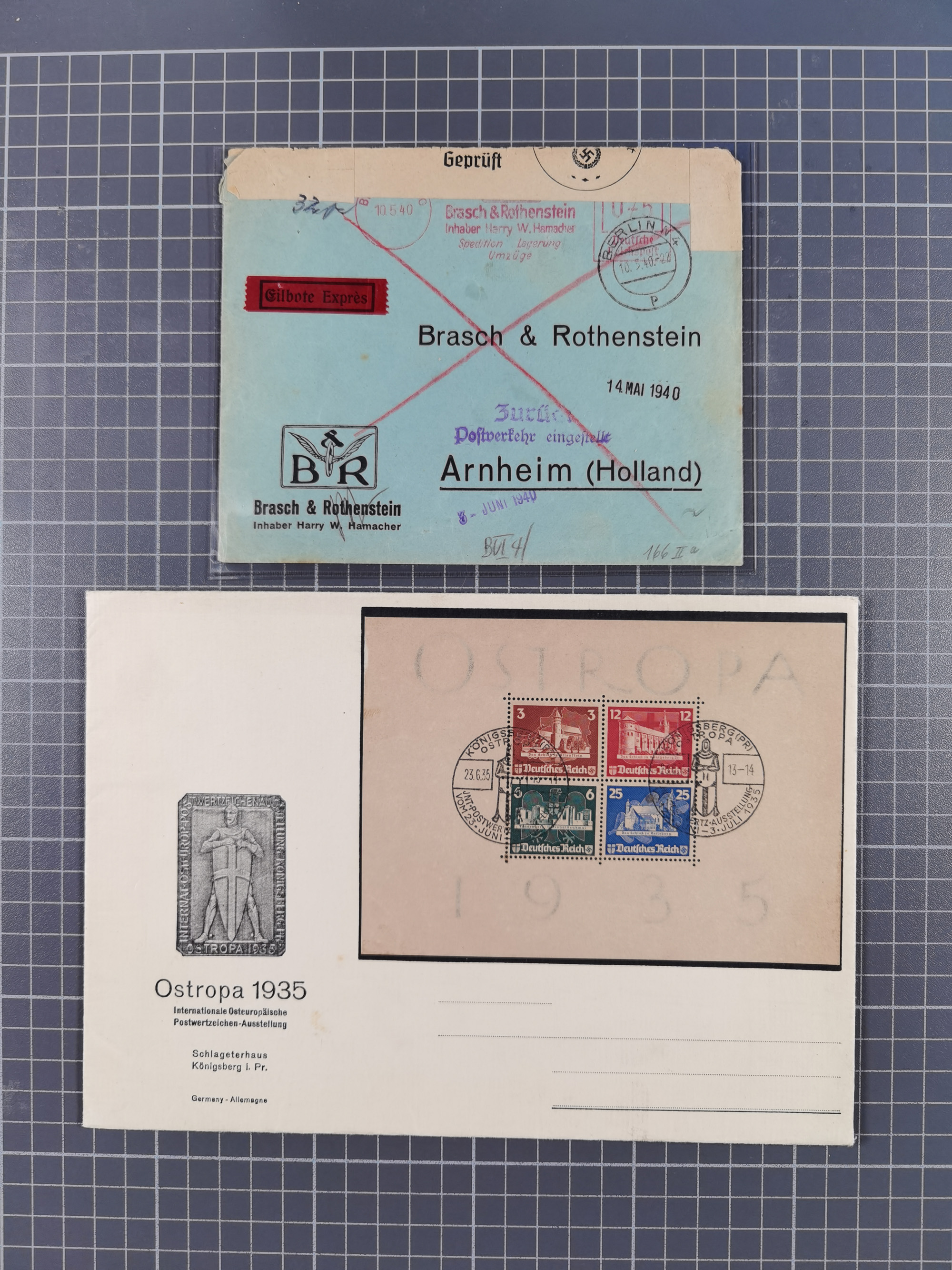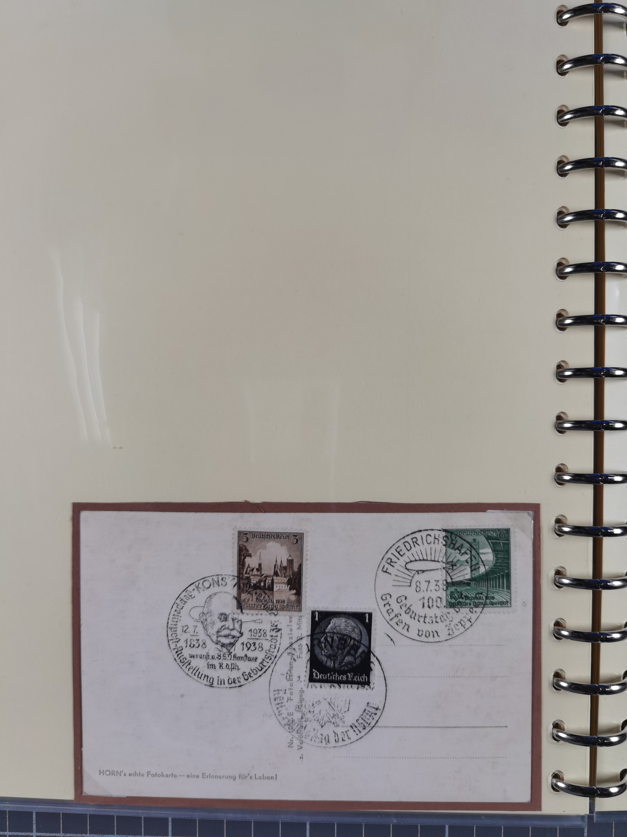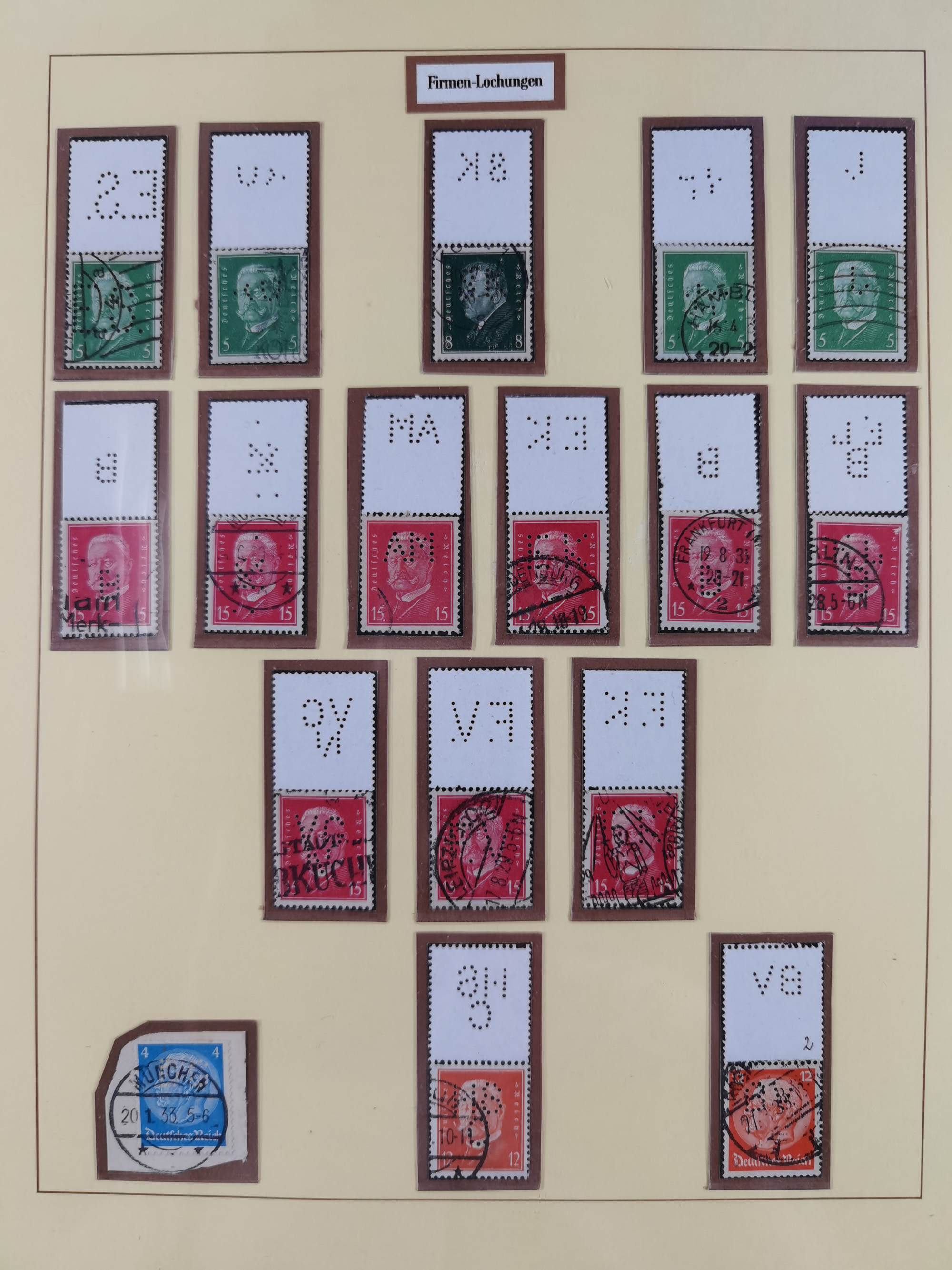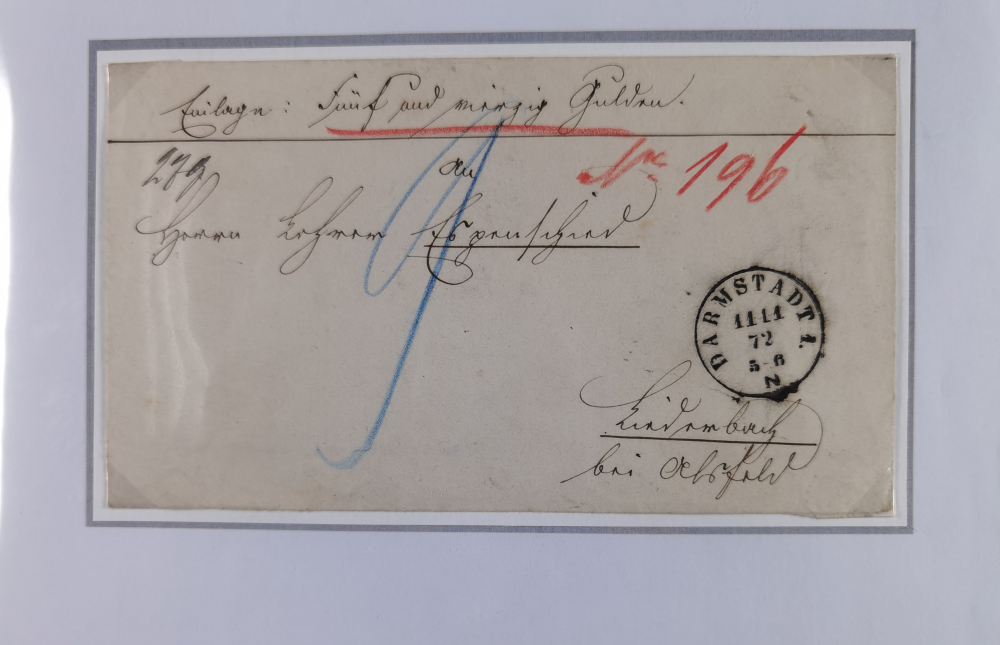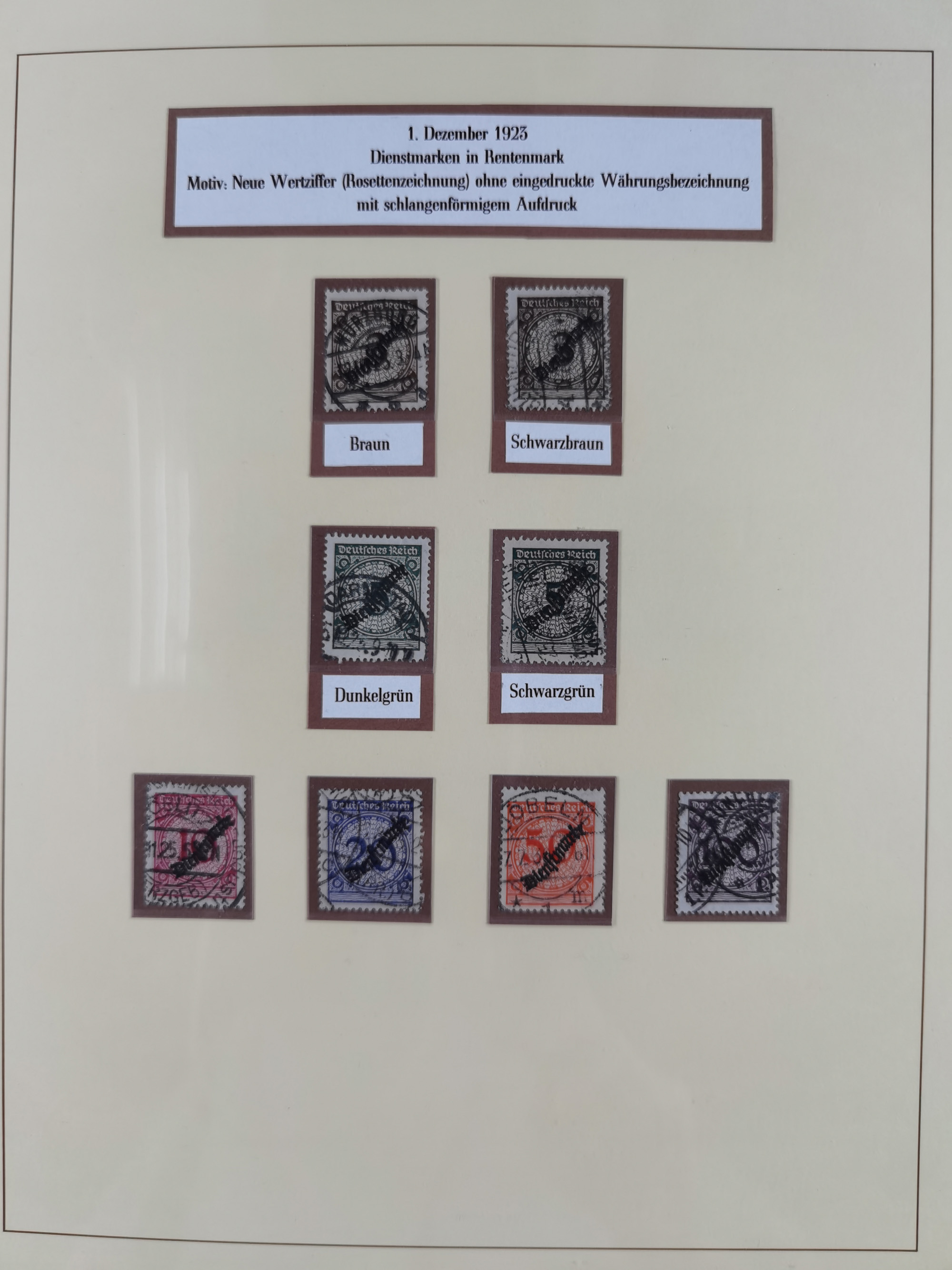 1872/1923, umfangreiche Sammlung mit ca. 800 Briefen,Karten und Ganzsachen. Am Anfang mit kleinem Teil “Hufeisentstempel”, ansonsten liegt der Schwerpunkt bei Infla mit Einzel- und Mehrfachfrankaturen, R-Briefen, Auslandspost, viel Hochinflation mit Dezember-Briefen und Portostufen. Alles auf selbst gestalteten Albenblättern in10 Alben