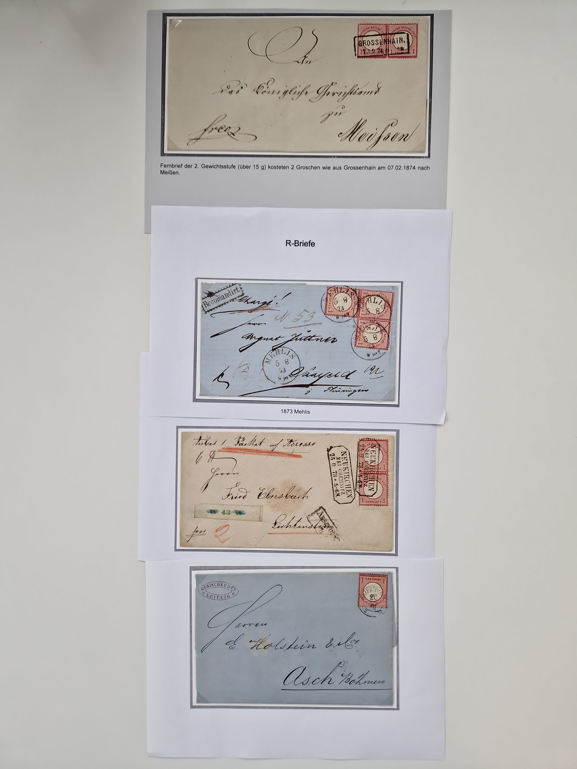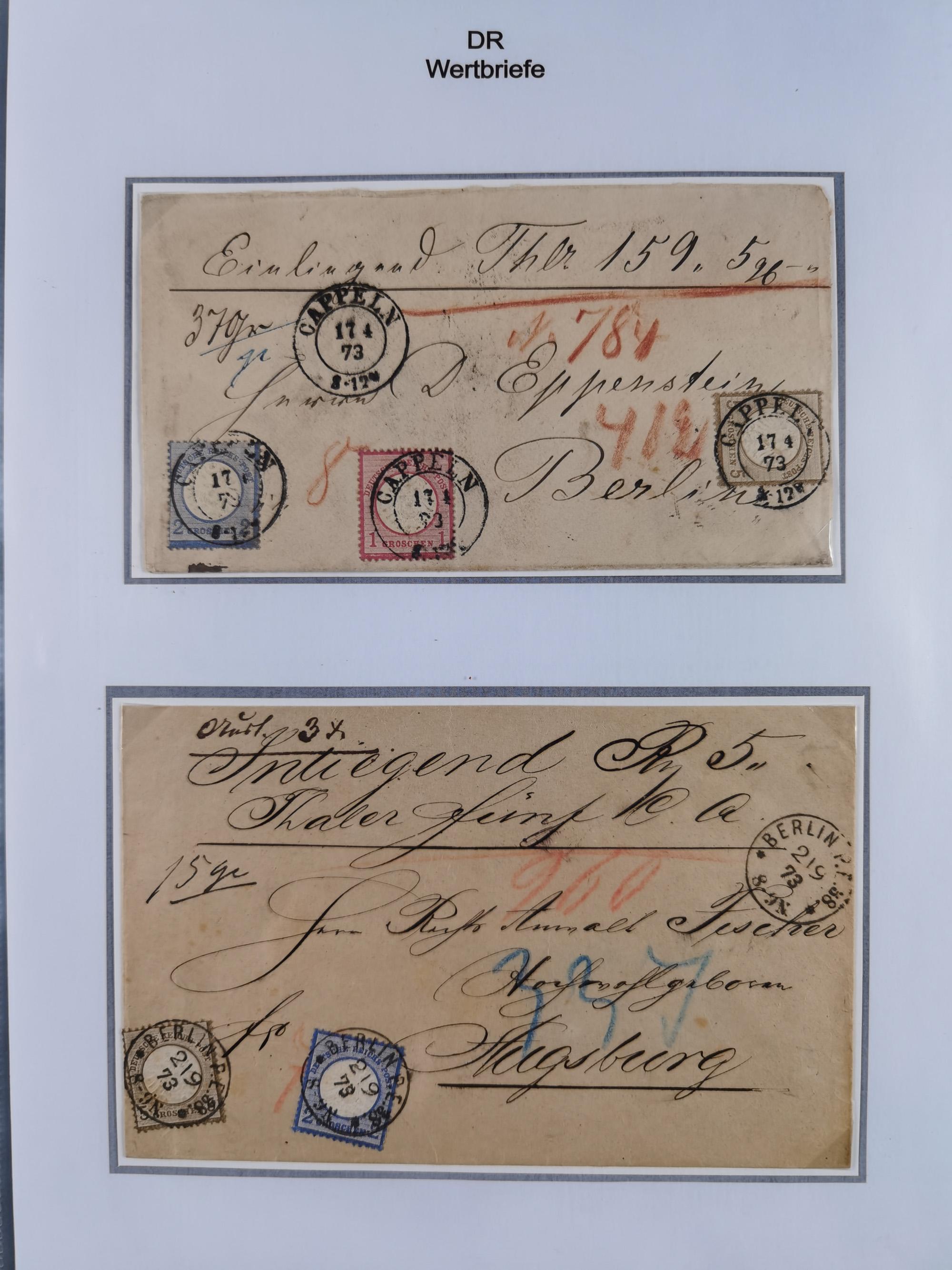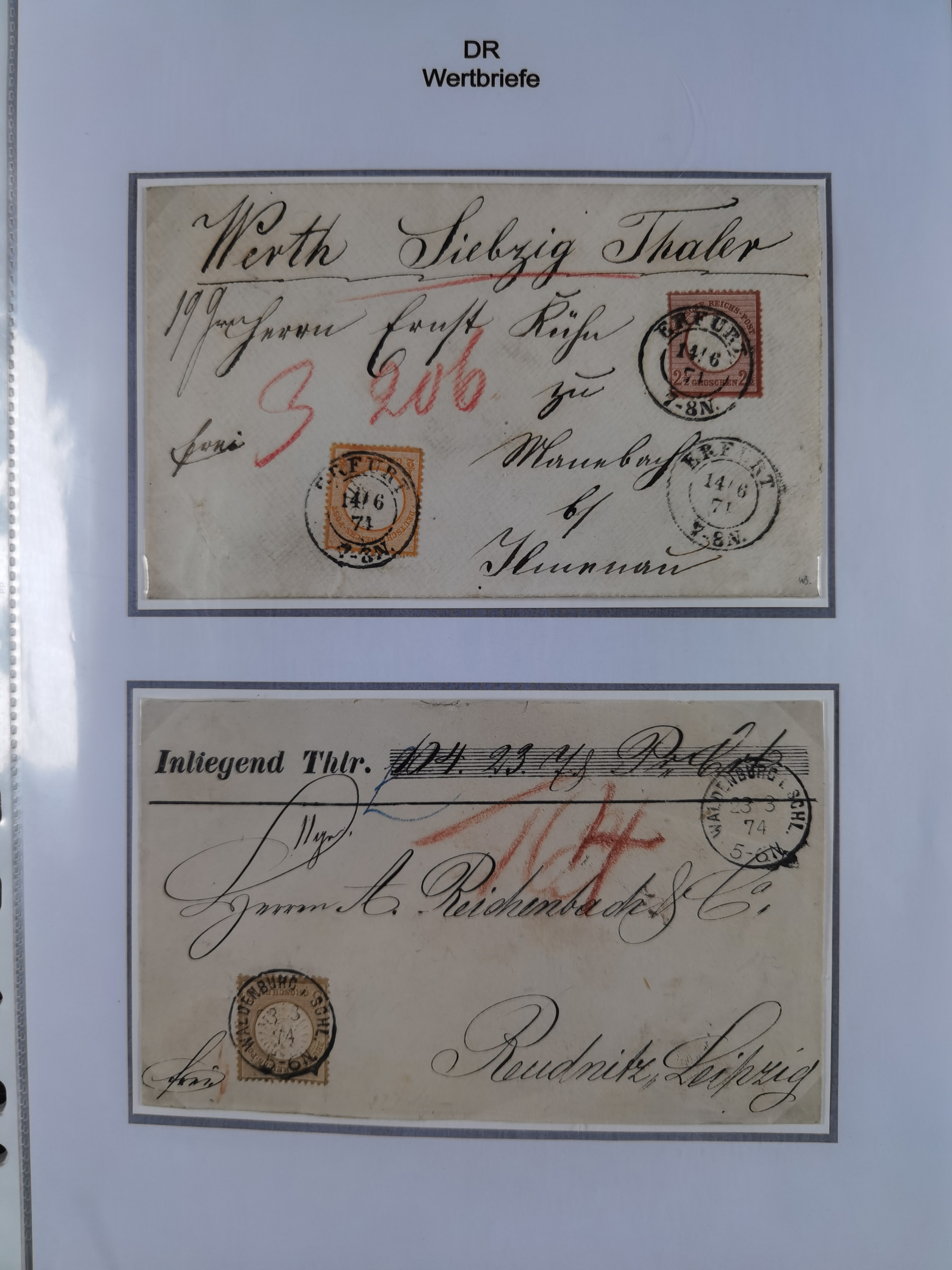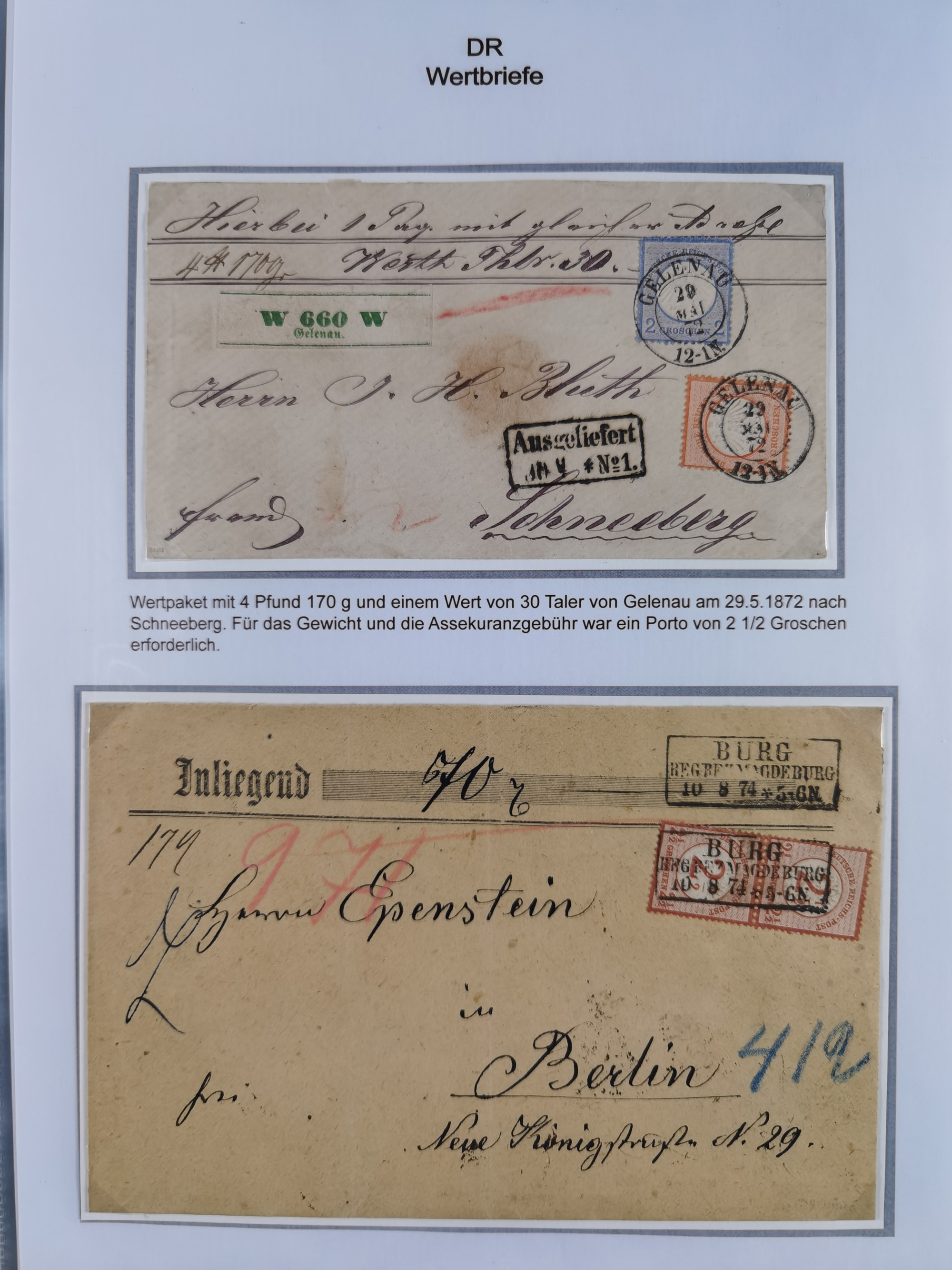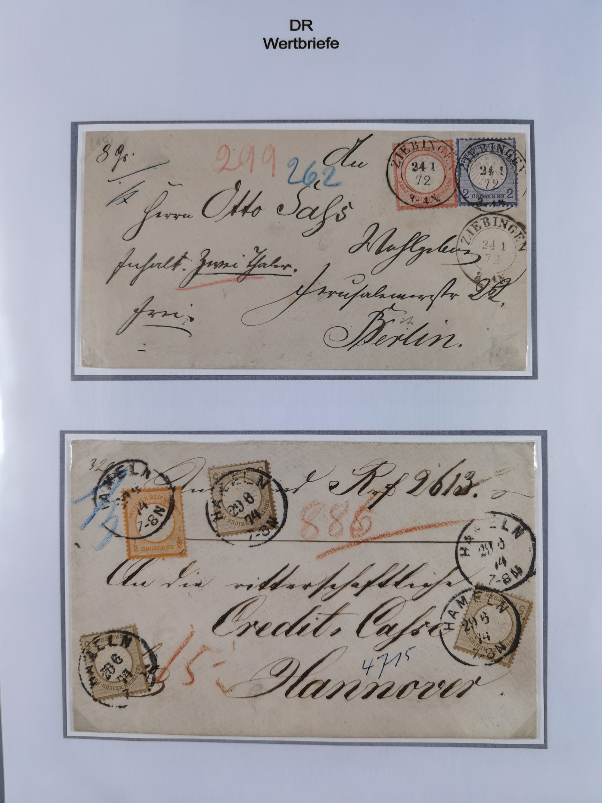 1872/74, Sammlung “Wertbriefe” mit 31 frankierten und zwei unfrankierten Wertbriefen. Dabei GSU mit Zufrankaturen, bessere Einzelfrankaturen, zwei Mehrfachfrankaturen Mi.-Nr. 29 und hohe Frankaturen bis 15½ Groschen. Meist in guter Erhaltung, sauber auf Albenblättern
