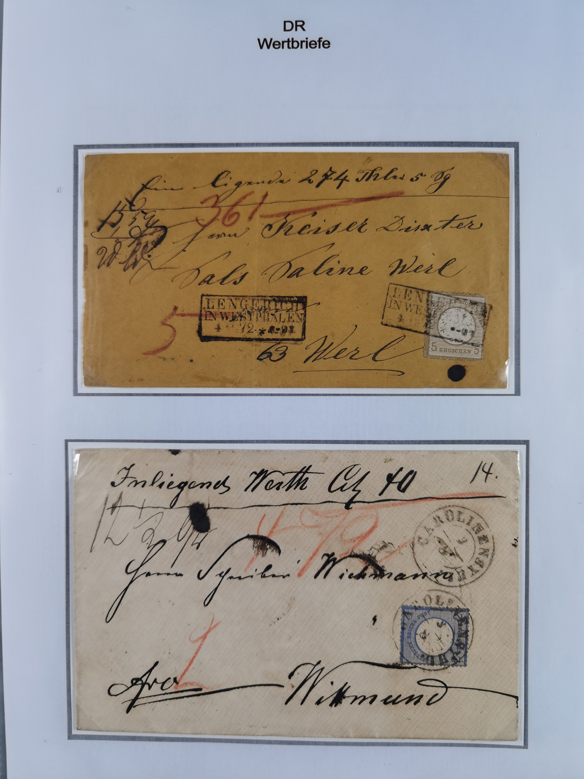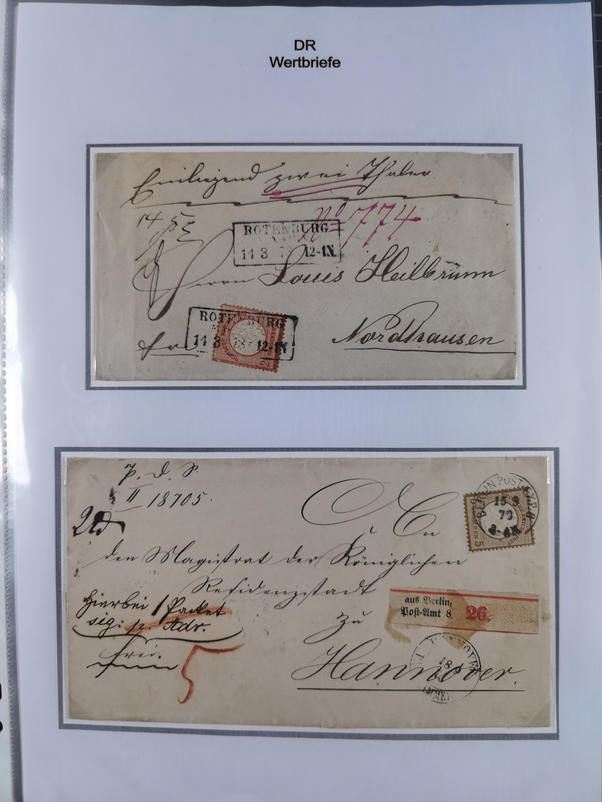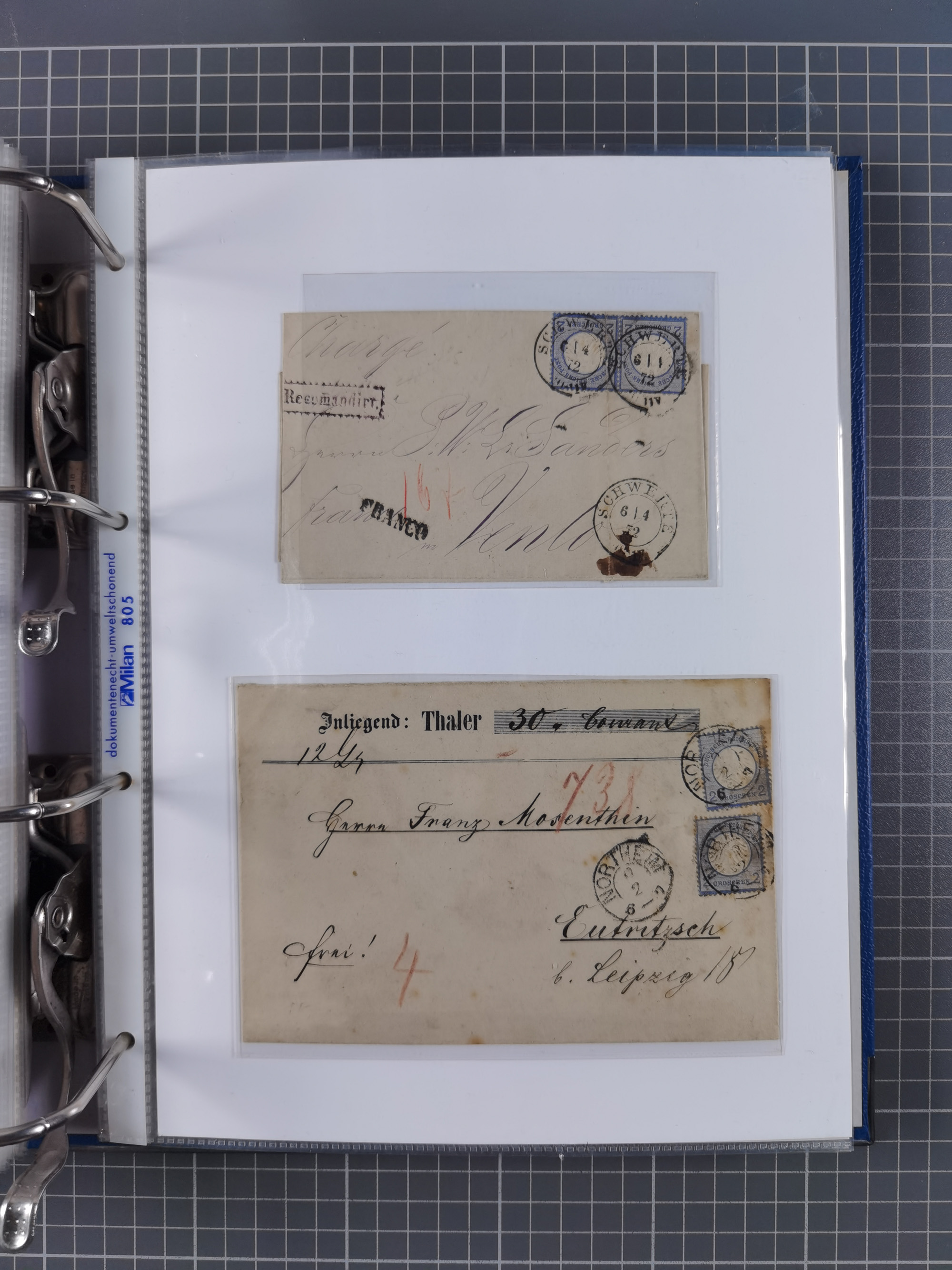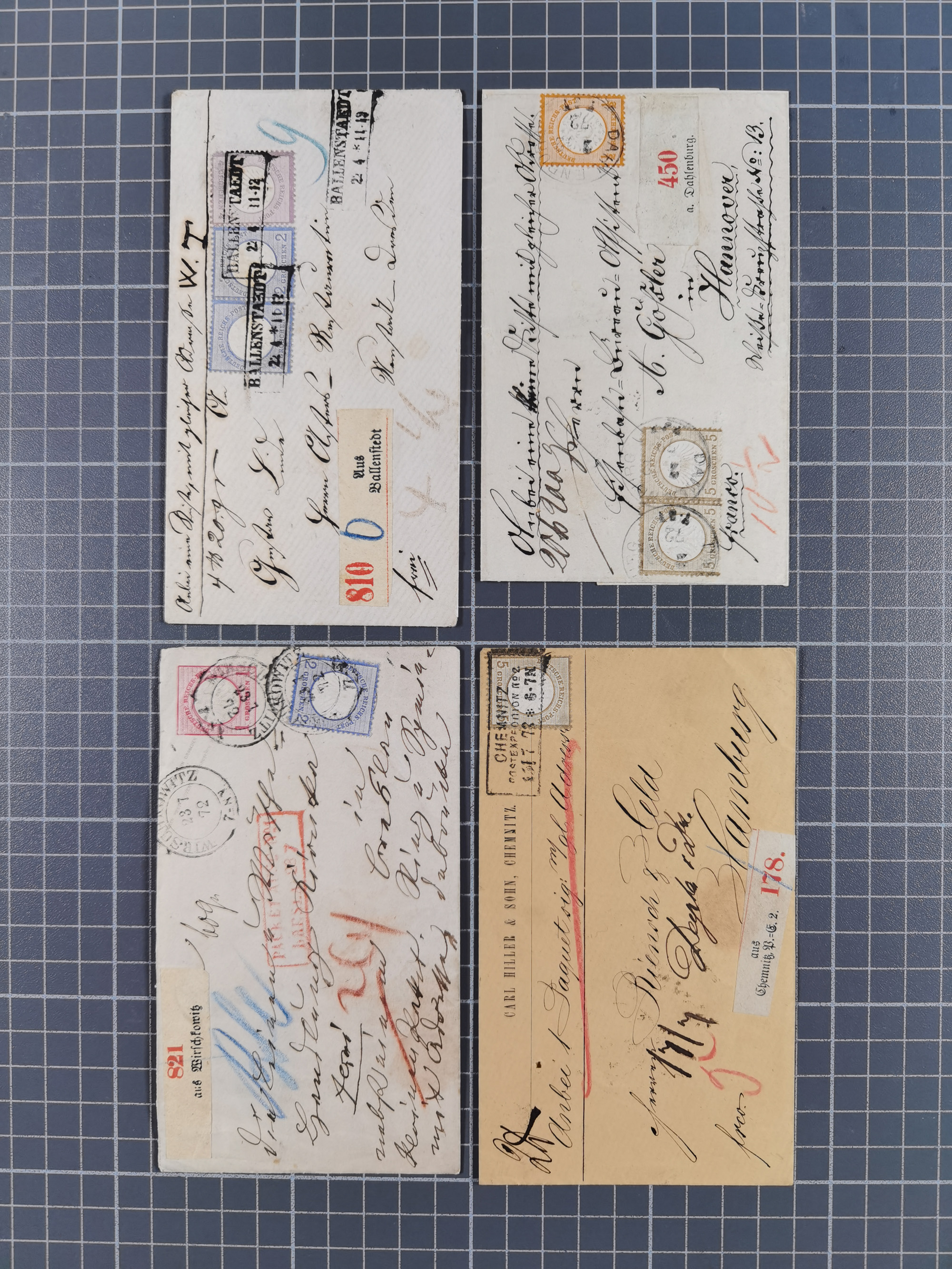1872/74, Sammlung “Wertbriefe” mit 31 frankierten und zwei unfrankierten Wertbriefen. Dabei GSU mit Zufrankaturen, bessere Einzelfrankaturen, zwei Mehrfachfrankaturen Mi.-Nr. 29 und hohe Frankaturen bis 15½ Groschen. Meist in guter Erhaltung, sauber auf Albenblättern