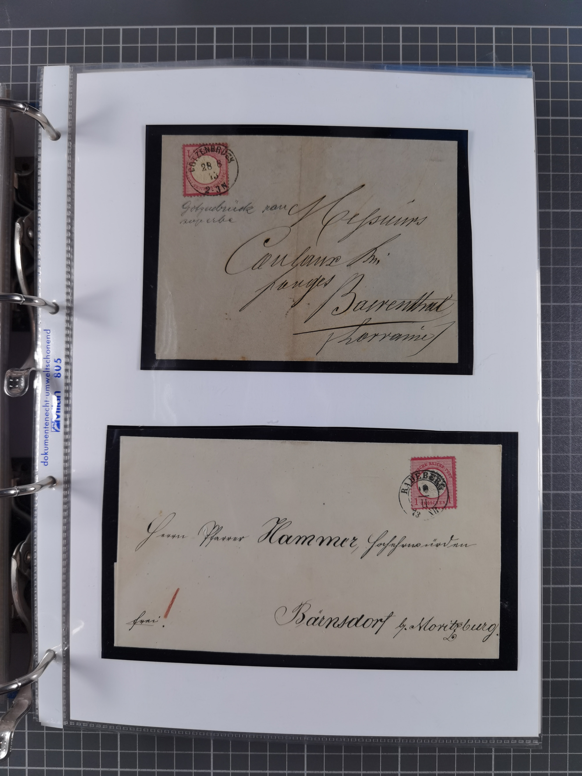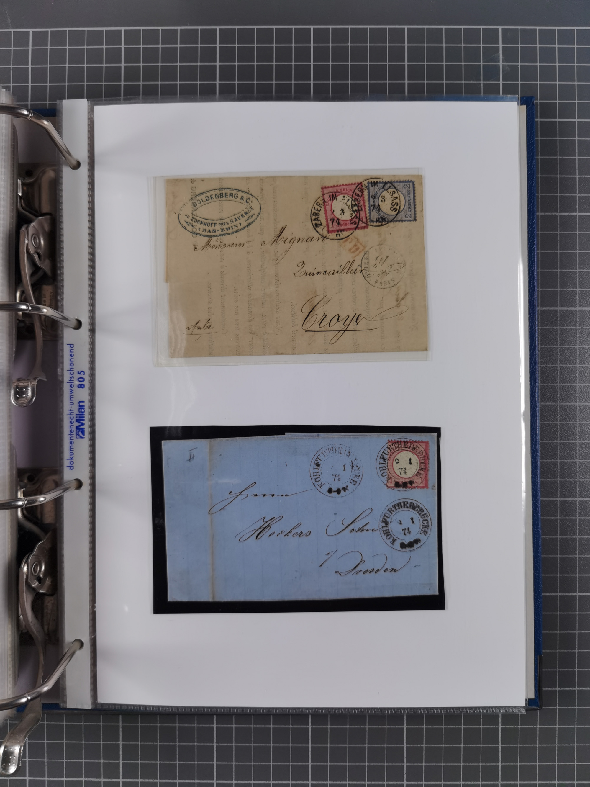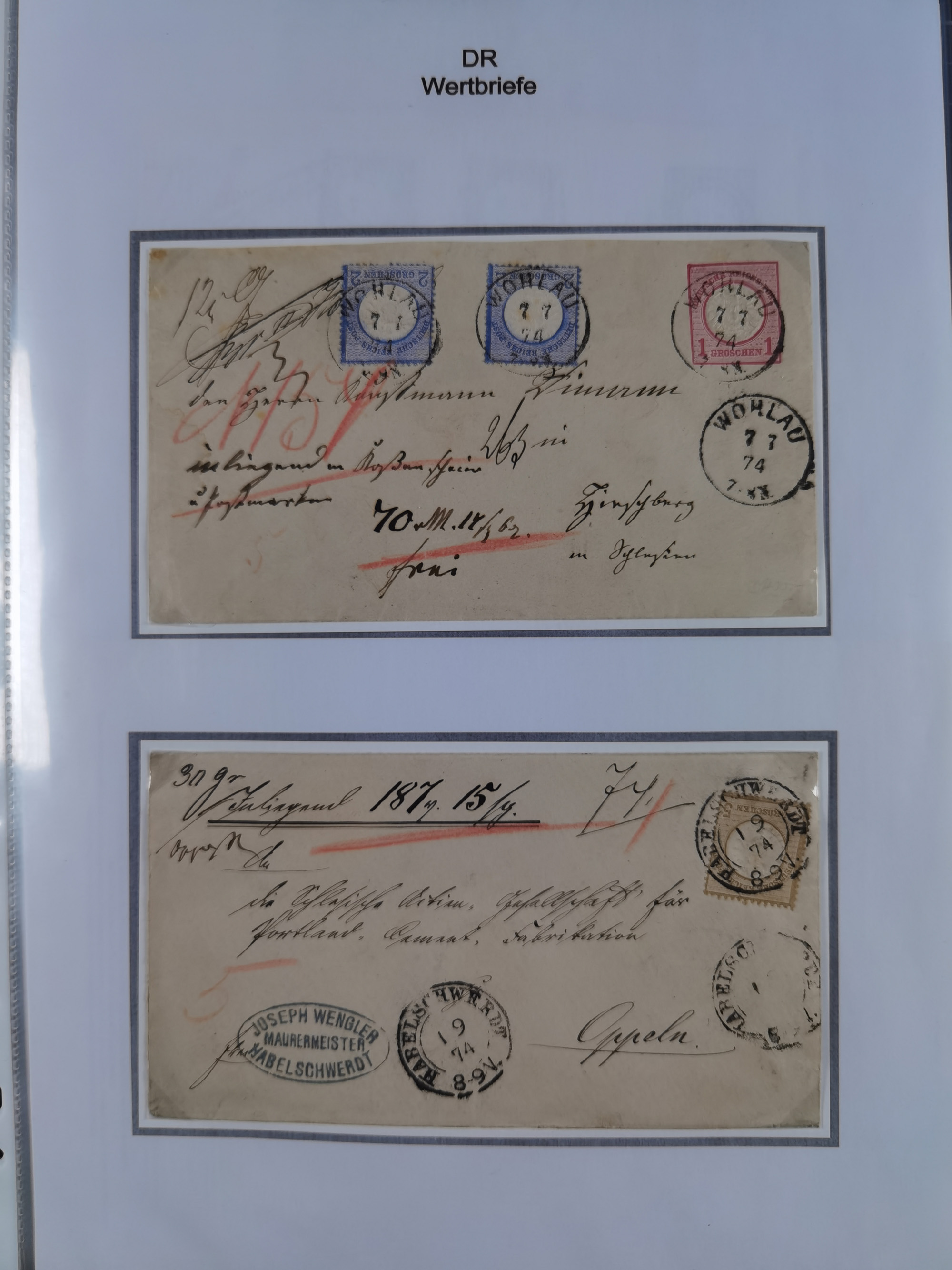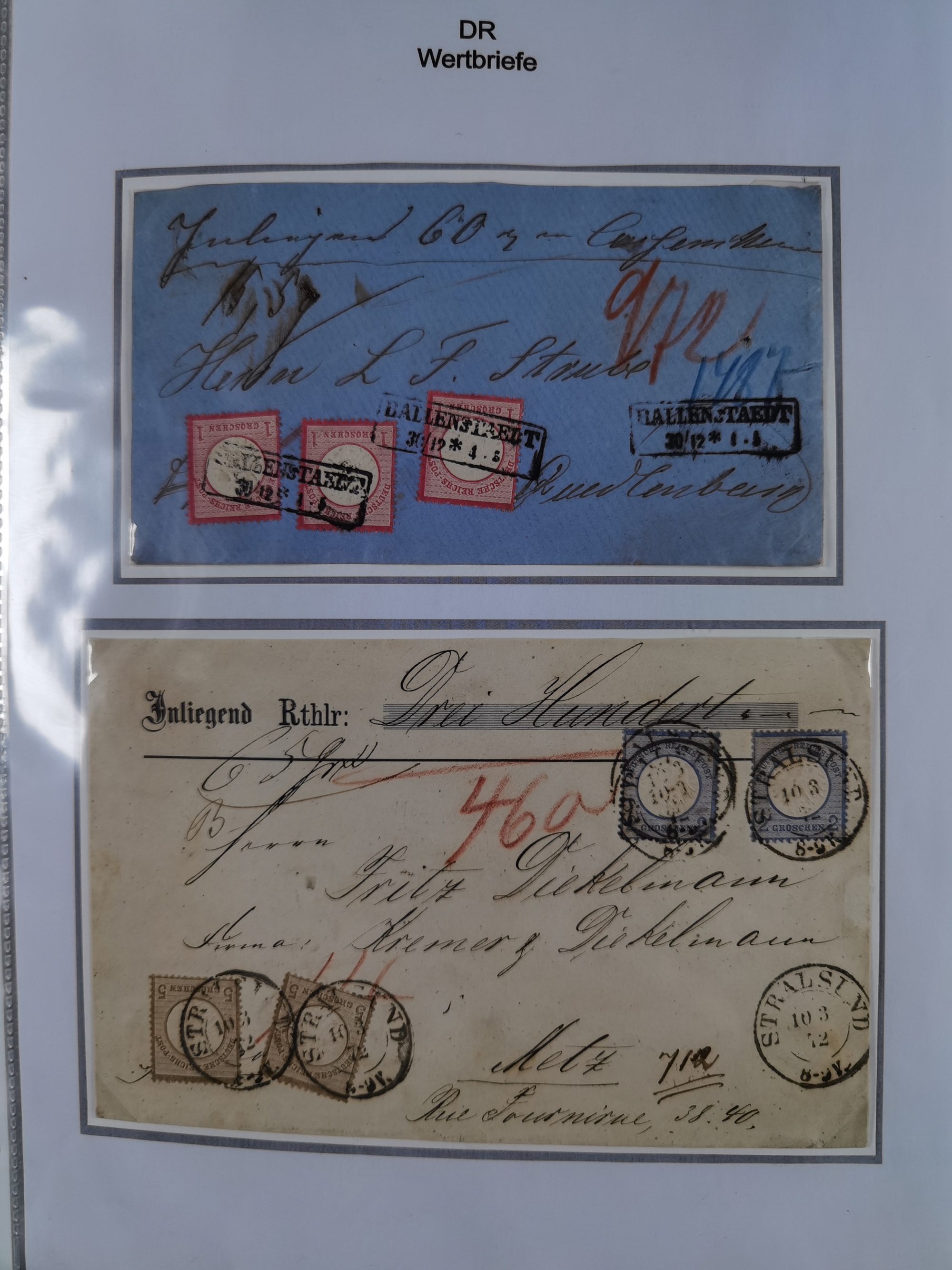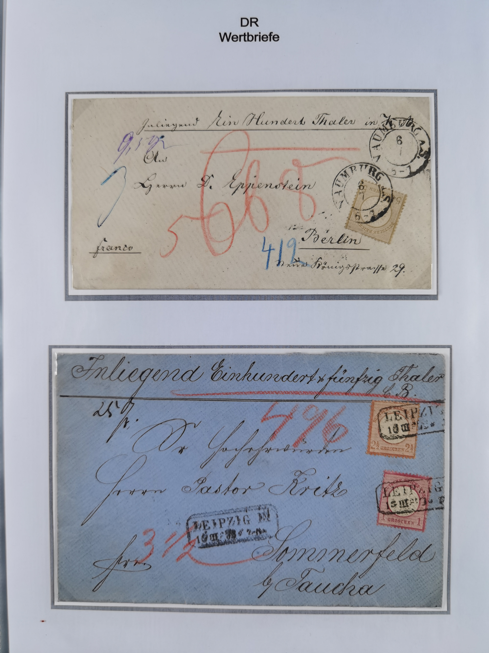 1872/74, Sammlung “Wertbriefe” mit 31 frankierten und zwei unfrankierten Wertbriefen. Dabei GSU mit Zufrankaturen, bessere Einzelfrankaturen, zwei Mehrfachfrankaturen Mi.-Nr. 29 und hohe Frankaturen bis 15½ Groschen. Meist in guter Erhaltung, sauber auf Albenblättern