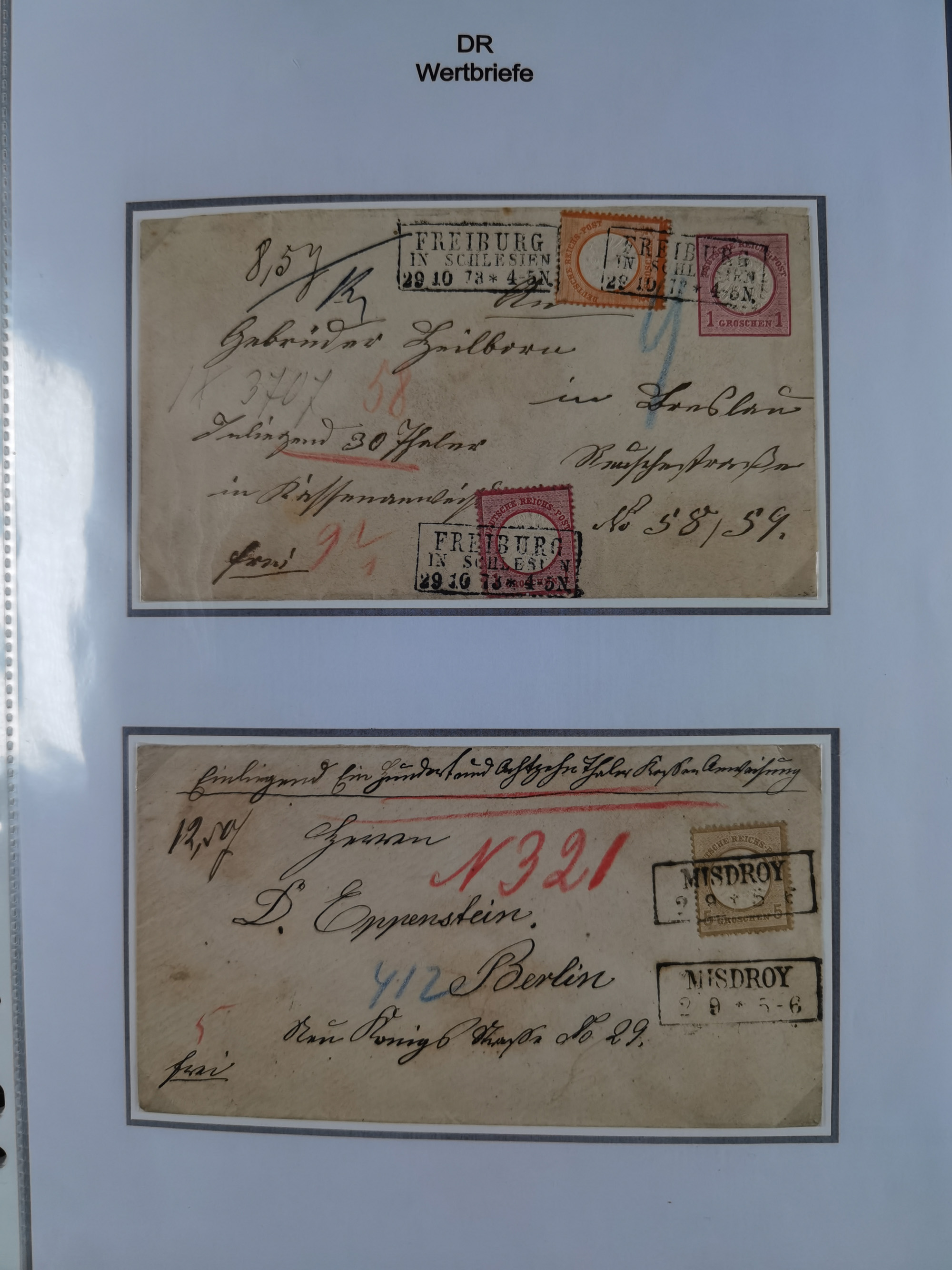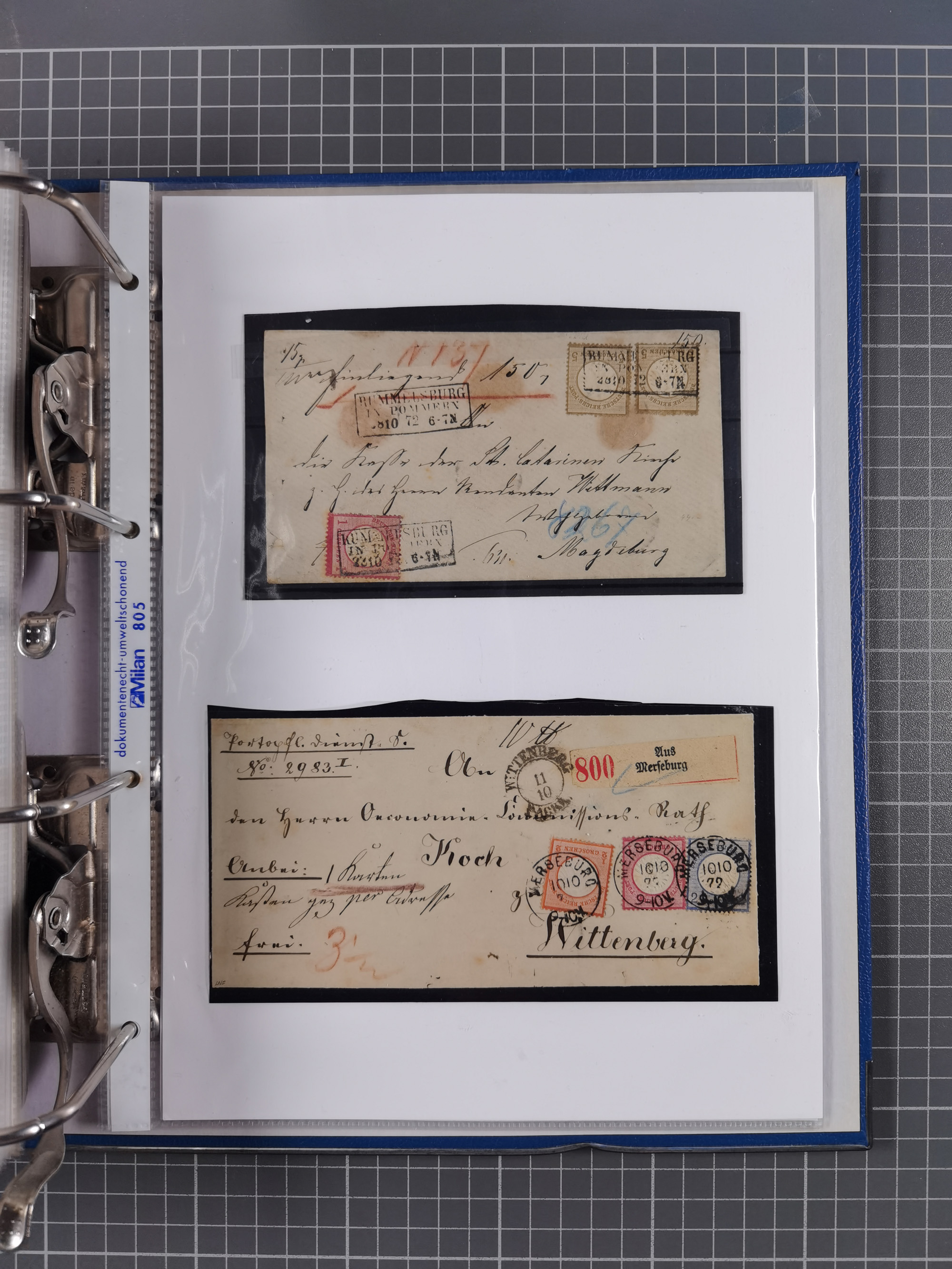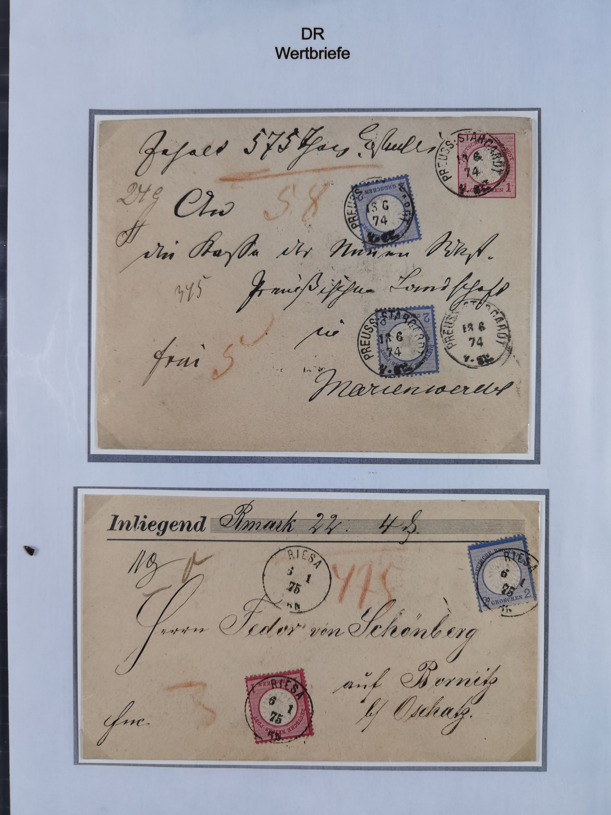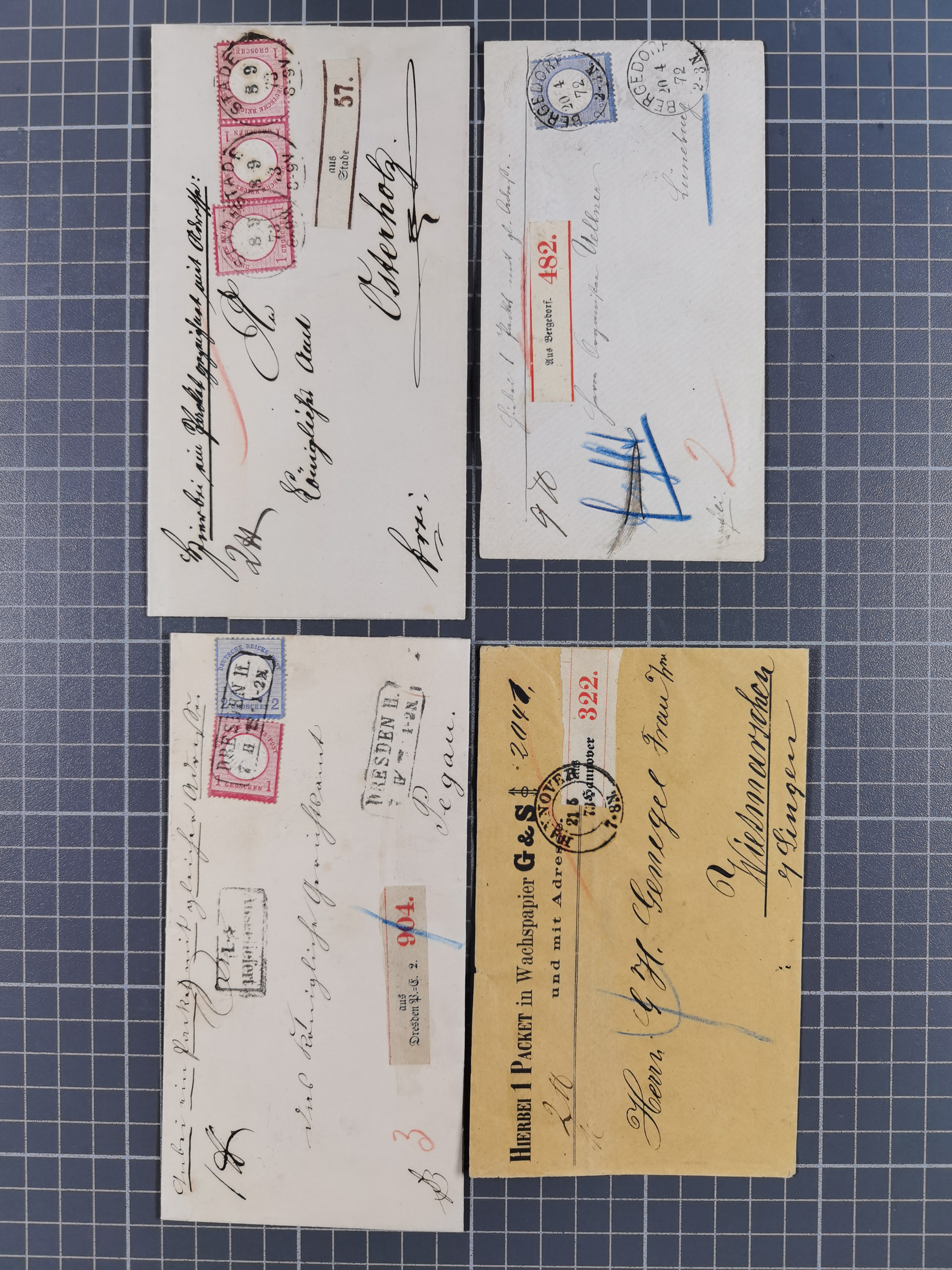 1872/74, Sammlung “Wertbriefe” mit 31 frankierten und zwei unfrankierten Wertbriefen. Dabei GSU mit Zufrankaturen, bessere Einzelfrankaturen, zwei Mehrfachfrankaturen Mi.-Nr. 29 und hohe Frankaturen bis 15½ Groschen. Meist in guter Erhaltung, sauber auf Albenblättern