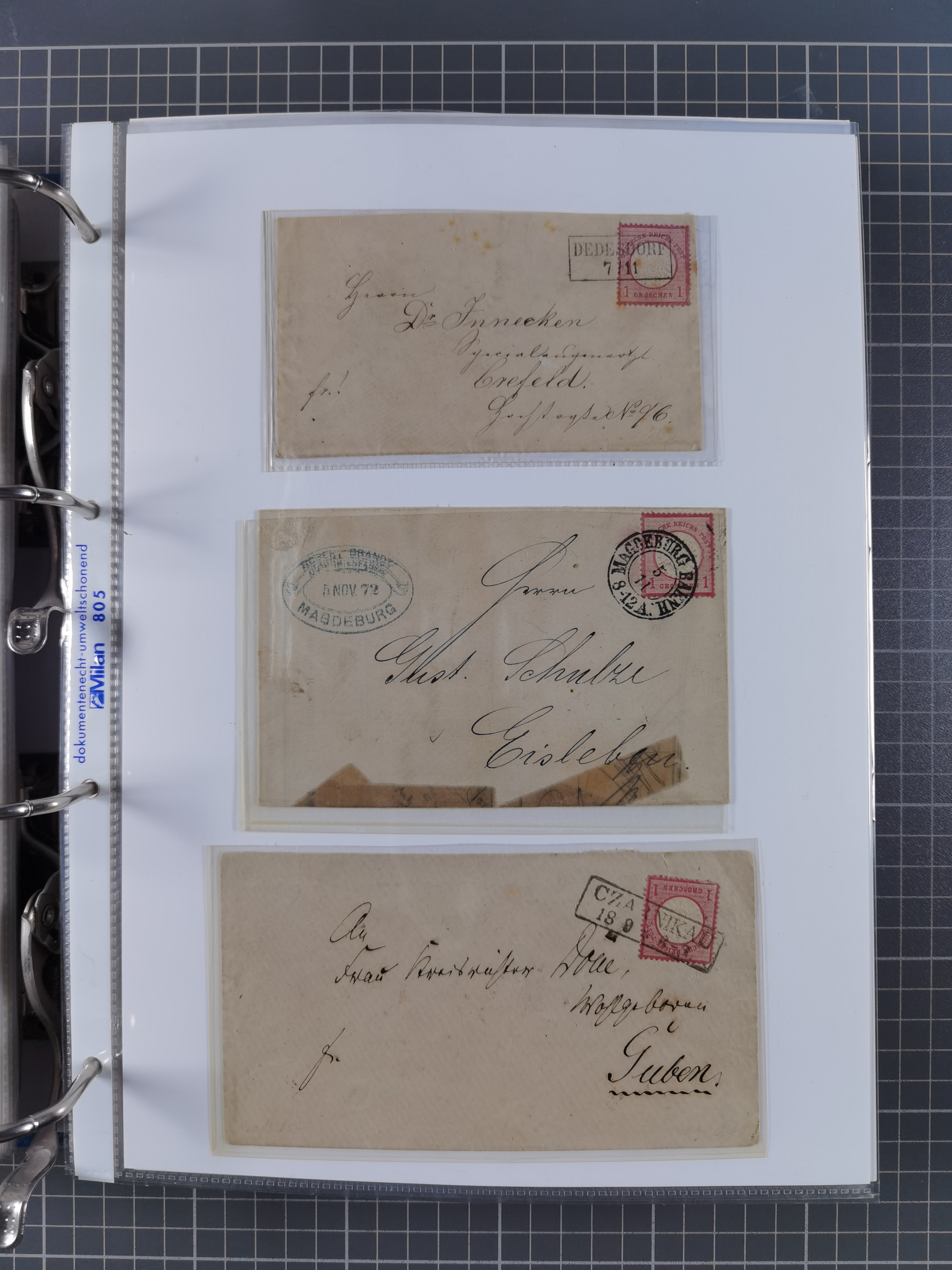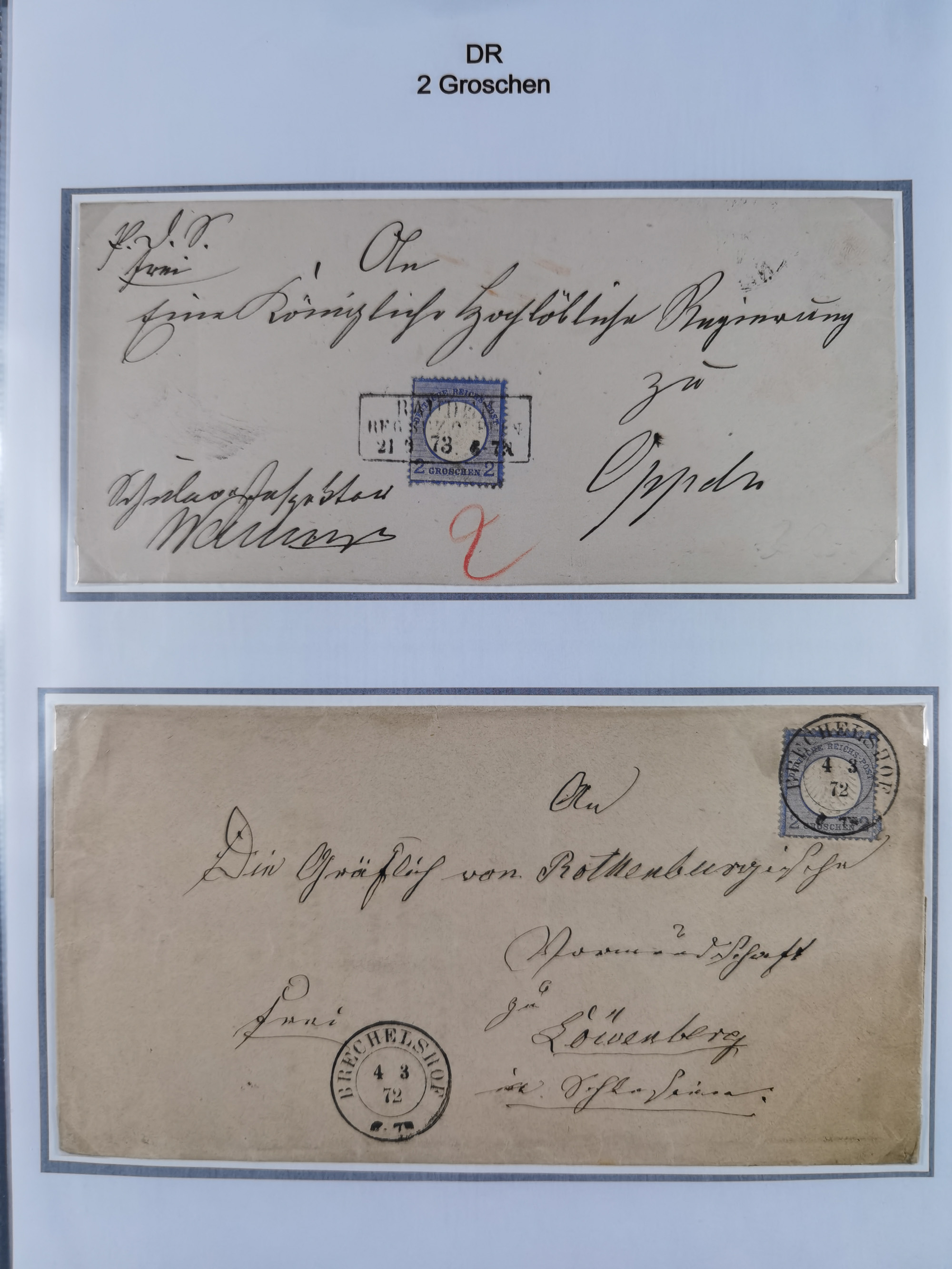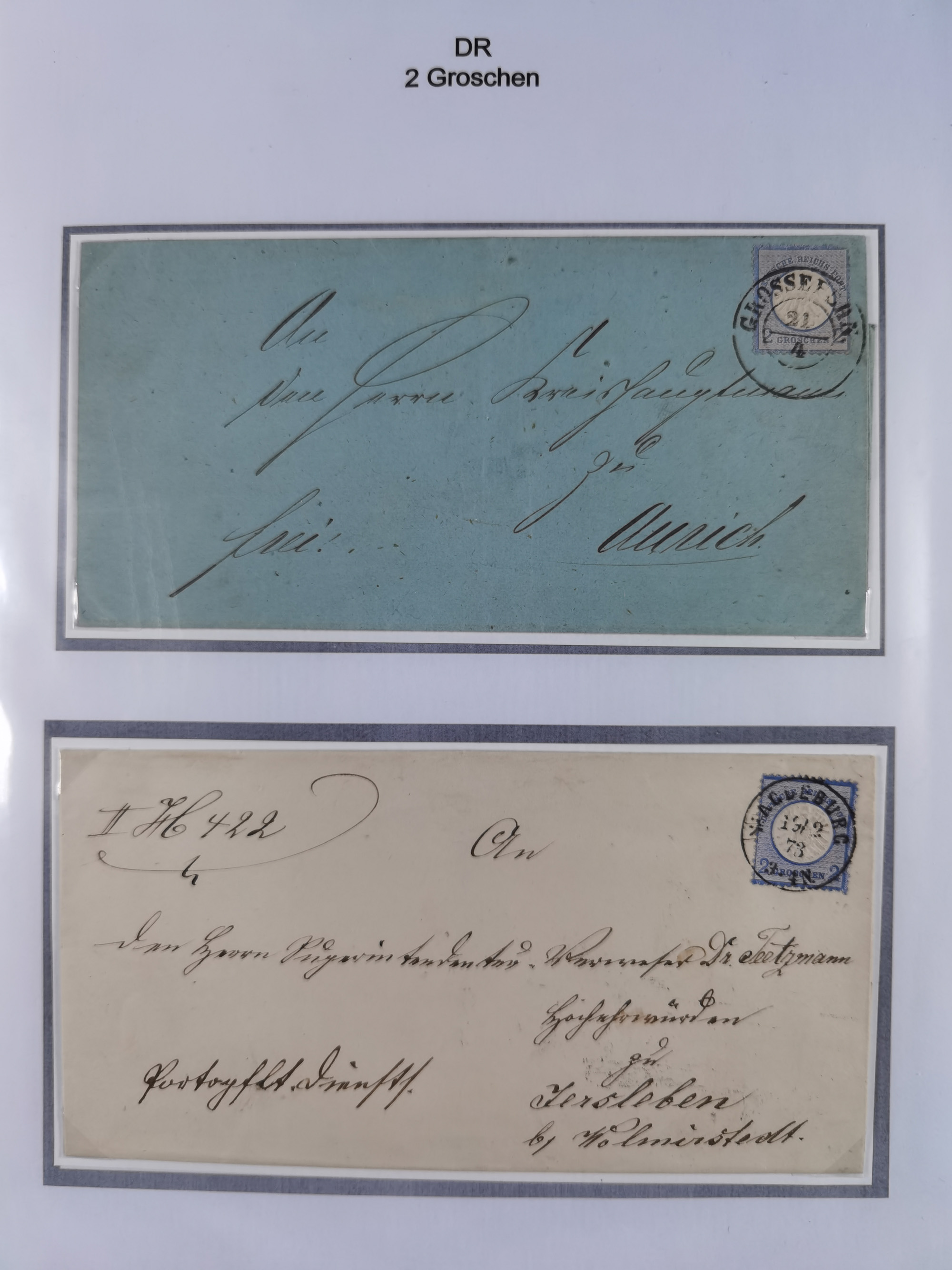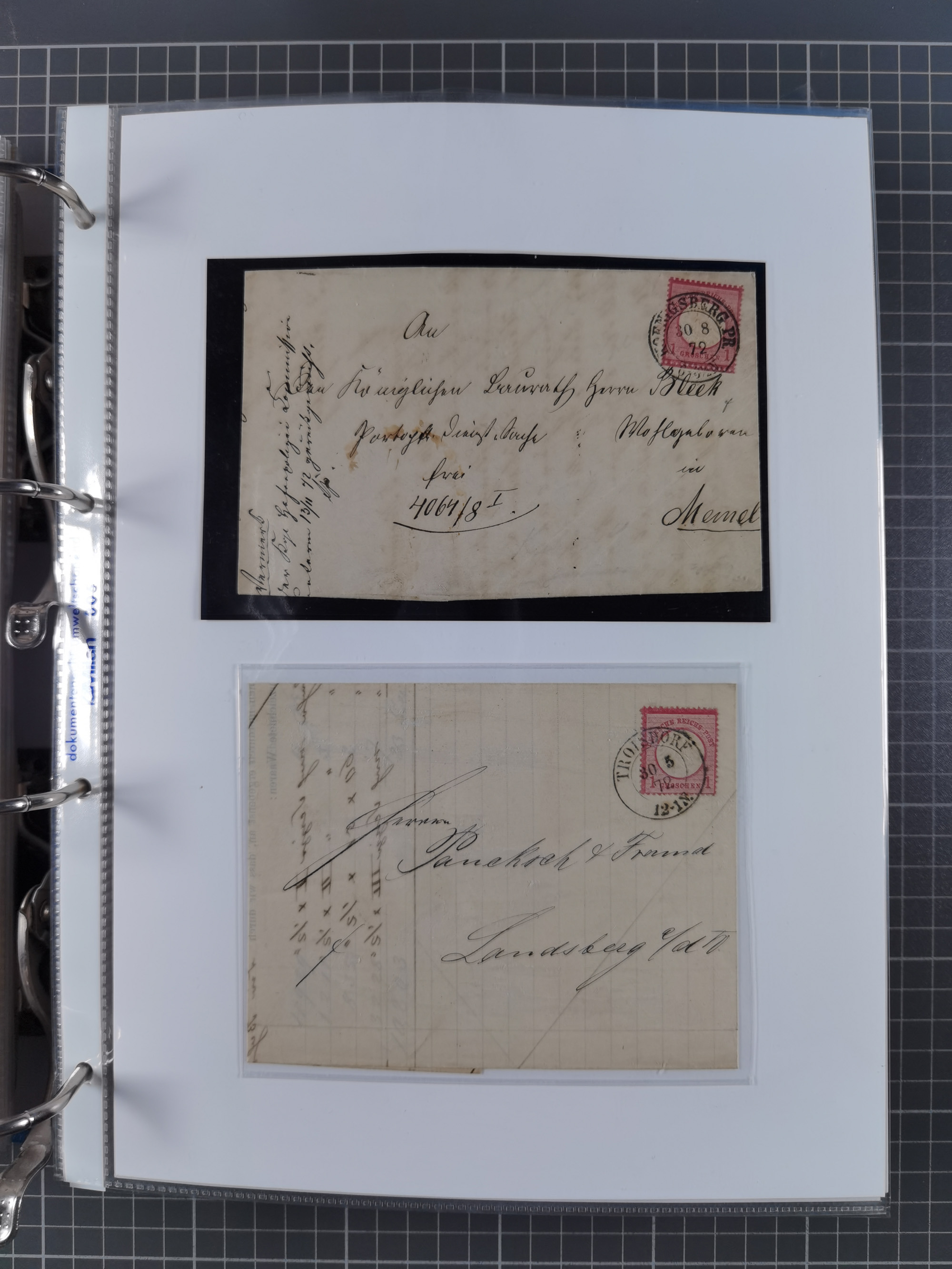 1872/74, Sammlung “Wertbriefe” mit 31 frankierten und zwei unfrankierten Wertbriefen. Dabei GSU mit Zufrankaturen, bessere Einzelfrankaturen, zwei Mehrfachfrankaturen Mi.-Nr. 29 und hohe Frankaturen bis 15½ Groschen. Meist in guter Erhaltung, sauber auf Albenblättern