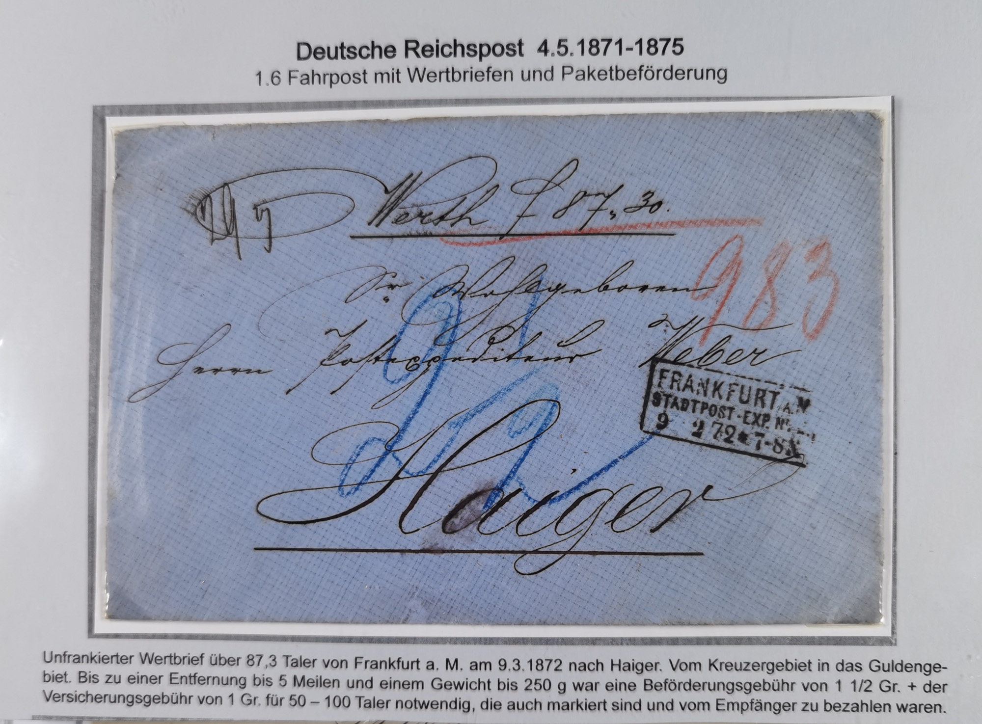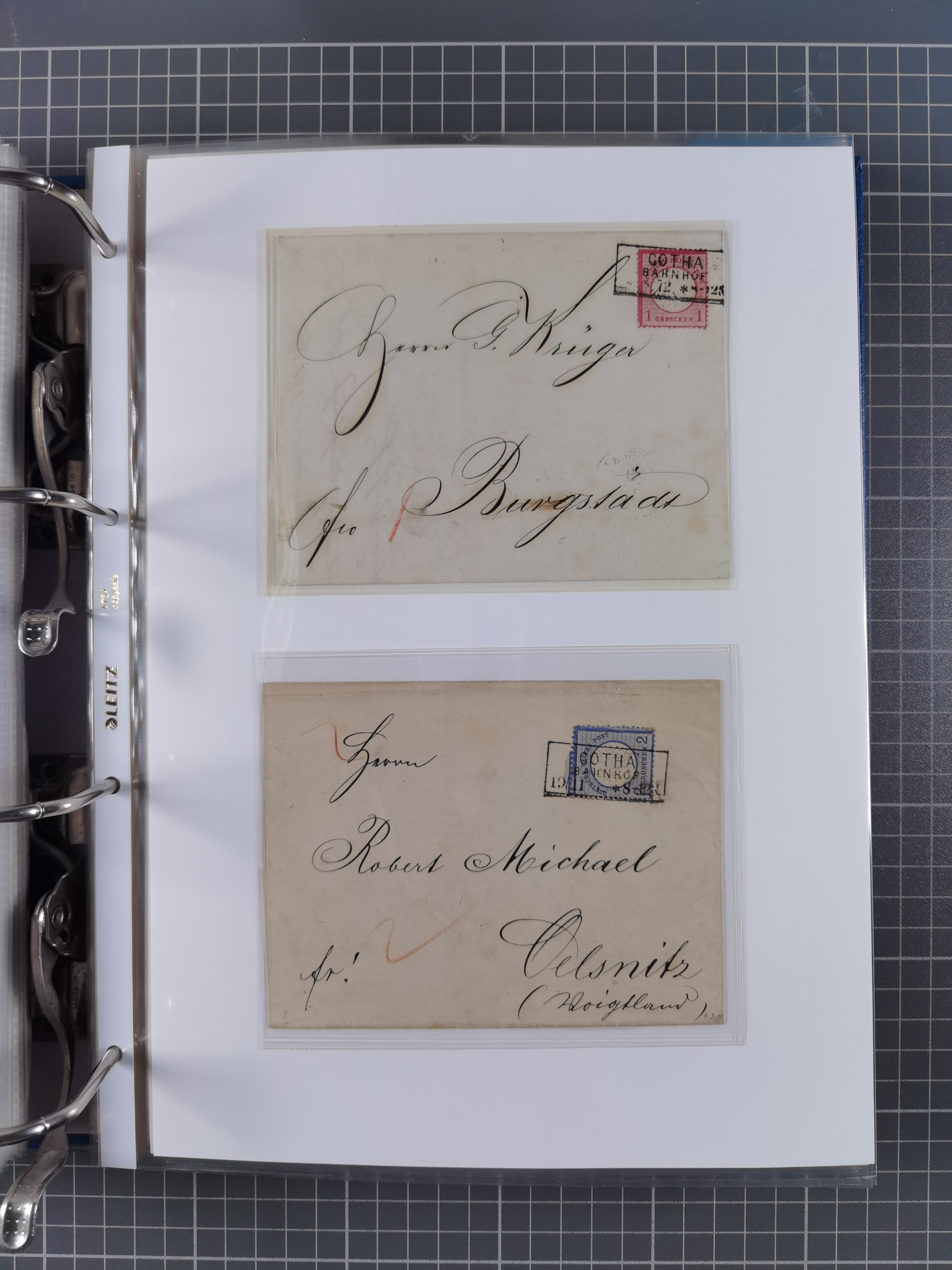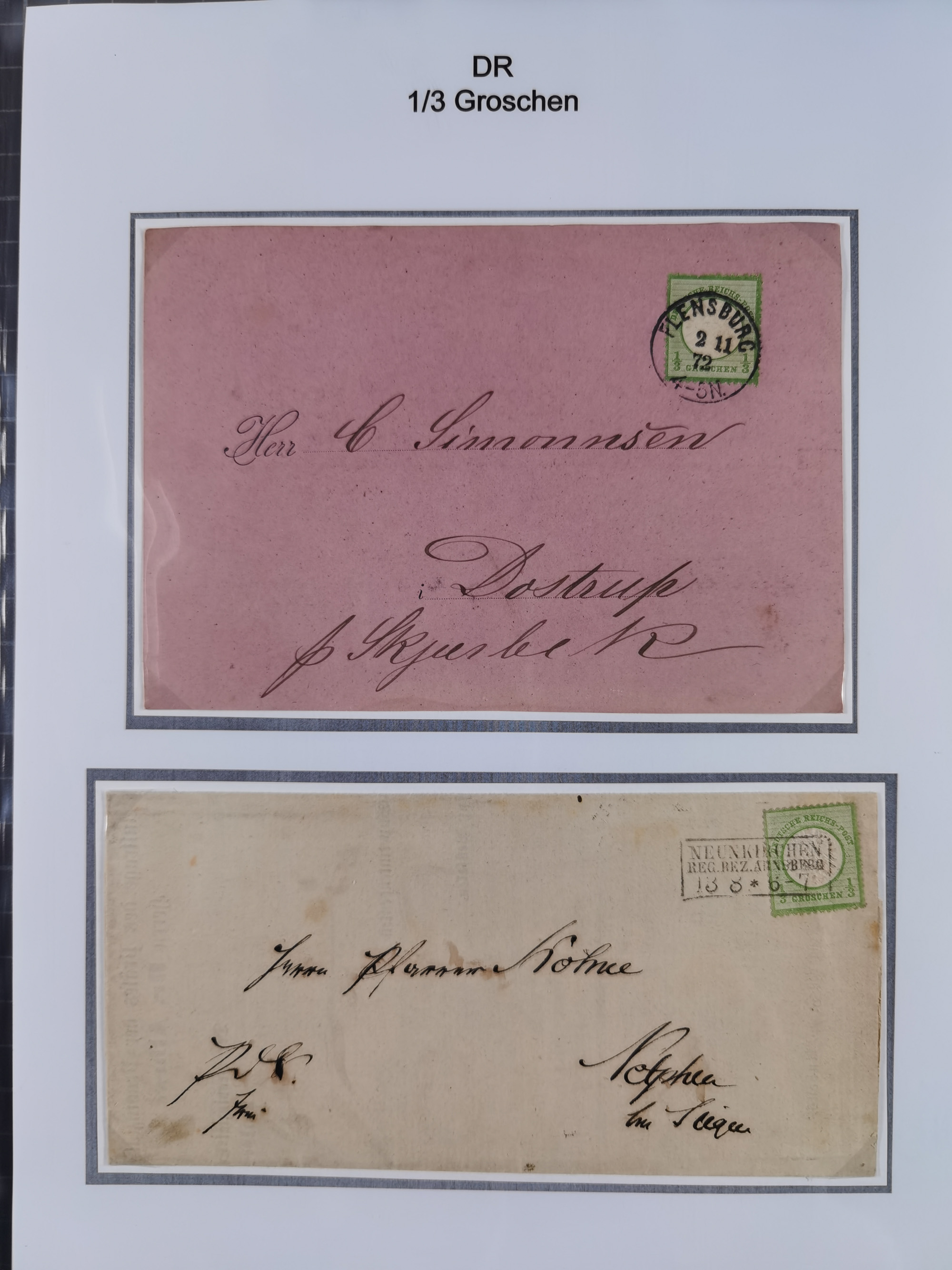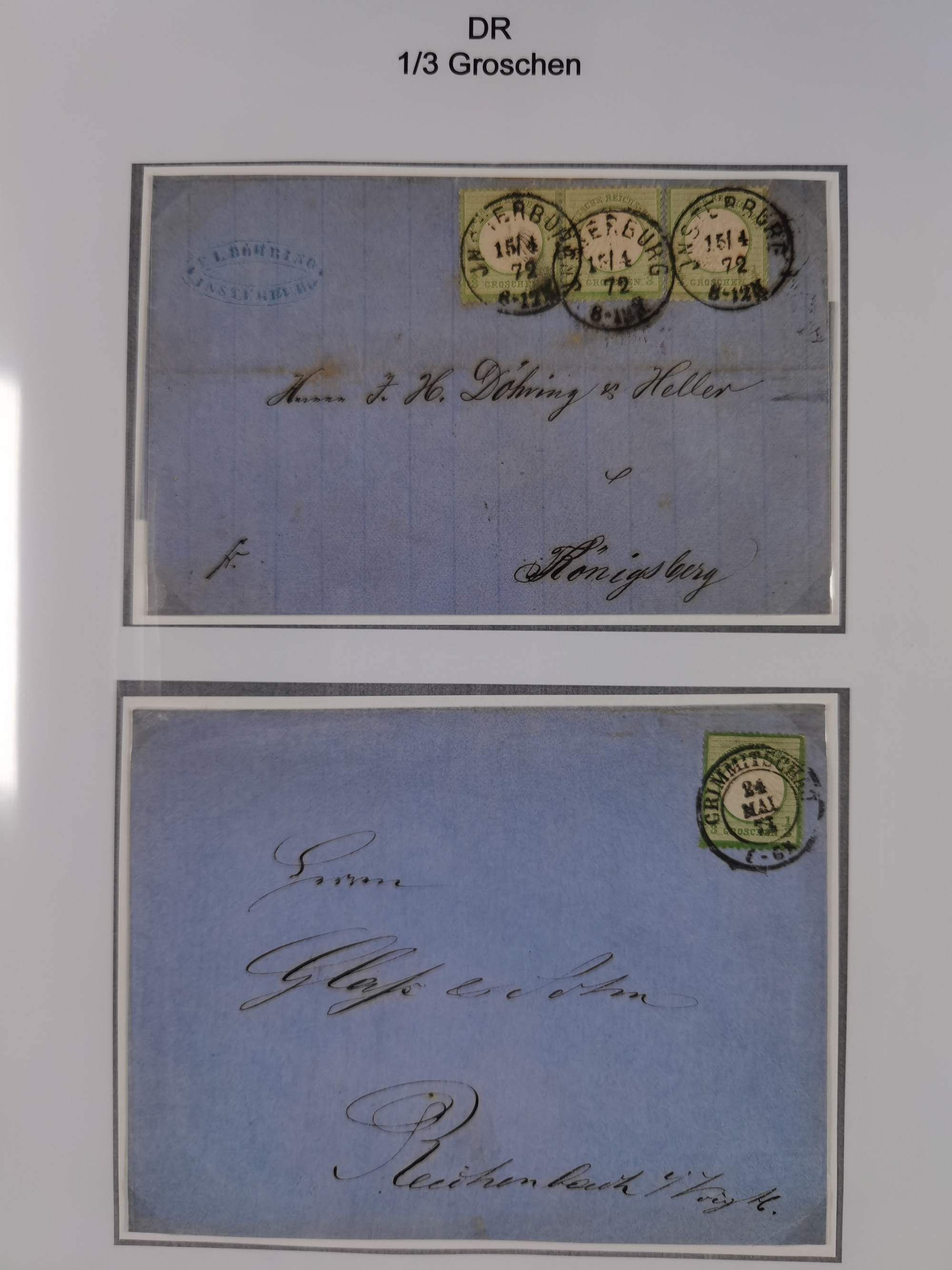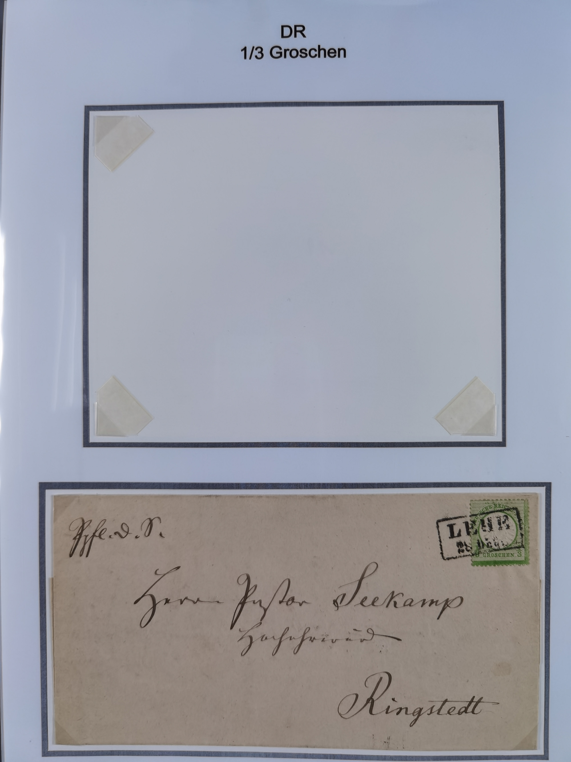 1872/74, Sammlung “Wertbriefe” mit 31 frankierten und zwei unfrankierten Wertbriefen. Dabei GSU mit Zufrankaturen, bessere Einzelfrankaturen, zwei Mehrfachfrankaturen Mi.-Nr. 29 und hohe Frankaturen bis 15½ Groschen. Meist in guter Erhaltung, sauber auf Albenblättern