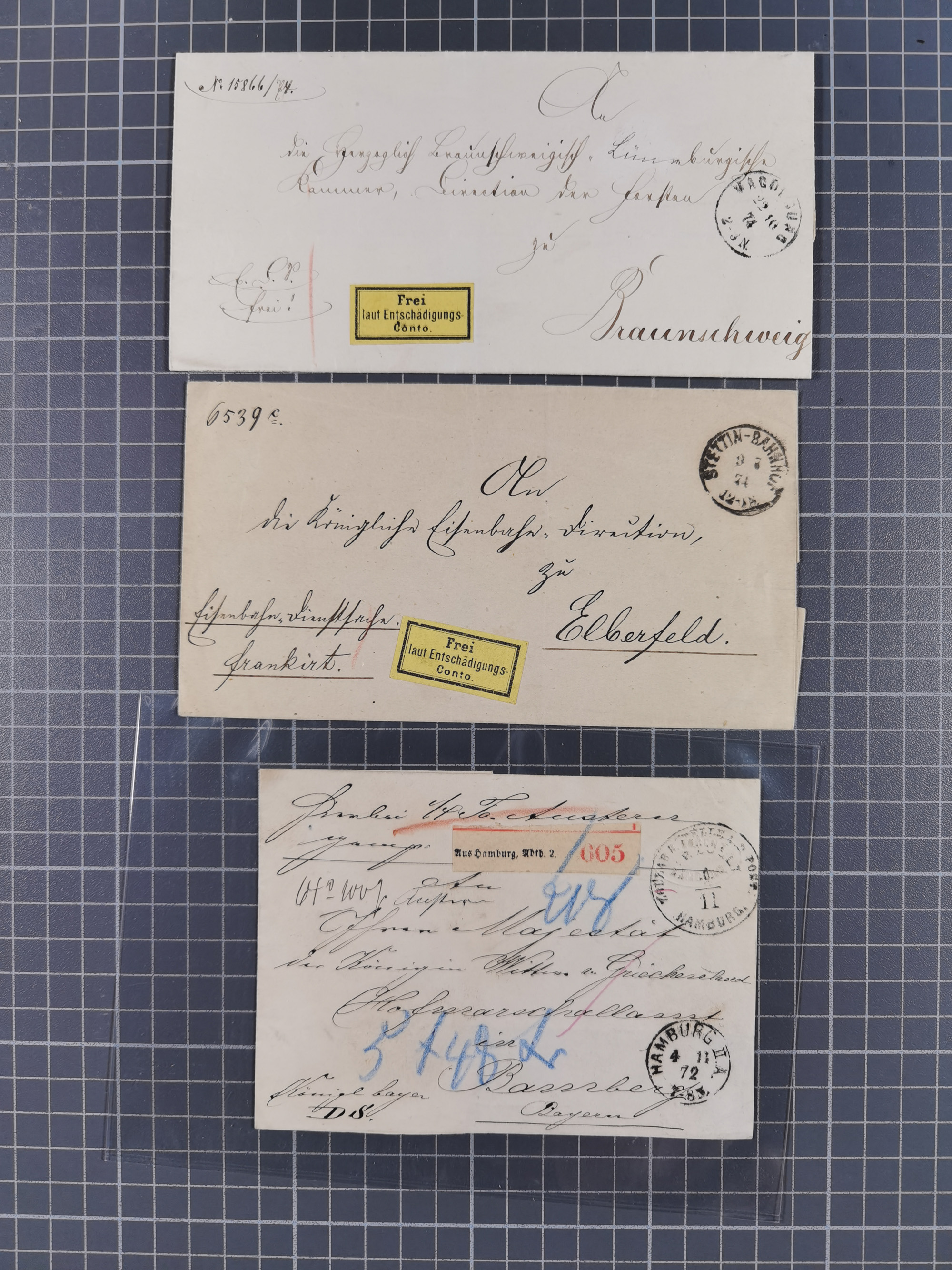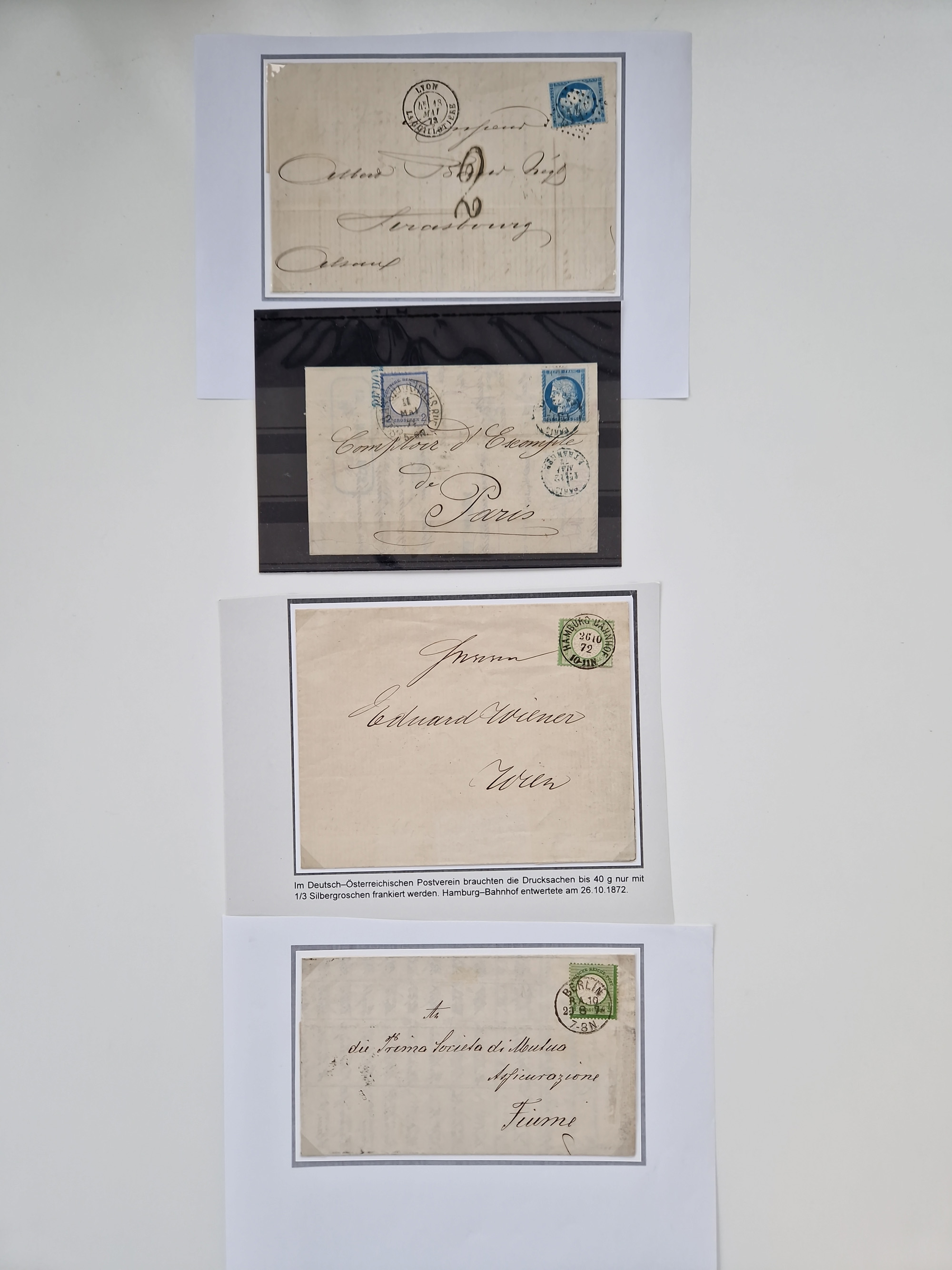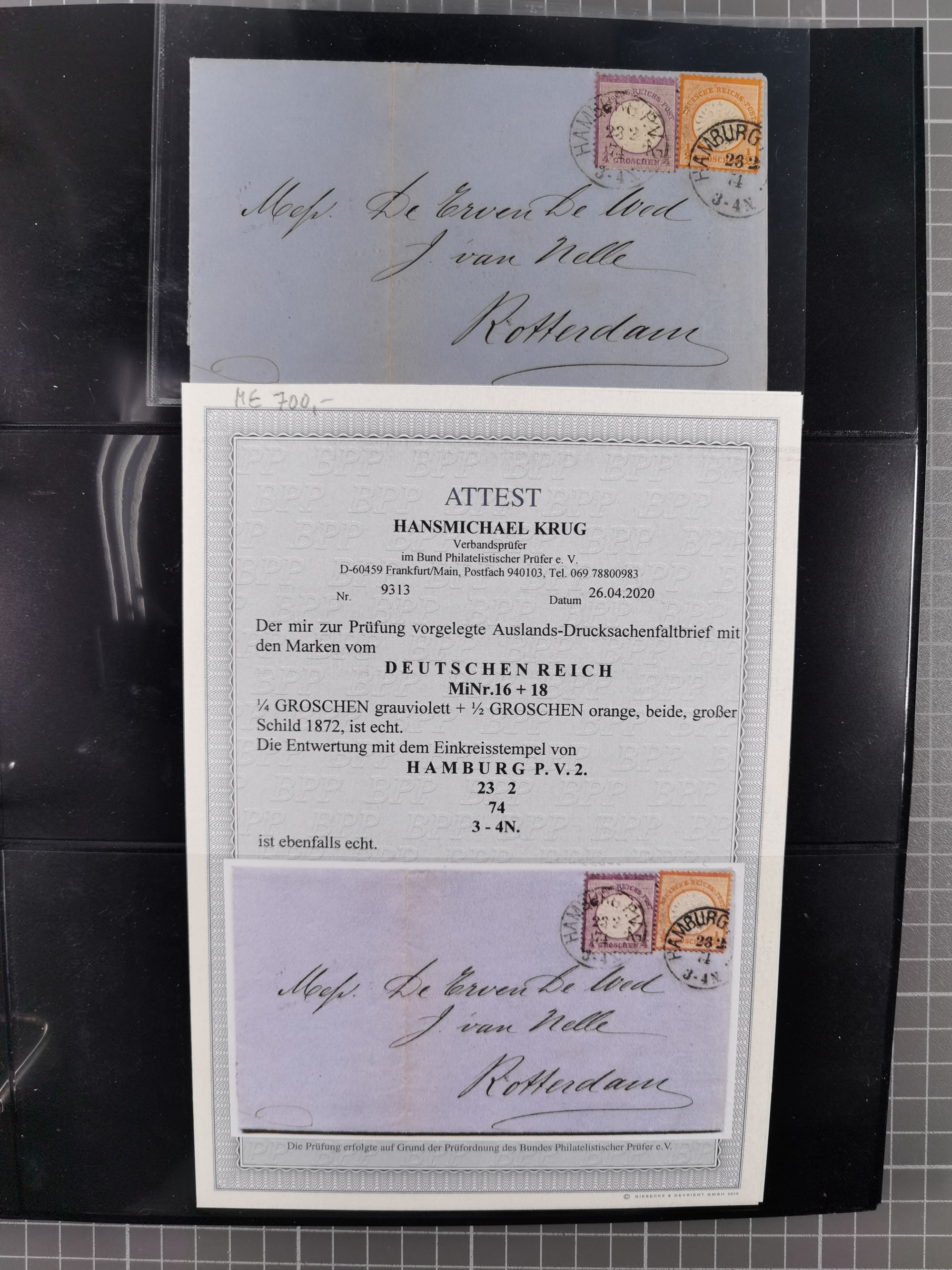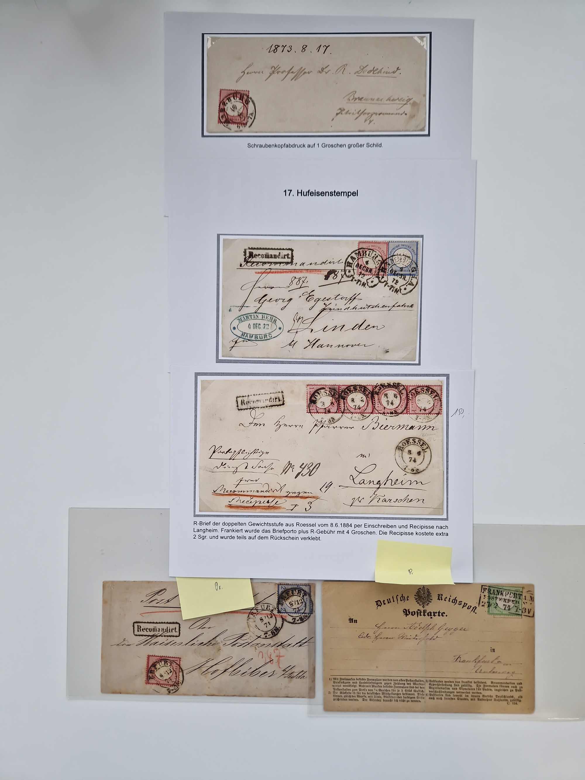 1872/74 (ca.), 16 frankierte Briefe/KarteGanzsache, dabei Auslandsbriefe, 'Muster ohne Wert', GAA, etc. 6 Atteste/Befund. Dazu ein unfrankierter Brief 1856 von Flensburg nach Bergedorf.