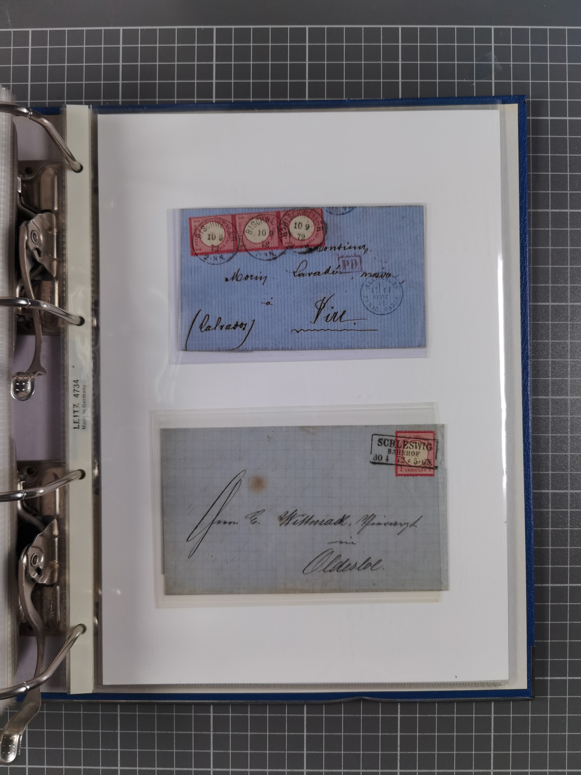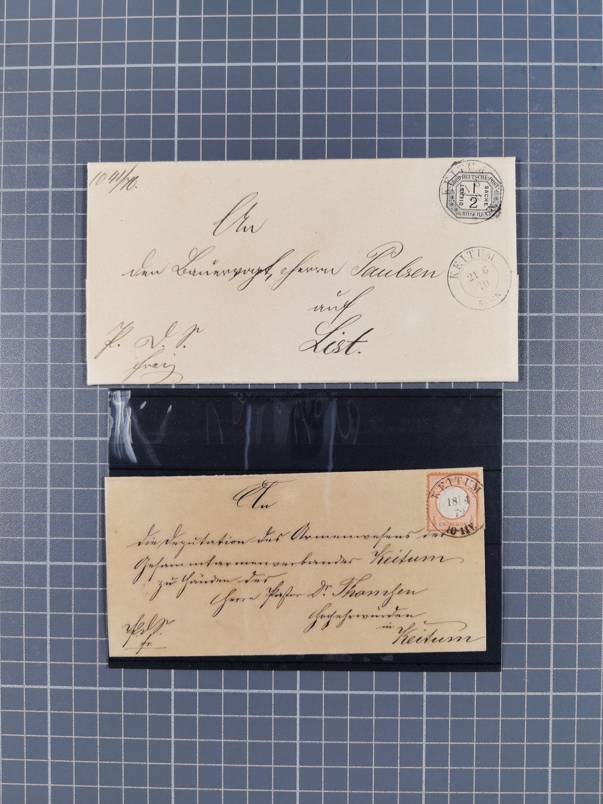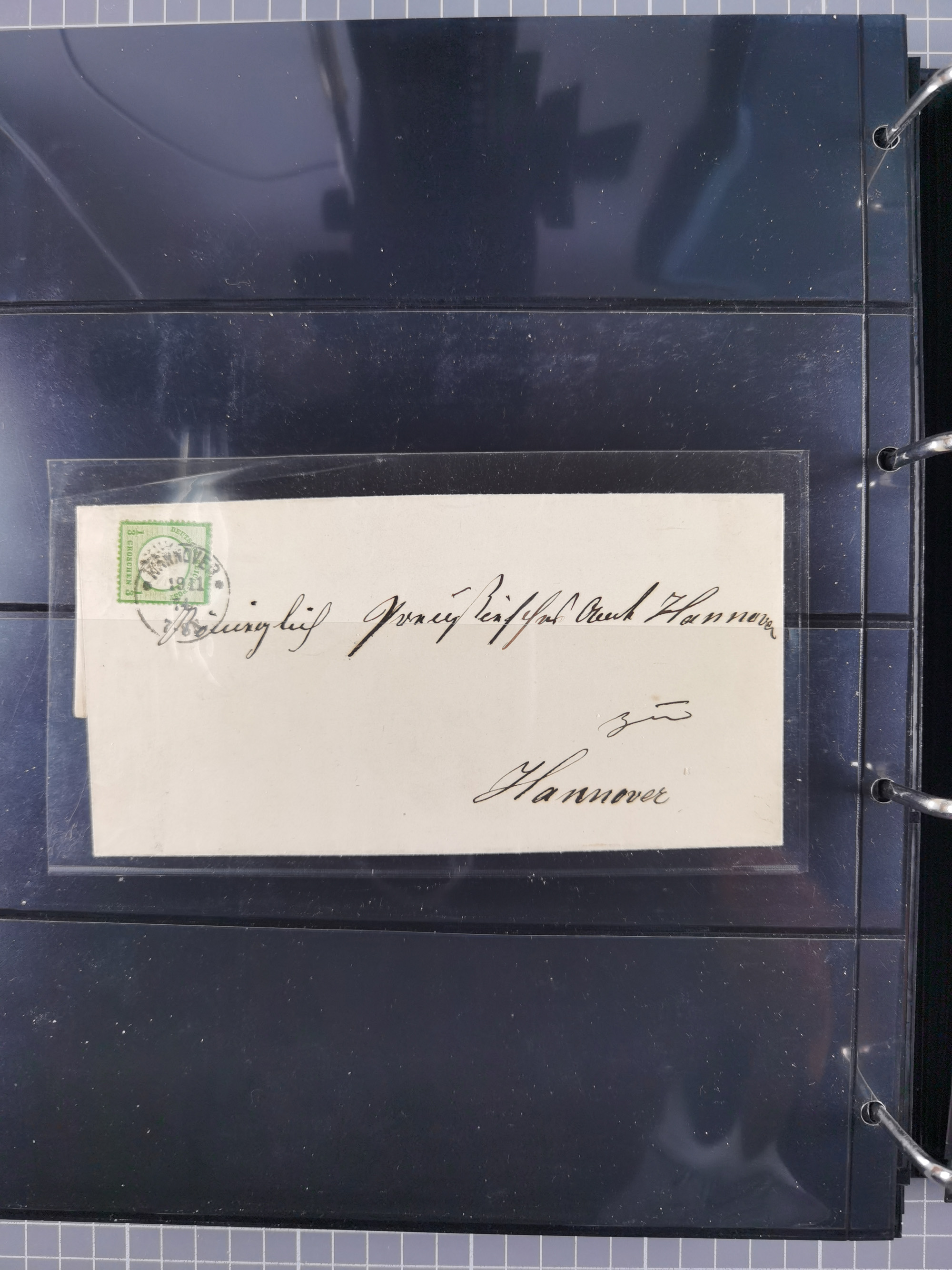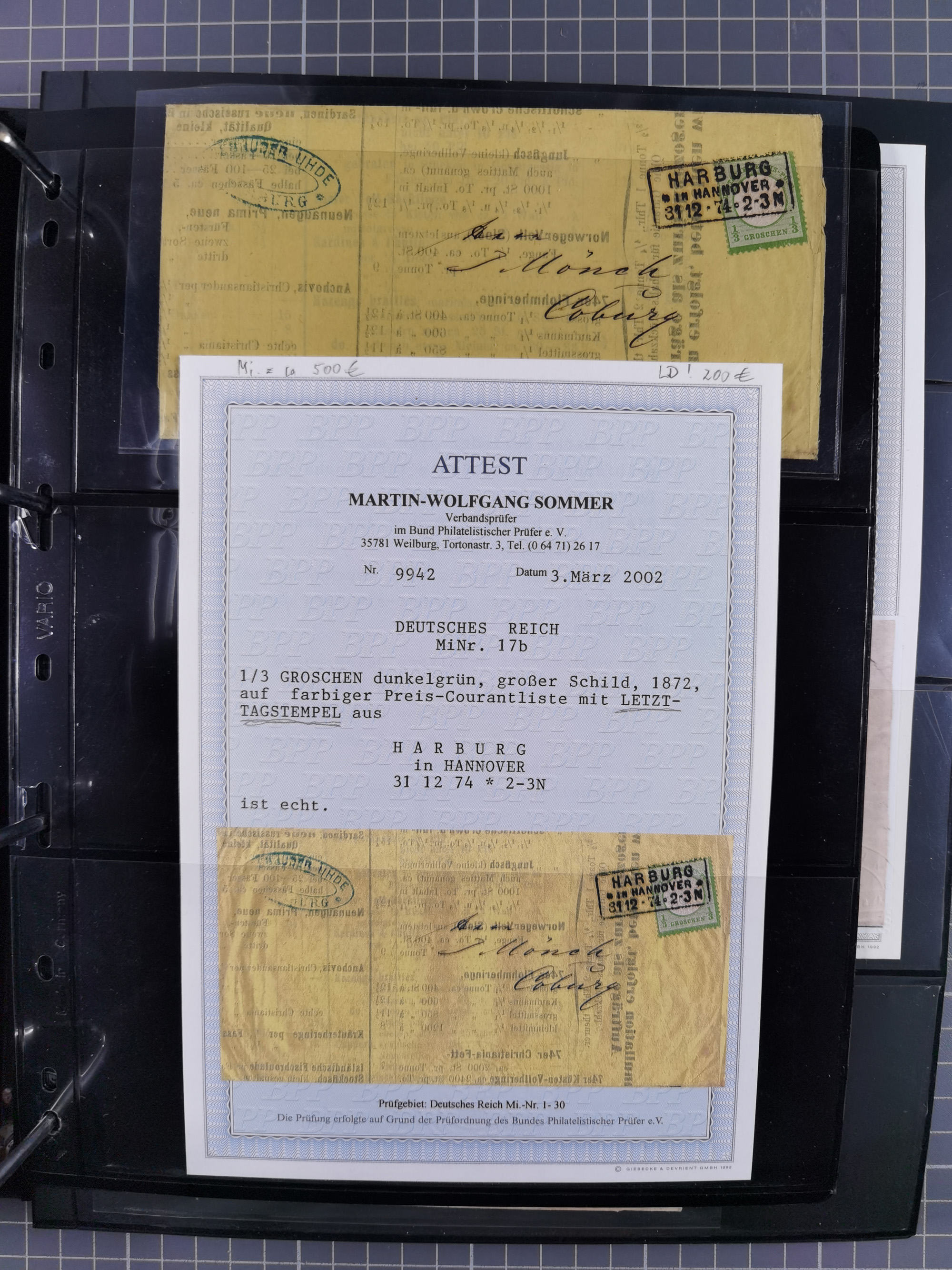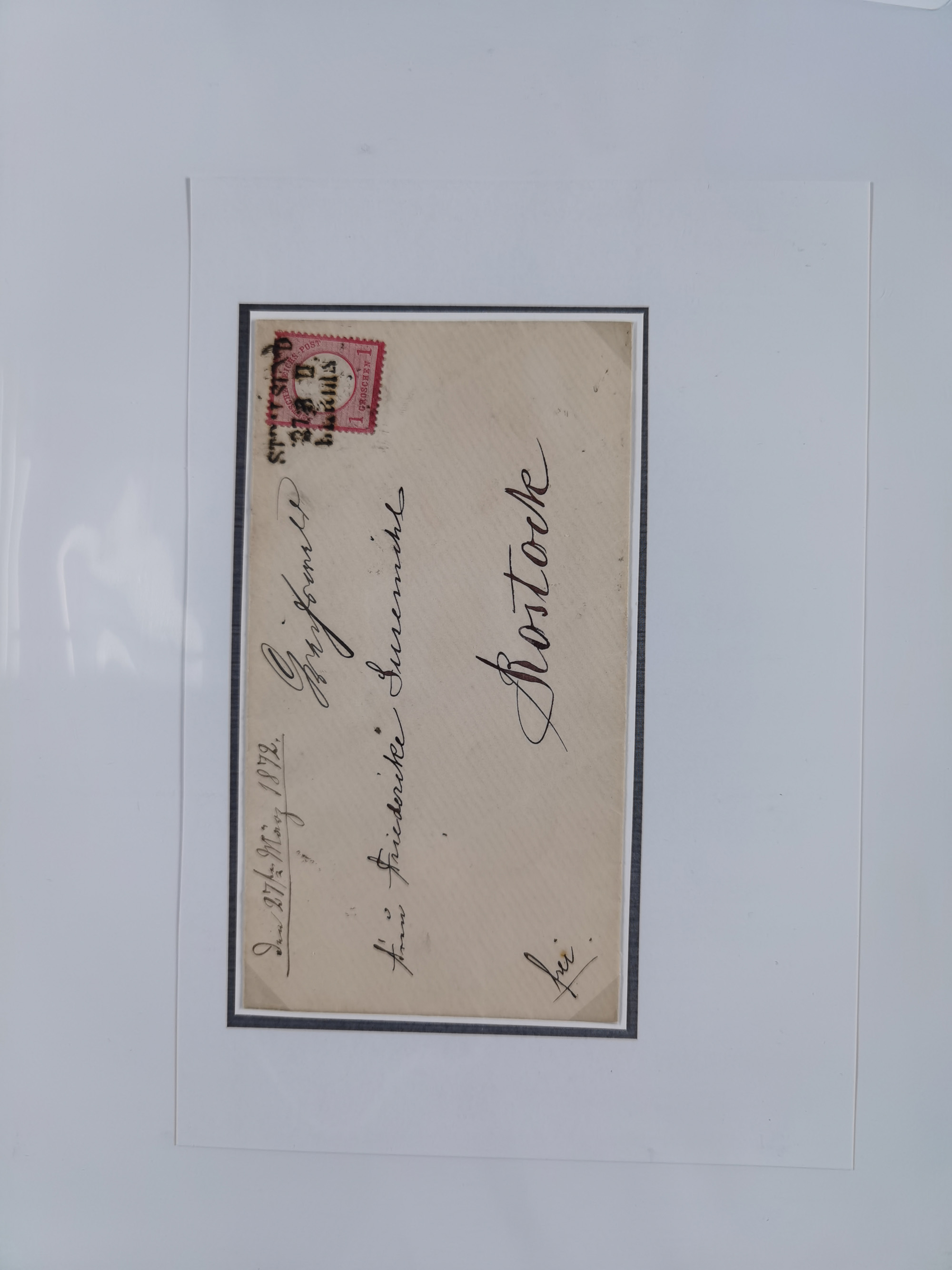 1872/74 (ca.), 16 frankierte Briefe/KarteGanzsache, dabei Auslandsbriefe, 'Muster ohne Wert', GAA, etc. 6 Atteste/Befund. Dazu ein unfrankierter Brief 1856 von Flensburg nach Bergedorf.