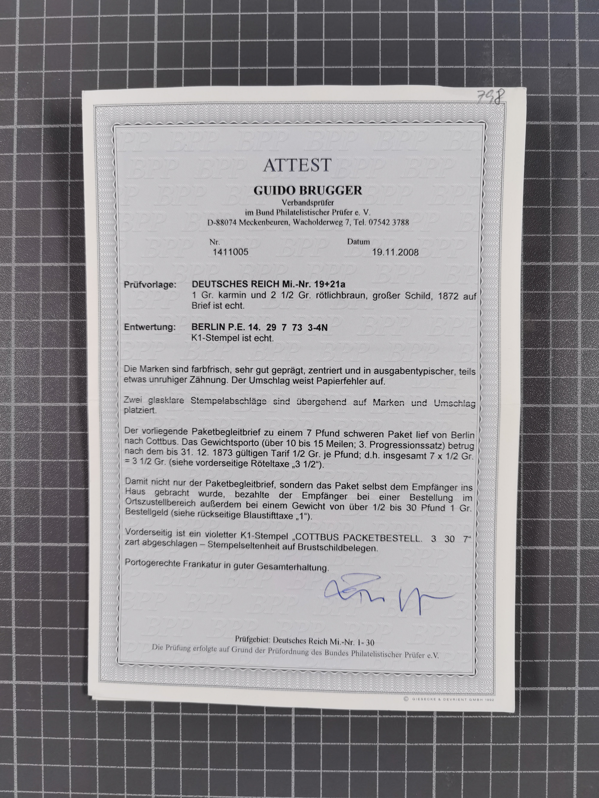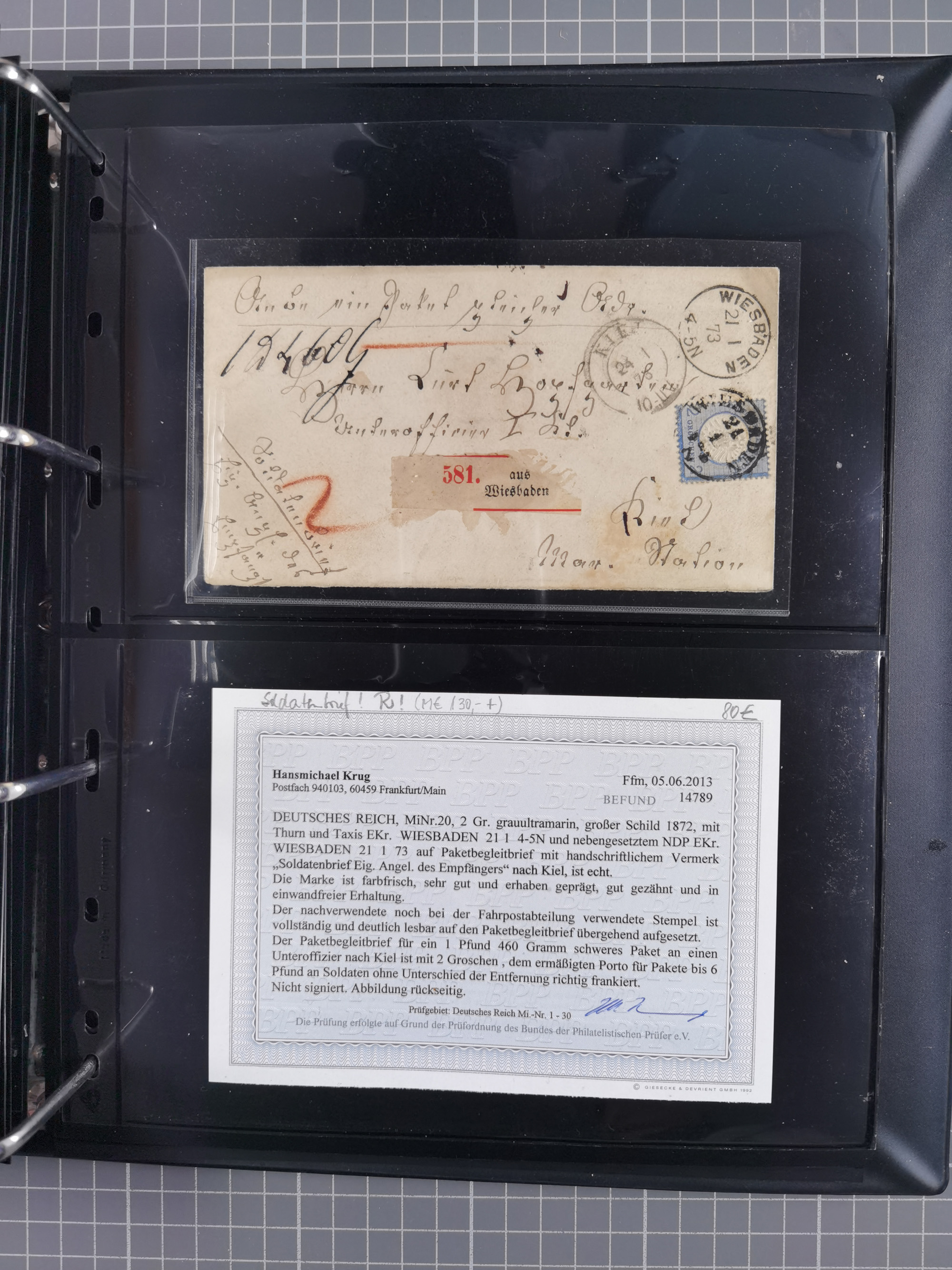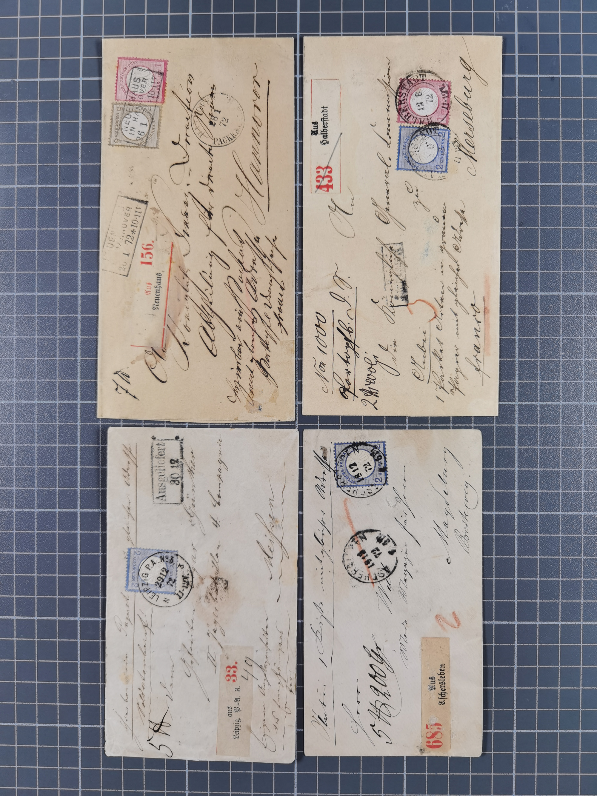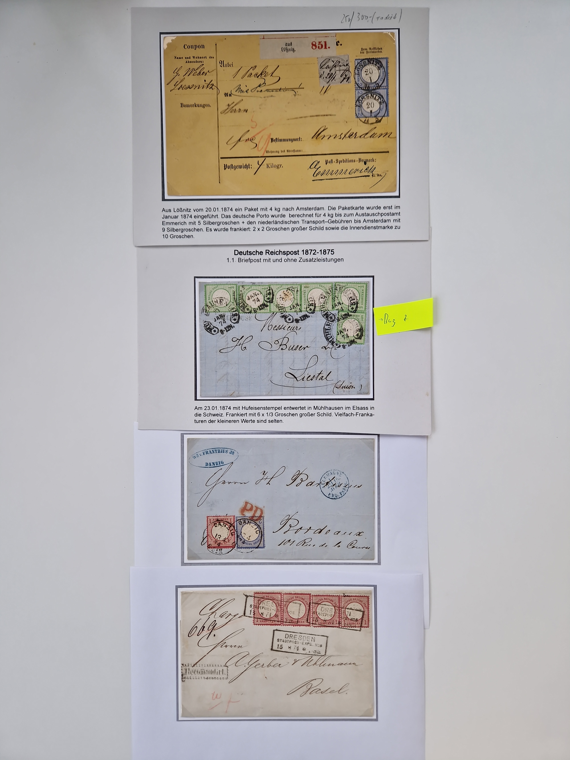 1872/74, interessante Sammlung mit ca. 100 Briefen und Karten sowie zwei Briefstücken mit meist klaren Stempeln, dabei Einzel- und Mehrfachfrankaturen, R-Briefe, Brief mit Mi.-Nr. 19PF XII (FB Krug BPP), Destinationen mit u.a. Frankreich, Italien,. Schweden und USA (Paketbegleit-Briefkuvert mit Mi.-Nr. 20 (2)+6x 22), Paketbegleitbriefe mit u.a. Mi.-Nr. 12+18,19 bzw. Mi.-Nr. 21a (5) + 22 und weiteren Besonderheiten. Wenige Belege sind etwas fehlerhaft, meist in guter Erhaltung, zum Teil signiert bzw. mit Fotobefunden