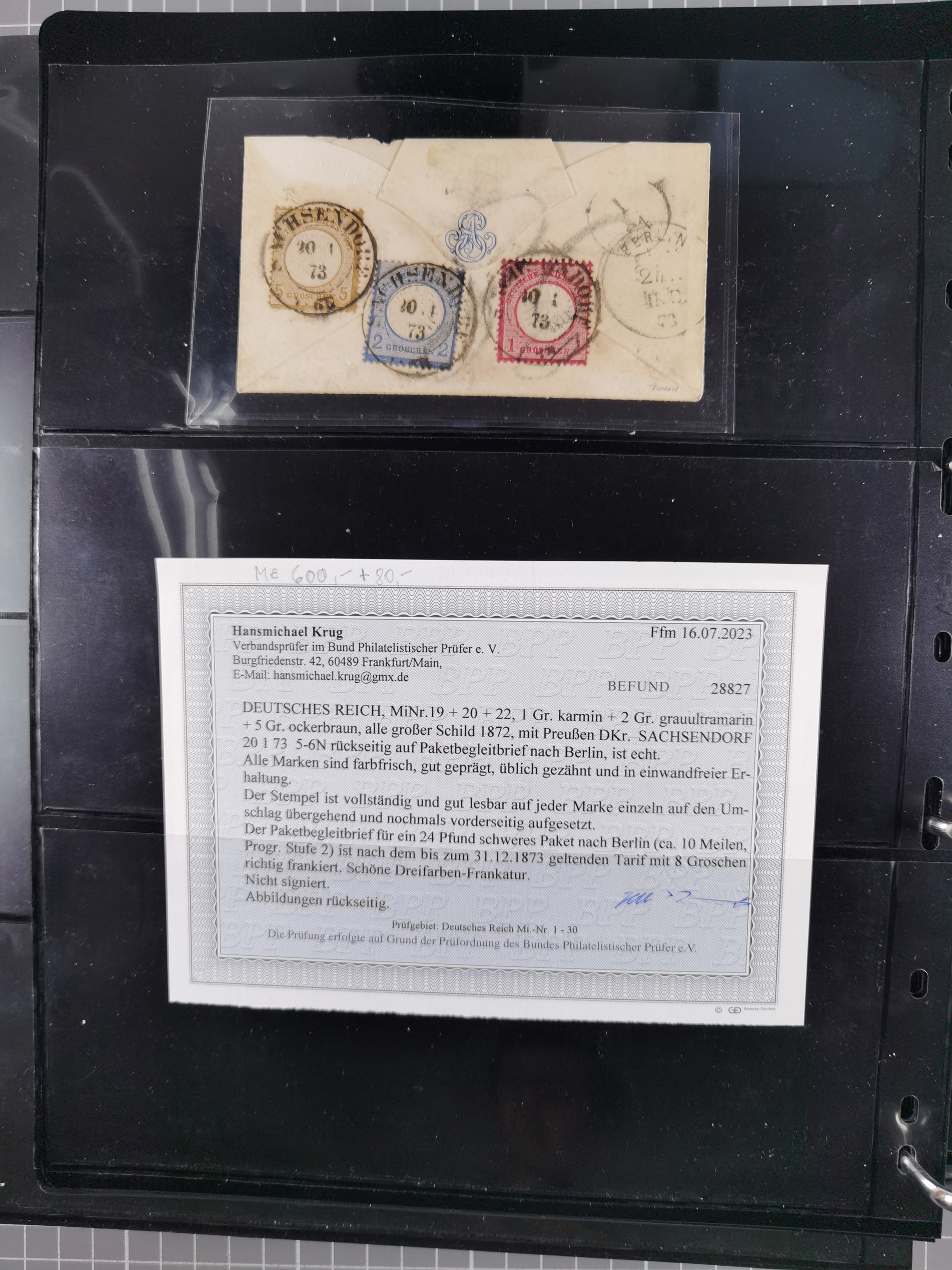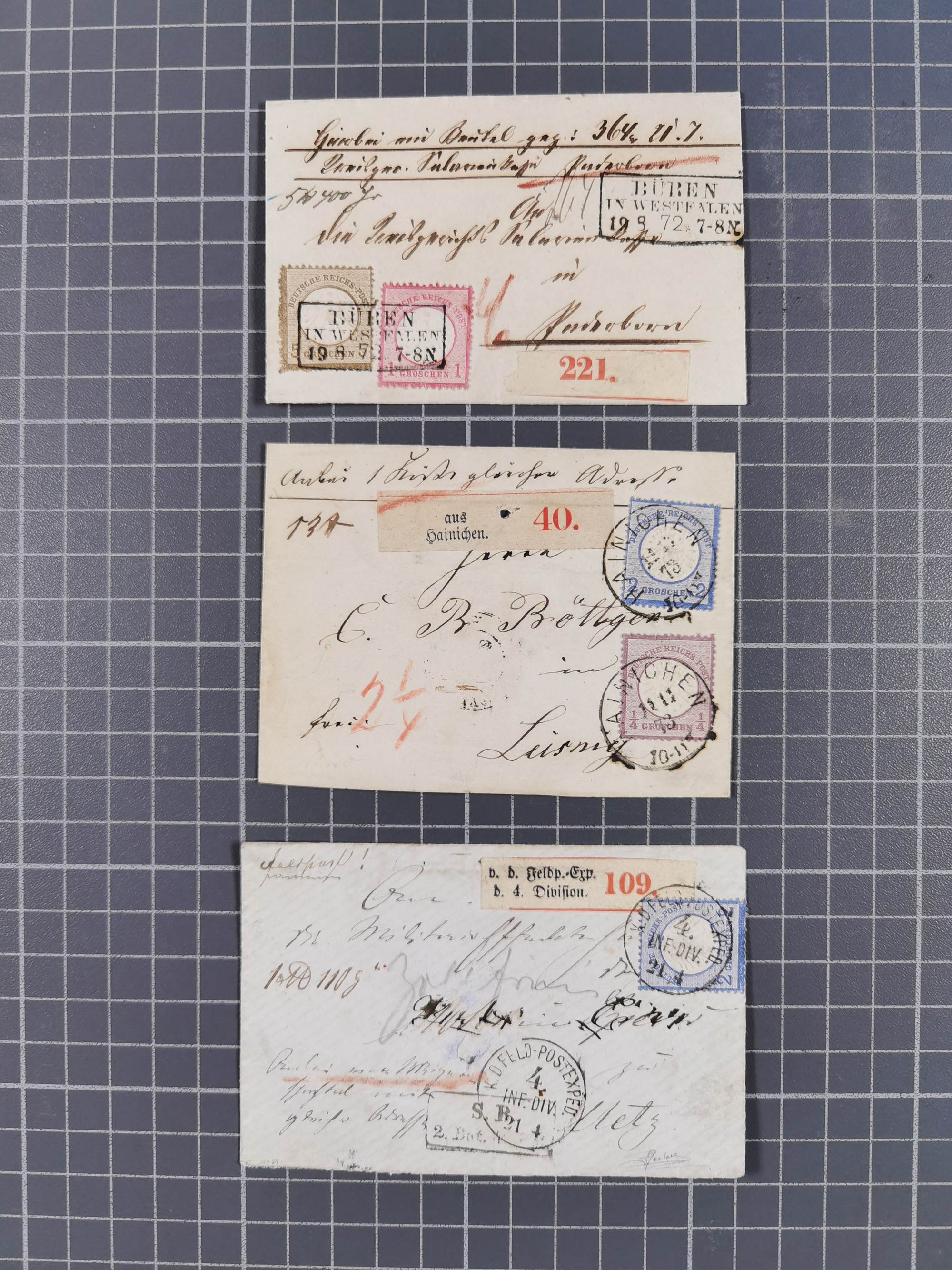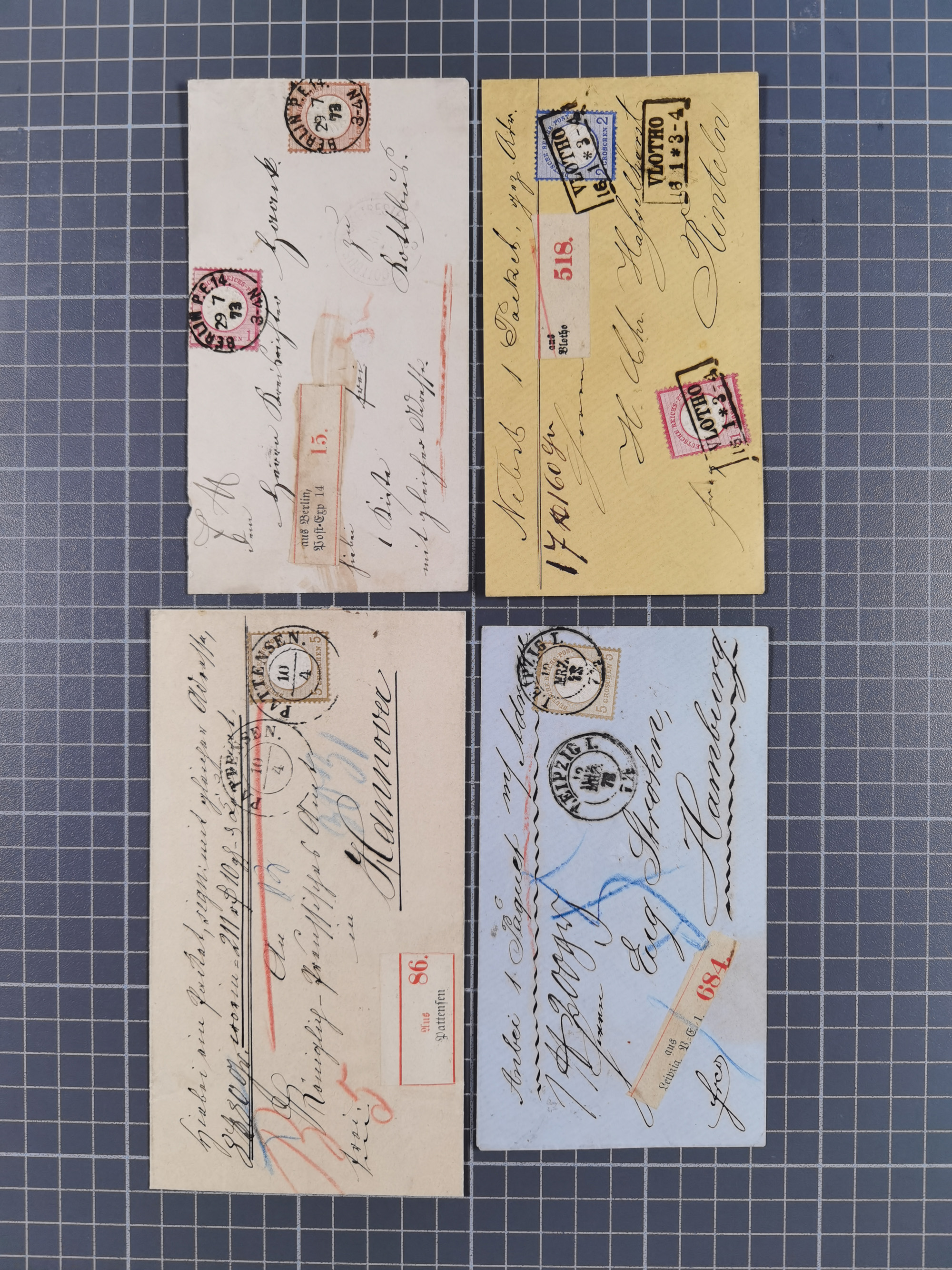 1872/74, Sammlung mit 30 Paketbegleitbriefen/Karten und drei Paketkarten sowie einer Vorderseite mit Mi.-Nr. 21a und L1 “HOLZMINDEN” auf Paketzettel (FB Hennies BPP) mit besseren Frankaturen, eine Fünf-Farben-Frankatur und weiteren Besonderheiten. Dabei u.a. drei Feldpost bzw. Soldenbrief je mit 2 Gr.-Frankatur, Paketkarte mit EF Mi.-Nr. 30, Paketkarte mit Mi.-Nr. 12.20 und 22, Mi.-Nr. 21a+19 auf Wert-Paketbegleitbrief mit großem Paketzettel und Tax-Gebühr “1” (Gr.) für die Zustellung ins Haus (FA Brugger BPP), Faltbrief mit Mi.-Nr. 10 (3) und 25 (2, einmal fehlerhaft) und fehlerhafter Briefkuvert mit Mi.-Nr. 1+3-6 (Mängel, FA Sommer BPP). Die Erhaltung ist zum Teil fehlerhaft, vieles signiert bzw. mit FB und Fotoattesten, ex Untermann