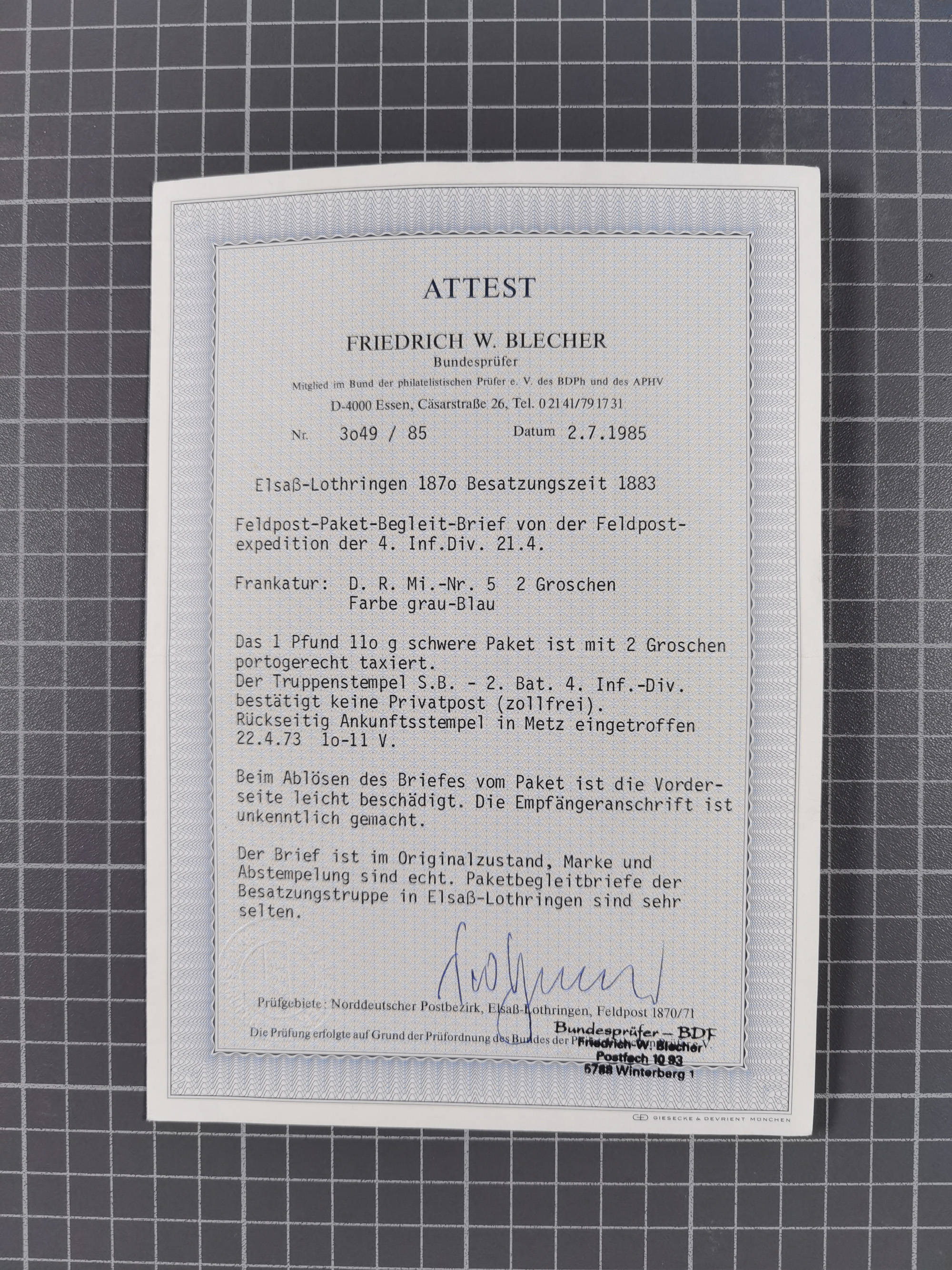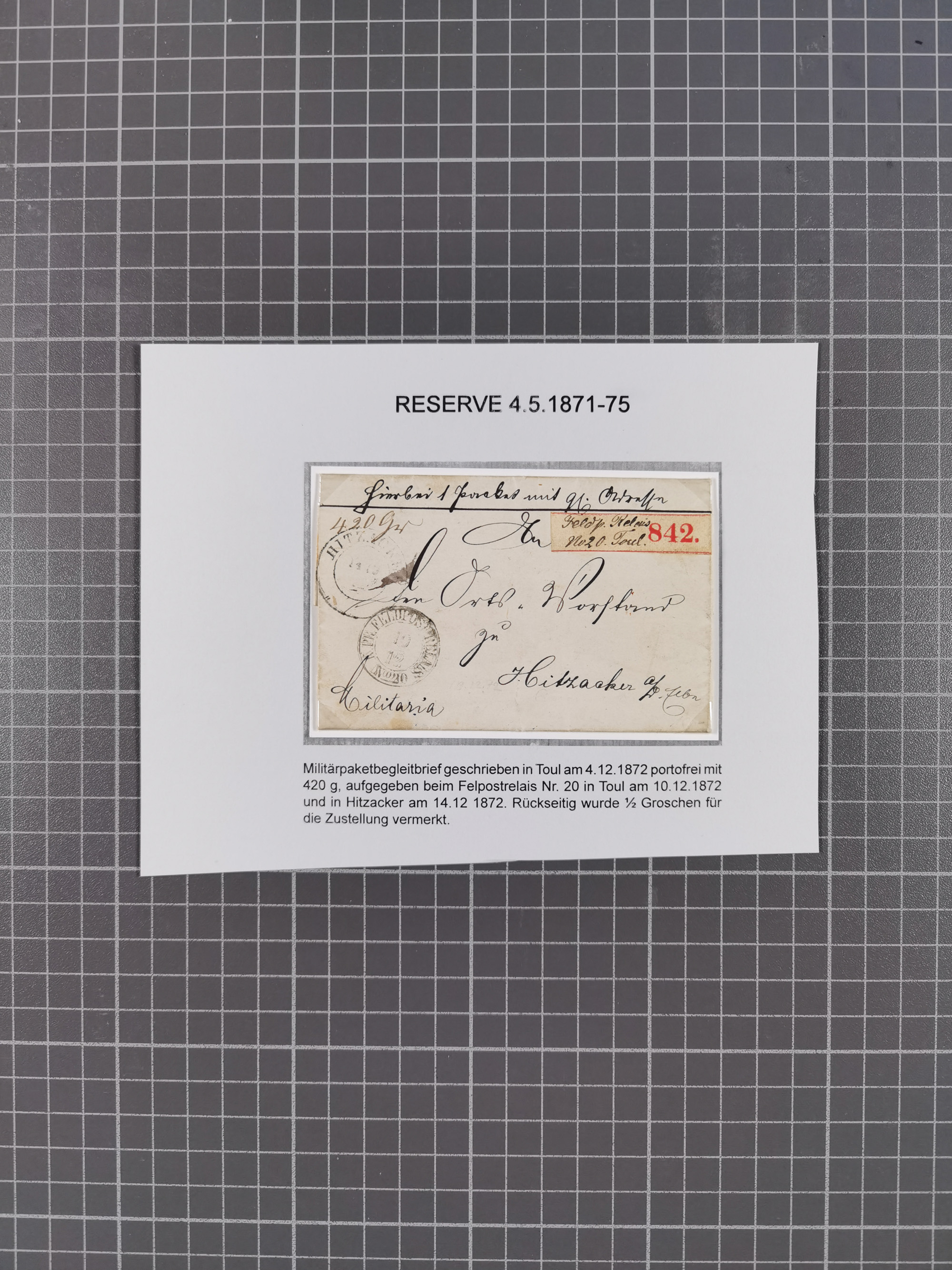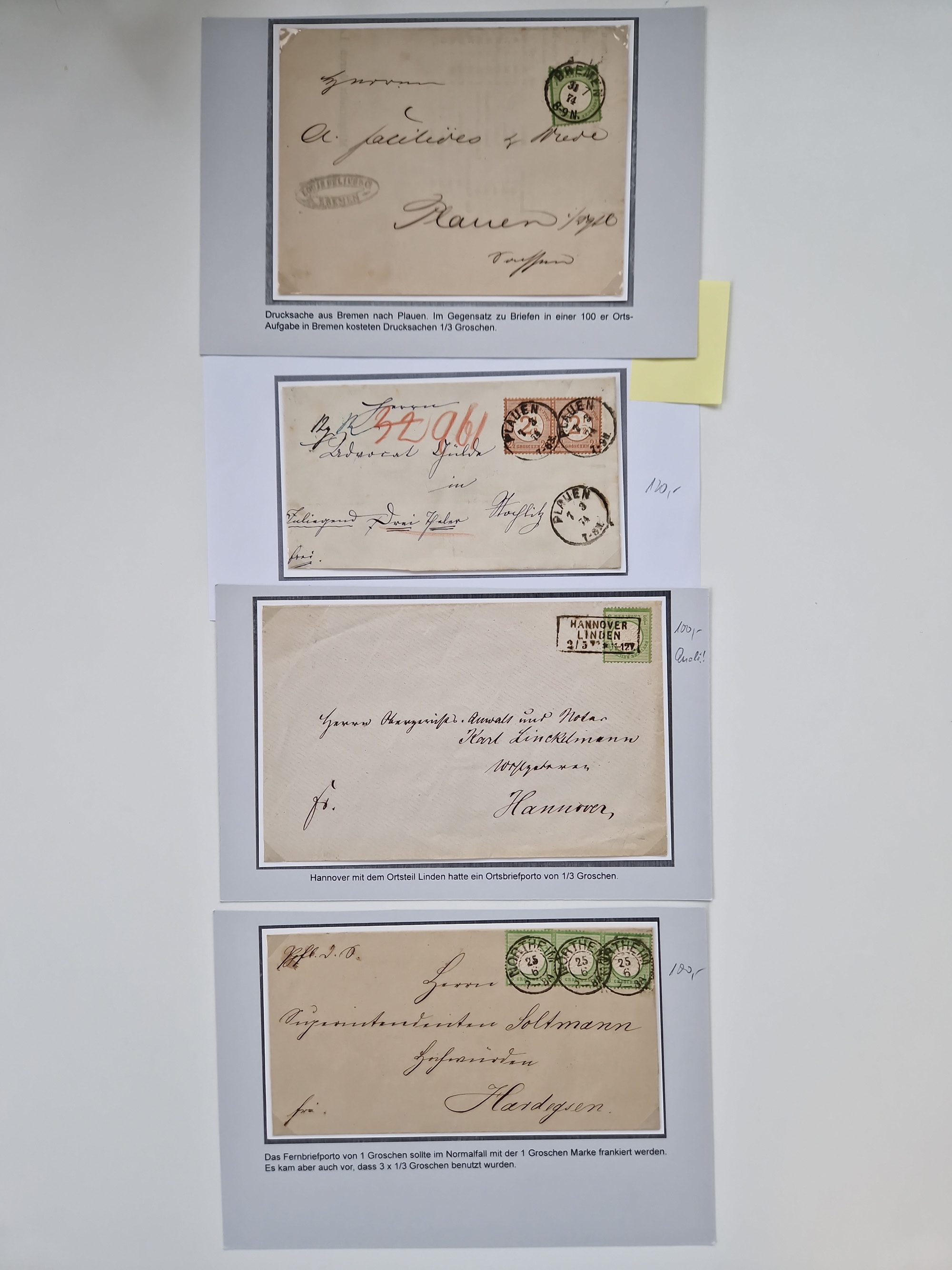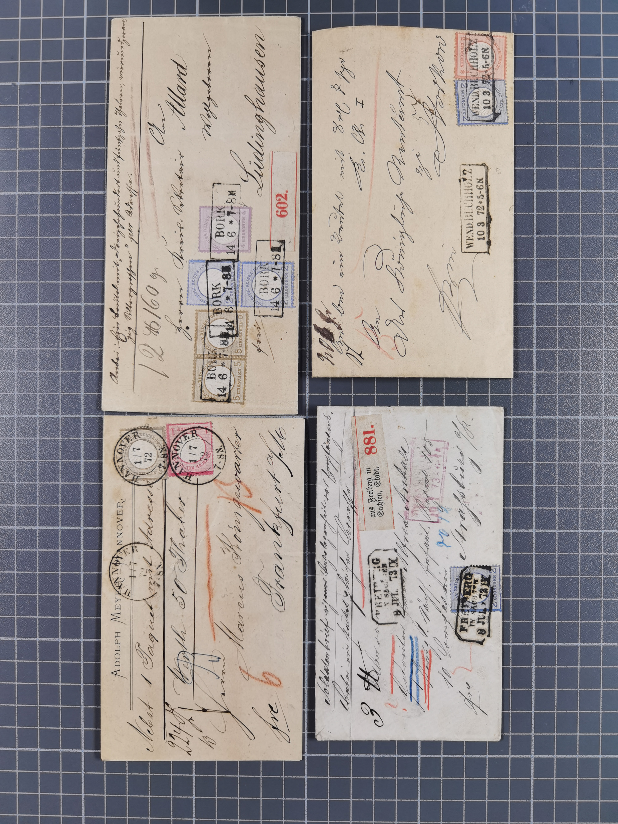 1872/74, Sammlung mit 30 Paketbegleitbriefen/Karten und drei Paketkarten sowie einer Vorderseite mit Mi.-Nr. 21a und L1 “HOLZMINDEN” auf Paketzettel (FB Hennies BPP) mit besseren Frankaturen, eine Fünf-Farben-Frankatur und weiteren Besonderheiten. Dabei u.a. drei Feldpost bzw. Soldenbrief je mit 2 Gr.-Frankatur, Paketkarte mit EF Mi.-Nr. 30, Paketkarte mit Mi.-Nr. 12.20 und 22, Mi.-Nr. 21a+19 auf Wert-Paketbegleitbrief mit großem Paketzettel und Tax-Gebühr “1” (Gr.) für die Zustellung ins Haus (FA Brugger BPP), Faltbrief mit Mi.-Nr. 10 (3) und 25 (2, einmal fehlerhaft) und fehlerhafter Briefkuvert mit Mi.-Nr. 1+3-6 (Mängel, FA Sommer BPP). Die Erhaltung ist zum Teil fehlerhaft, vieles signiert bzw. mit FB und Fotoattesten, ex Untermann