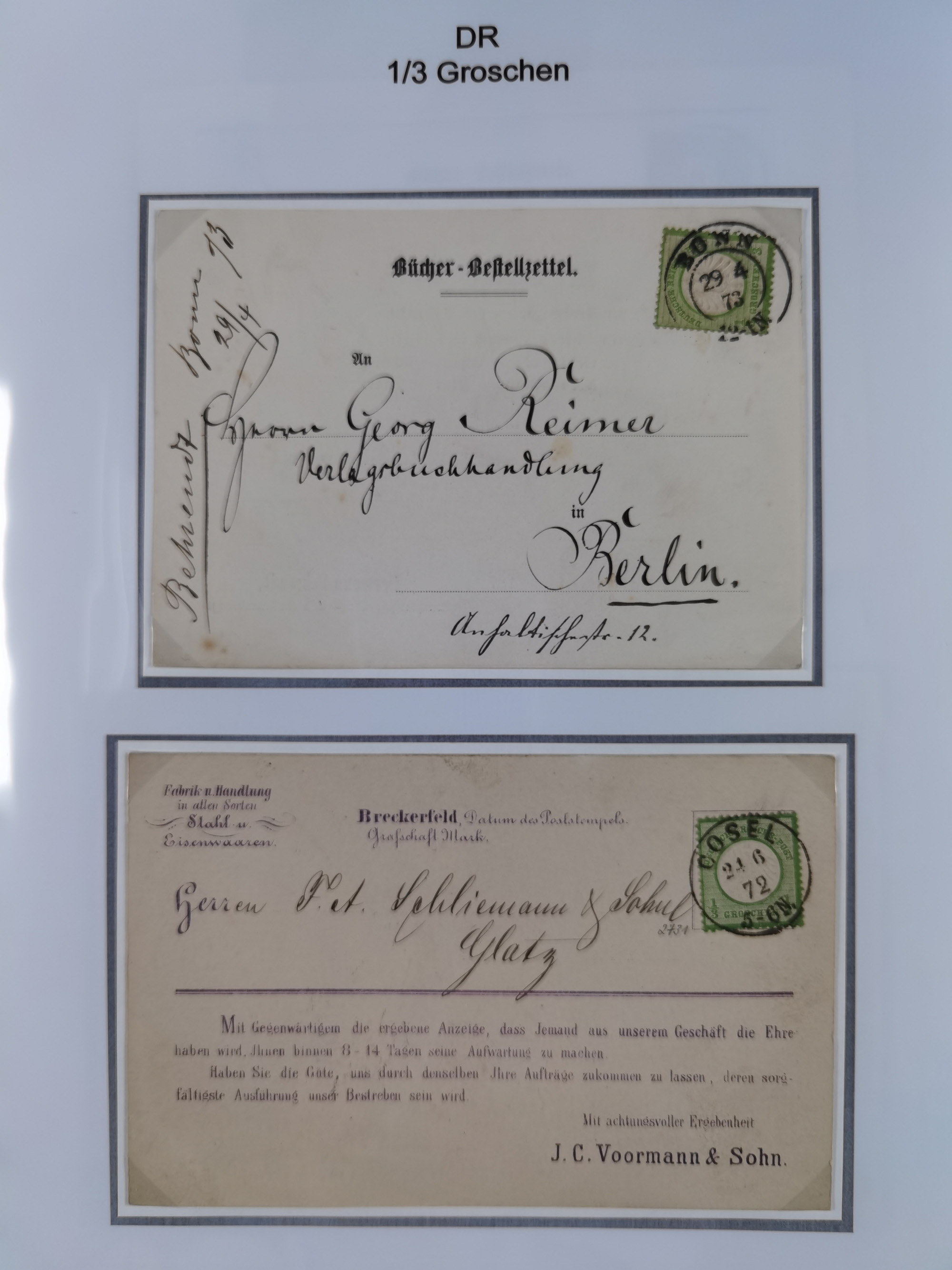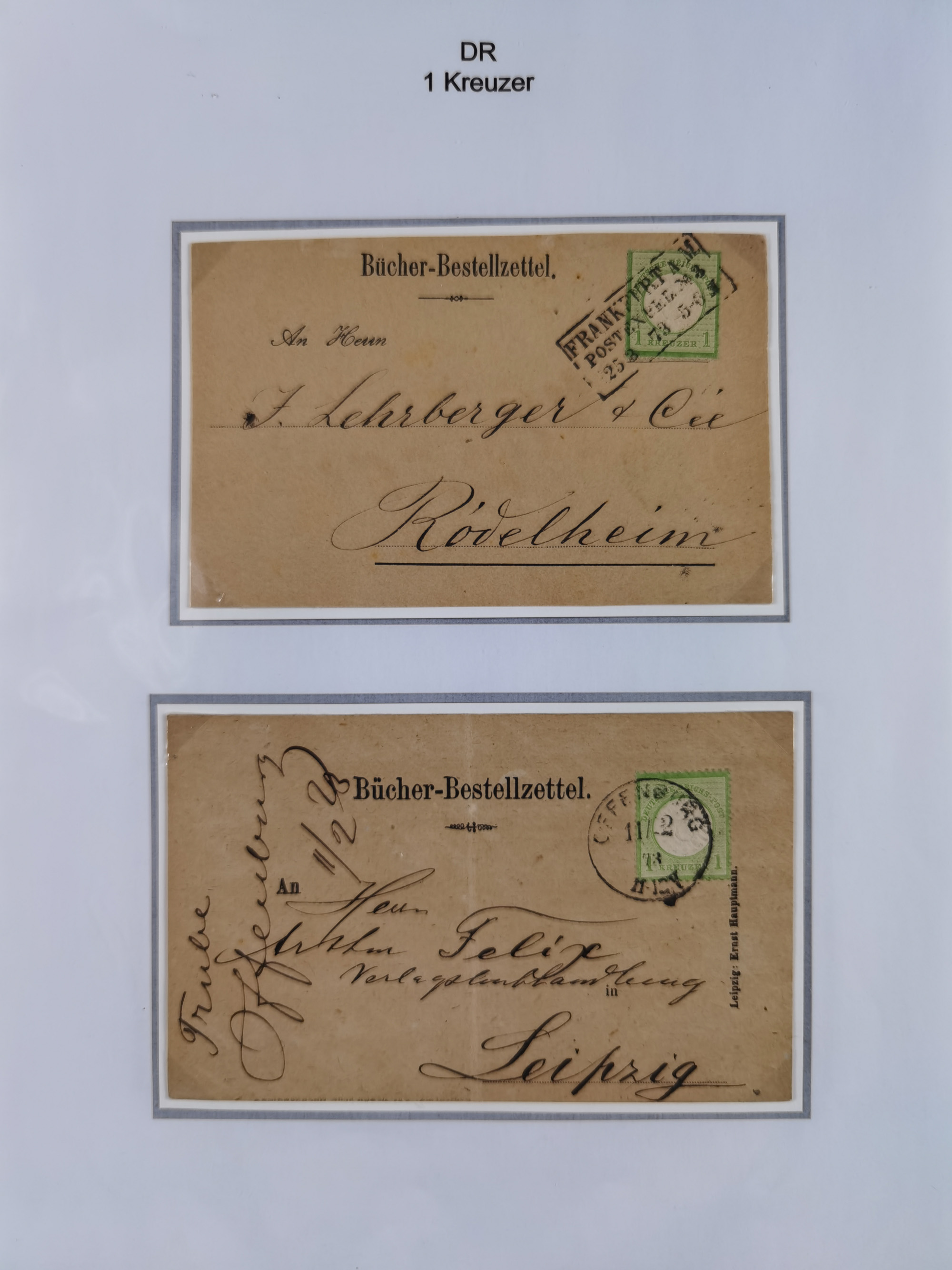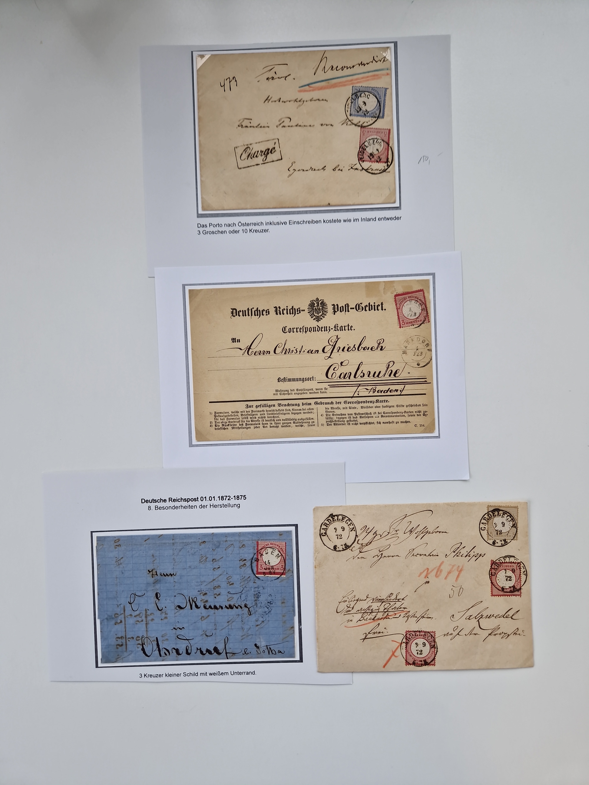 1872/74, Sammlung mit fast 90 Einzel- und Mehrfachfrankaturen der Wertstufen ⅓ Gr., 1 Gr., 2 Gr., 1 Kr. und 3 Kr. mit praktisch nur klaren Stempel-Abschlägen. Dabei dekorative Vertreter-Karten, Auslandspost und eine handschriftliche Entwertung, fast durchgehend in guter Erhaltung, ex Untermann