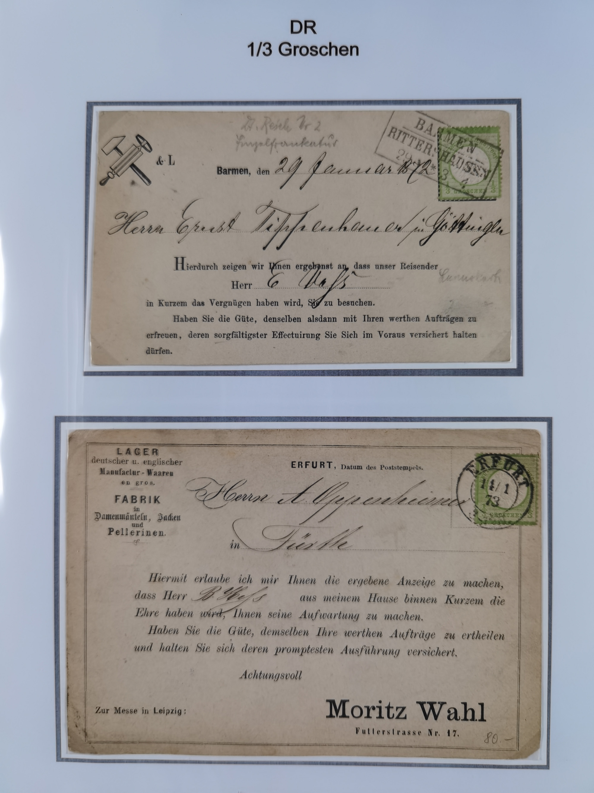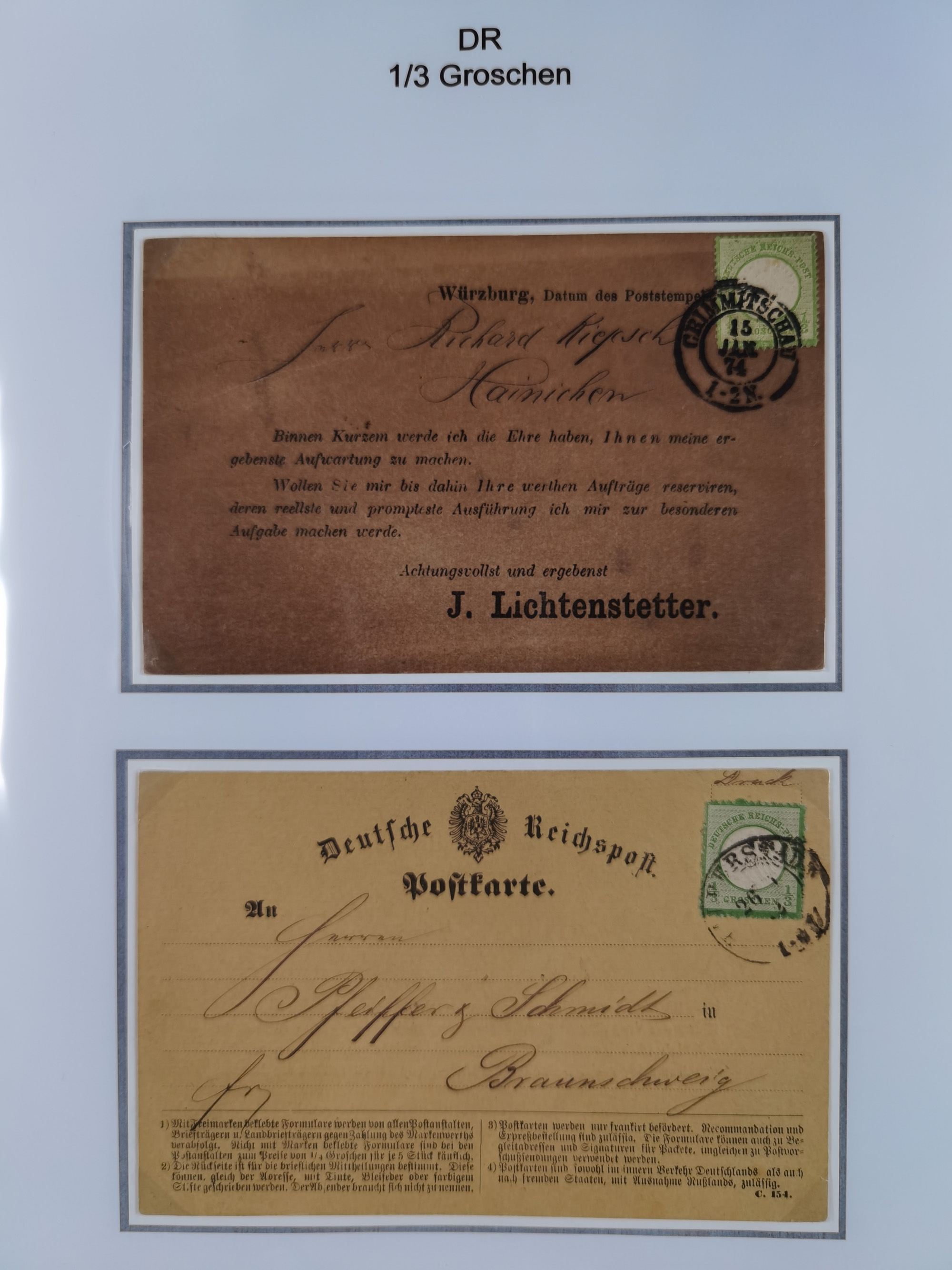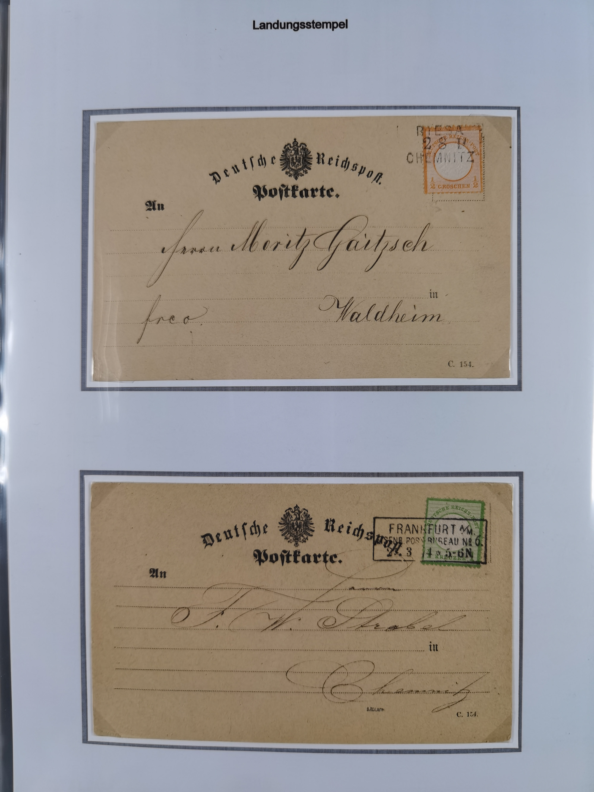 1872/74, Sammlung mit fast 90 Einzel- und Mehrfachfrankaturen der Wertstufen ⅓ Gr., 1 Gr., 2 Gr., 1 Kr. und 3 Kr. mit praktisch nur klaren Stempel-Abschlägen. Dabei dekorative Vertreter-Karten, Auslandspost und eine handschriftliche Entwertung, fast durchgehend in guter Erhaltung, ex Untermann