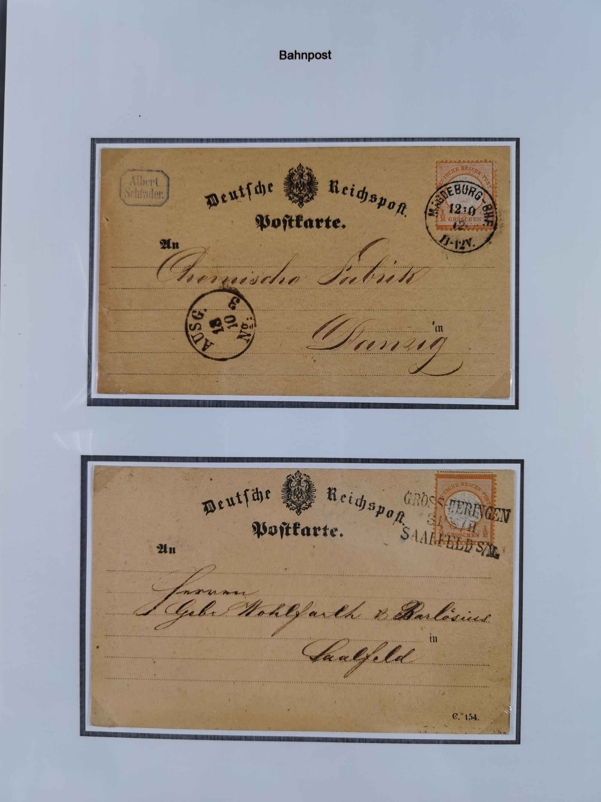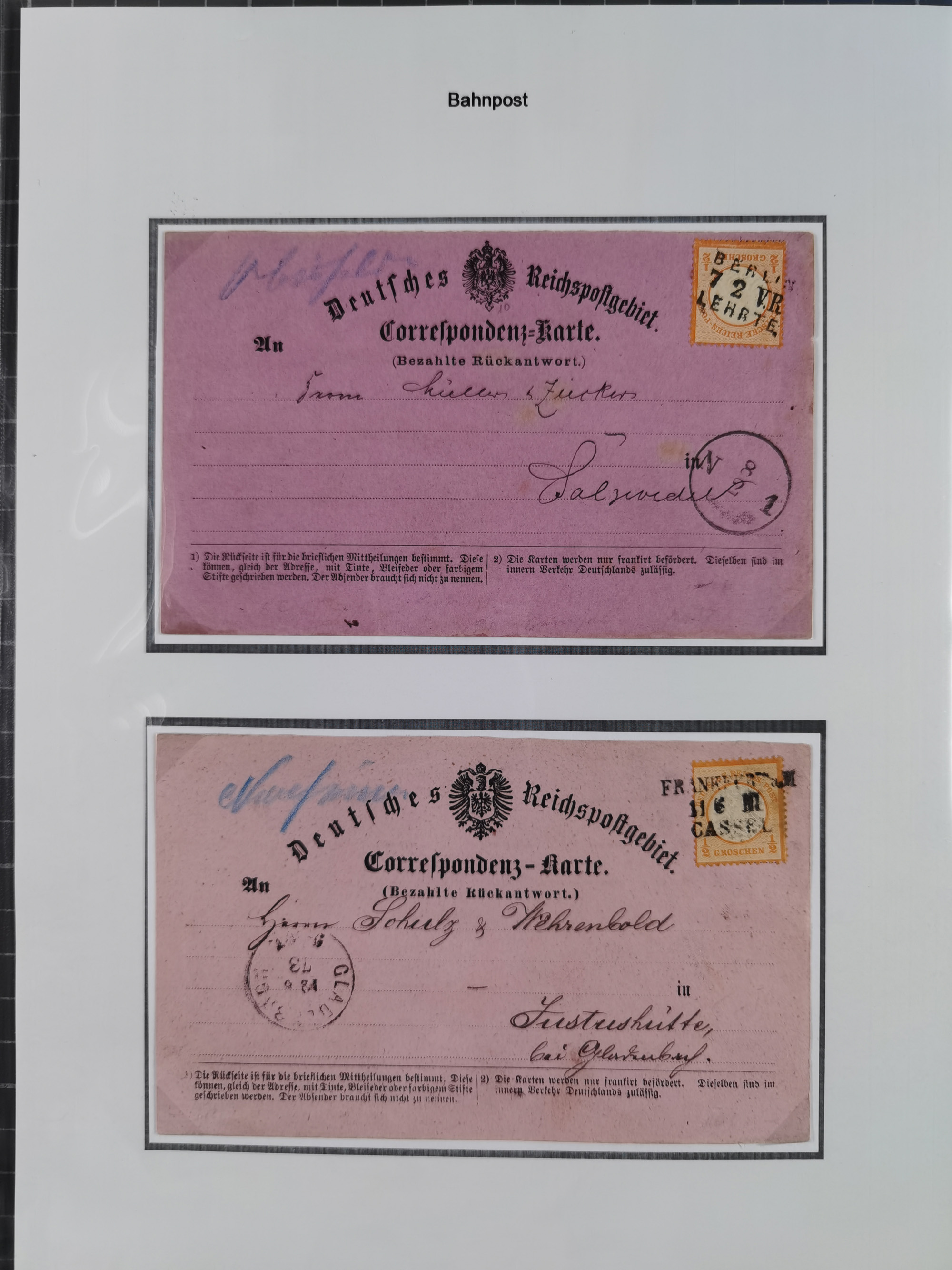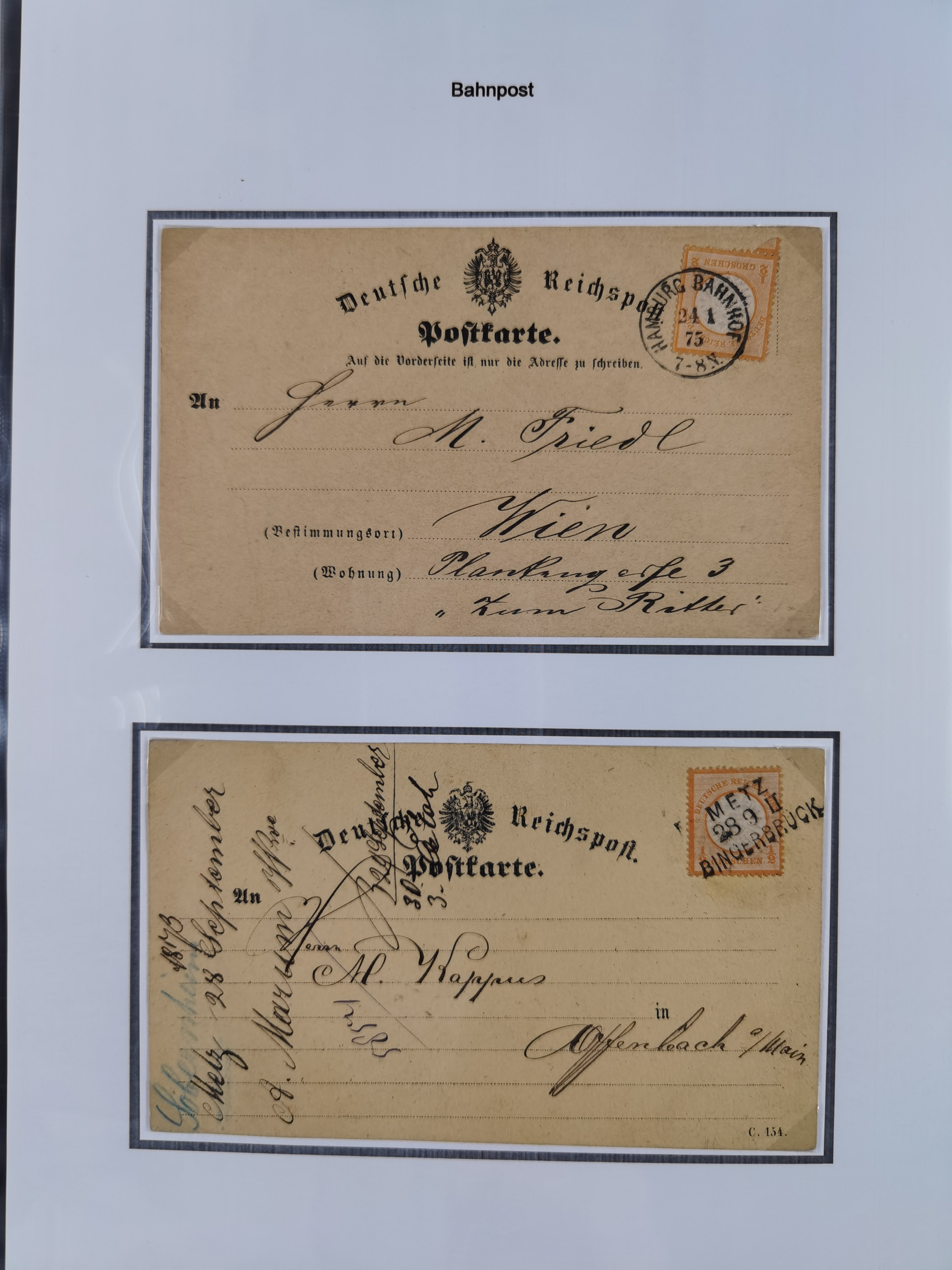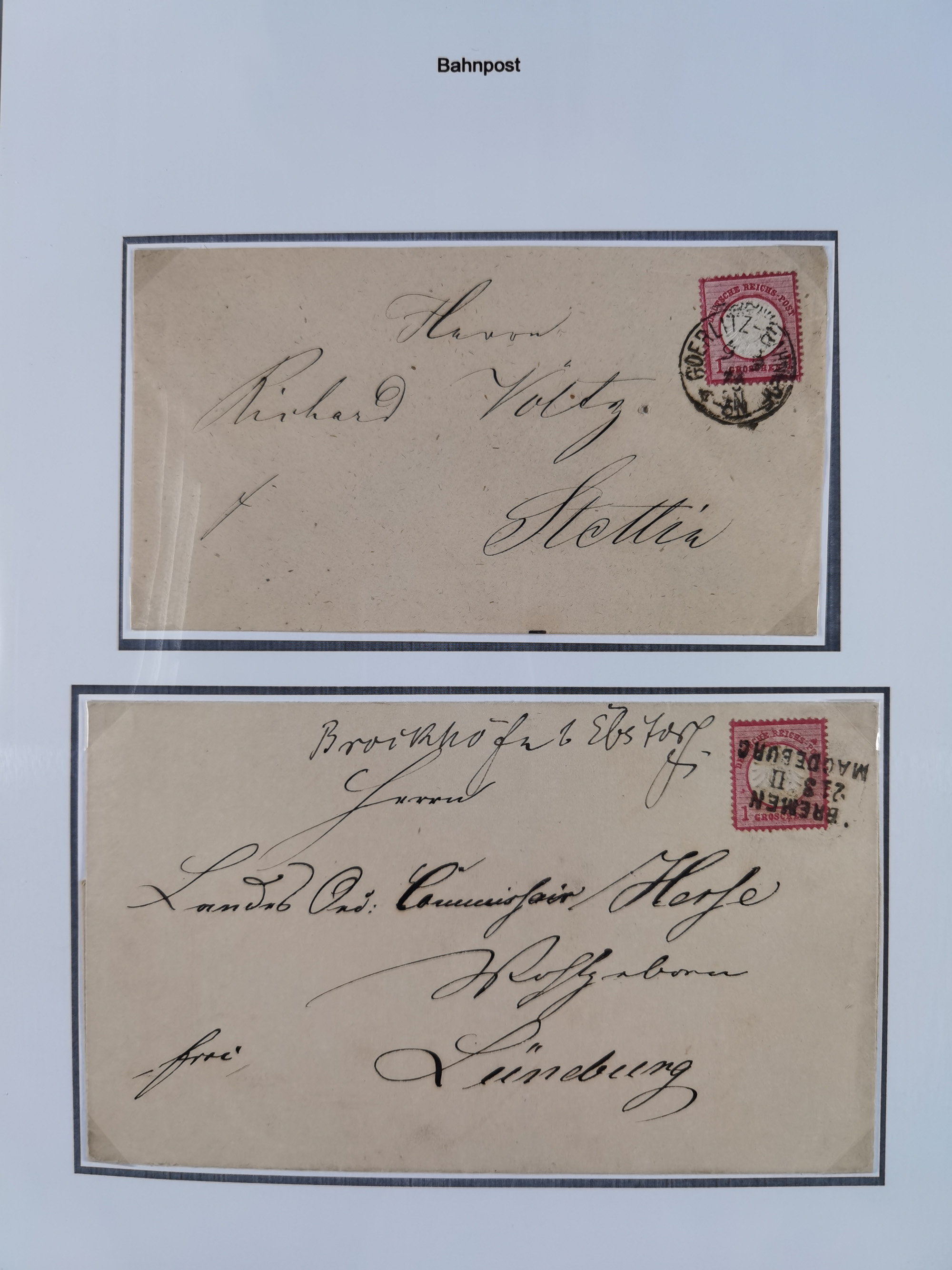 1872/74, kleine Sammlung von Bahnpost- und Bahnhofsstempel-Stempeln auf ca. 40 Briefen, Karten und Ganzsachen. Dabei interessante Aufgabestempel, bessere Frankaturen, Auslandspost und weitere Besonderheiten. Fast nur ausgesuchte klare Stempel, ex Untermann