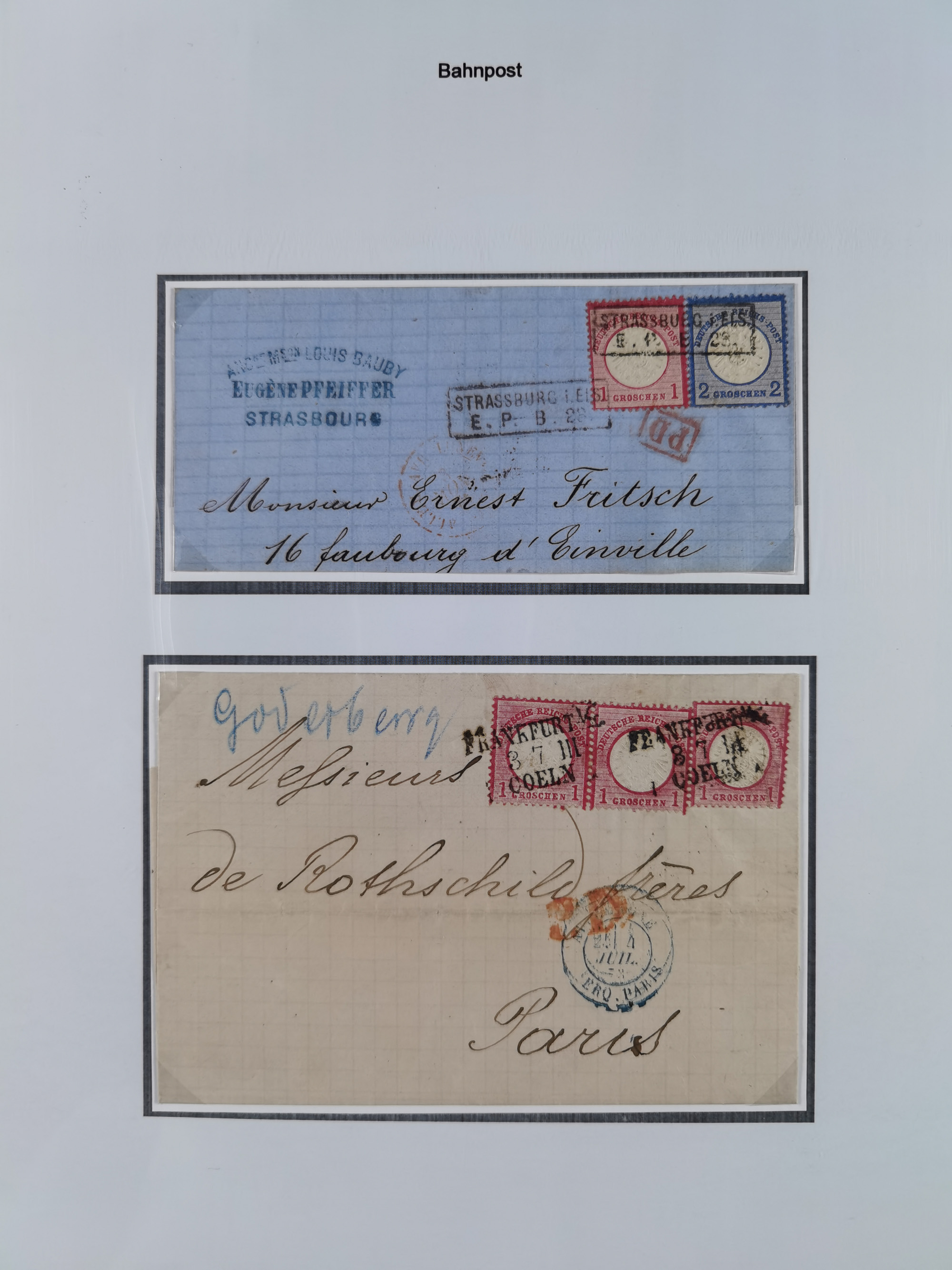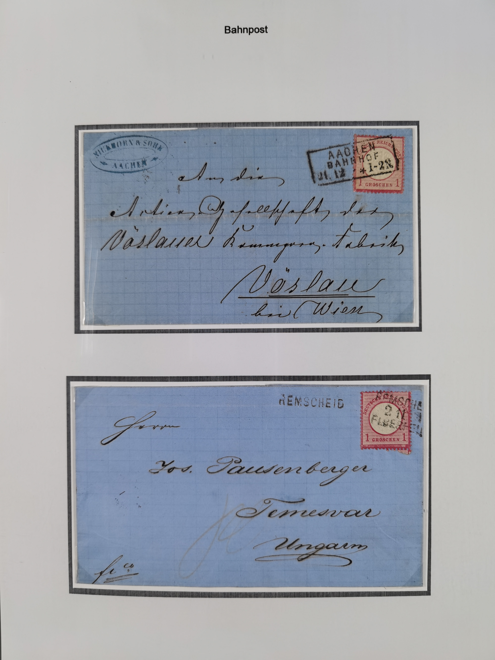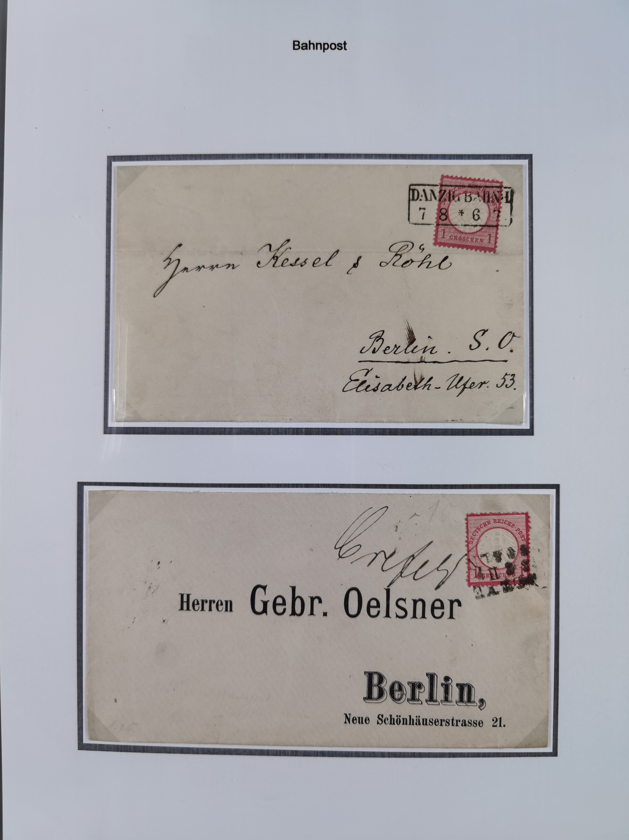 1872/74, kleine Sammlung von Bahnpost- und Bahnhofsstempel-Stempeln auf ca. 40 Briefen, Karten und Ganzsachen. Dabei interessante Aufgabestempel, bessere Frankaturen, Auslandspost und weitere Besonderheiten. Fast nur ausgesuchte klare Stempel, ex Untermann