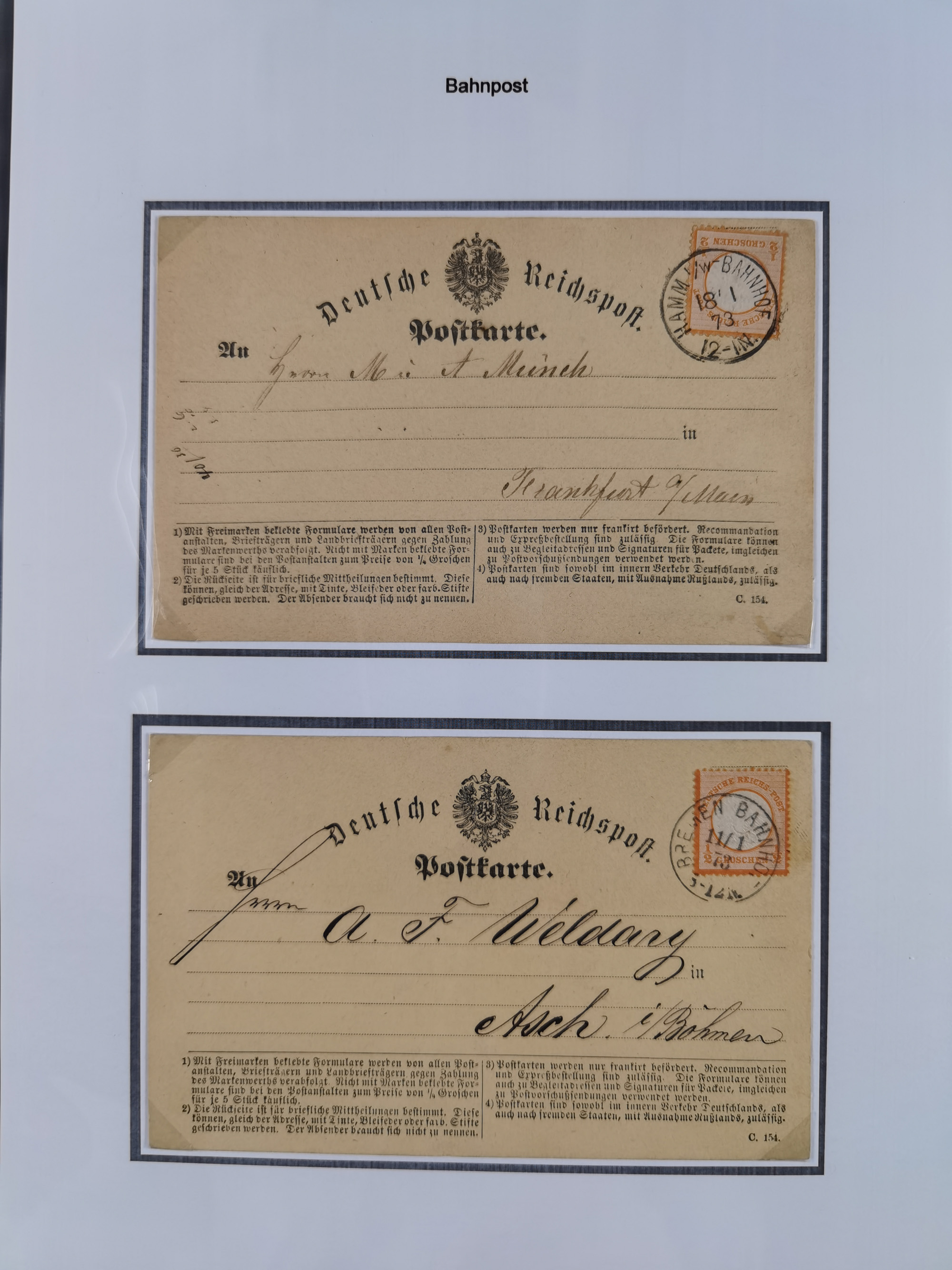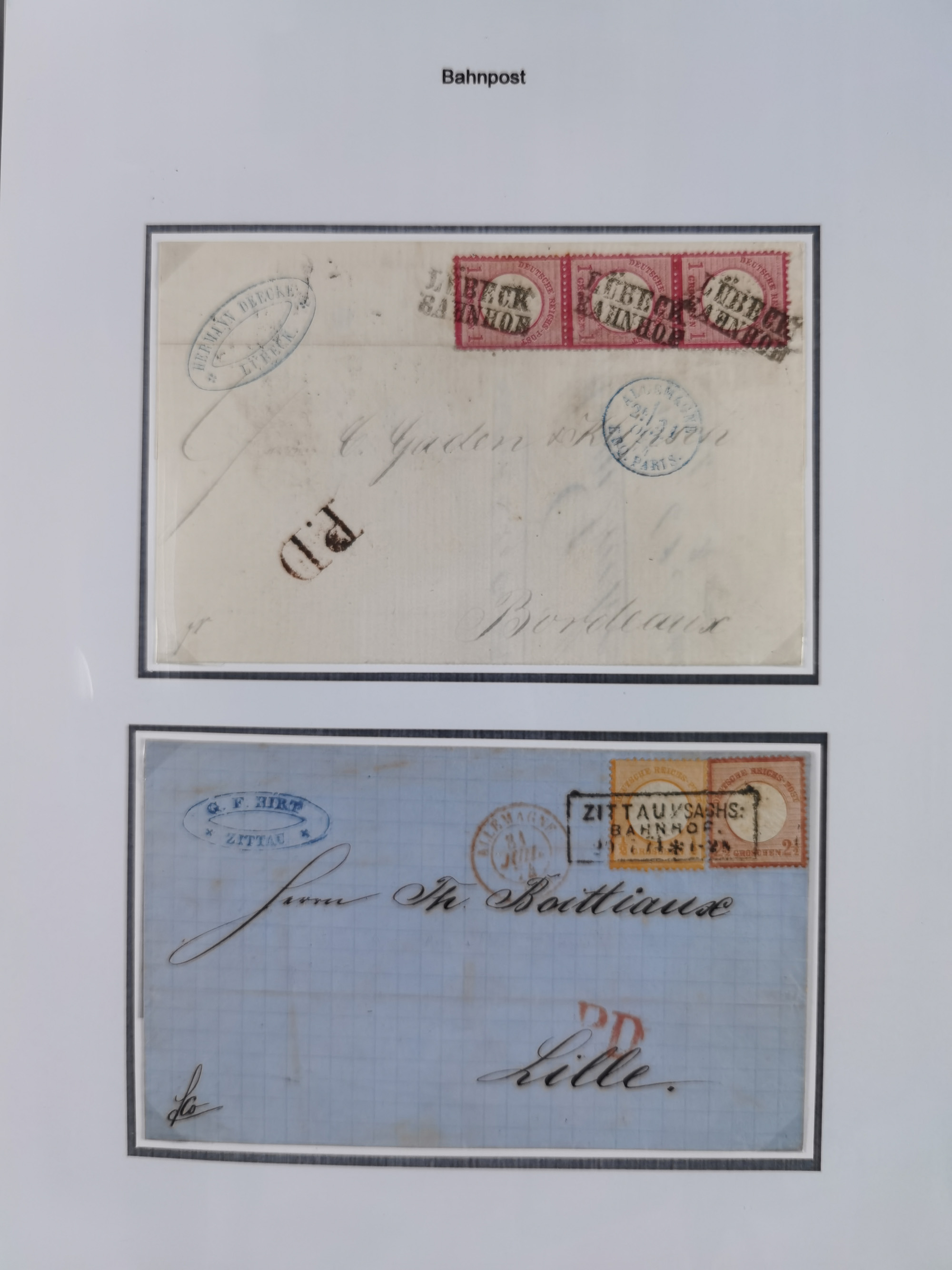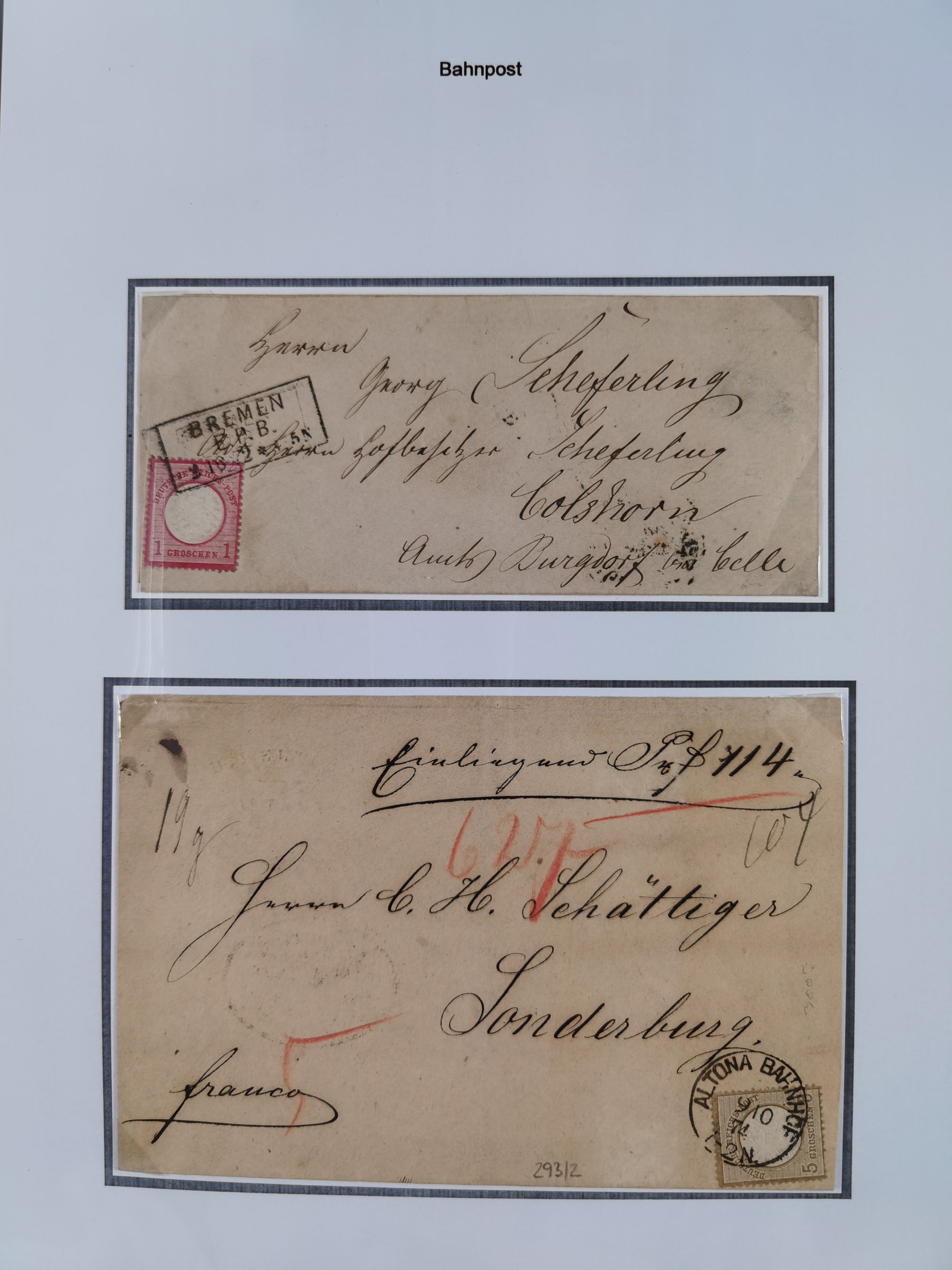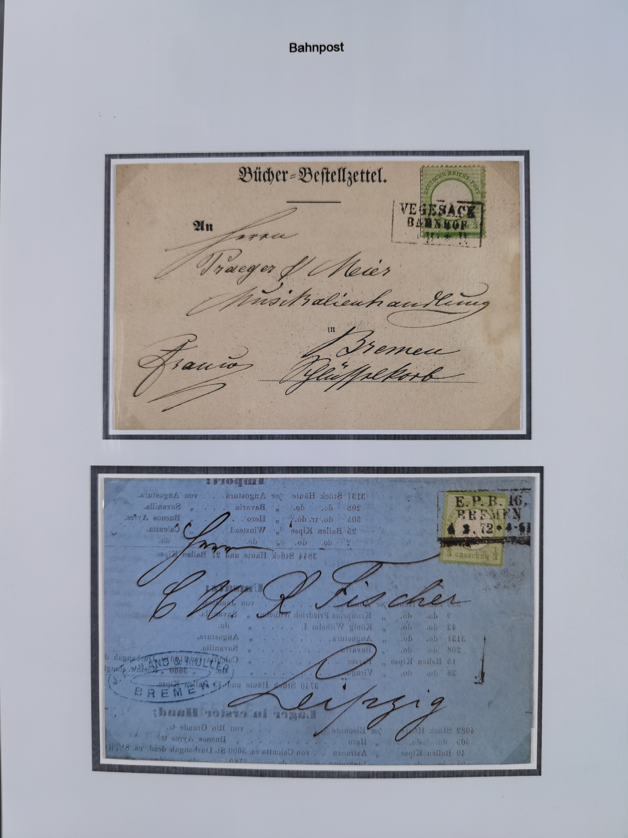 1872/74, kleine Sammlung von Bahnpost- und Bahnhofsstempel-Stempeln auf ca. 40 Briefen, Karten und Ganzsachen. Dabei interessante Aufgabestempel, bessere Frankaturen, Auslandspost und weitere Besonderheiten. Fast nur ausgesuchte klare Stempel, ex Untermann