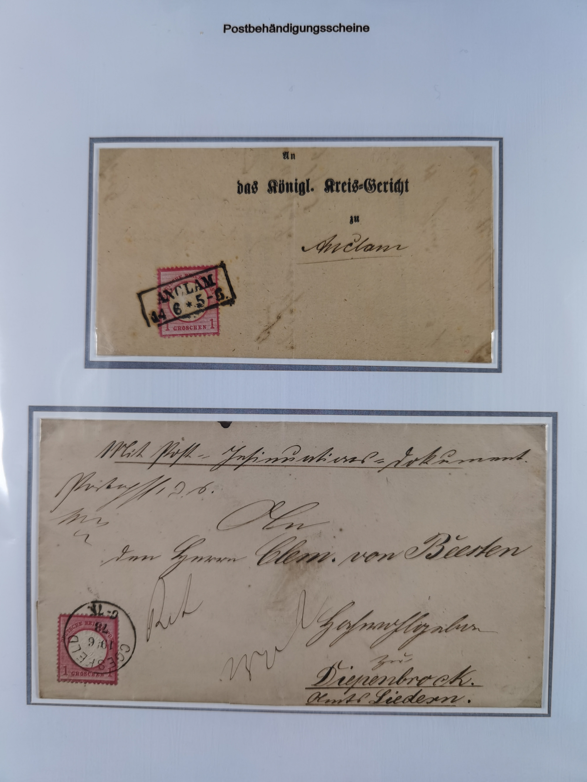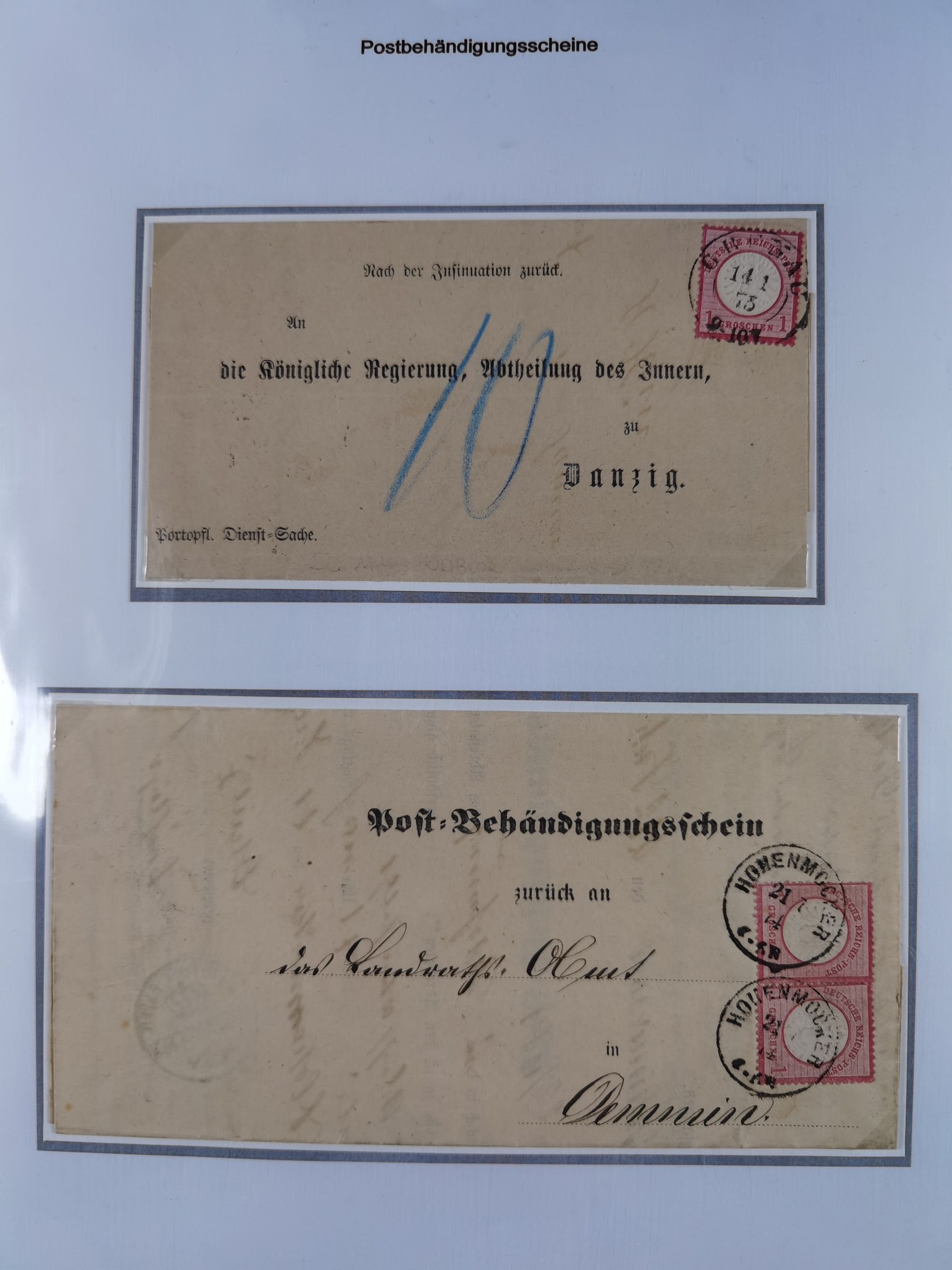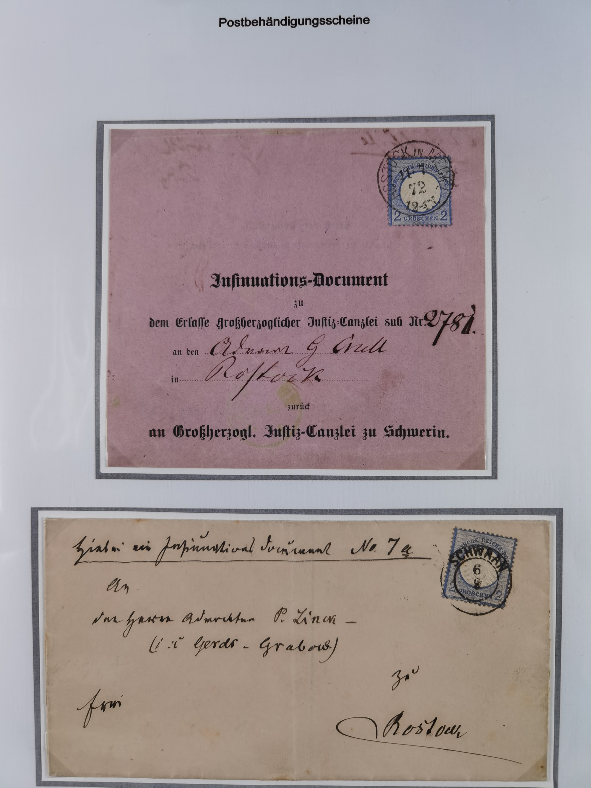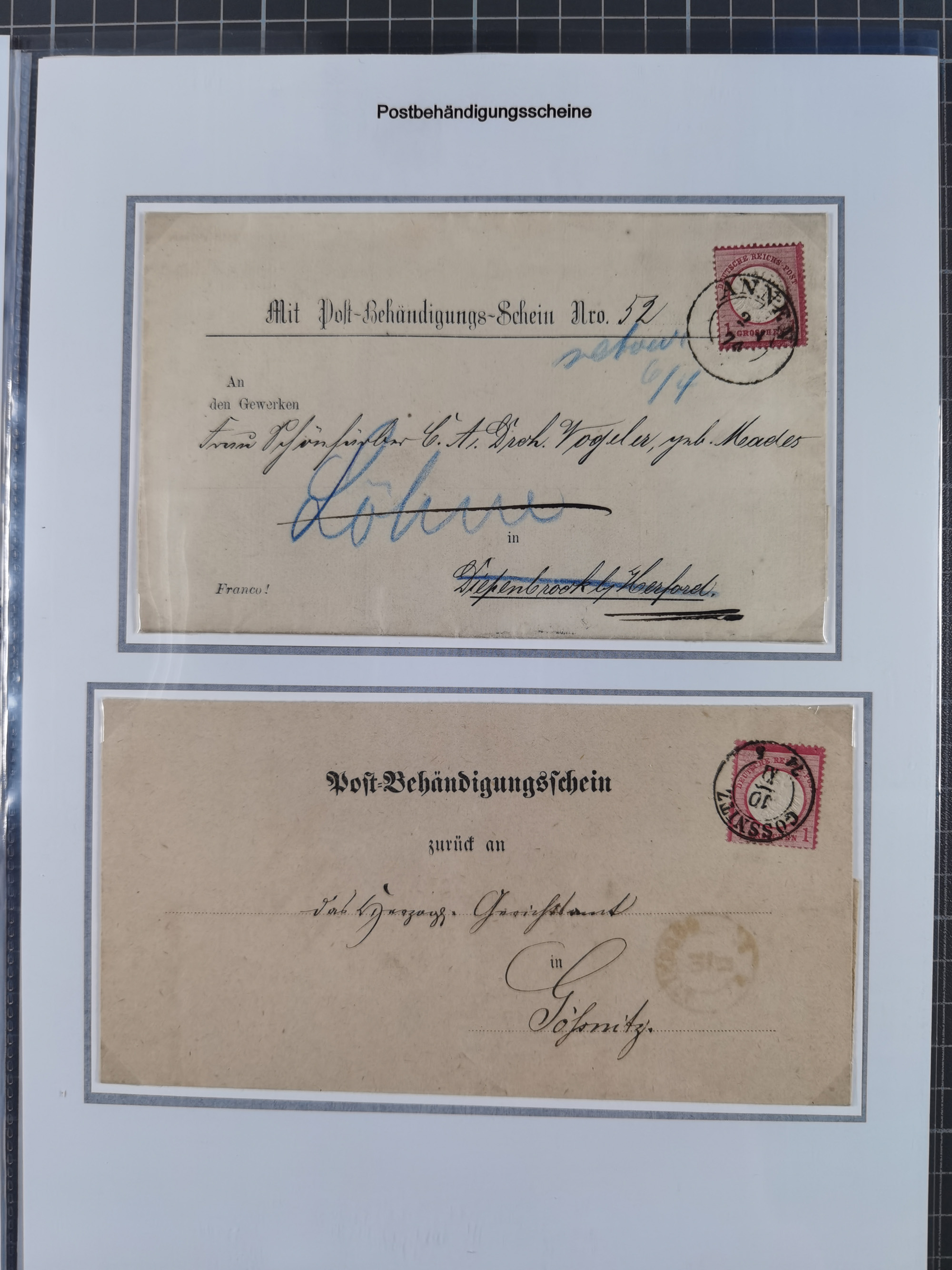 1872/74, Sammlung mit 22 frankierten “Postbehändigungsscheinen” in den Tarifen ½ Gr., 1 Gr., 1½ Gr. und 2 Gr. Dabei verschiedene Formulare, Einzel- und Mehrfachfrankaturen und bessere Frankatur-Kombinationen mit u.a. Mi.-Nr. 14+19 (2). Fast nur ausgesucht klare Stempel und insgesamt in guter Erhaltung, ex Untermann