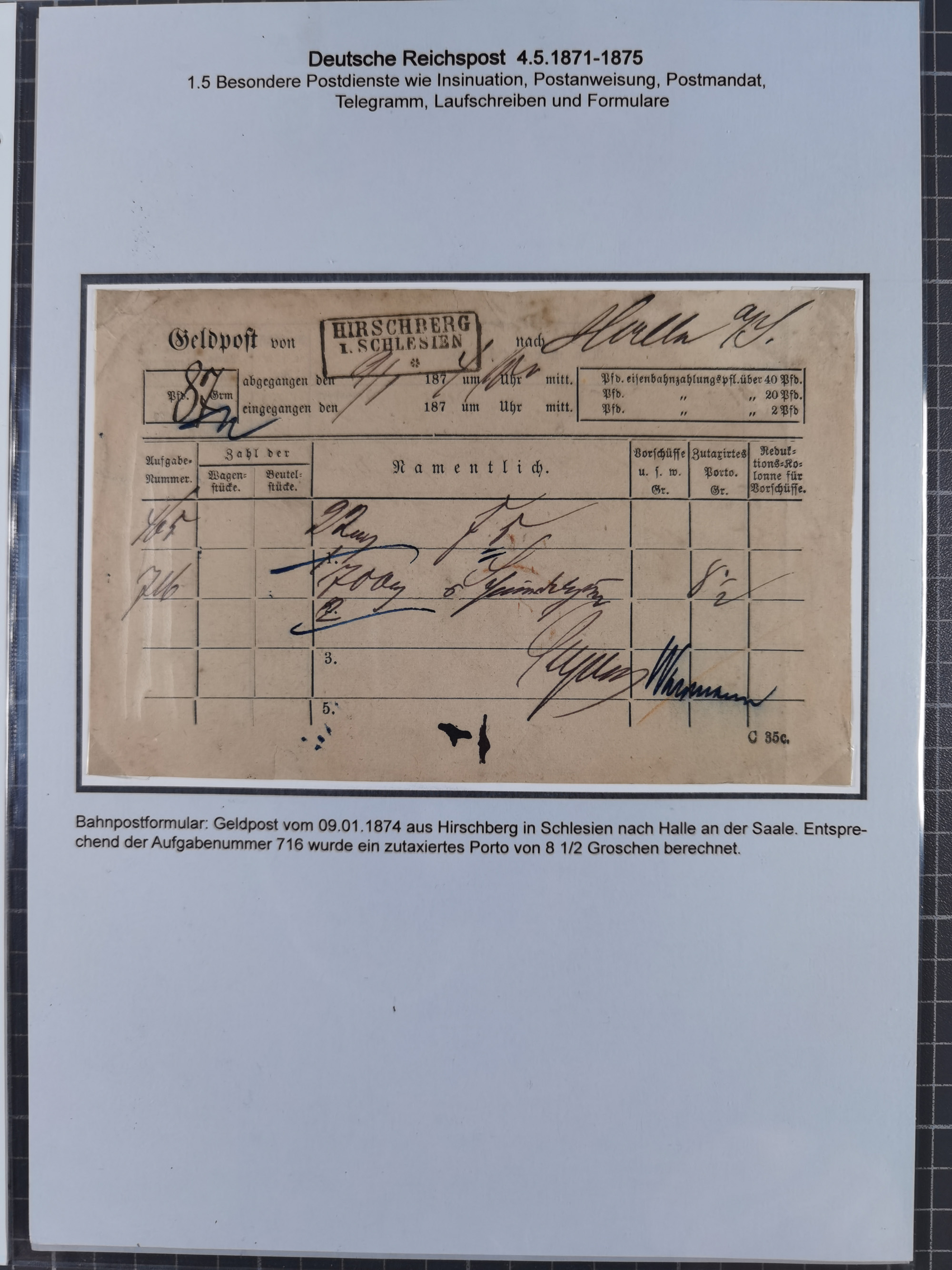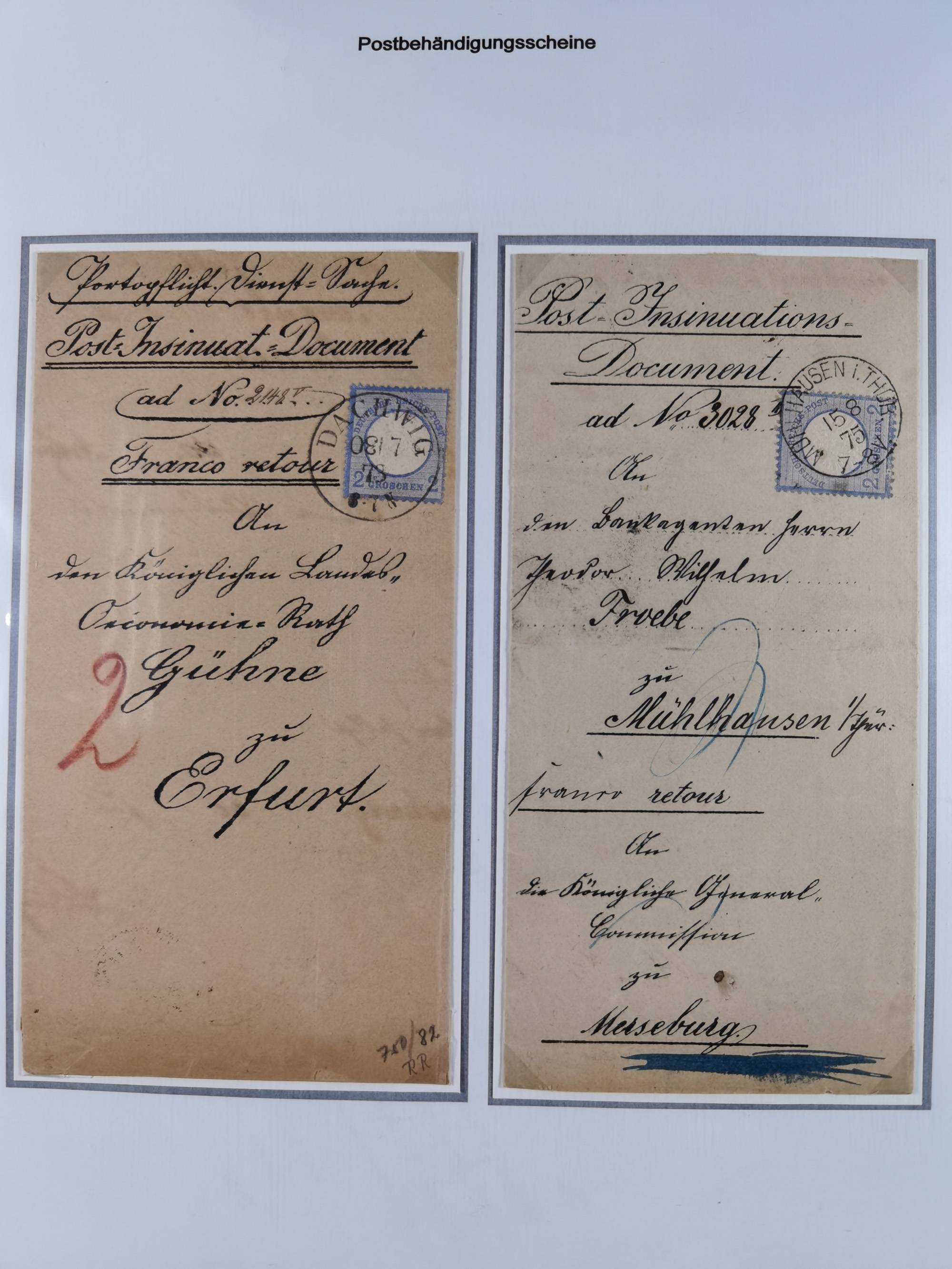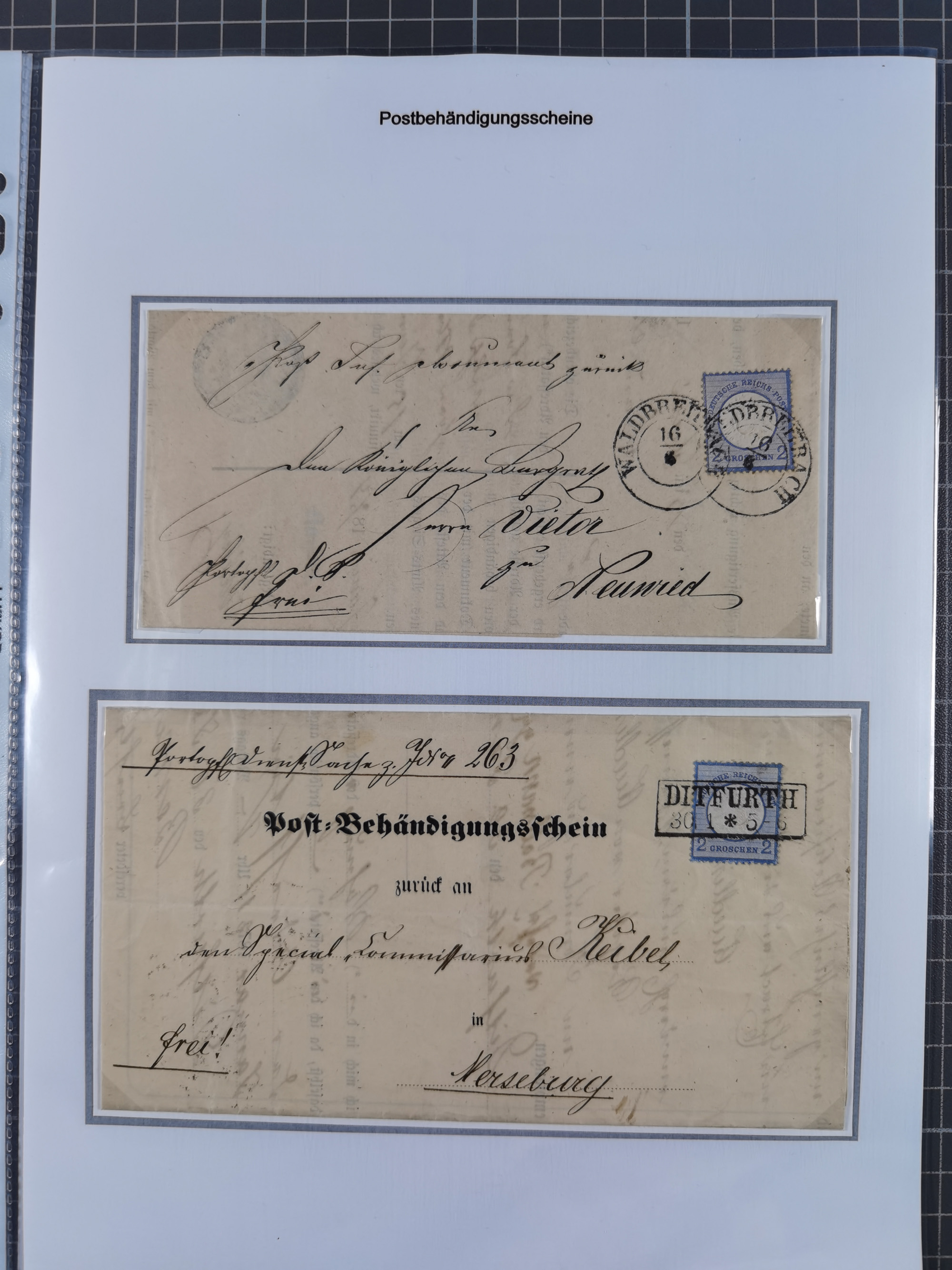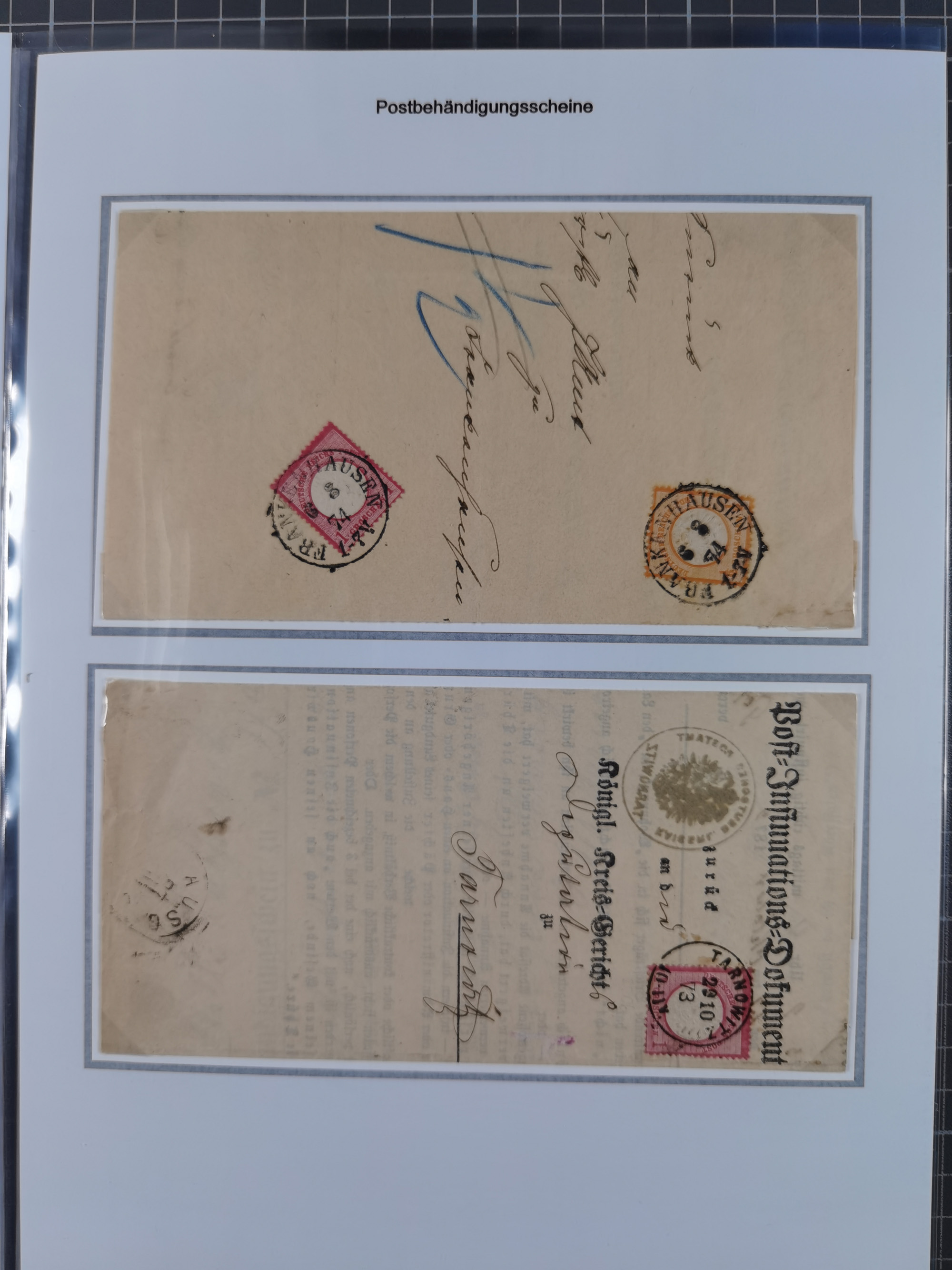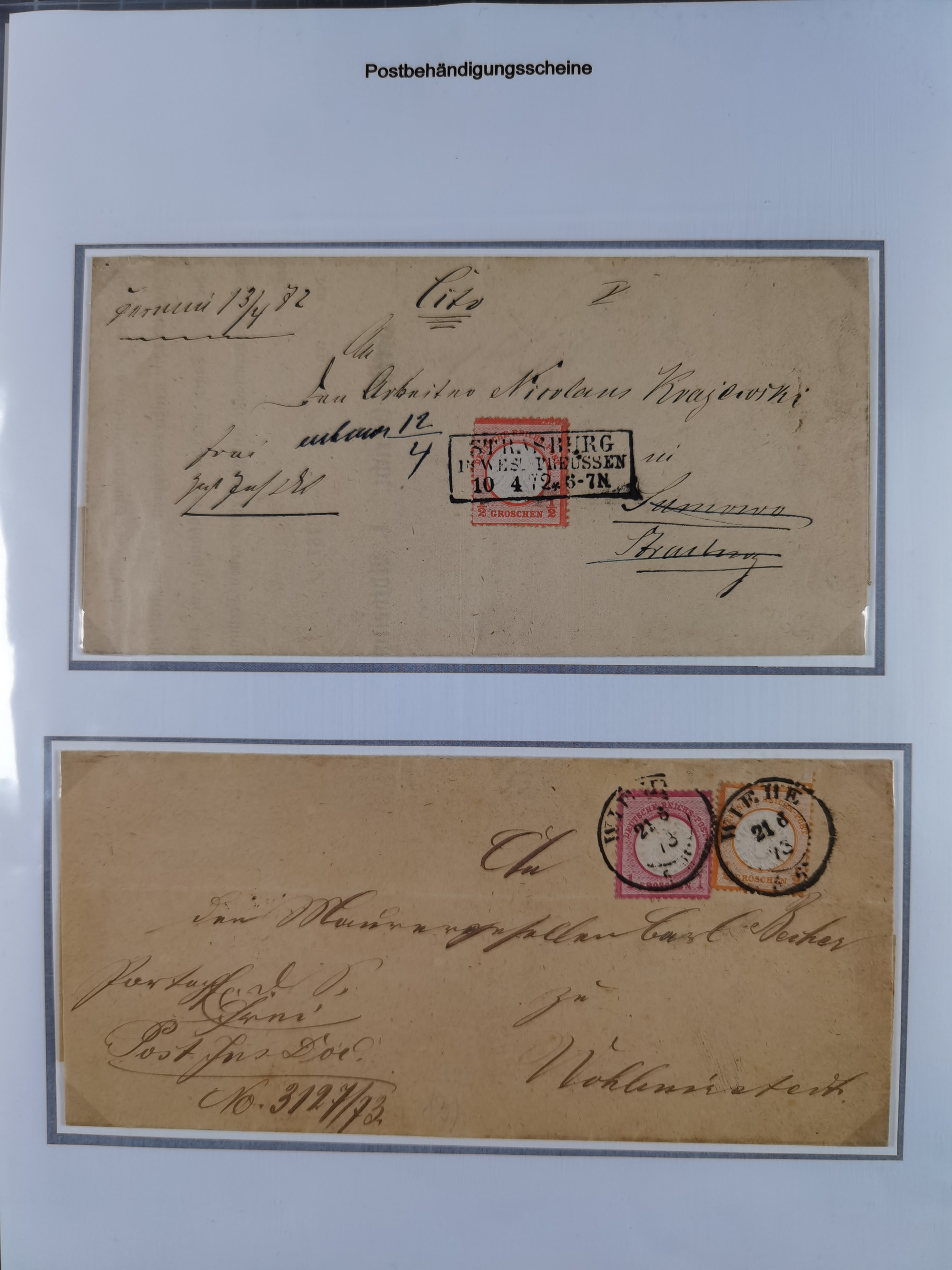 1872/74, Sammlung mit 22 frankierten “Postbehändigungsscheinen” in den Tarifen ½ Gr., 1 Gr., 1½ Gr. und 2 Gr. Dabei verschiedene Formulare, Einzel- und Mehrfachfrankaturen und bessere Frankatur-Kombinationen mit u.a. Mi.-Nr. 14+19 (2). Fast nur ausgesucht klare Stempel und insgesamt in guter Erhaltung, ex Untermann
