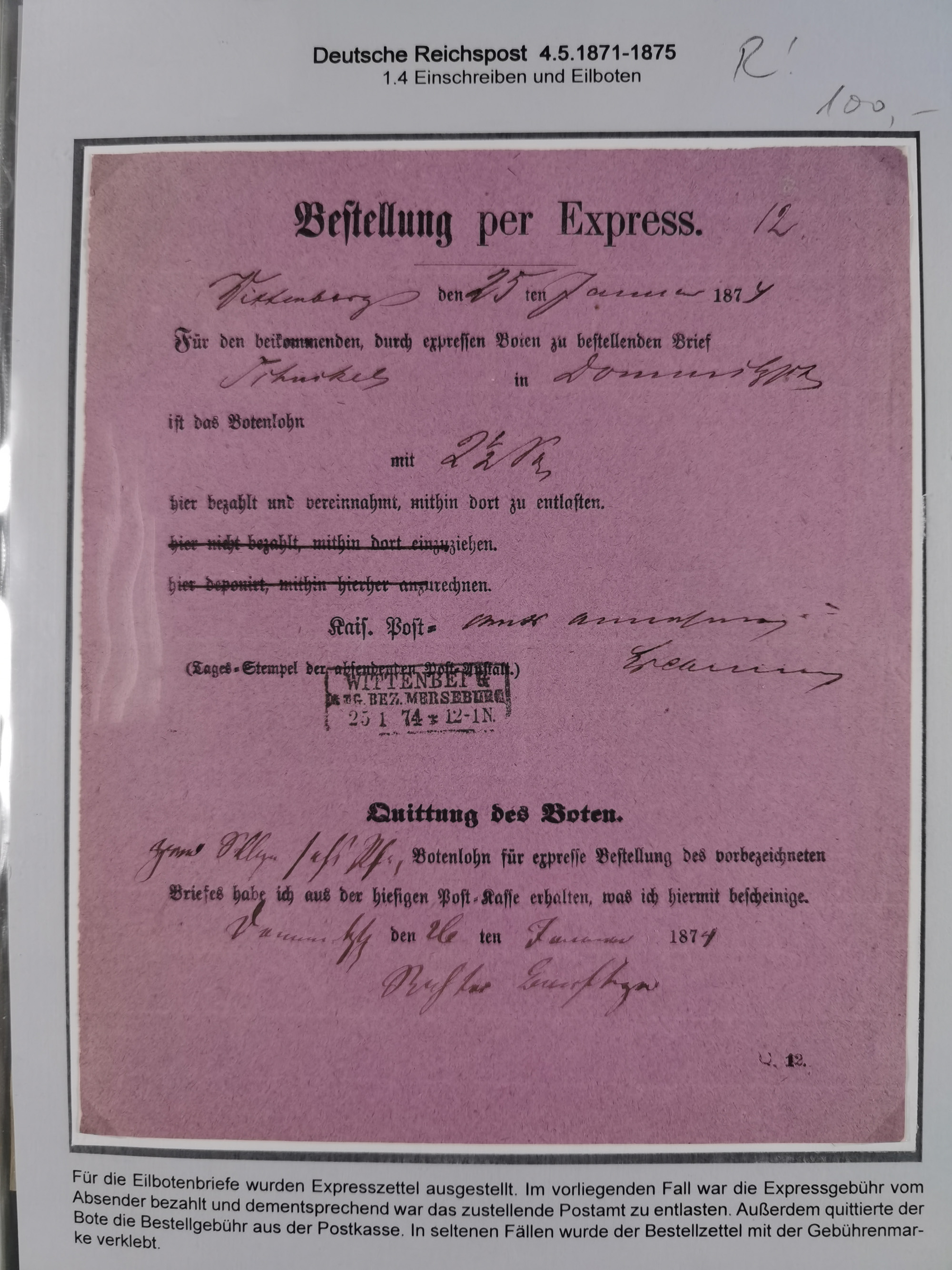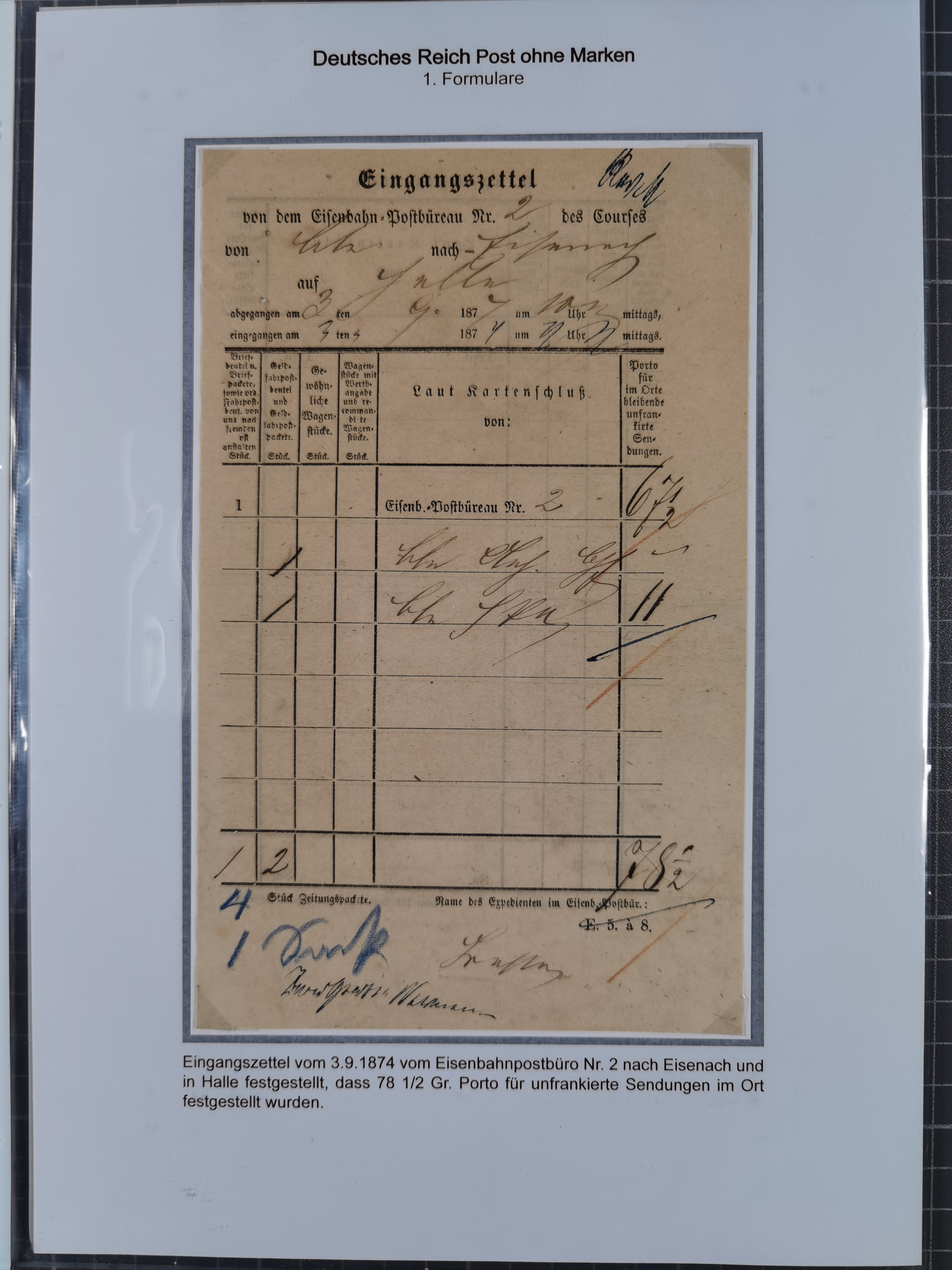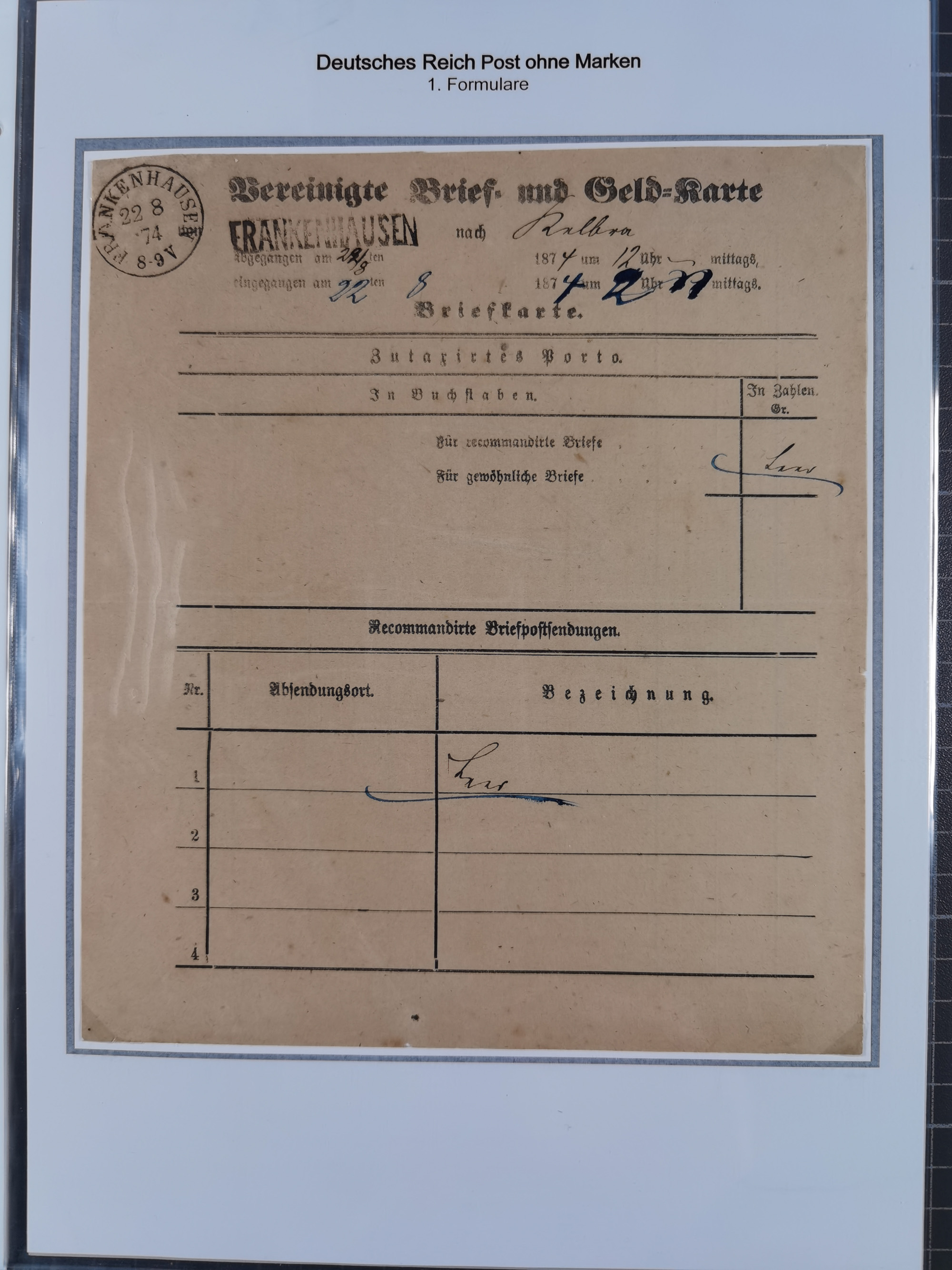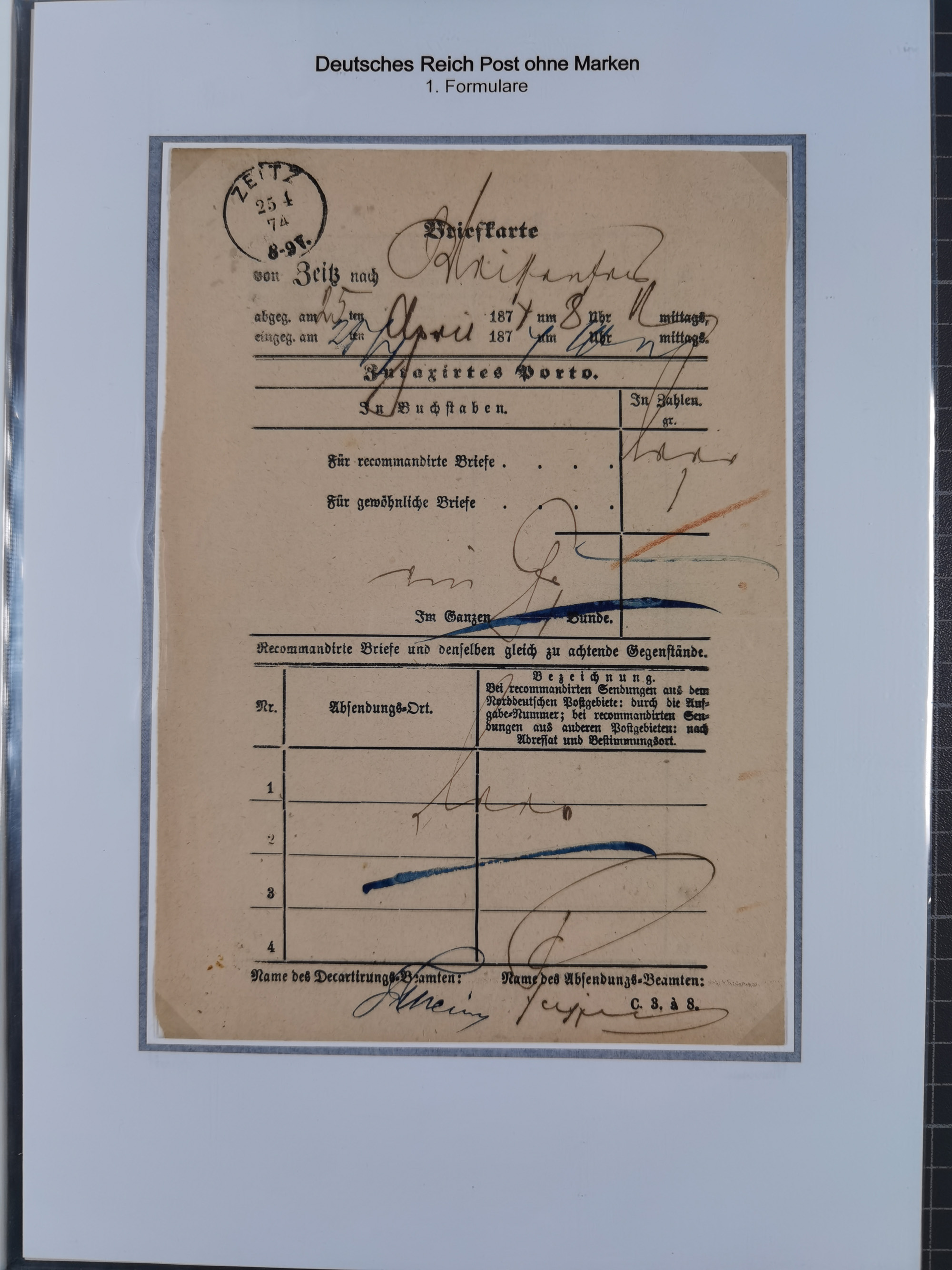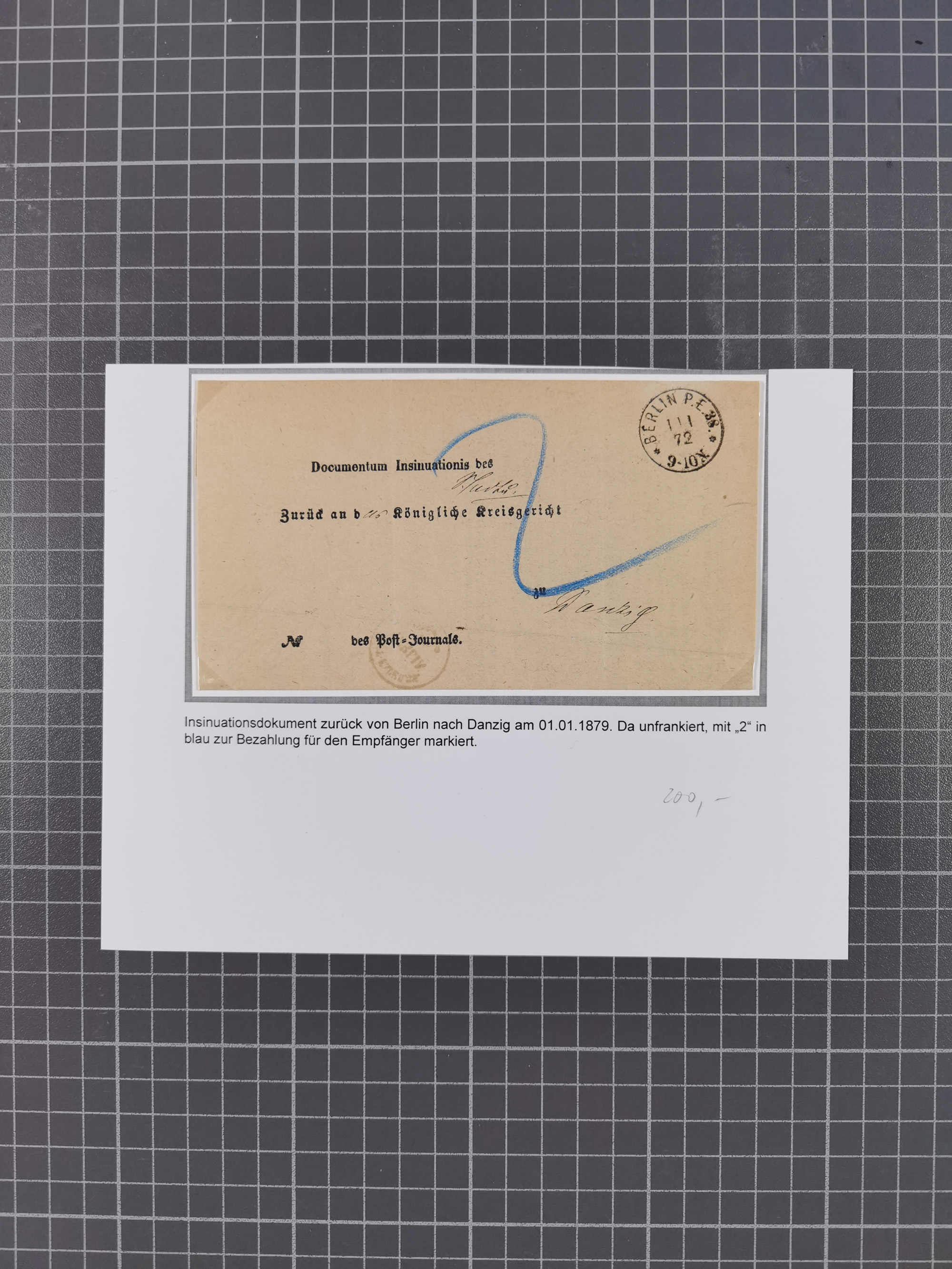 1872/75, sehr interessante Partie mit 18 markenlosen Formularen und Verwendungen. Dabei u.a. großformatiger Wertbrief mit EKr. “BERLIN. H.P.A. 24.4.74” (KBHW 52) und blauem Tax-Vermerk “5½” (FA Krug BPP), Formular “Bestellung per Express” von “WITTENBERG” 1874, Paketbegeit-Postkarte 1873 nach Dresden mit violettem Zettel “..Steuer-Expedit. im Hof-Postamt” und kpl. Feldpost-Paketbegleitbrief mit DKr. “K.PR. FELDPOST-STATION No.20” (Toul). Dazu zwei Briefhüllen mit Dienstmarke “DI”, meist in guter Erhaltung, ex Untermann