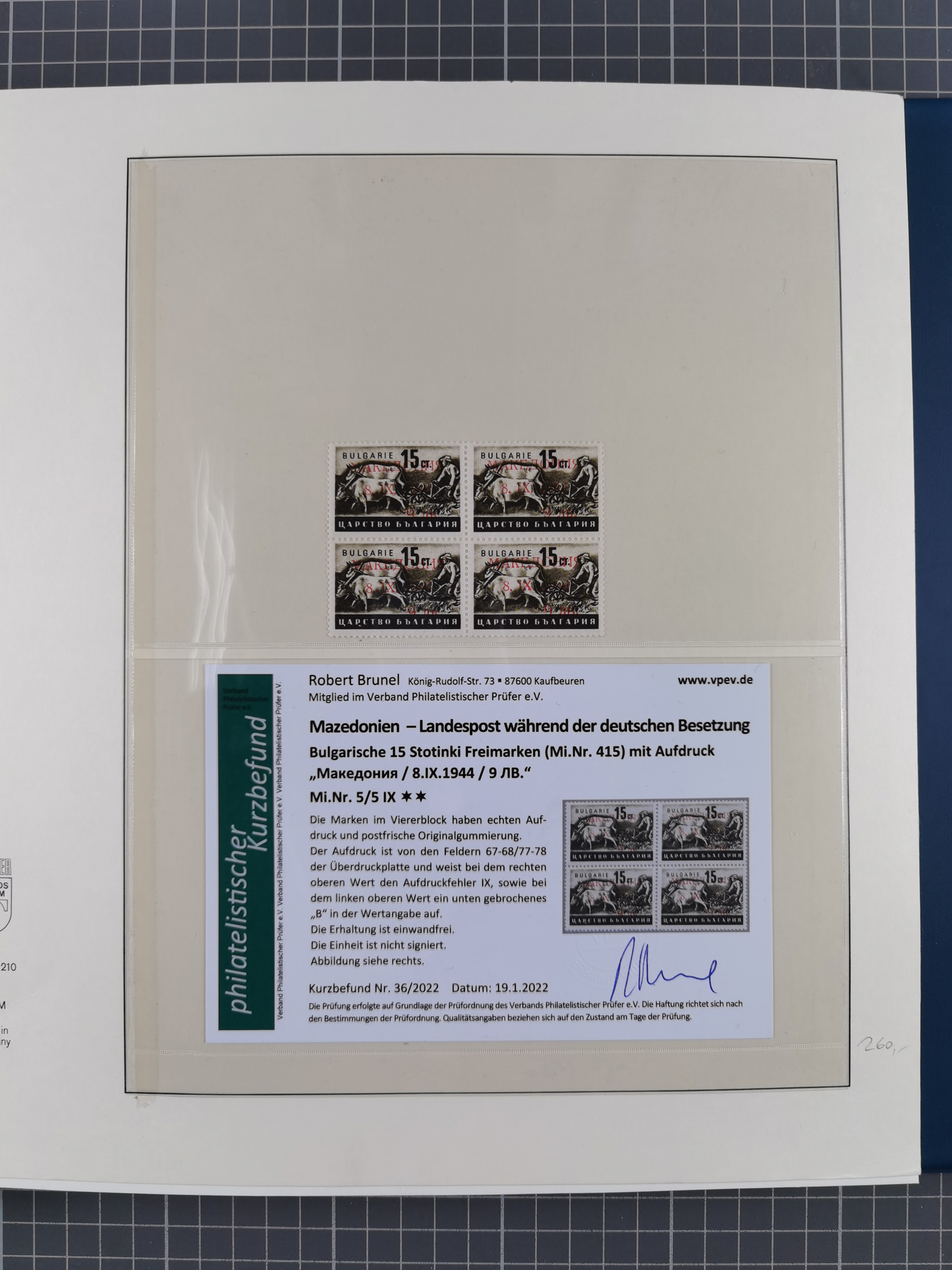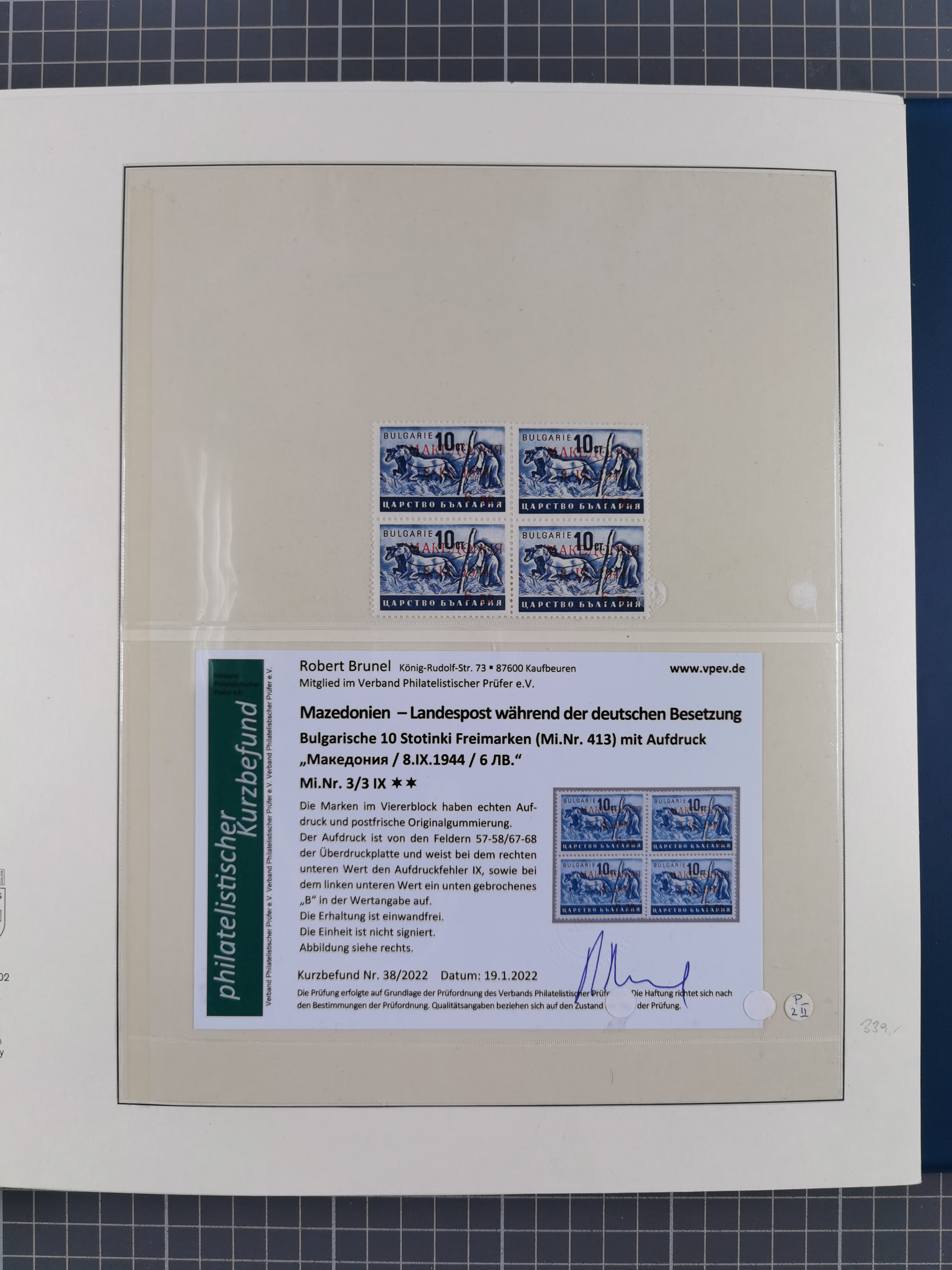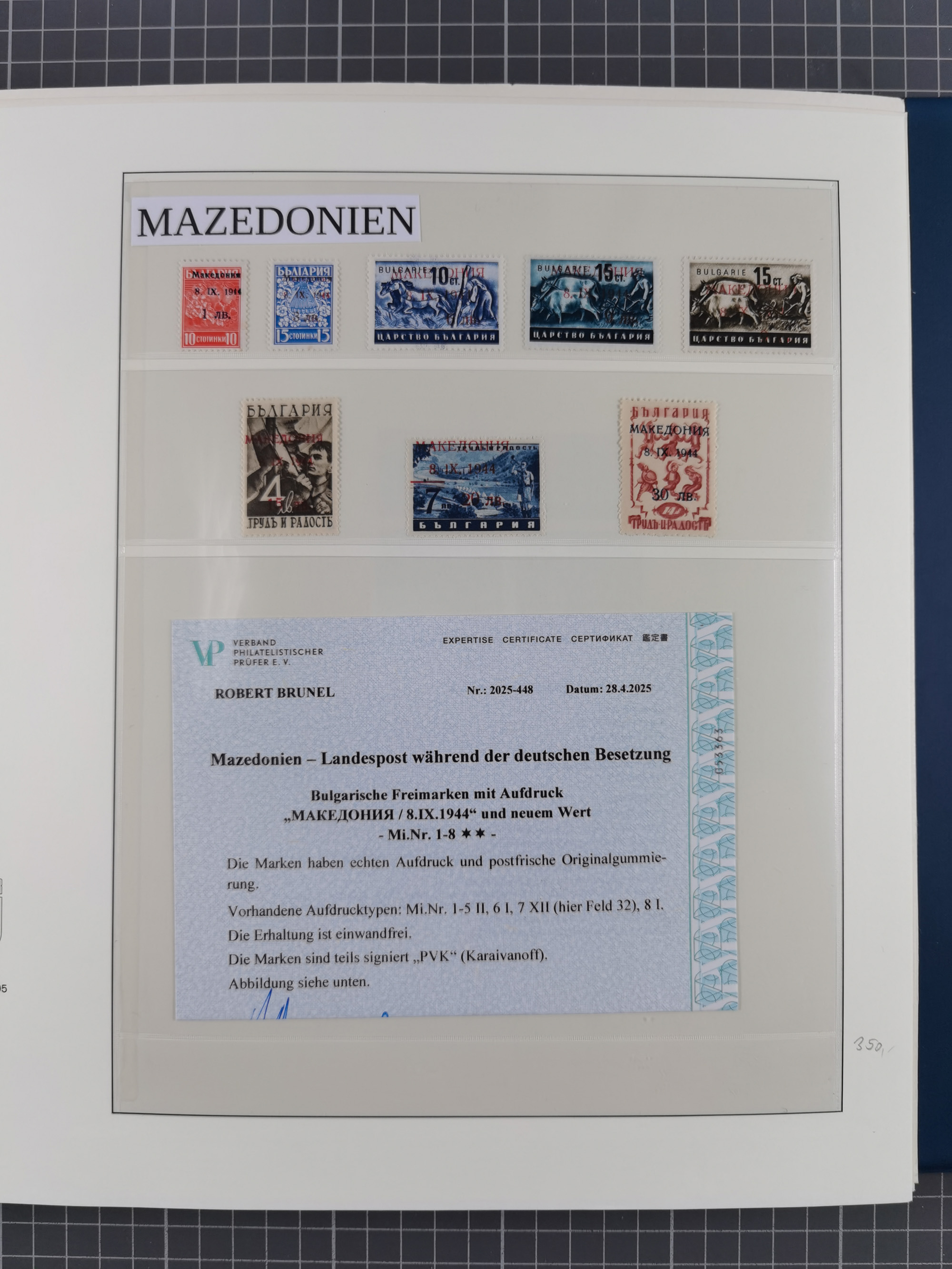 1944, umfangreiche, meist postfrische und gestempelte Sammlung mit vielen Einheiten, gestempelten Bogenteilen, Aufdruck-Abarten, Plattenfehlern und weiteren Besonderheiten, dabei u.a. Mi.-Nr. 1ZW zweimal mit Unterrand mit Bogennummer postfrisch (sign. Hristov BPP mit FA), 1VF postfrisch, 1 DD postfrisch (signiert), 2 FII im waagerechten Paar postfrisch (FA Dr. El Majdoub BPP), 2FV postfrisch (FA Dr. El Majdoub BPP), 2KII postfrisch, 2 DKII postfrisch (FA Dr. El Majdoub BPP (2025), 3 FII postfrisch, 4KW im Viererblock mit Normalmarken postfrisch (signiert), 5 KW im Paar mit Normalmarke postfrisch (FA Dr. El Majdoub BPP), 6FVIII postfrisch mit Unterrand, 8VIII im Paar mit Normalmarke gestempelt (FA Dr. El Majdoub BPP) und Mi.-Nr. 8KI in einer Einheit mit fünf weiteren Marken (mit Falzen auf Zerifikat Karaivanoff (1955) geklebt). Dazu Umschlag mit weiteren losen Marken und vielen Einheiten/Bogenteilen. Ein außergewöhnliches und empfehlenswertes Objekt