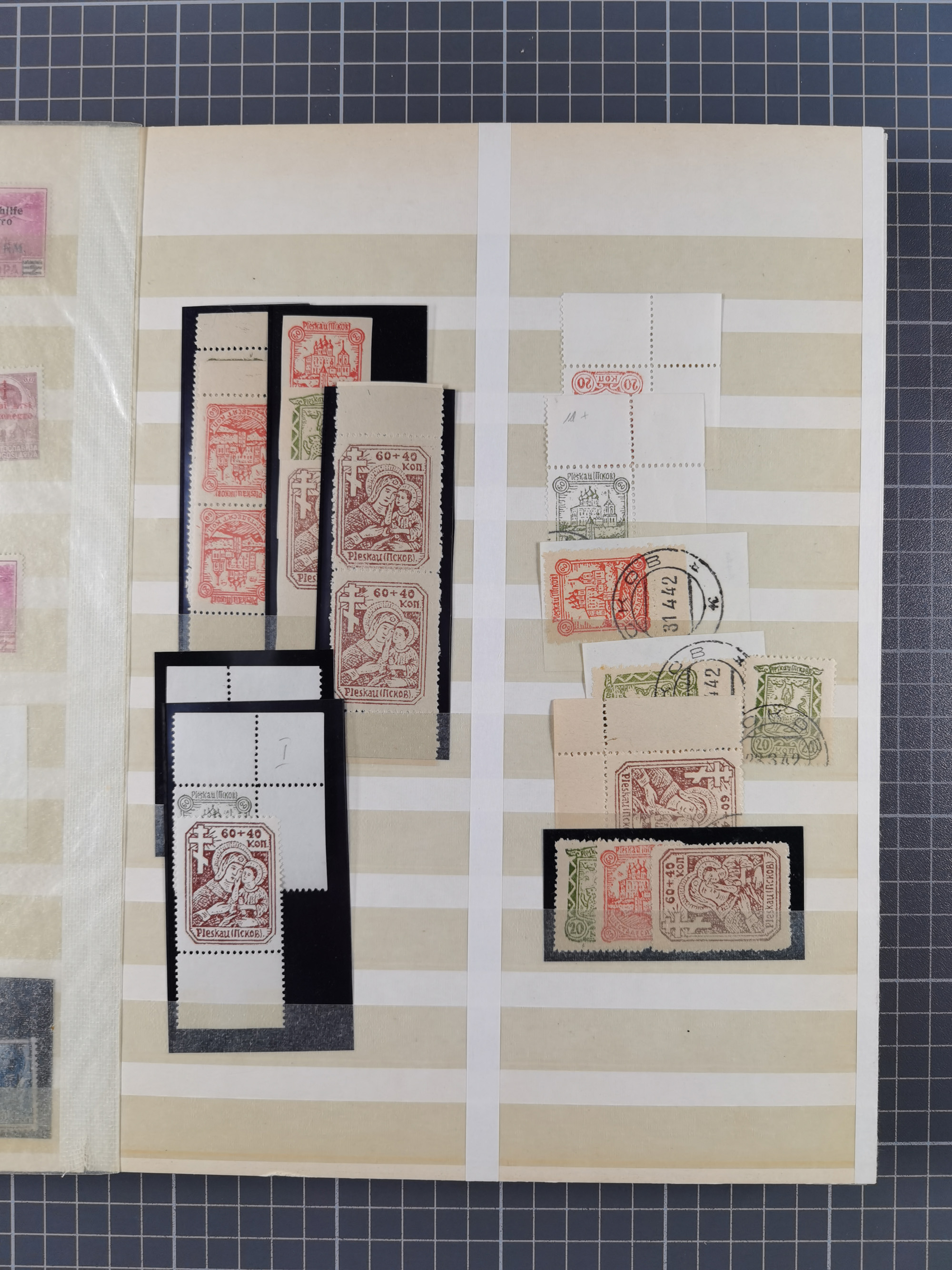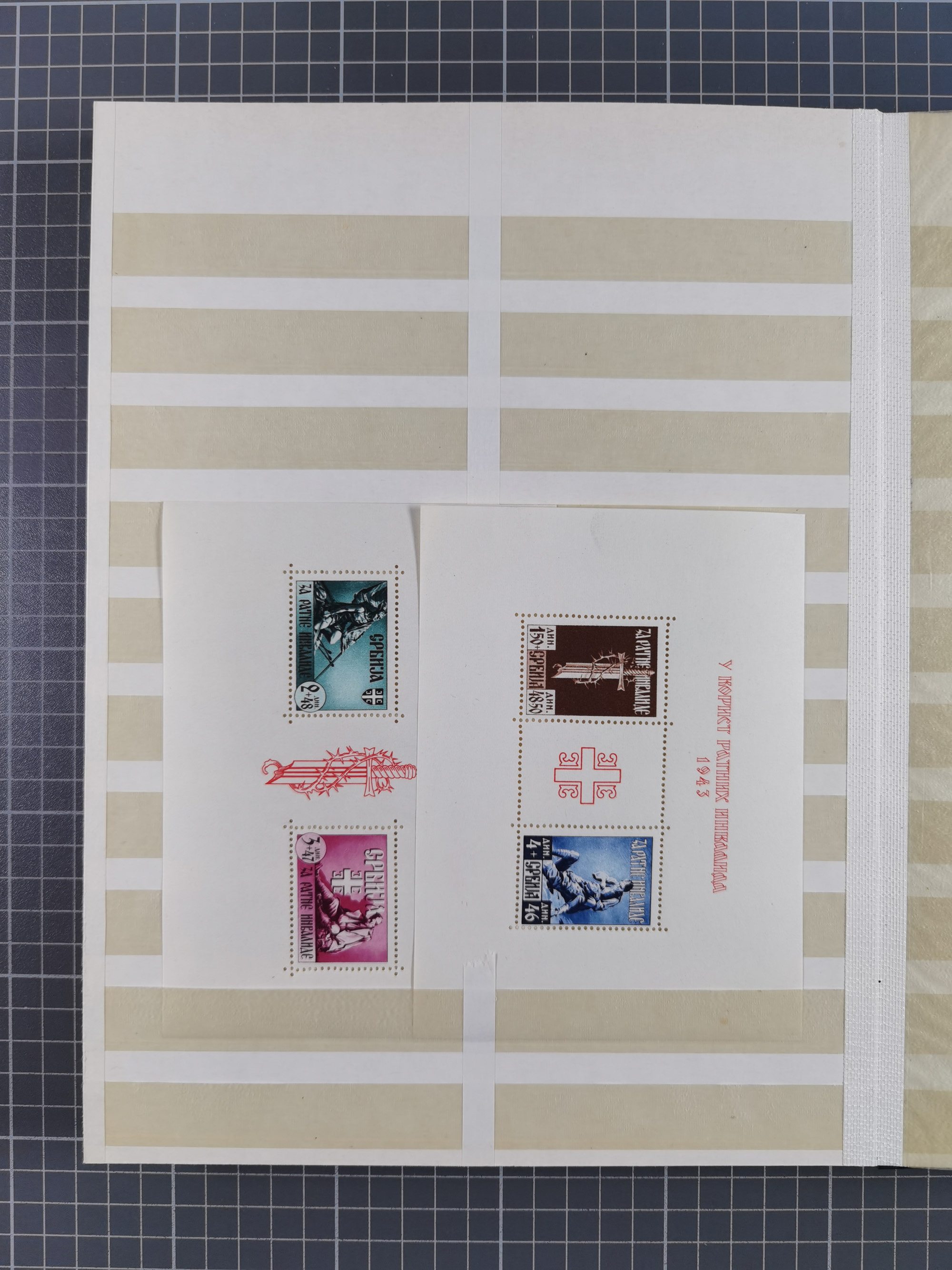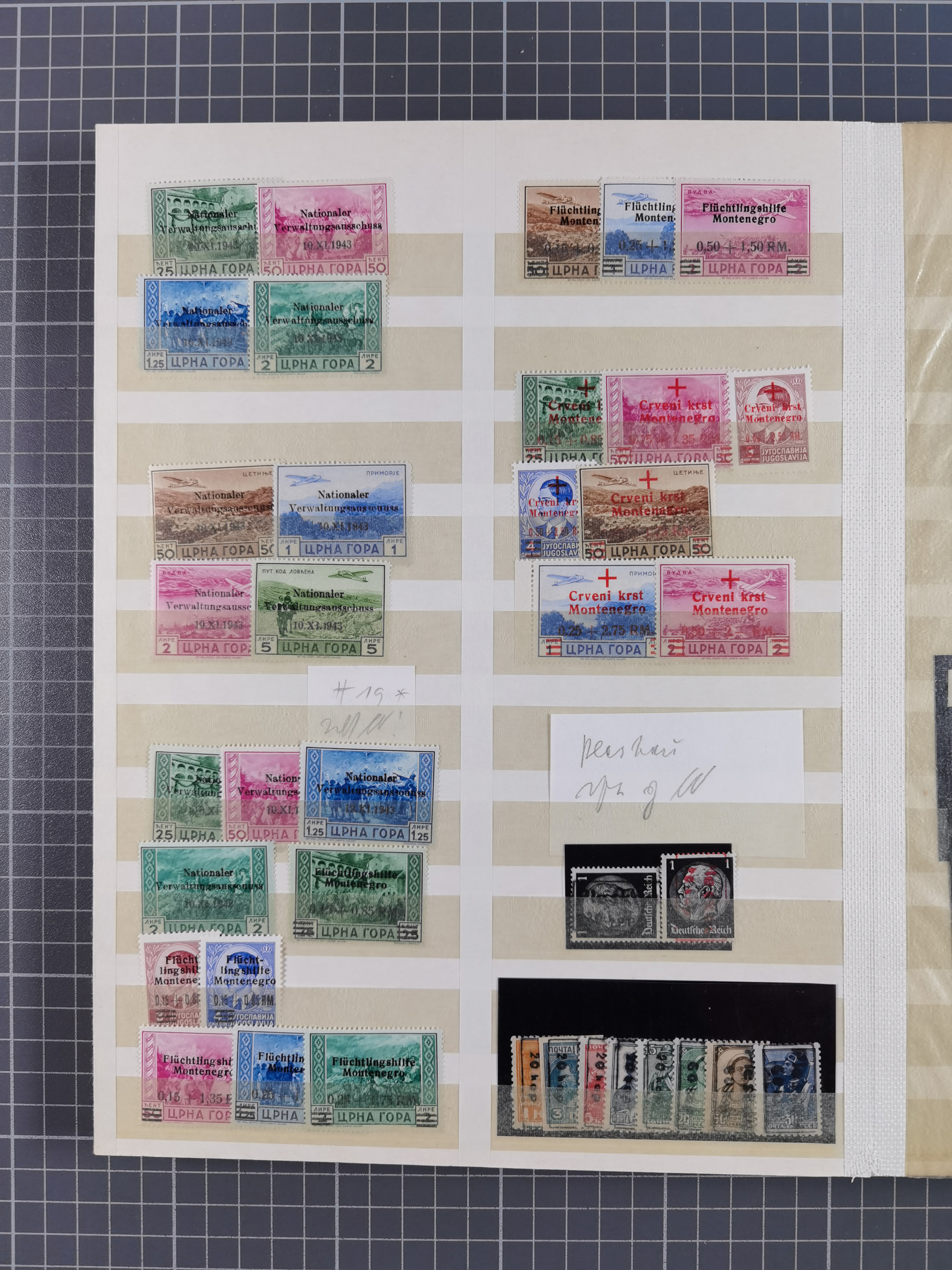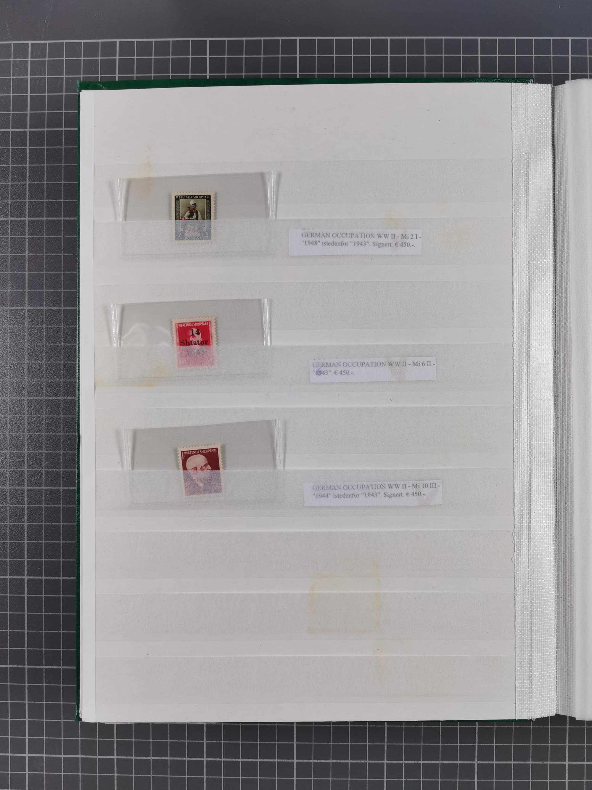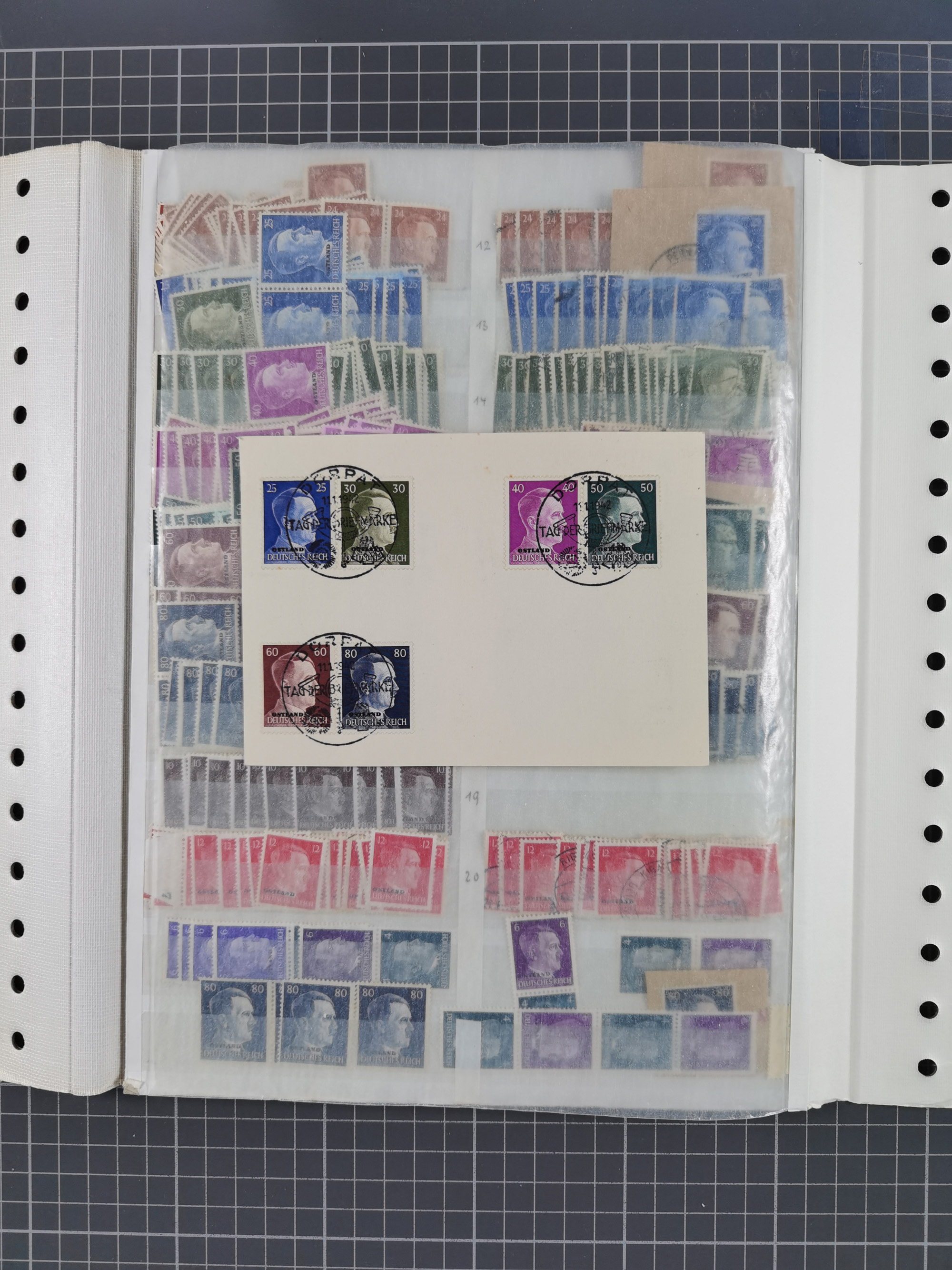 1943, Fälschungssammlung, postfrisch sowie auf Blanko-Umschlägen, dabei 19 mal Mi.-Nr. 21-22 und 28,32 je auf Blanko-Umschlag mit falschem Stempel, die falsch gestempelten Werte oft mit echten Aufdrucken, sauber auf insgesamt 31 großen Steckkarten, dabei einige alte Diena Atteste