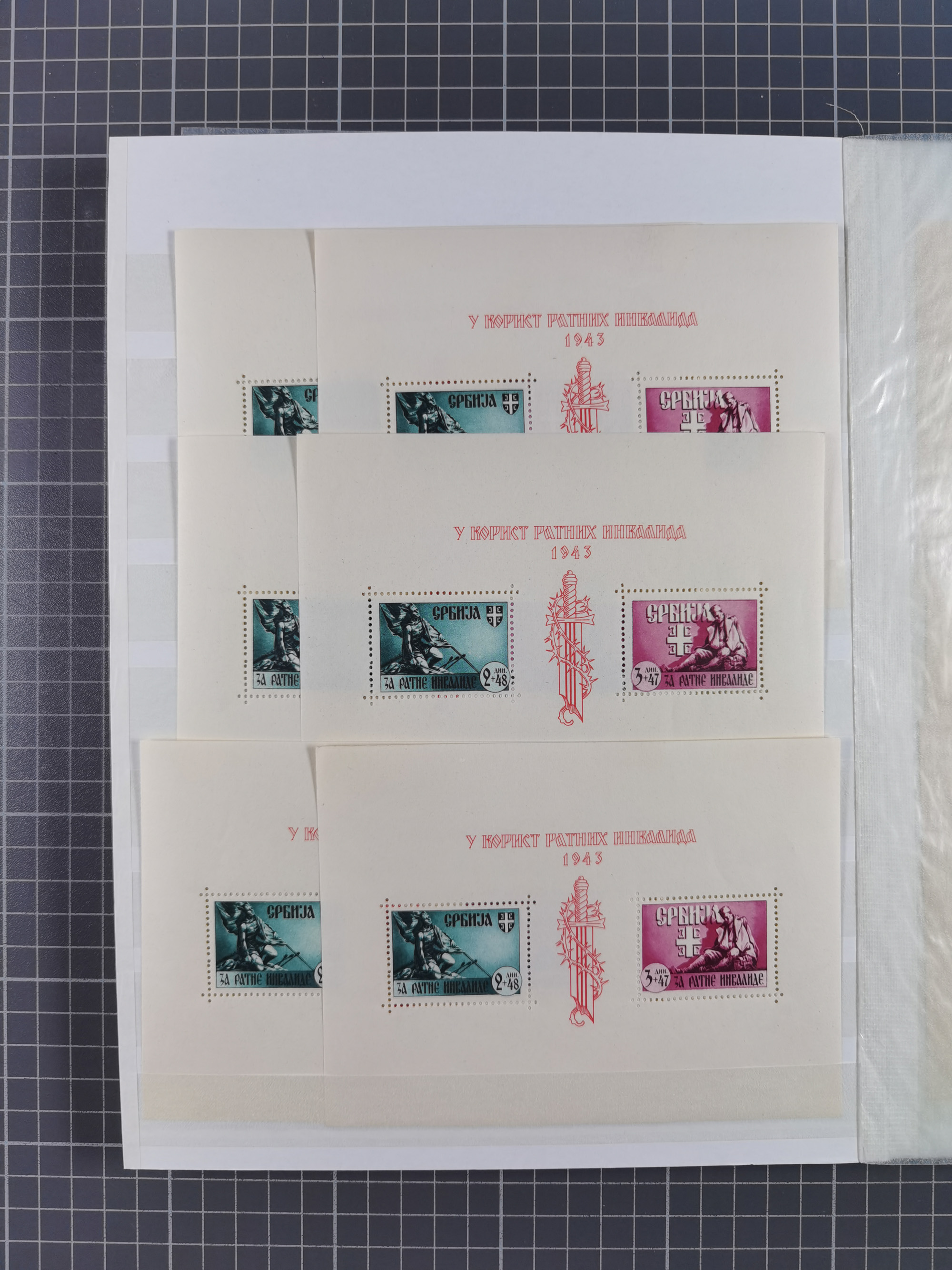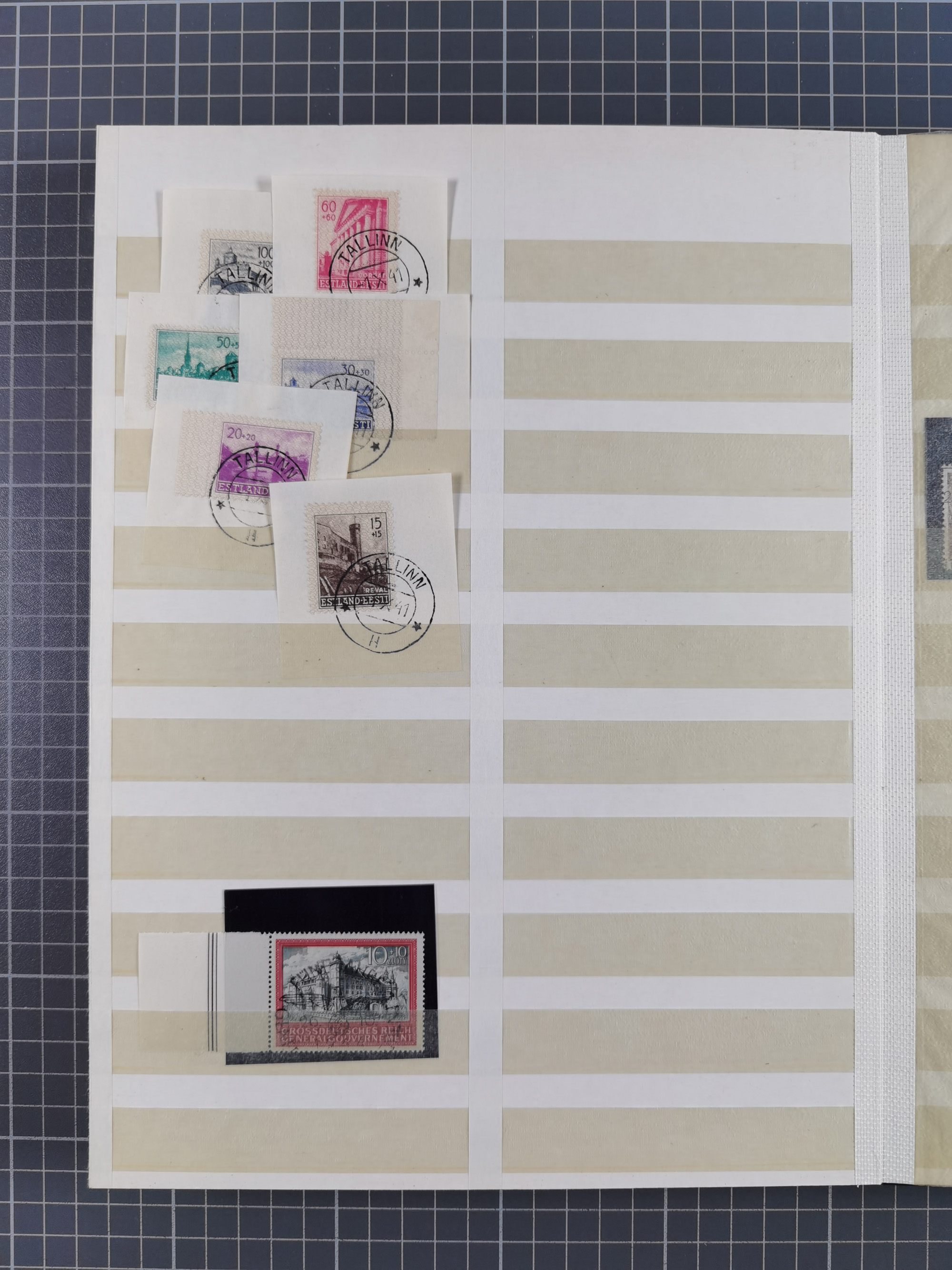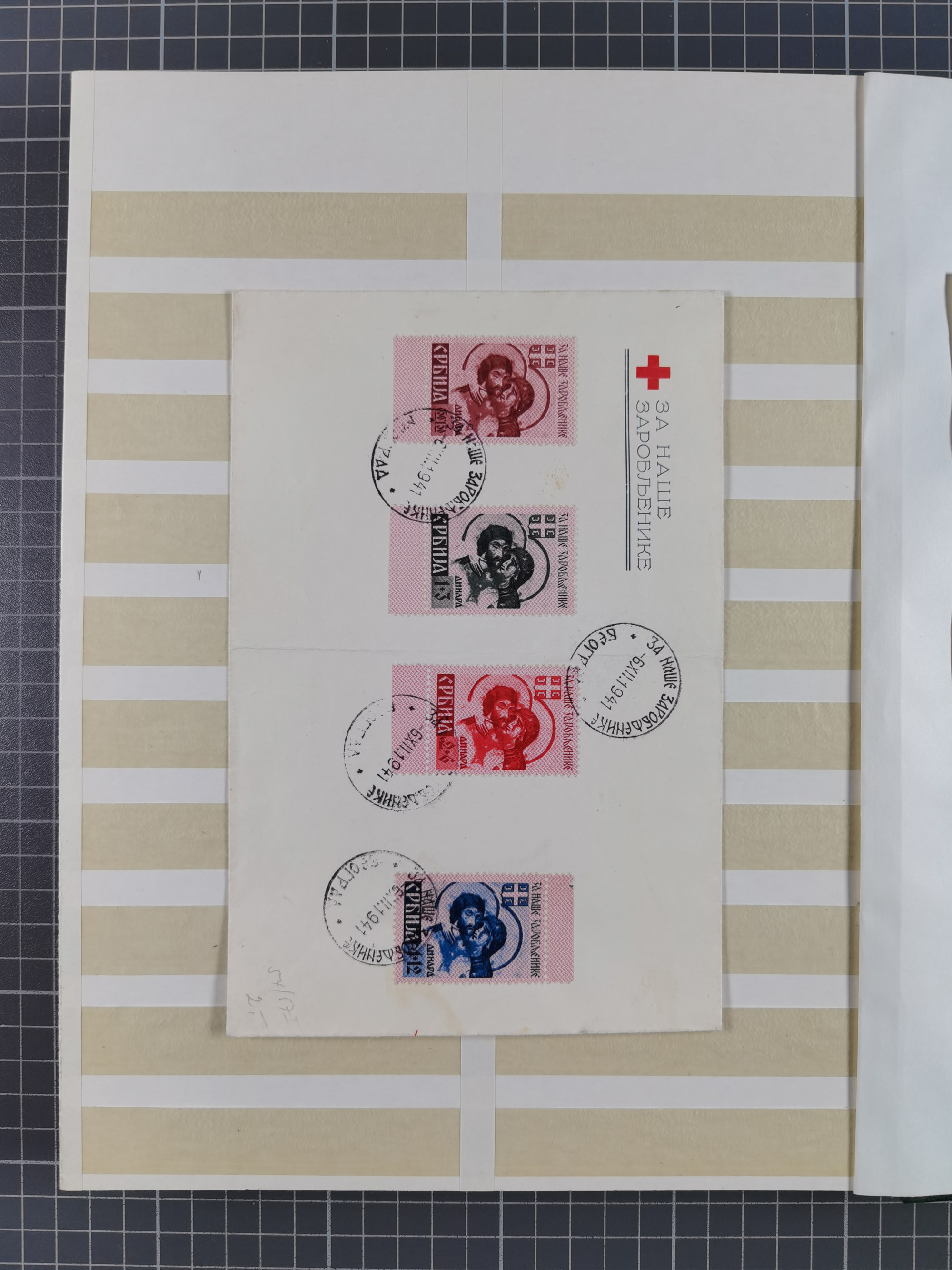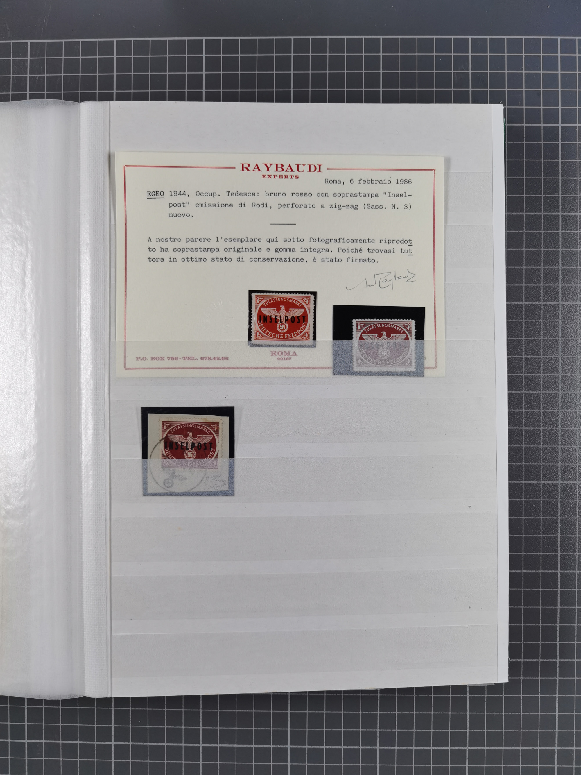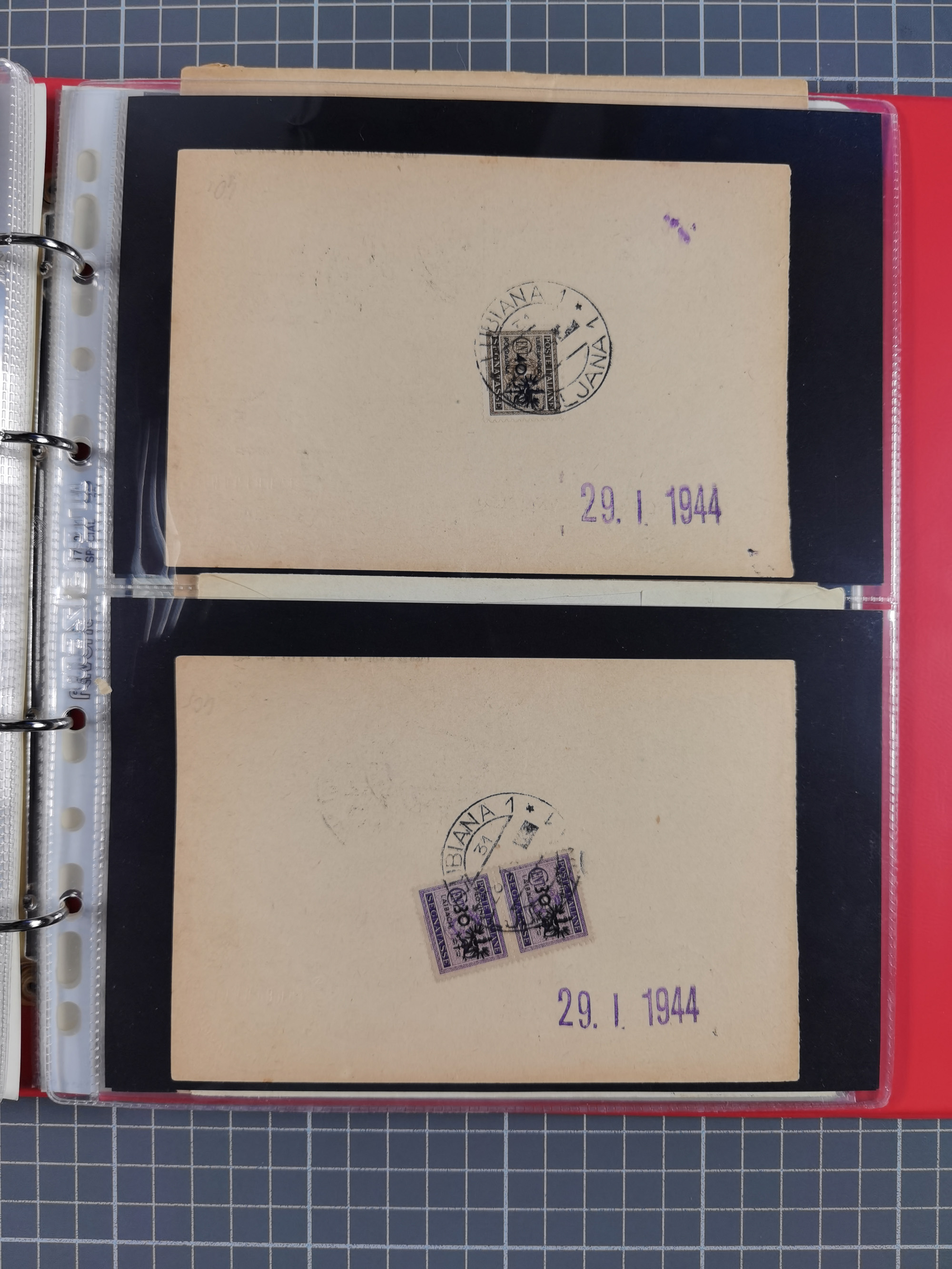 1943, Fälschungssammlung, postfrisch sowie auf Blanko-Umschlägen, dabei 19 mal Mi.-Nr. 21-22 und 28,32 je auf Blanko-Umschlag mit falschem Stempel, die falsch gestempelten Werte oft mit echten Aufdrucken, sauber auf insgesamt 31 großen Steckkarten, dabei einige alte Diena Atteste