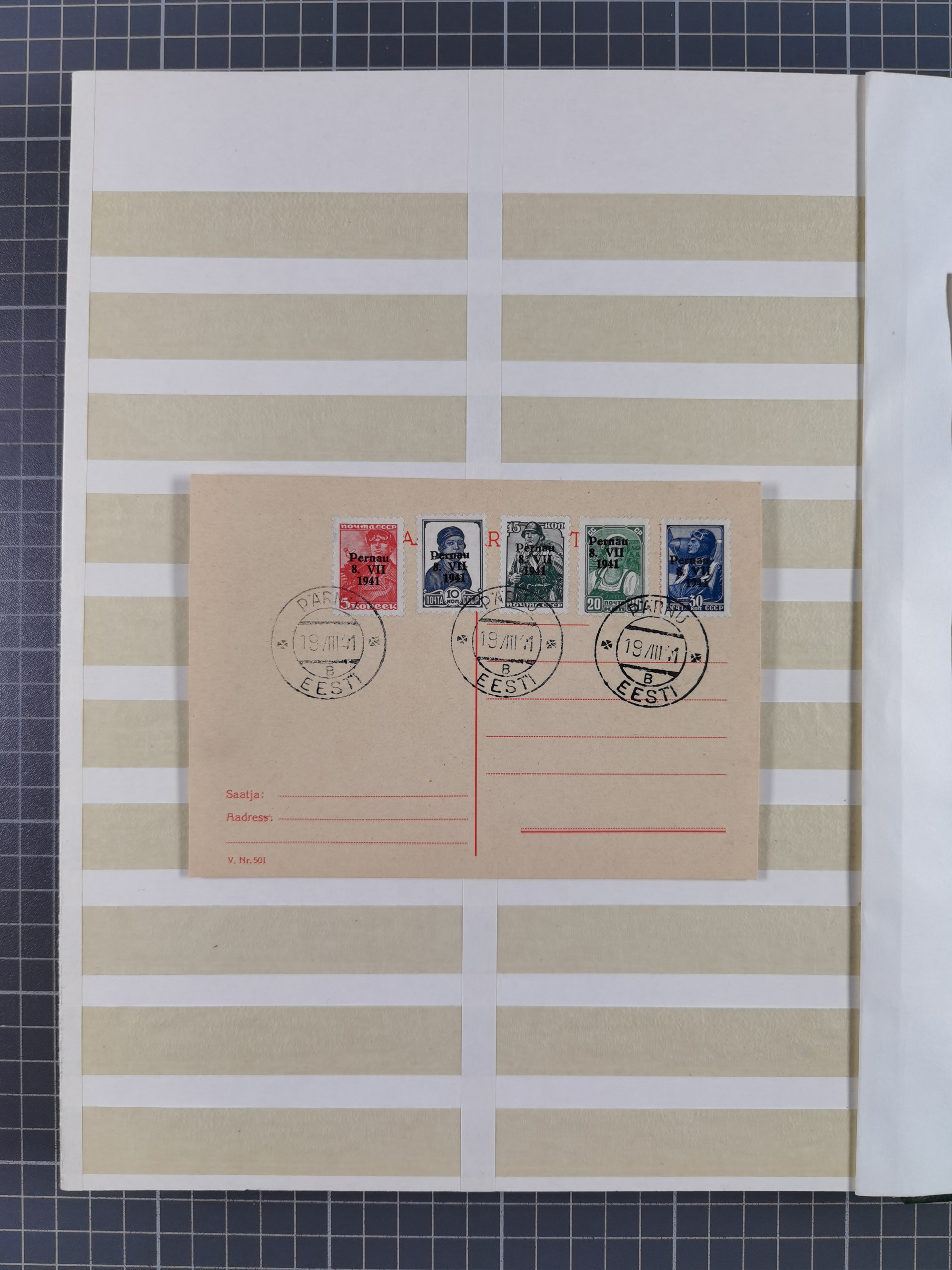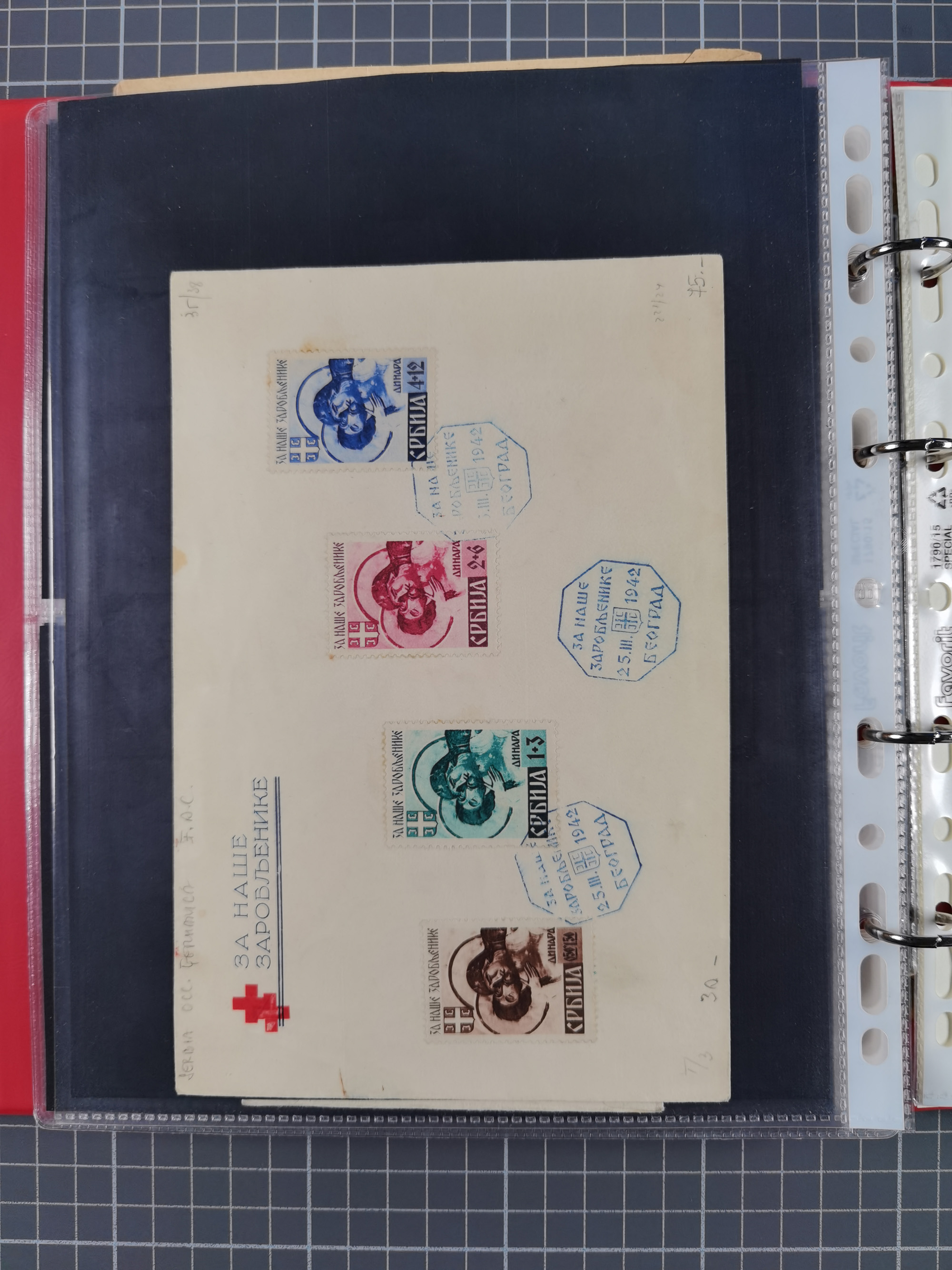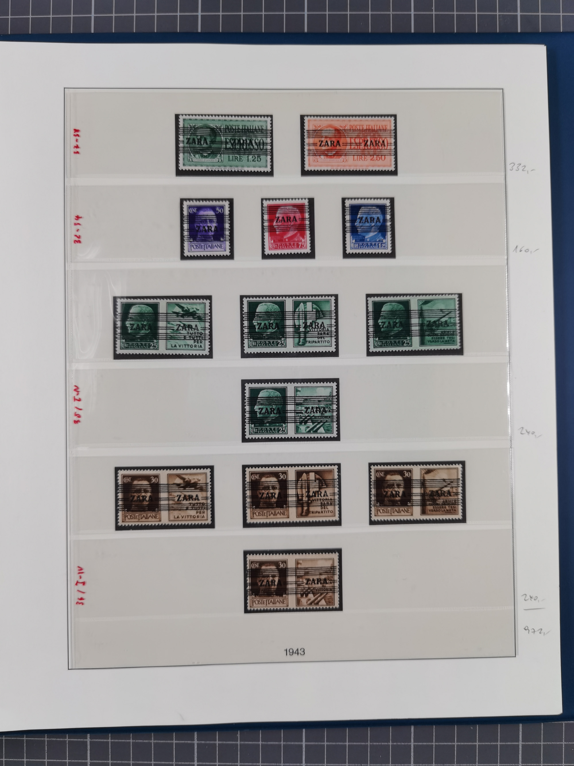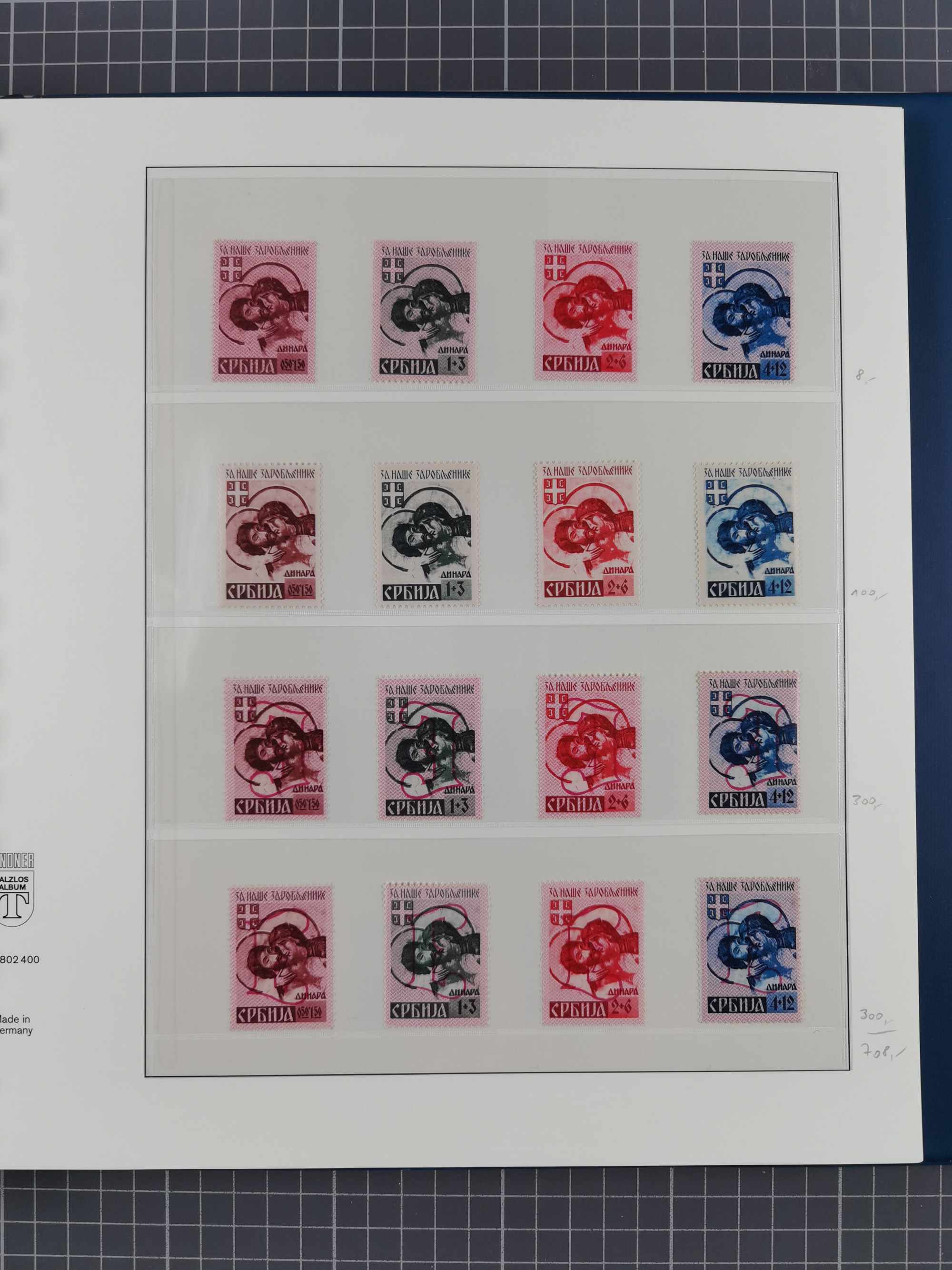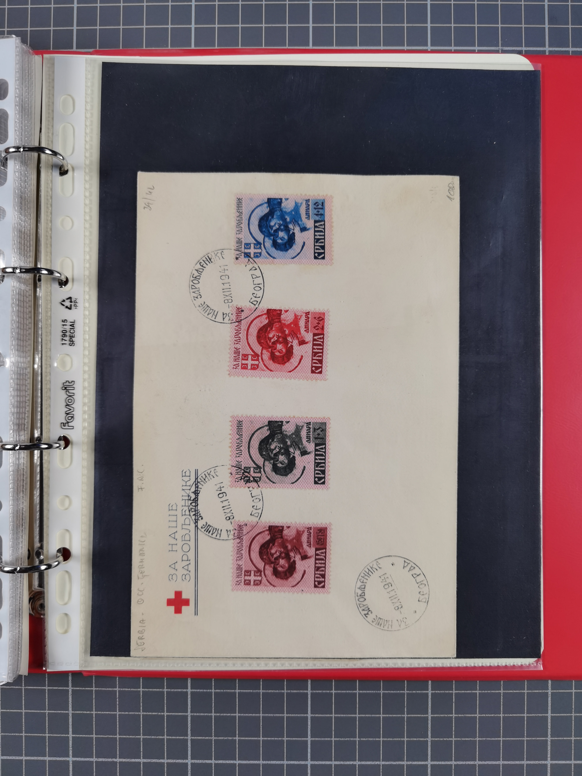1943, Fälschungssammlung, postfrisch sowie auf Blanko-Umschlägen, dabei 19 mal Mi.-Nr. 21-22 und 28,32 je auf Blanko-Umschlag mit falschem Stempel, die falsch gestempelten Werte oft mit echten Aufdrucken, sauber auf insgesamt 31 großen Steckkarten, dabei einige alte Diena Atteste