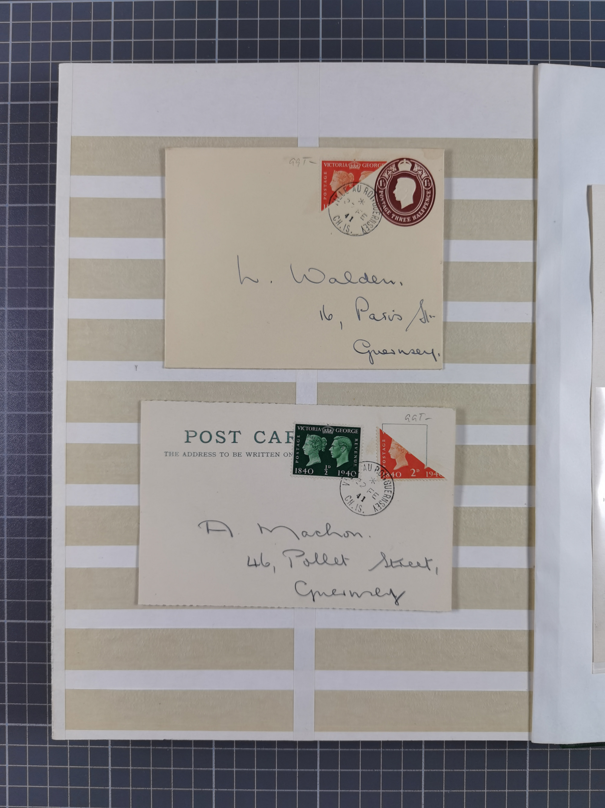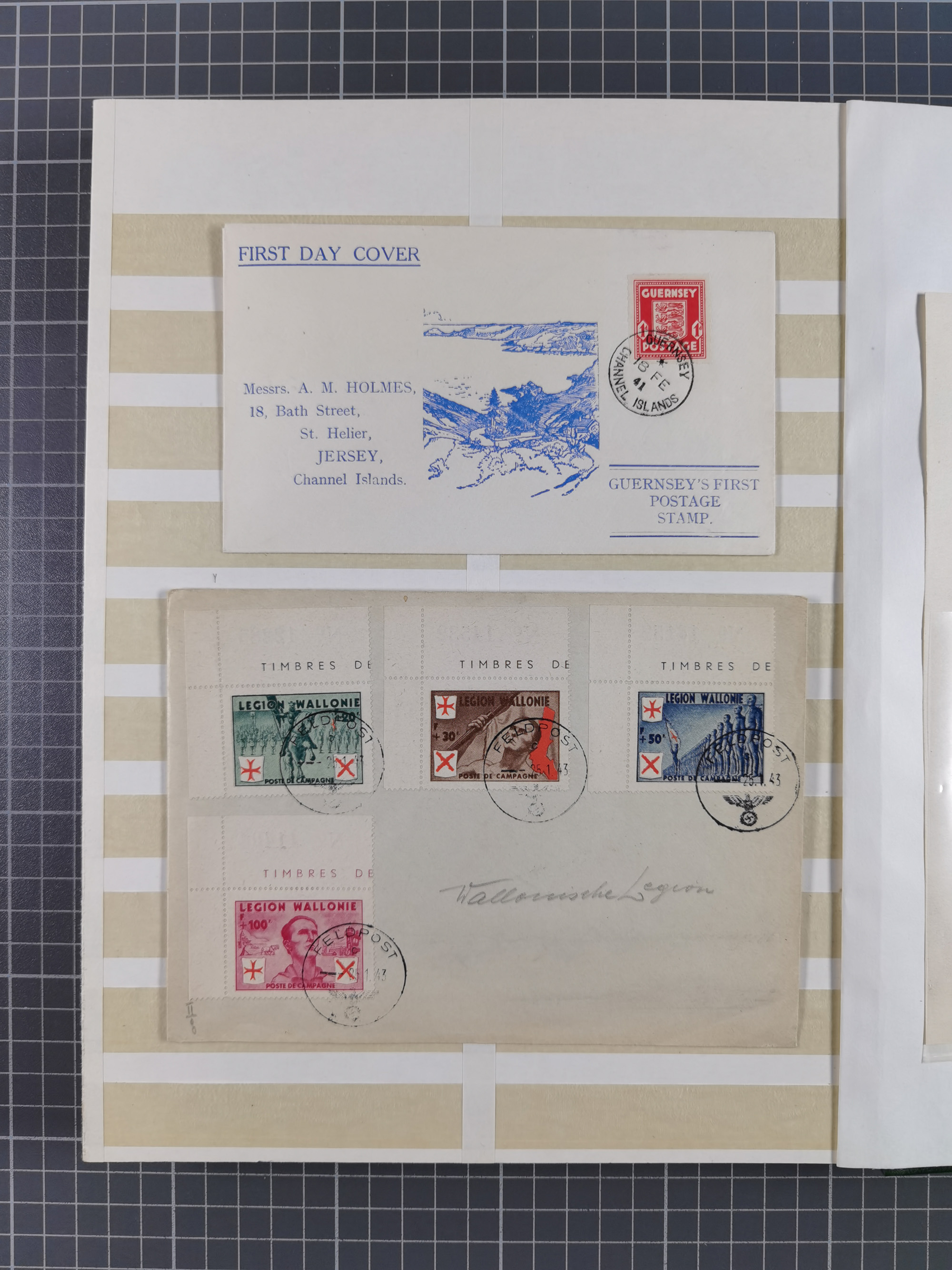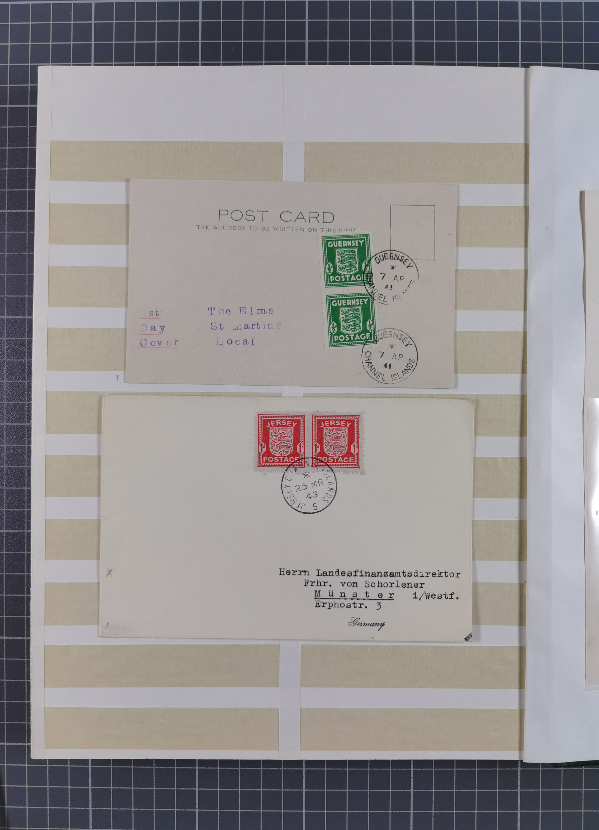 1941/43, Five covers including Guernsey Centenary 2 d. bisected diagonally on envelope addressed locally FE/27/41, and Jersey 1943 reg. cover each stamp with first day cancel, fine group (Michel 3-8, II)