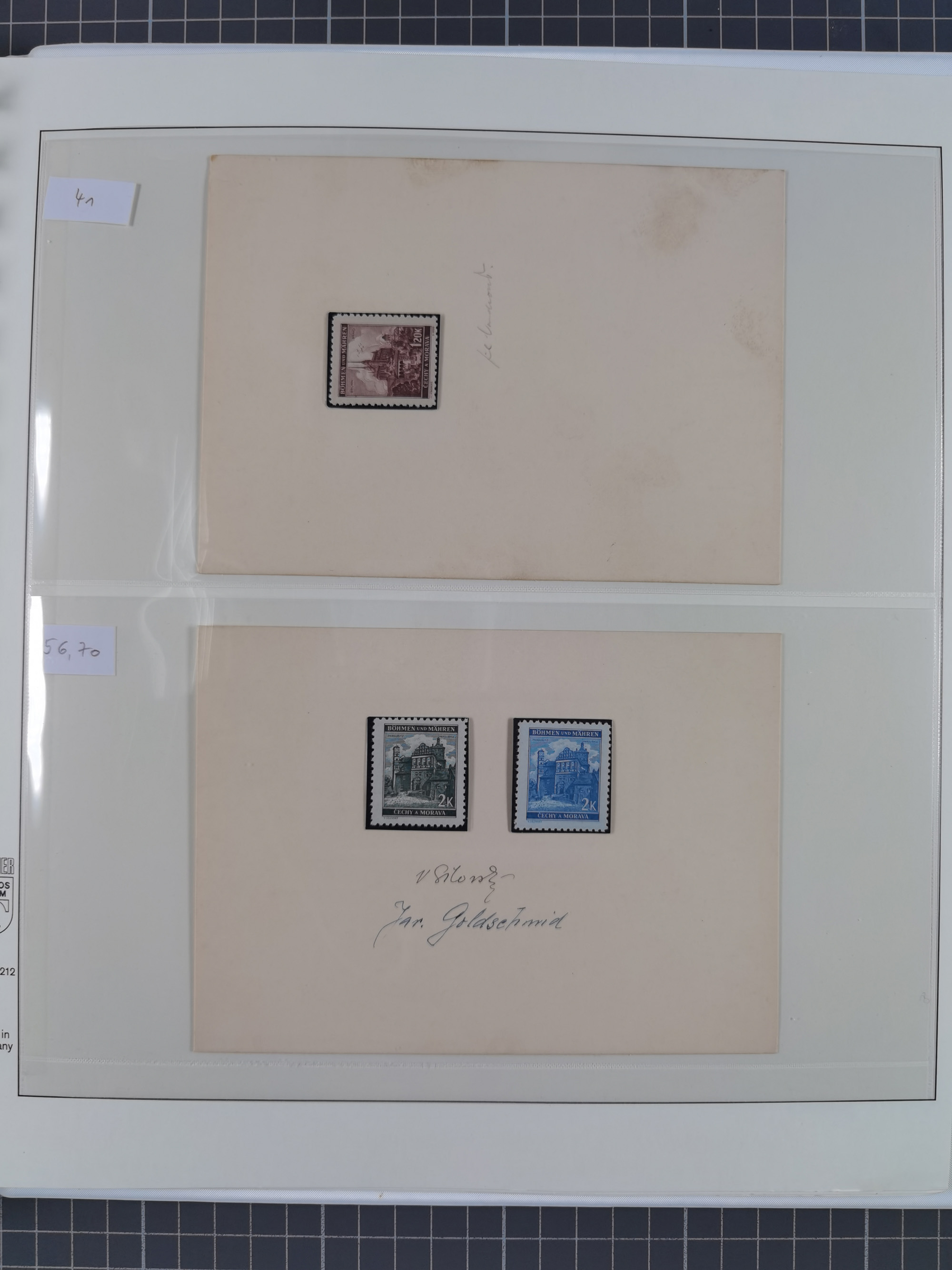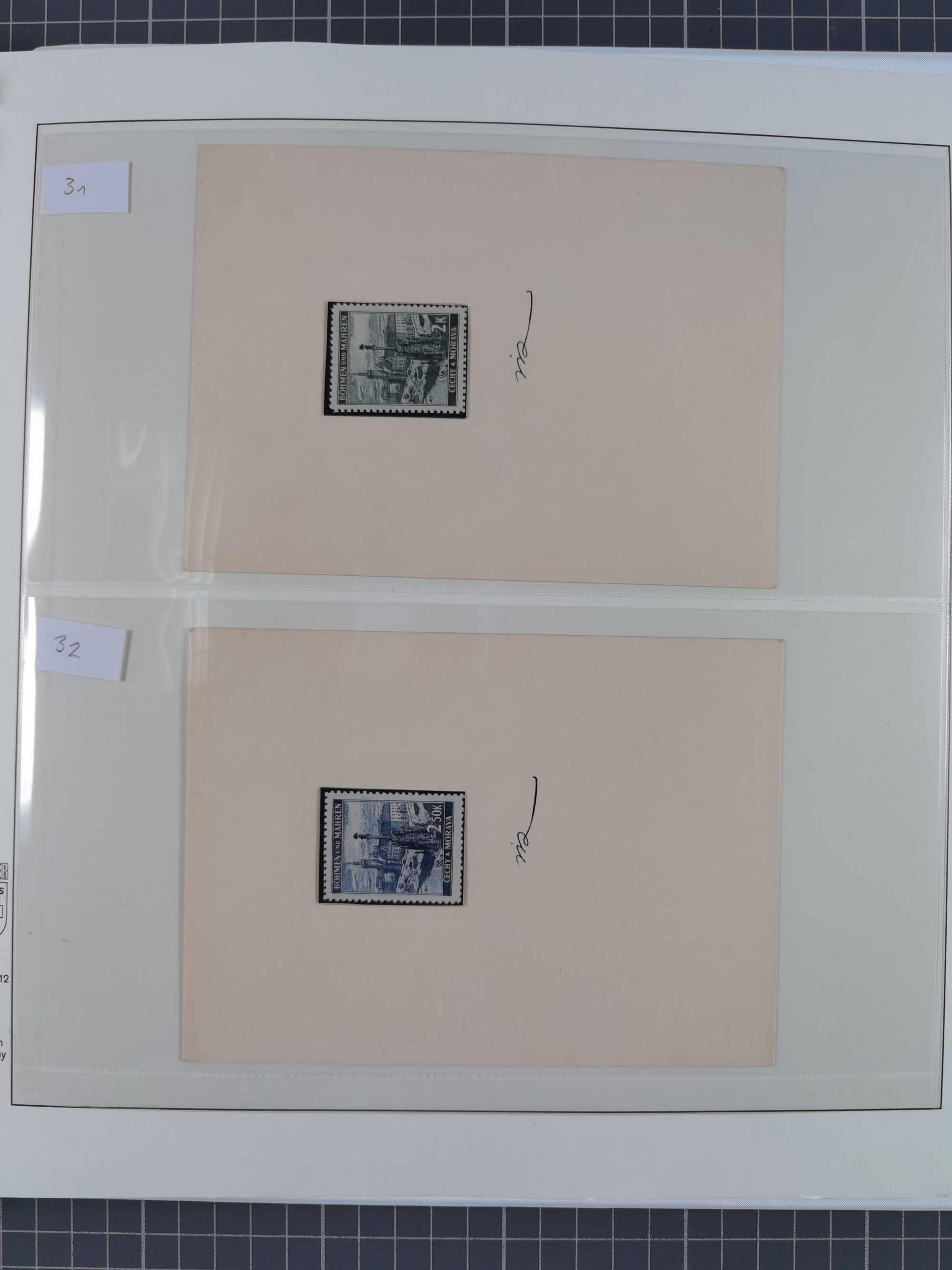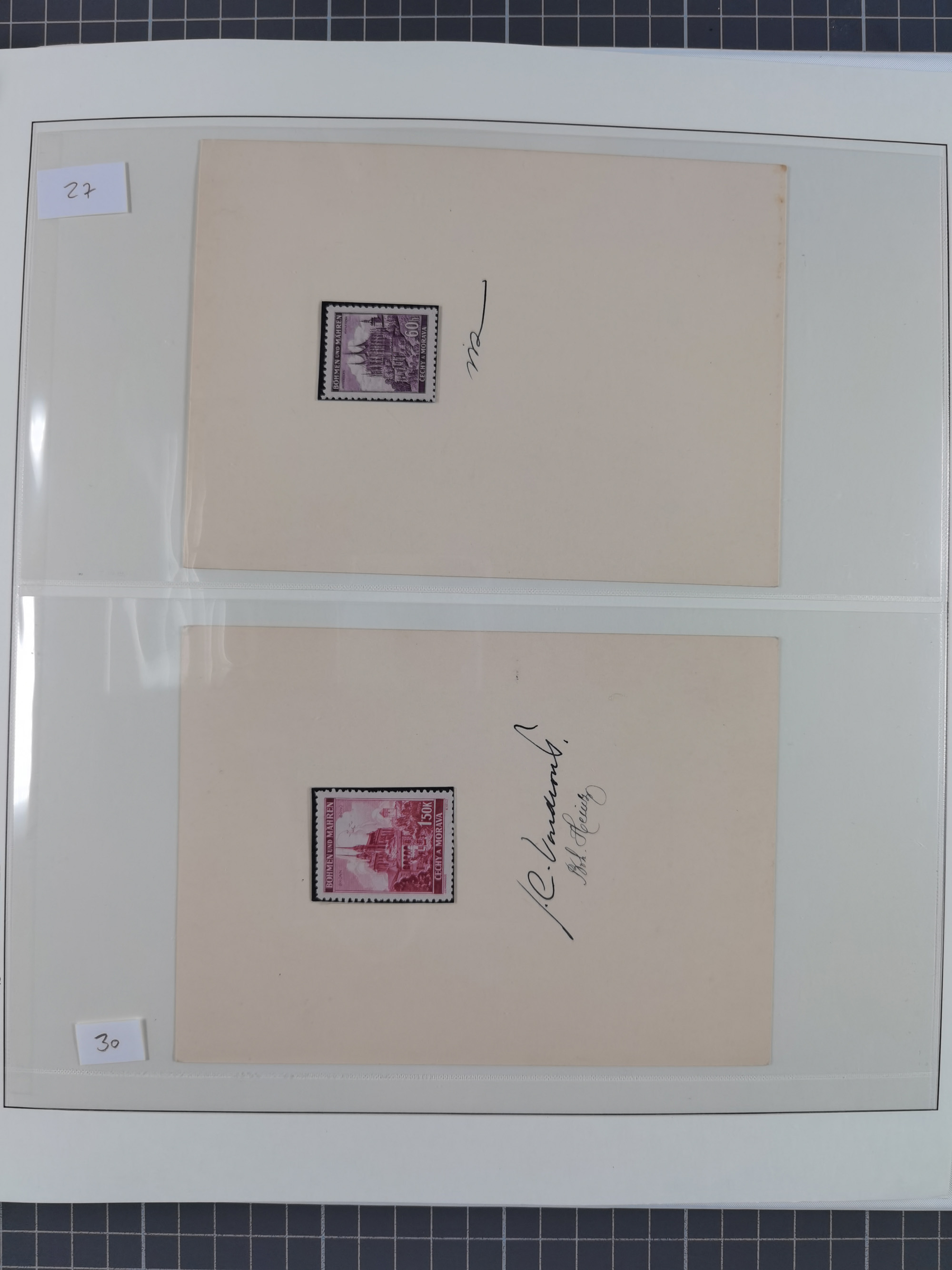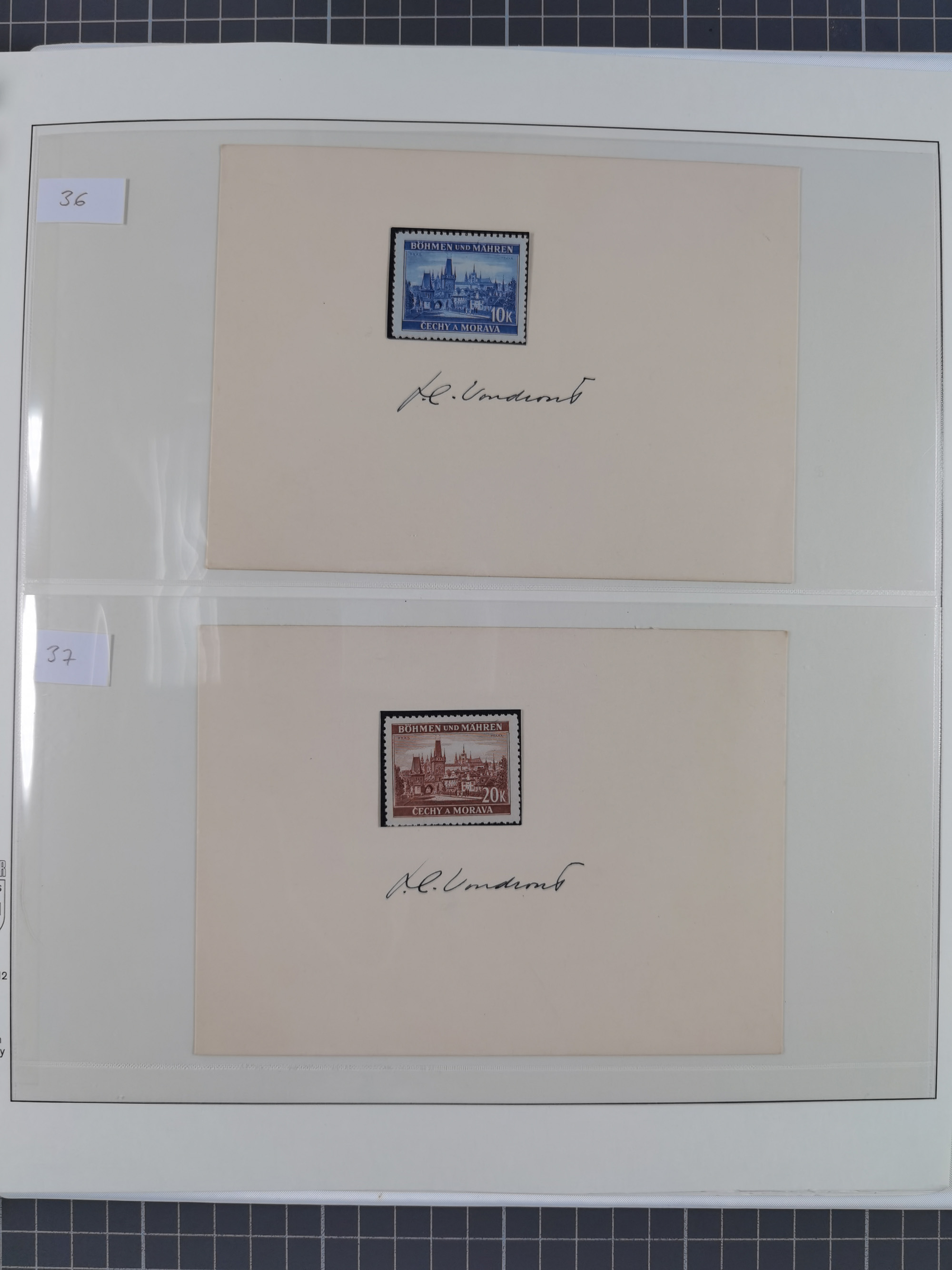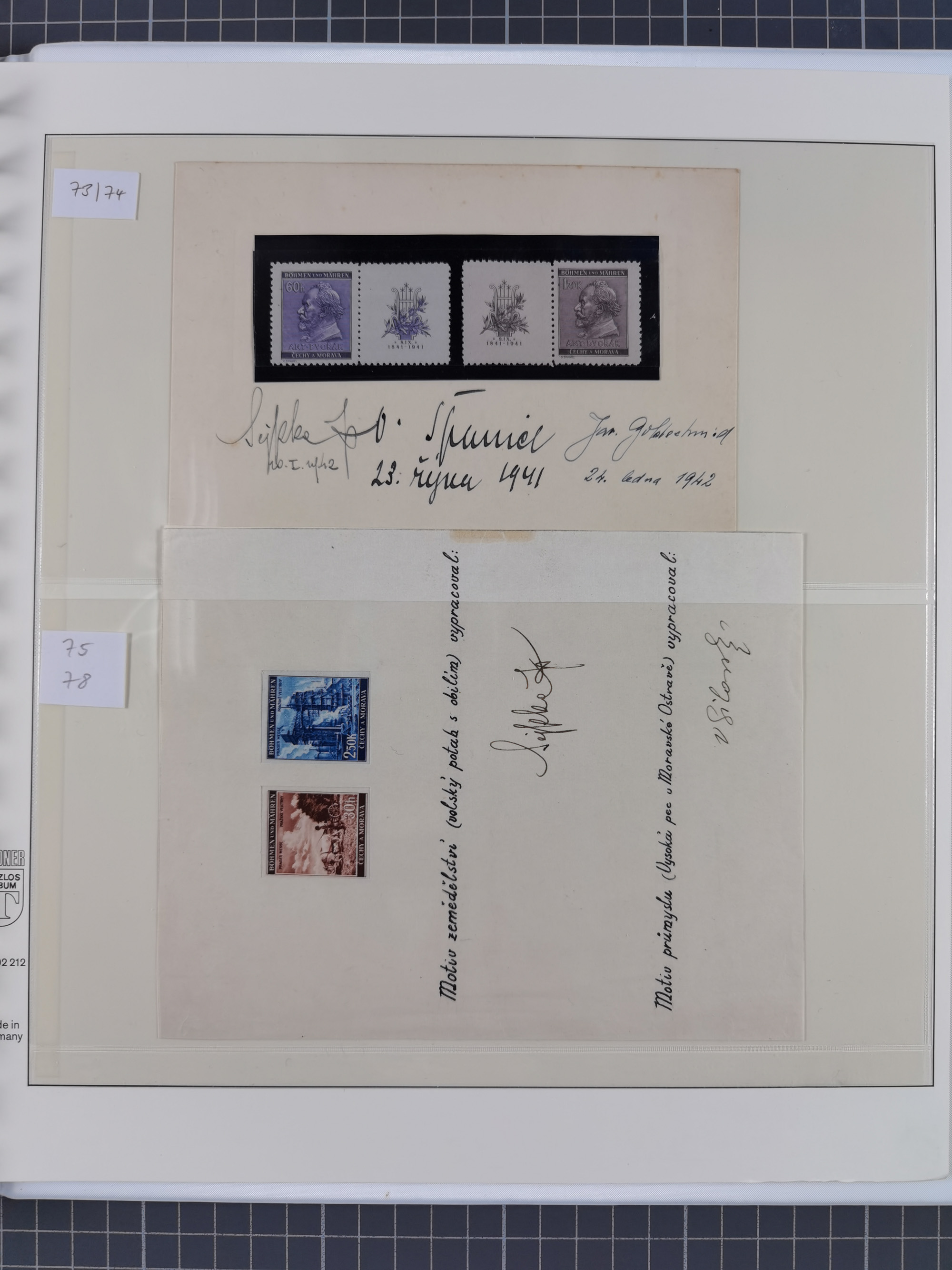 1939/45, interessante Partie, weißer Kärtchen mit Original-Unterschrift des Entwerfers wie Prof. Alois Schaumann, Karel Vik, Bohumil Heinz, Jan Vondrous, Vladimir Silovsky, Prof. Josef Sejpka, Jan Goldschmied und Alfred Erhardt, die Marken meist postfrisch, insgesamt 36 Stück, sehr interessant