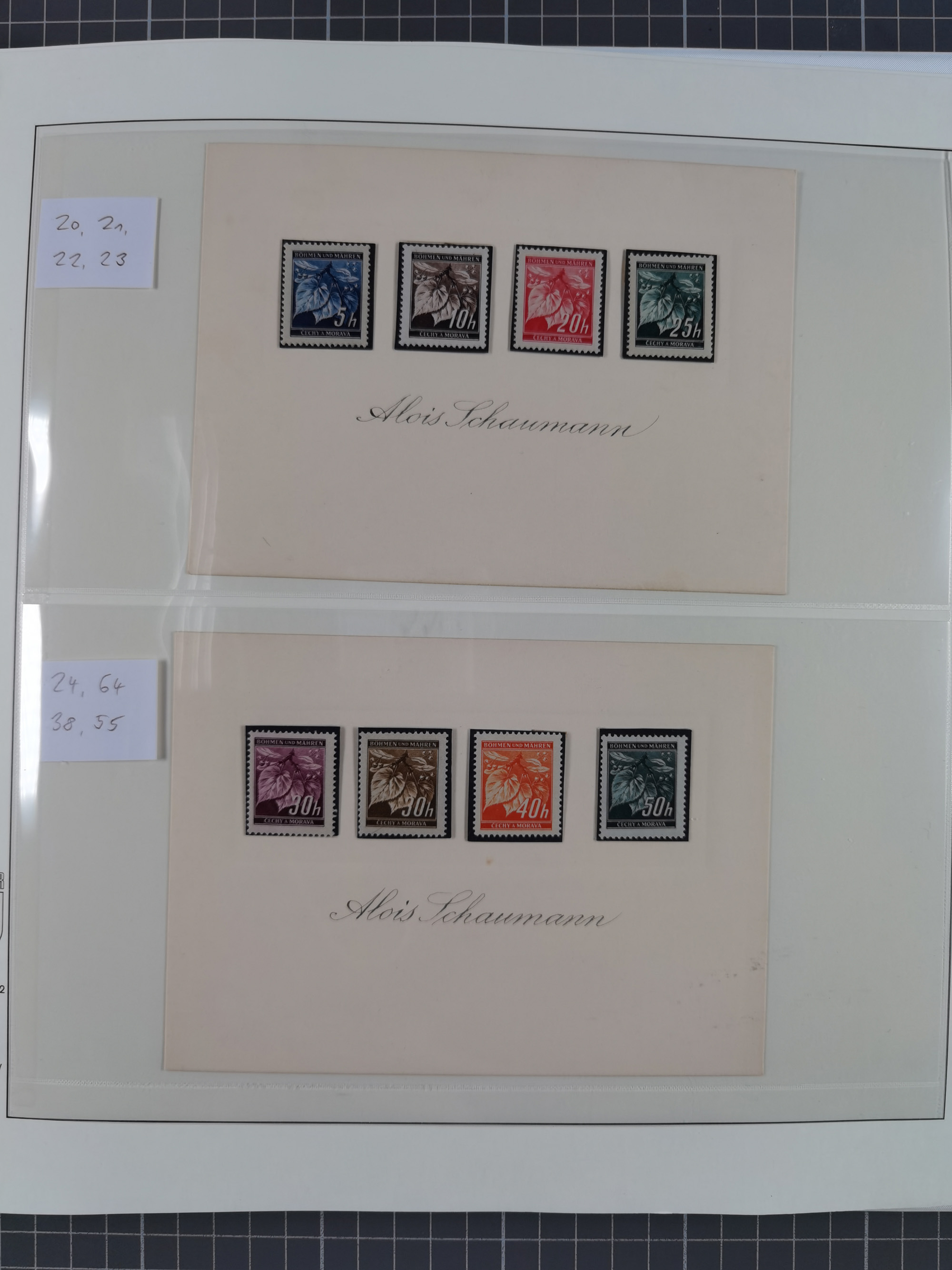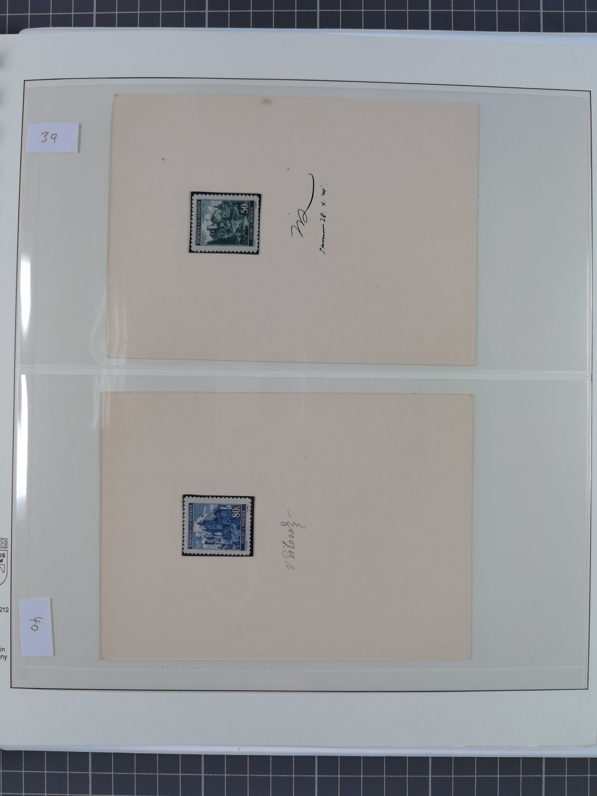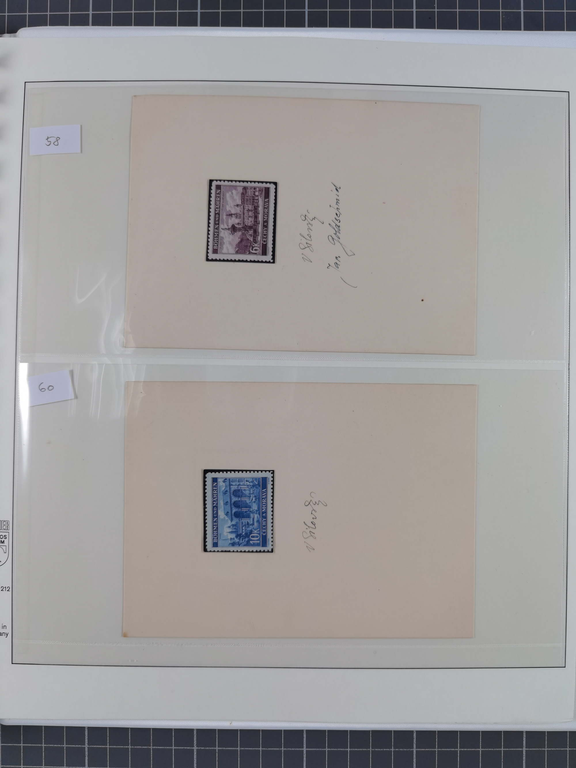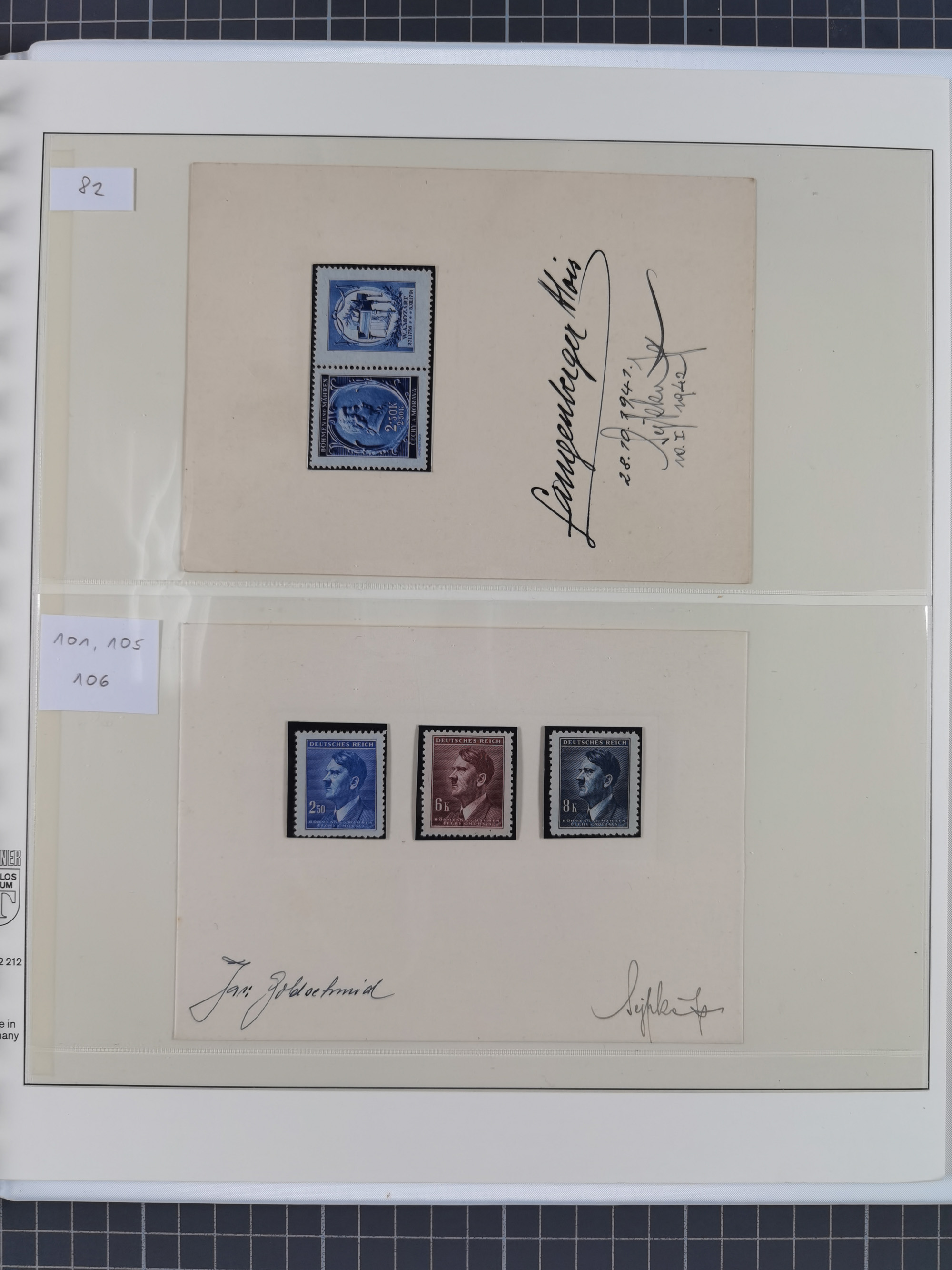 1939/45, interessante Partie, weißer Kärtchen mit Original-Unterschrift des Entwerfers wie Prof. Alois Schaumann, Karel Vik, Bohumil Heinz, Jan Vondrous, Vladimir Silovsky, Prof. Josef Sejpka, Jan Goldschmied und Alfred Erhardt, die Marken meist postfrisch, insgesamt 36 Stück, sehr interessant