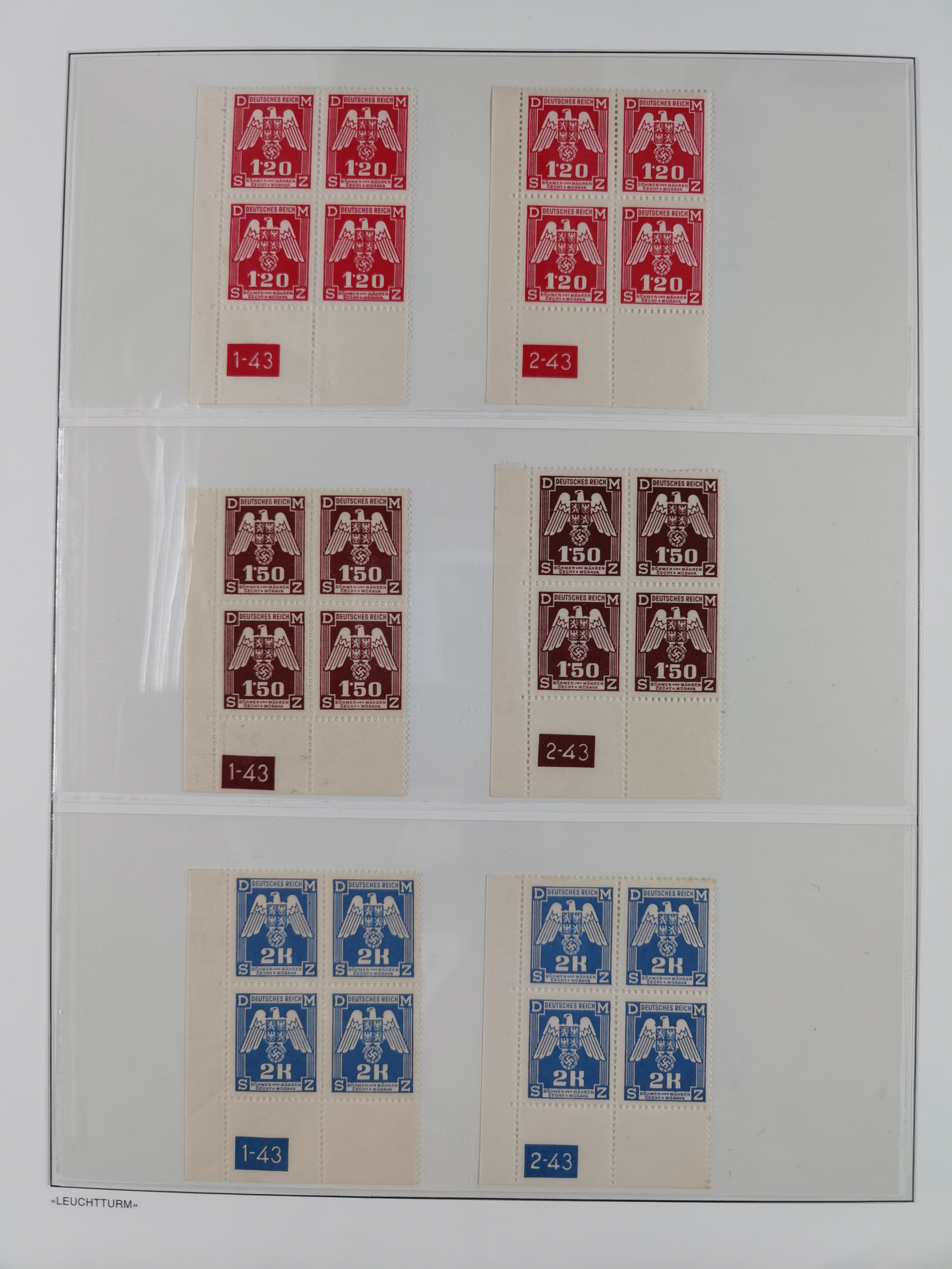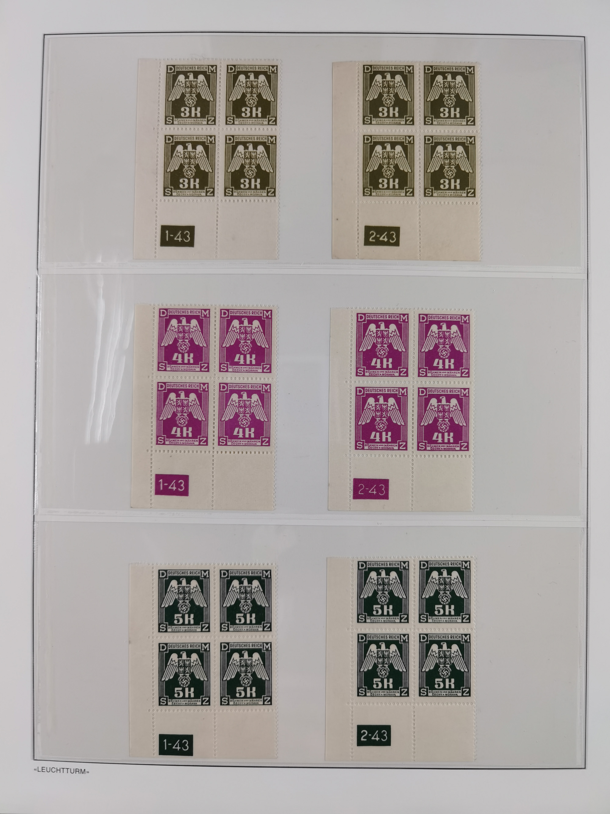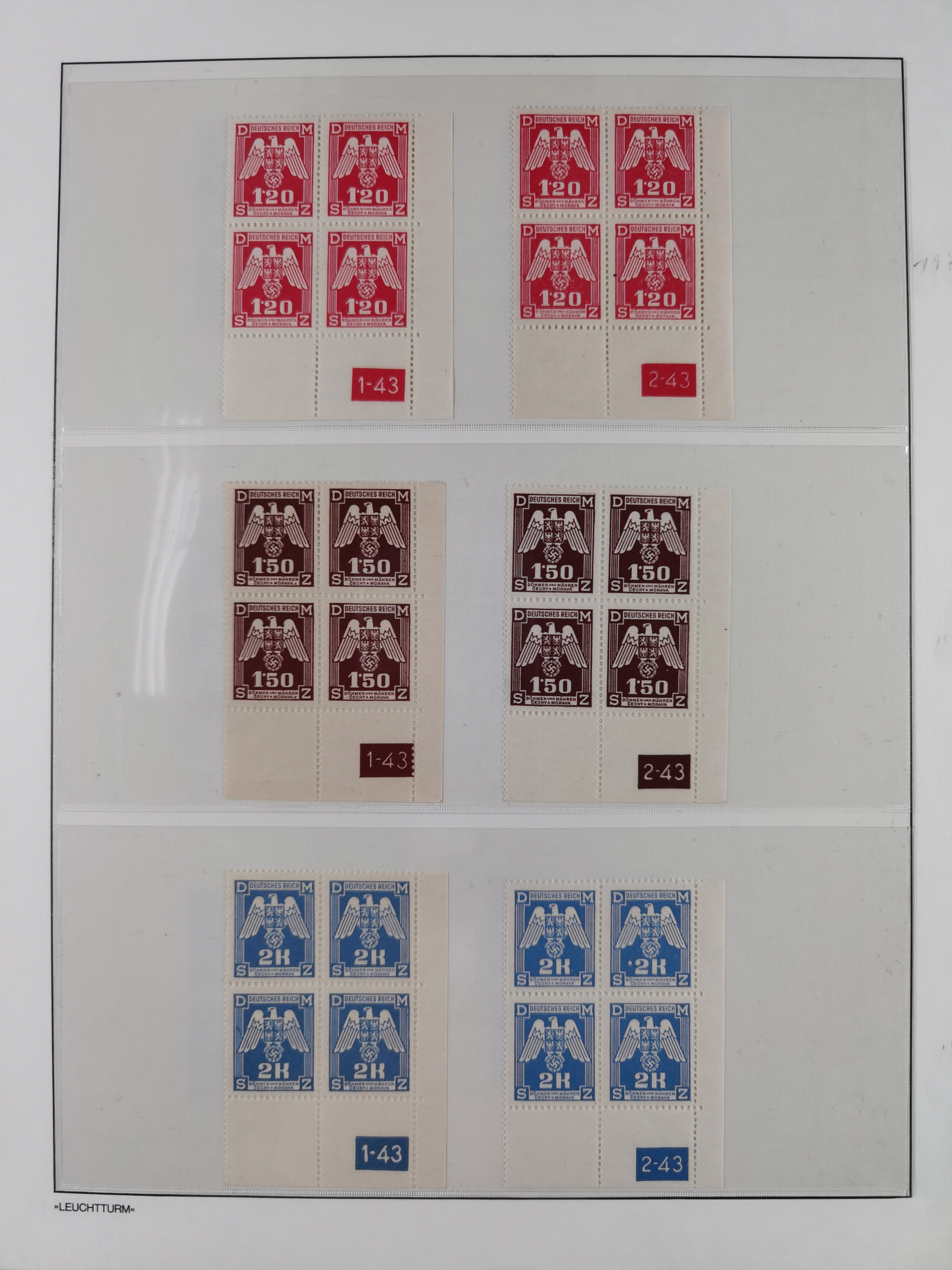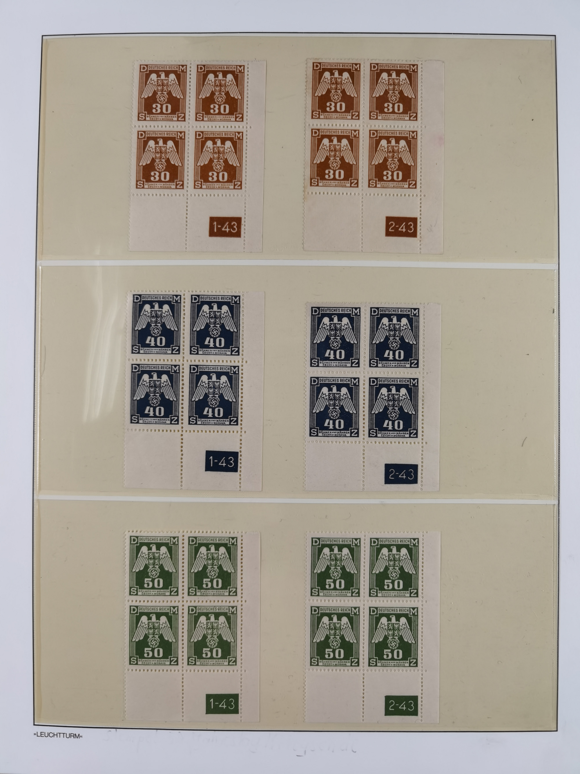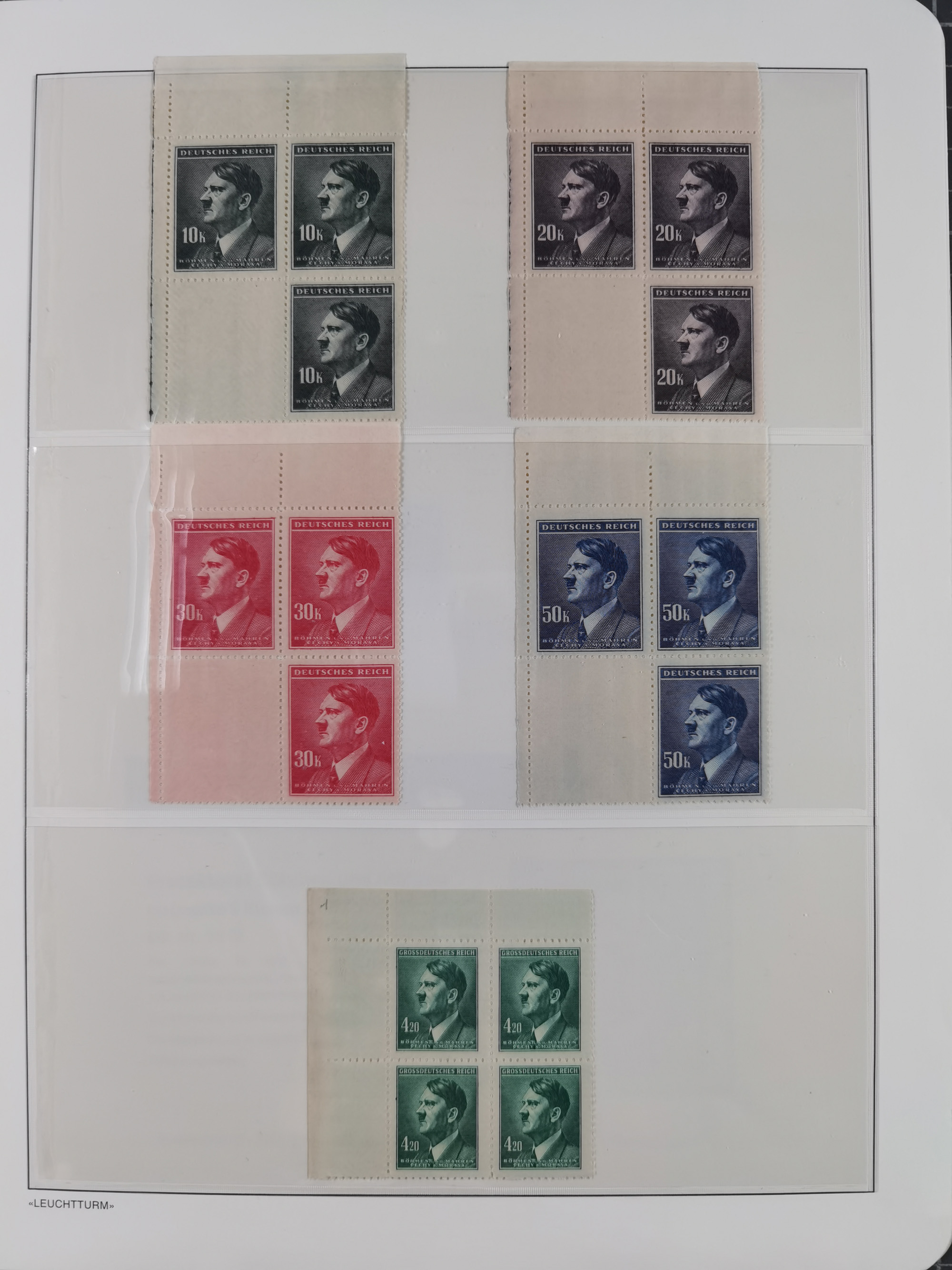 1939/45, sehr reichhaltige, postfrische Sammlung im dicken Leuchtturm-Album mit vielen Besonderheiten, dabei Eckrandstücke mit Plattennummer sowie Marken mit anhängendem Leerfeld, große Stückzahl an Viererblocks mit Plattennummern bei den Zeitungsmarken und Dienstmarken; bei den Portomarken Eckrandstücke mit Plattennummer und waagerechte Zwischenstegpaare mit Plattennummer, viel ex Mi.-Nr. 1-19, zu guter Letzt Zulassungsmarke Theresienstadt mit Fotoattest Brunel, alles in sehr schöner Erhaltung