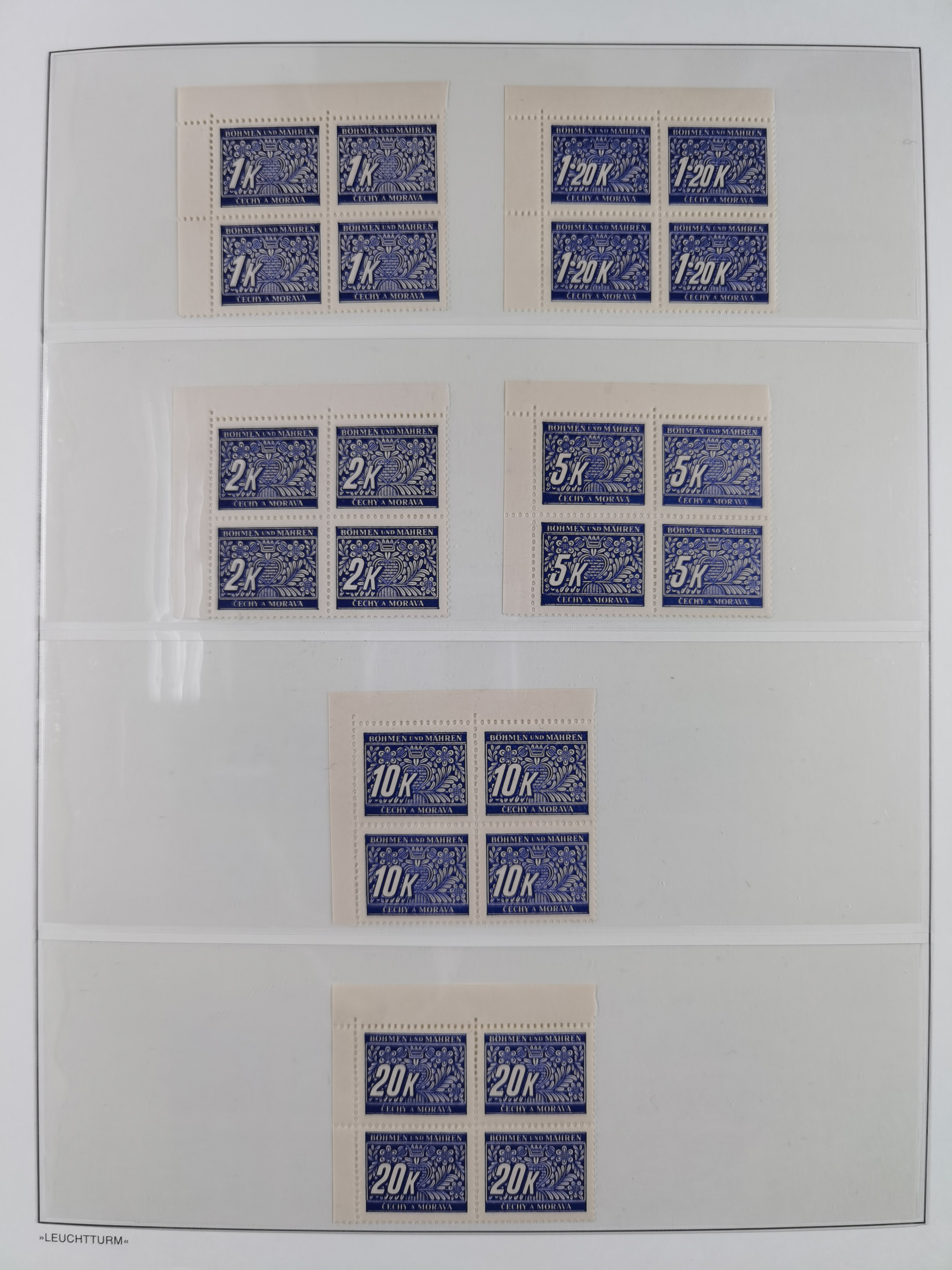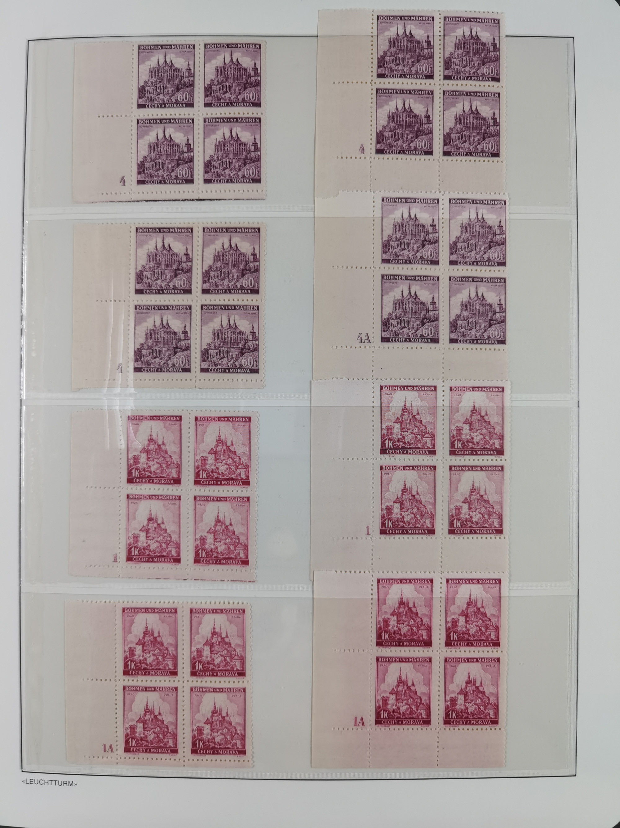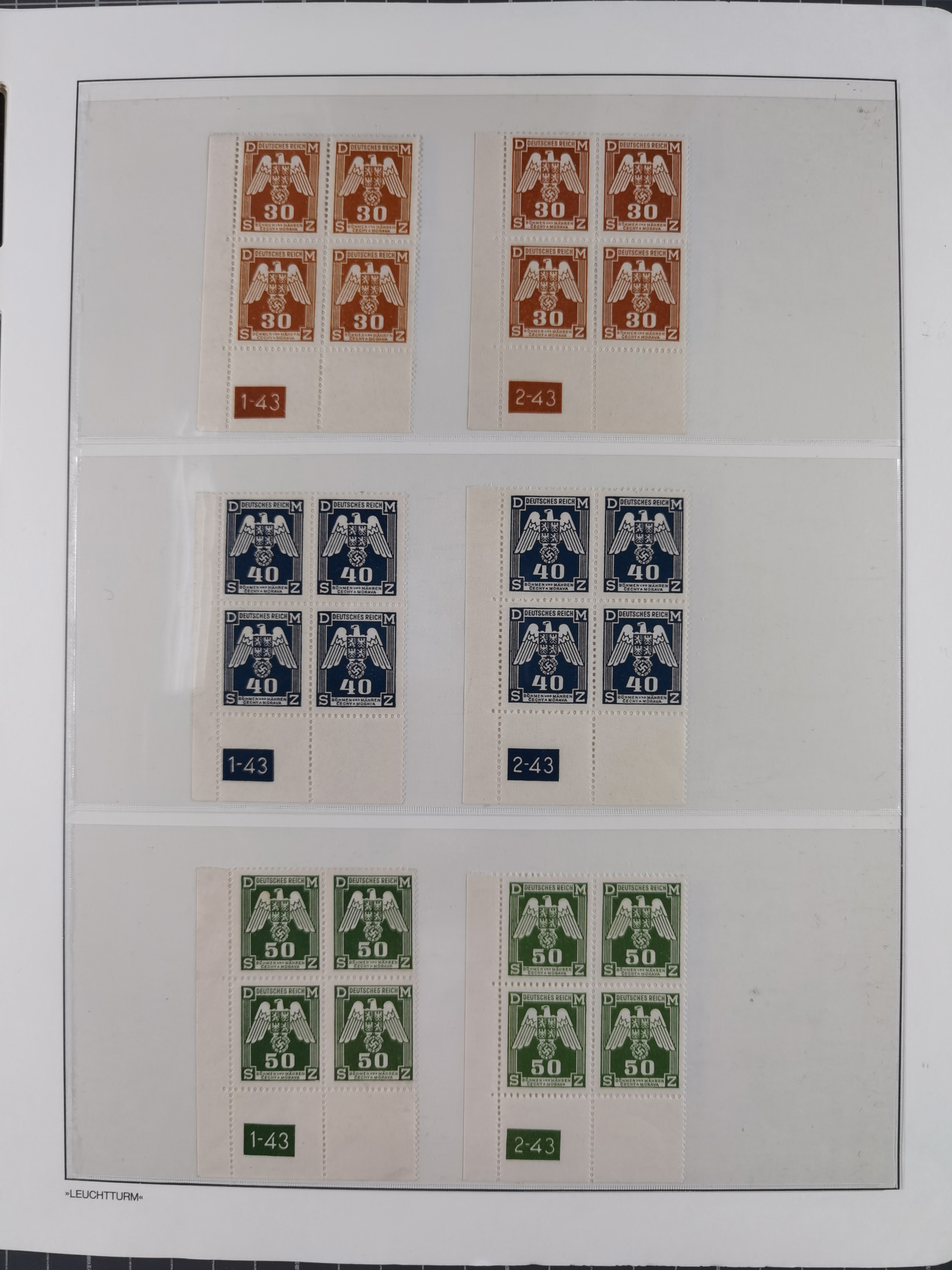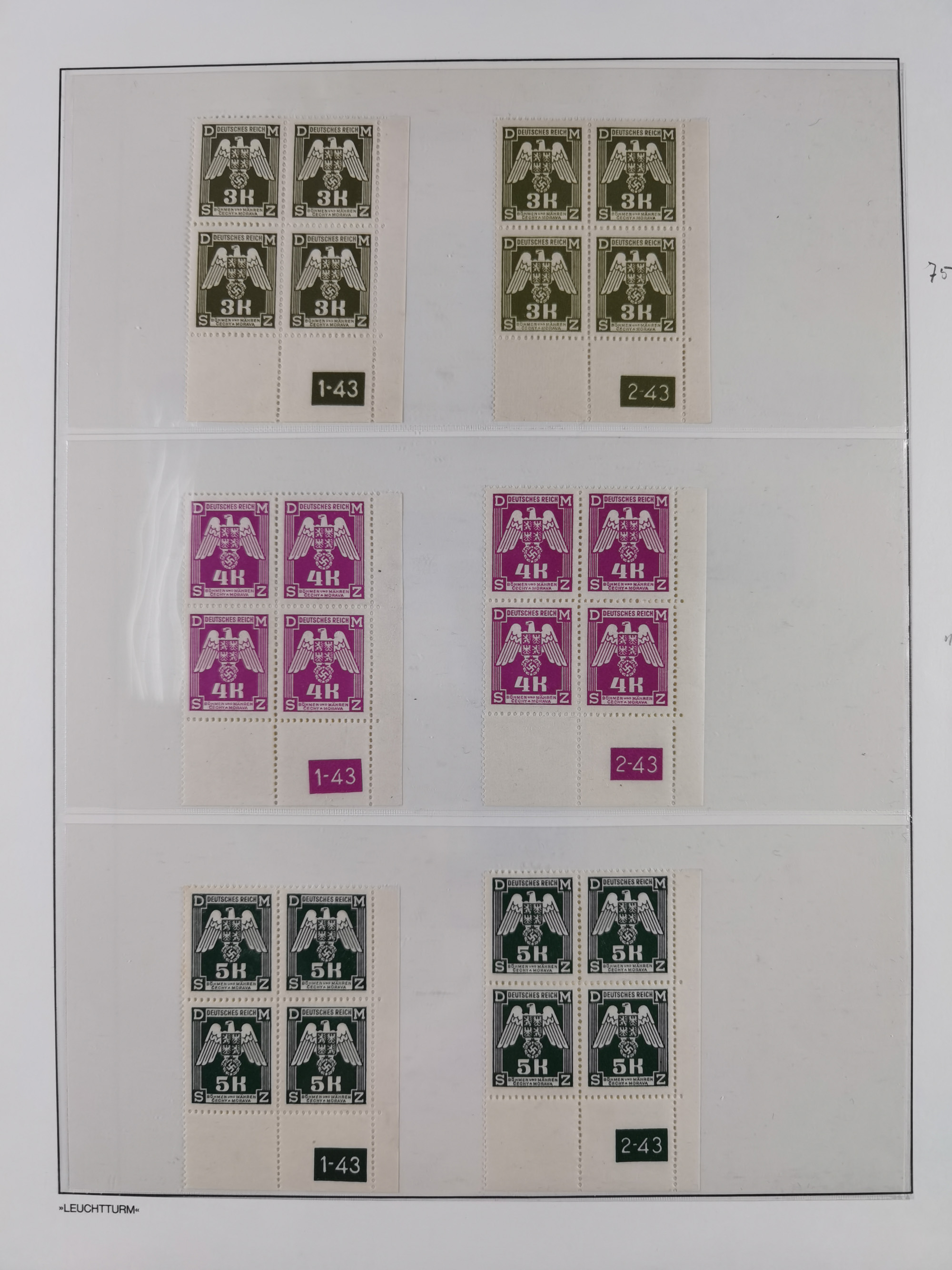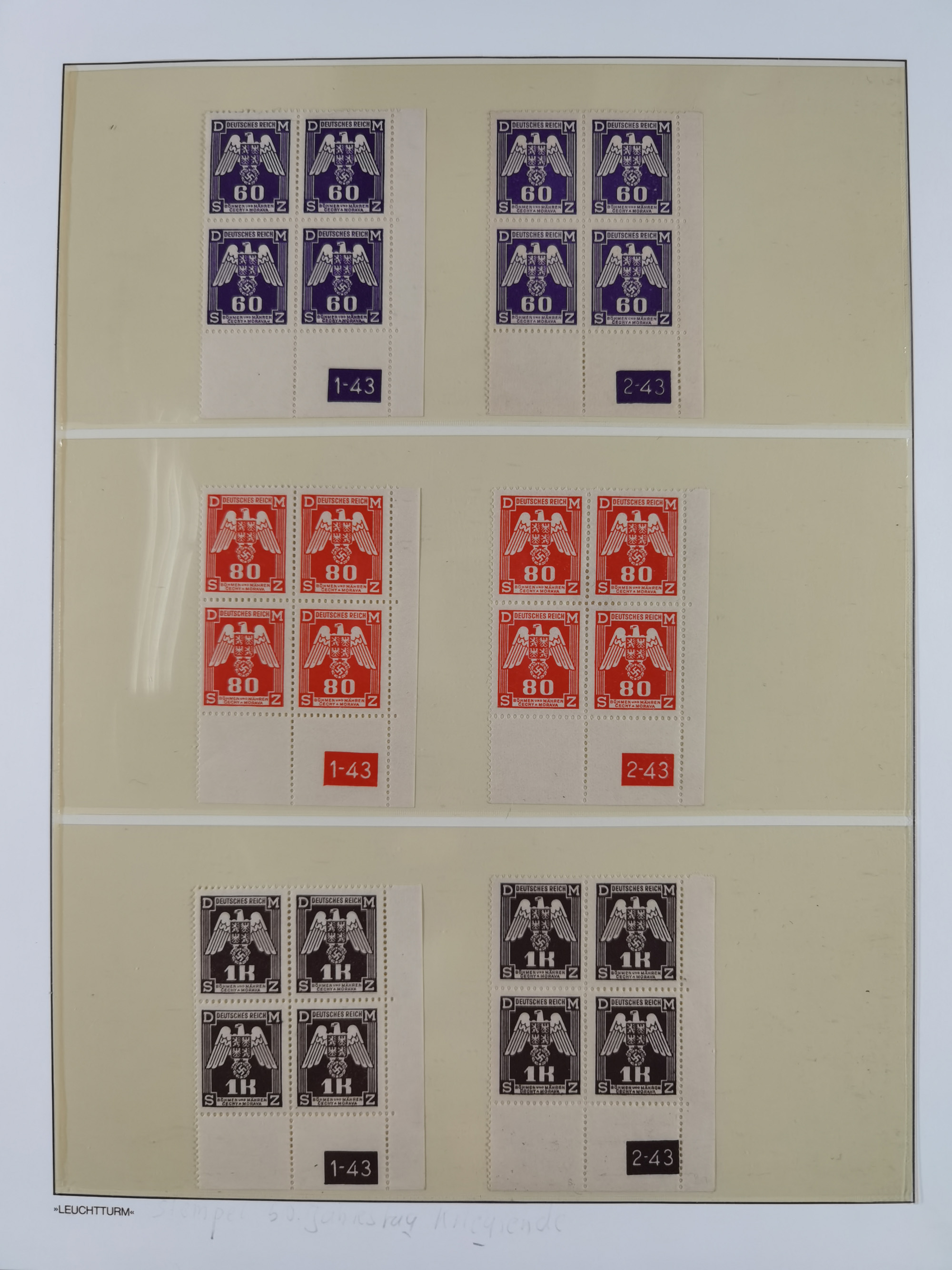 1939/45, sehr reichhaltige, postfrische Sammlung im dicken Leuchtturm-Album mit vielen Besonderheiten, dabei Eckrandstücke mit Plattennummer sowie Marken mit anhängendem Leerfeld, große Stückzahl an Viererblocks mit Plattennummern bei den Zeitungsmarken und Dienstmarken; bei den Portomarken Eckrandstücke mit Plattennummer und waagerechte Zwischenstegpaare mit Plattennummer, viel ex Mi.-Nr. 1-19, zu guter Letzt Zulassungsmarke Theresienstadt mit Fotoattest Brunel, alles in sehr schöner Erhaltung