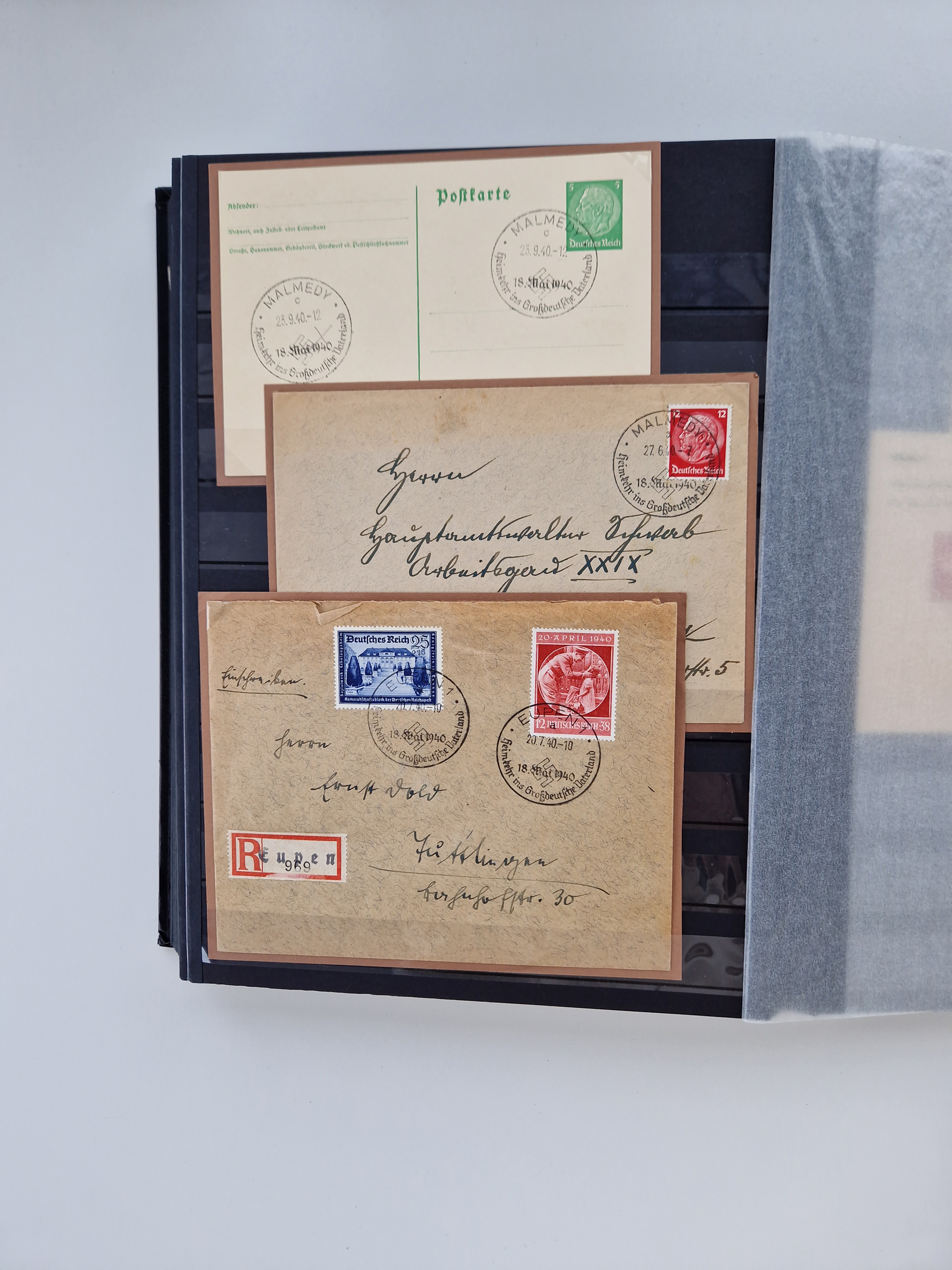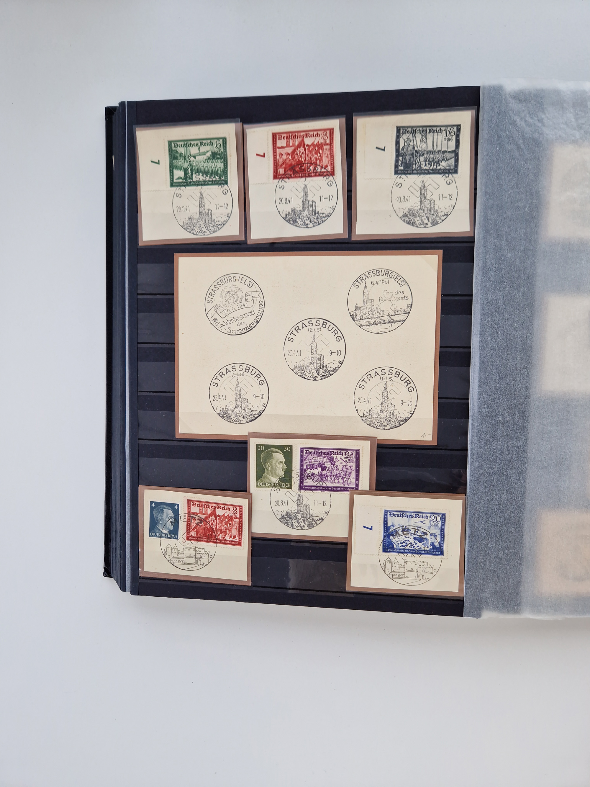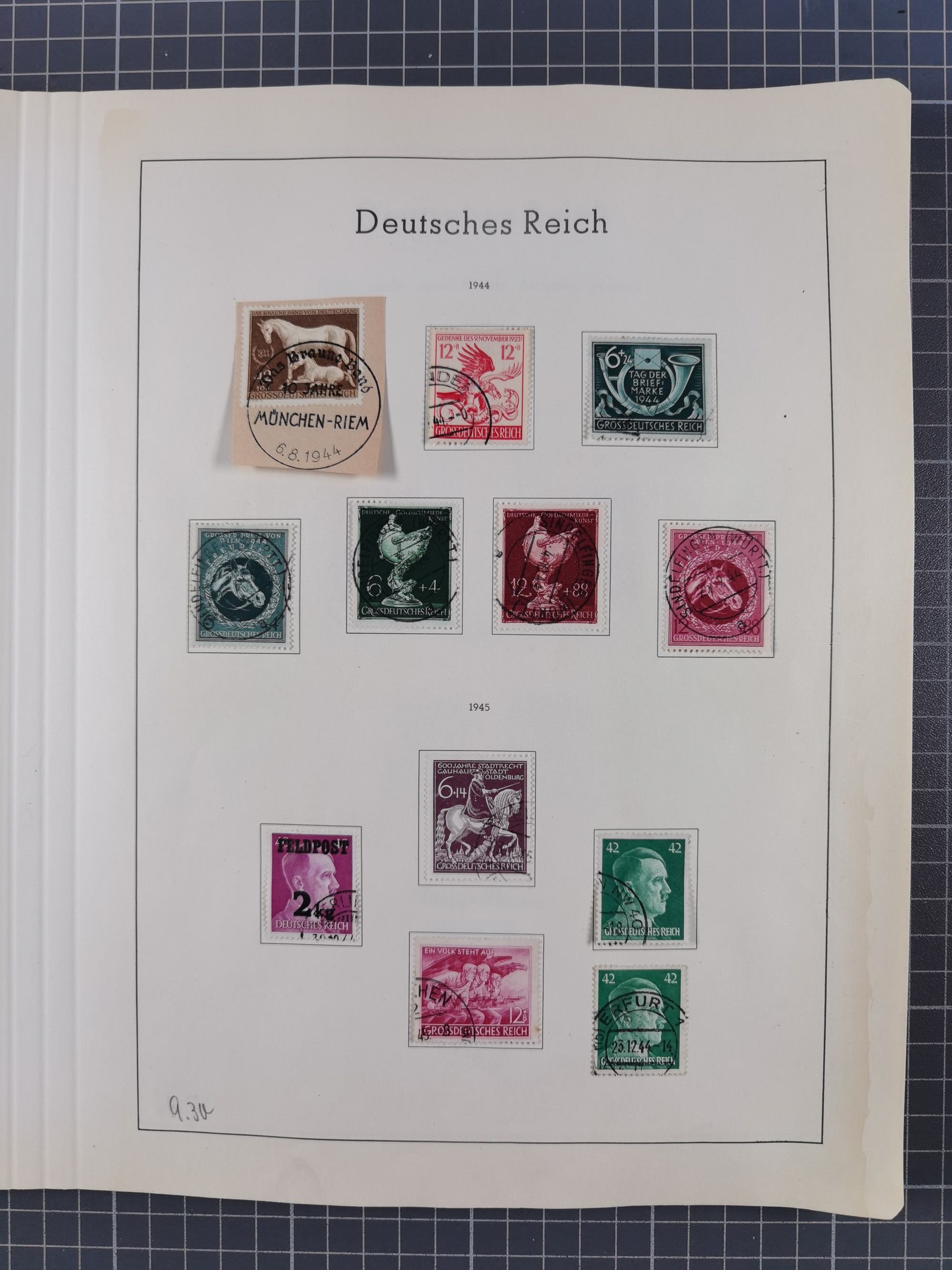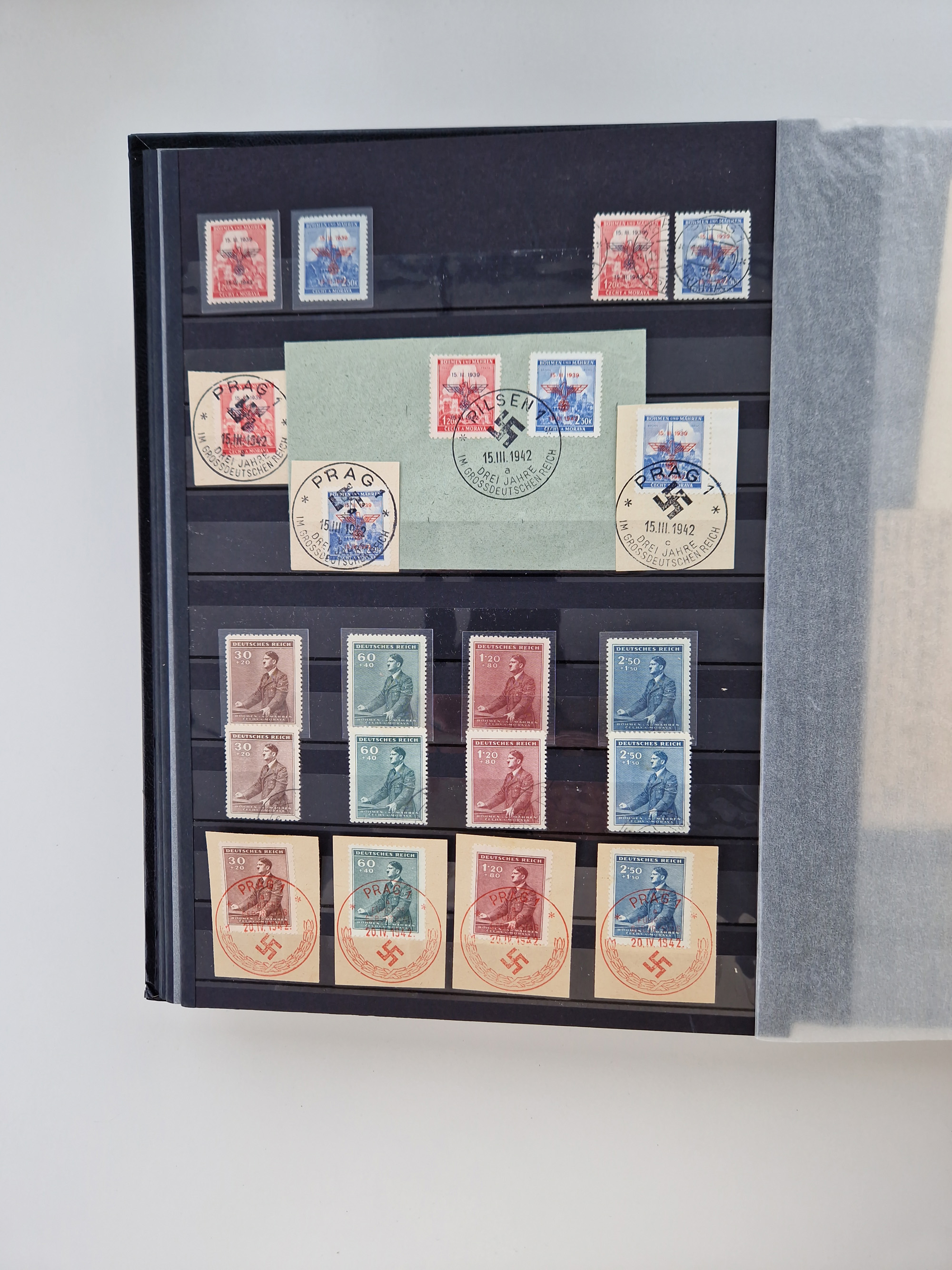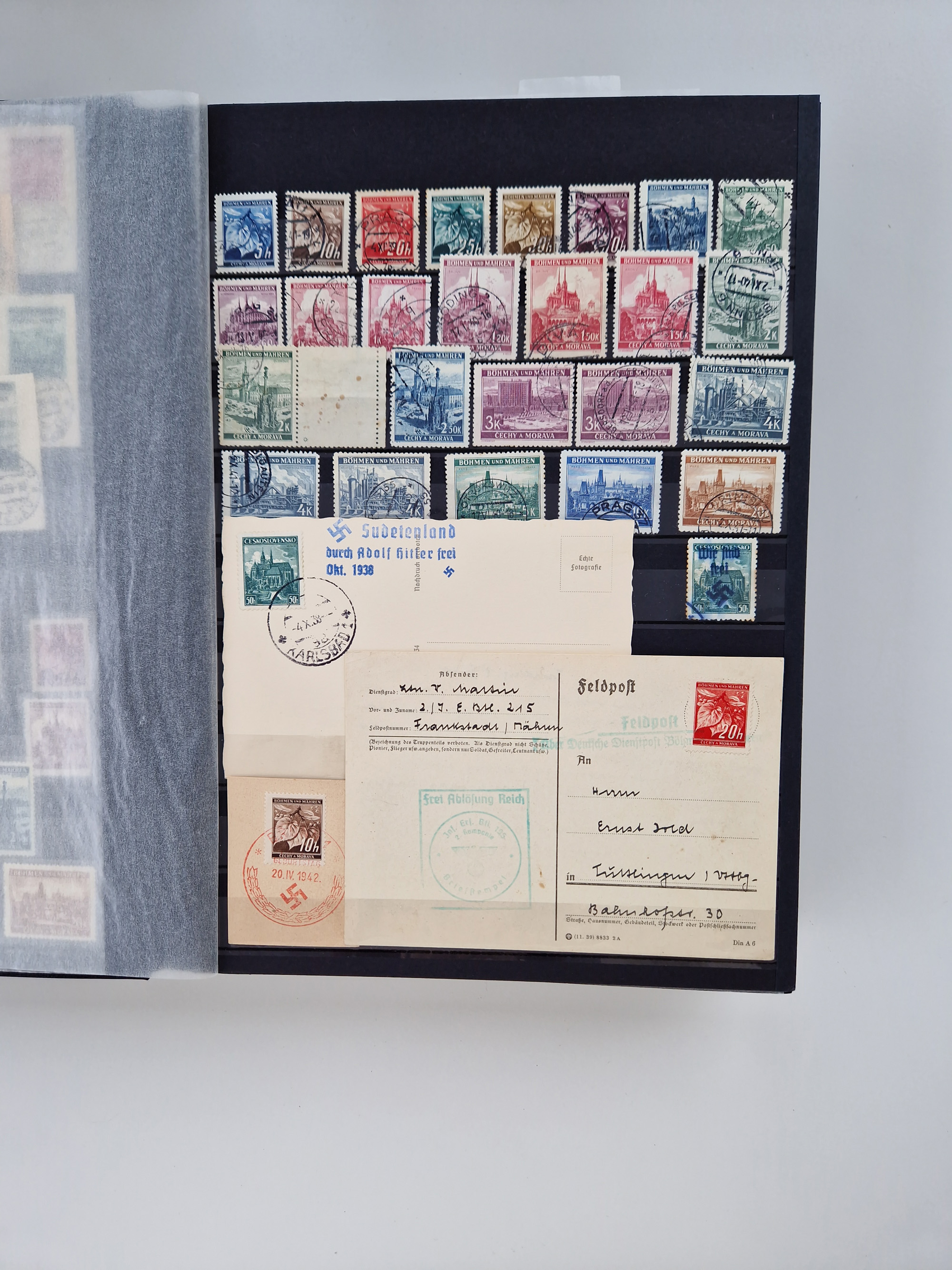1932/44, meist gestempelte, in den Hauptnummern fast komplette Sammlung Deutsches Reich und Besetzungsausgaben, dabei bessere Werte, Randstücke und Zusammendrucke, aufgelockert durch etliche R-Briefe und Blankoumschläge mit Sonderstempeln, dabei u.a. Mi.-Nr. 628-31 auf Zeppelinbrief mit Fahrt zur Leipziger Messe, Blocks 4-11, Bl. 11 mit SSt. “MARSCHSTAFFEL ZUM RPT DER NSDAP GAU SACHSEN”, ferner Dienst- und Feldpostmarken mit u.a. Mi.-Nr. 2 auf Feldpostadresse, Böhmen und Mähren mit Zusammendrucken, Mi.-Nr. 29 auf NSDAP-Brief mit rotem V-Werbestempel “OLMÜTZ -8.VIII.41”, rotem L2 und blauem L1 “Victoria siegt…” und rückseitiger Vignette, etc., meist gute Erhaltung, im KaBe-Album